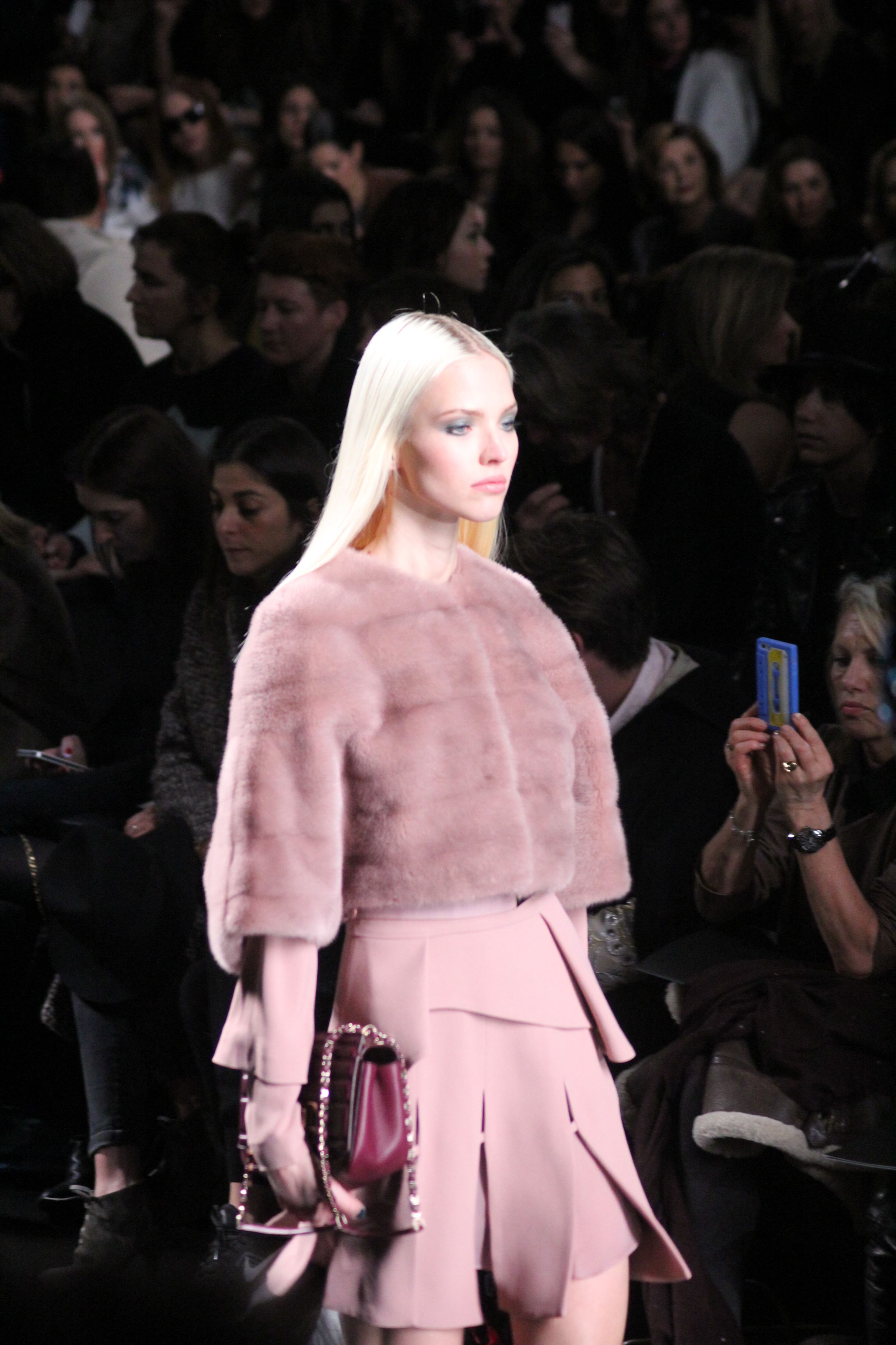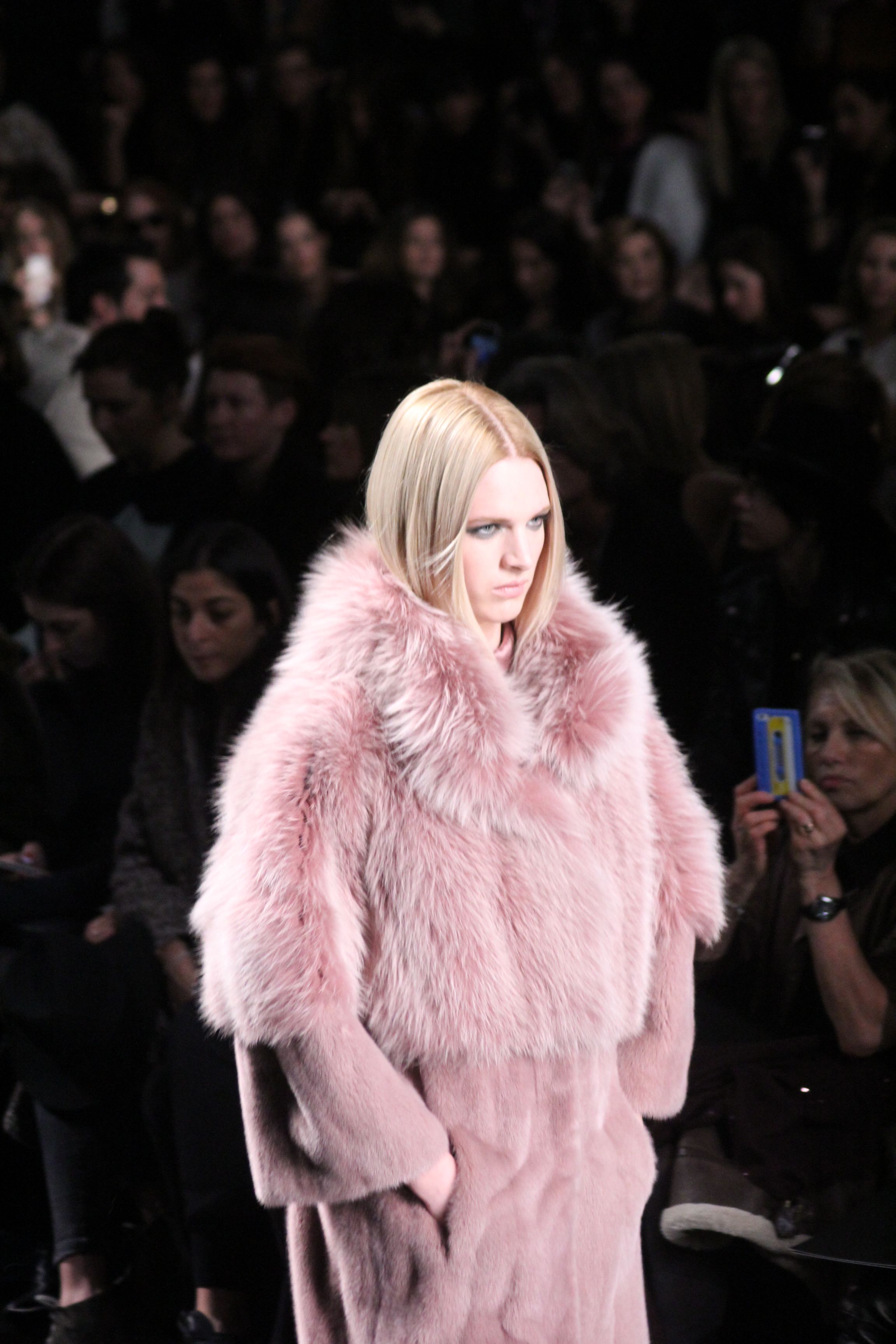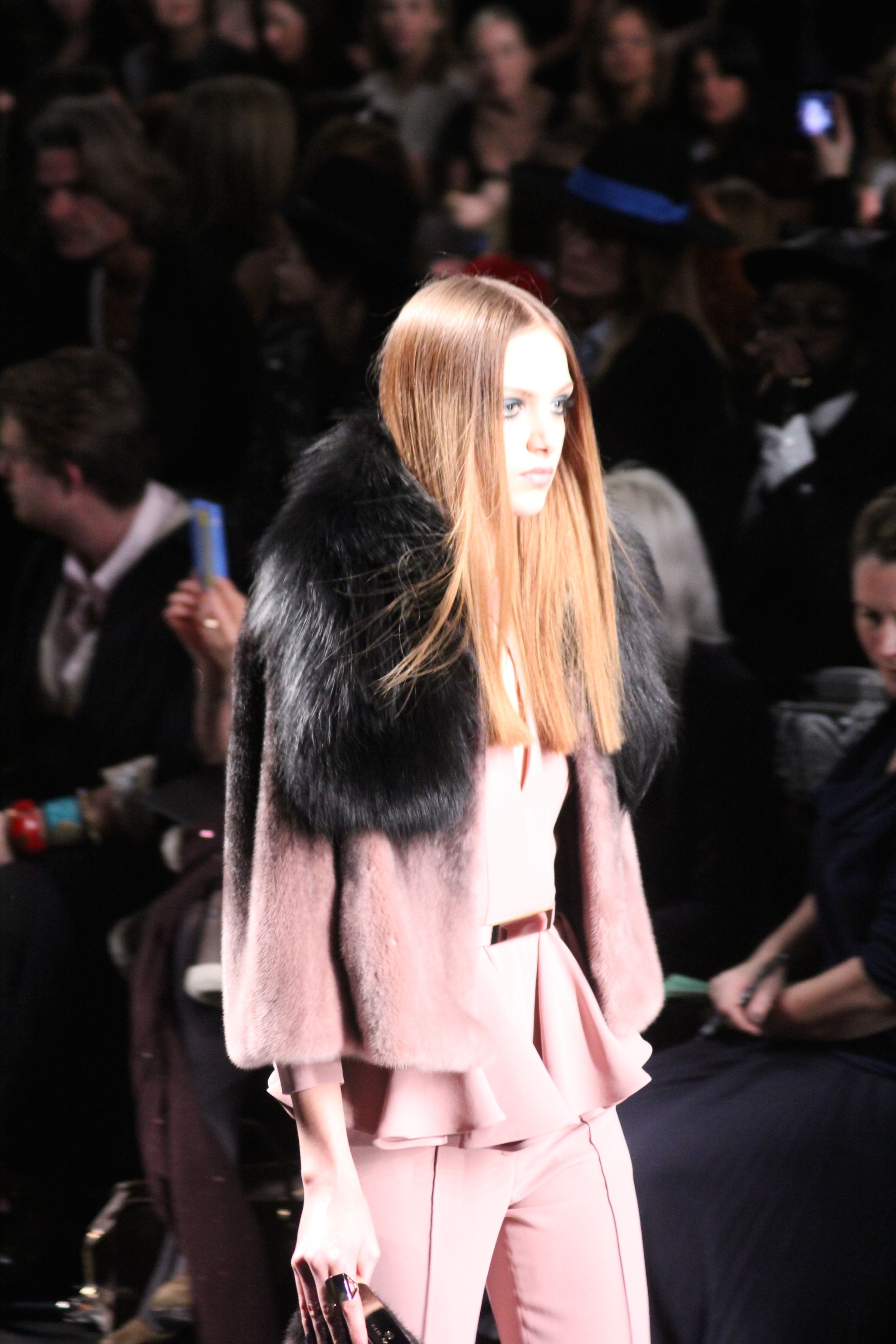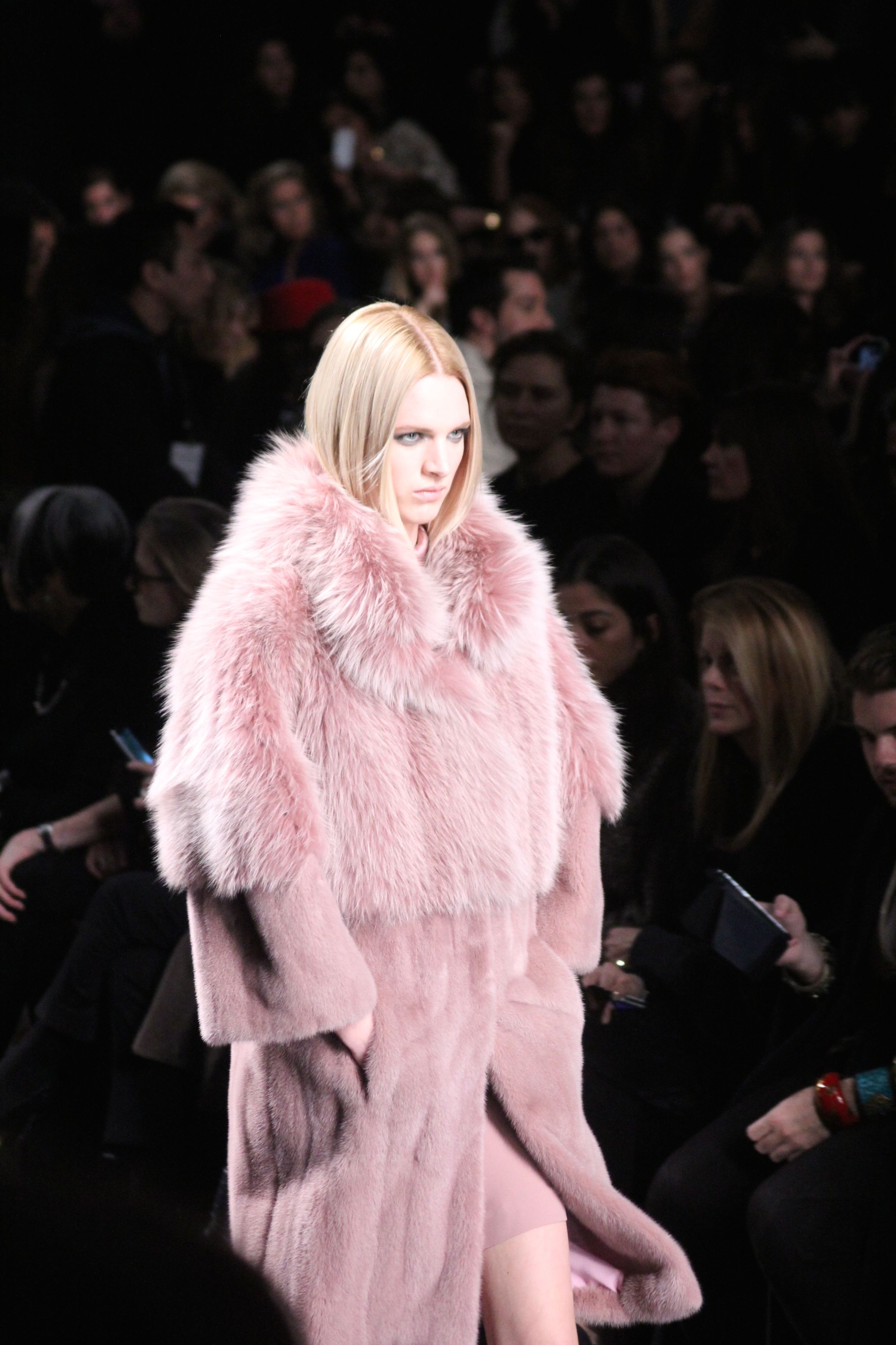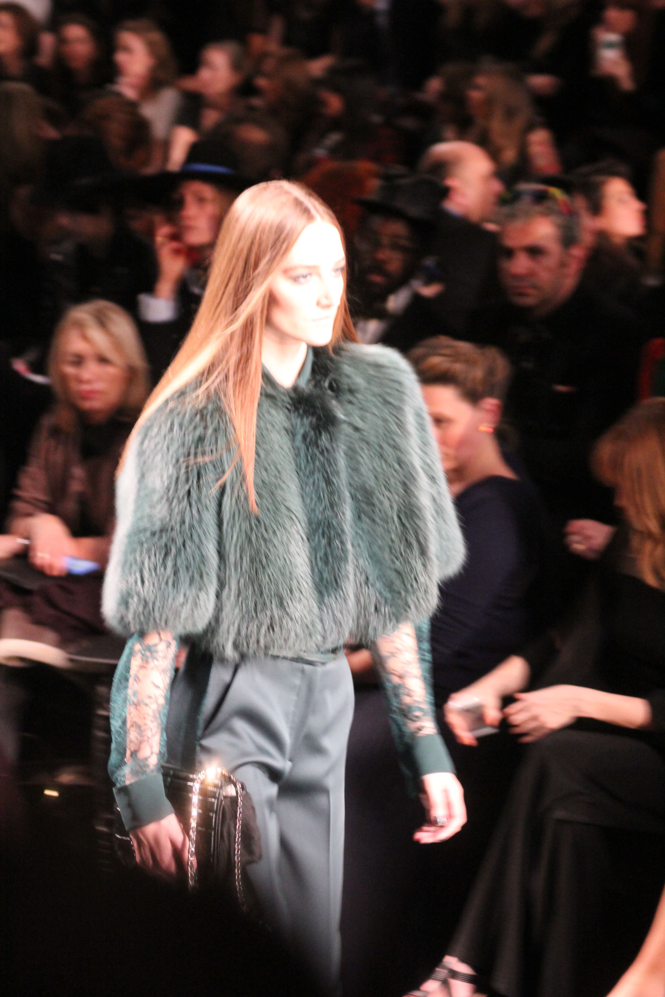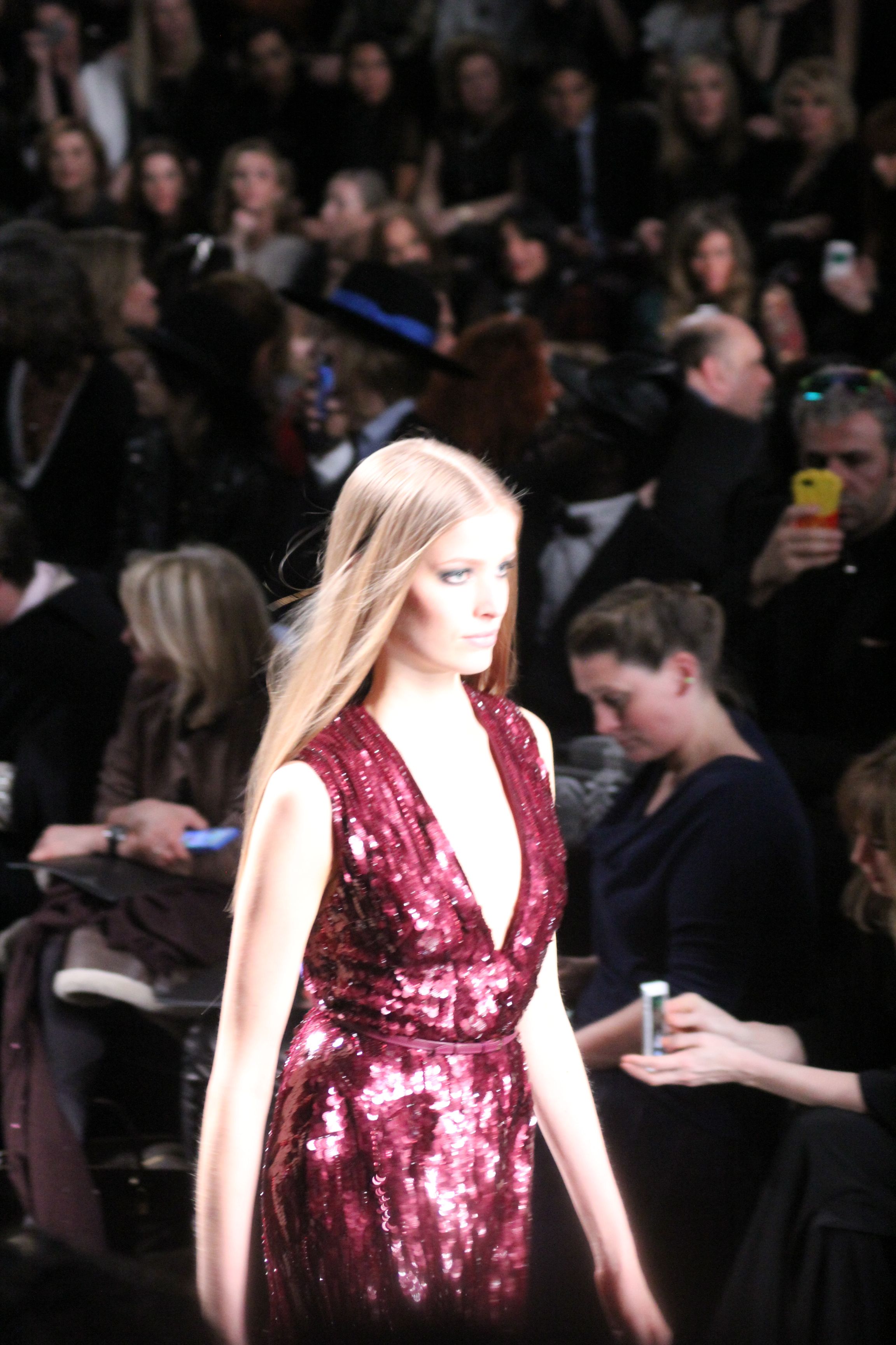 Dégradés ton sur ton, les silhouettes évoluent dans des jeux de matières précieuses : ici, un manteau en fourrure diapré et structuré se dessine de manière élégante et sensuelle. Là, un jeu de paillettes brodées parsème et illumine une robe vertigineuse.