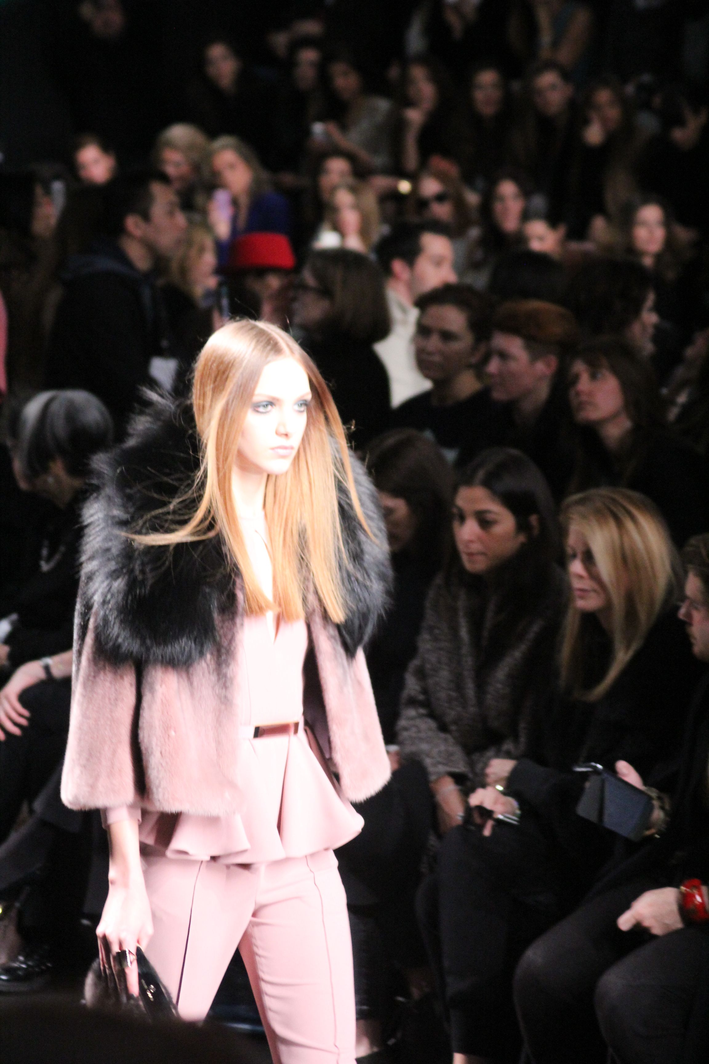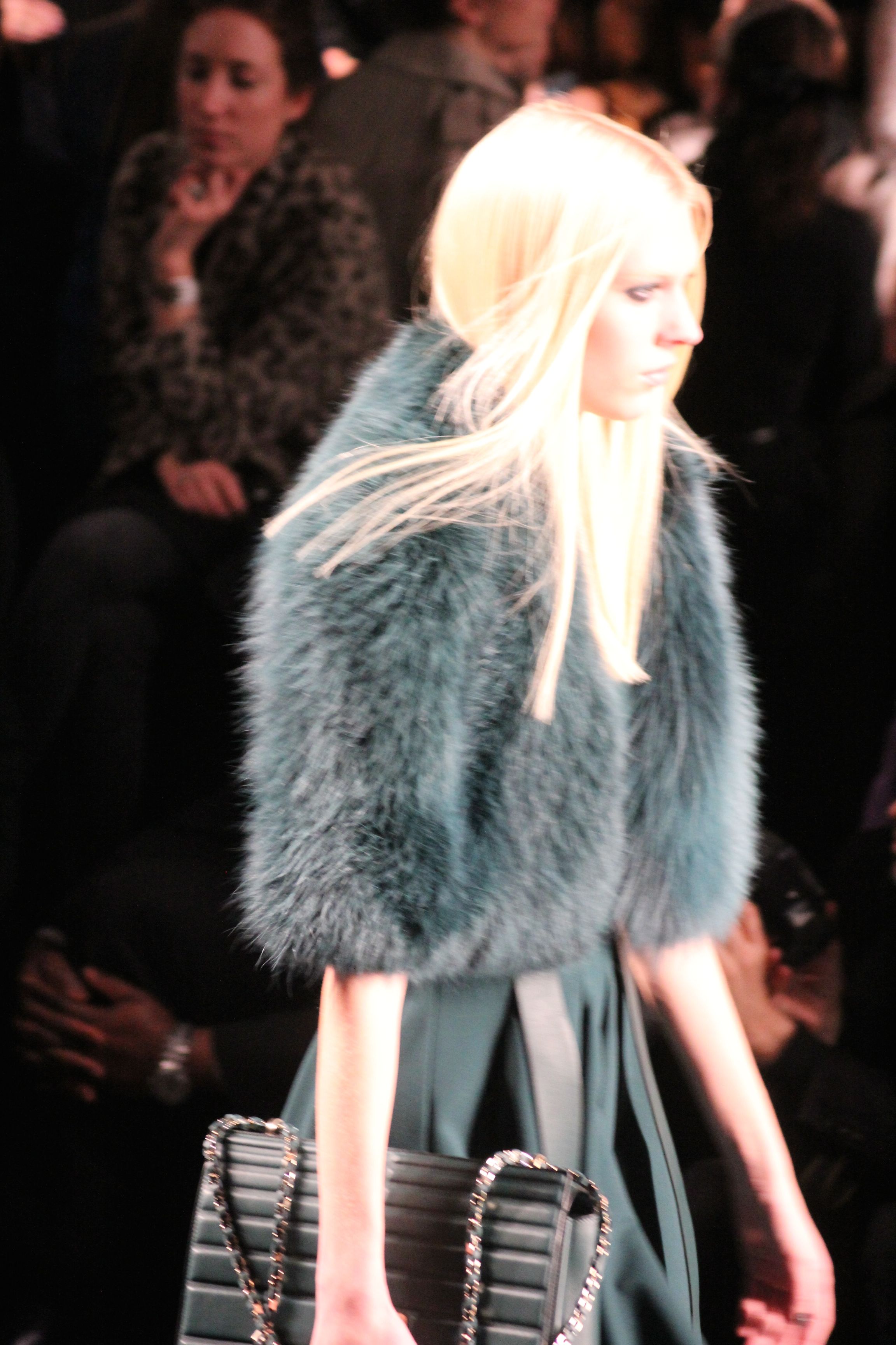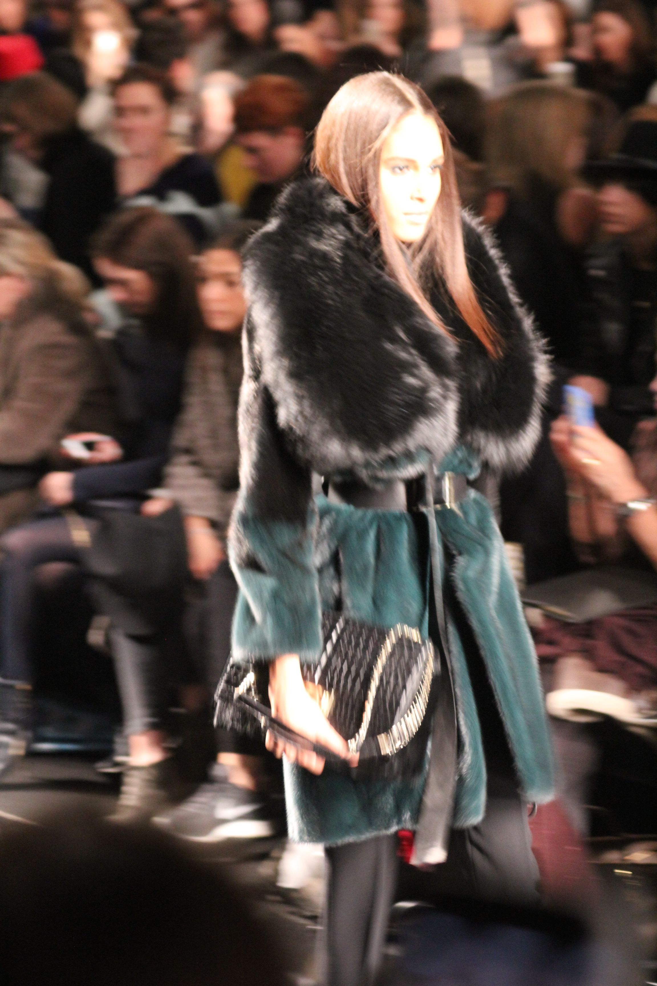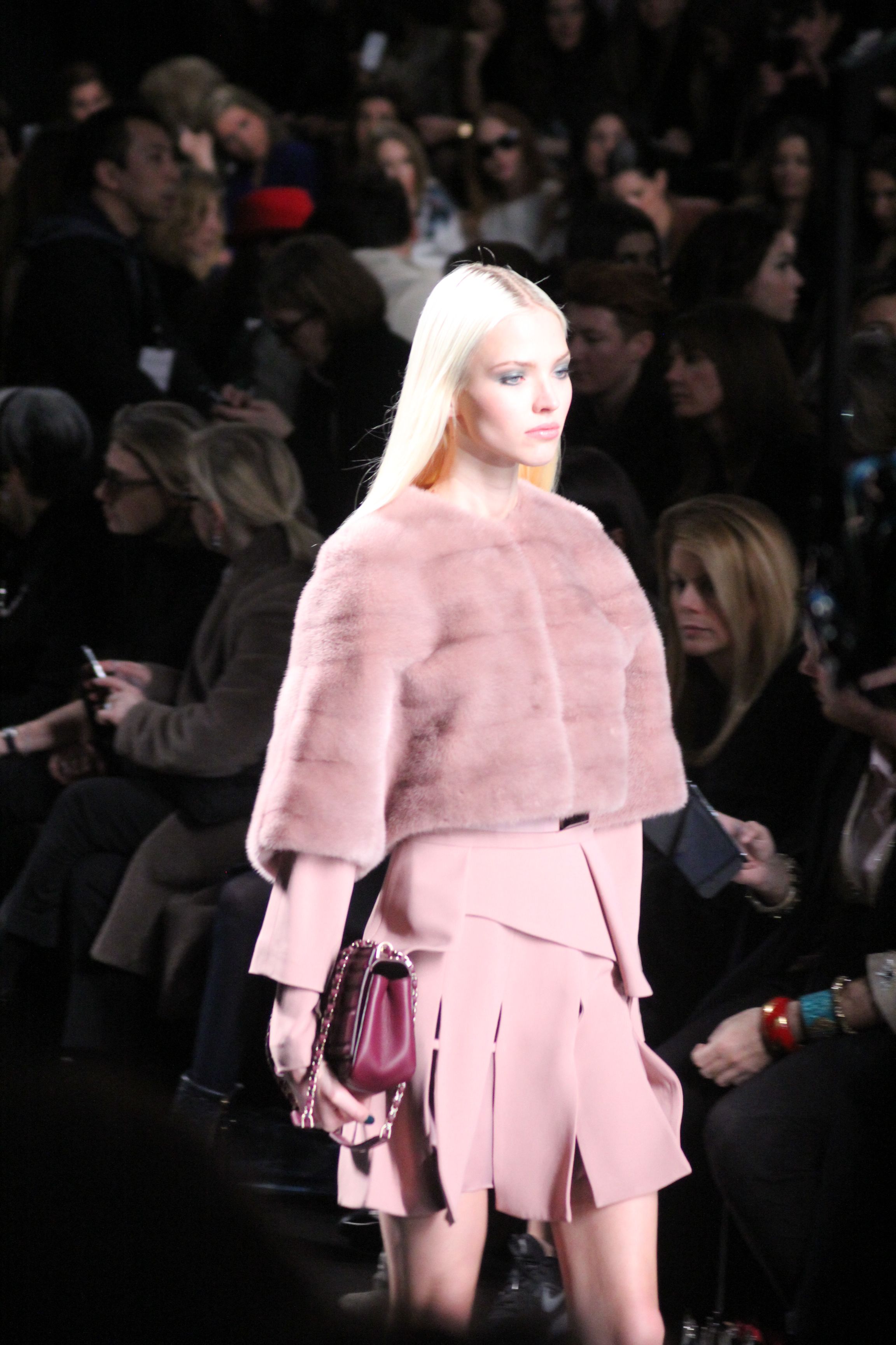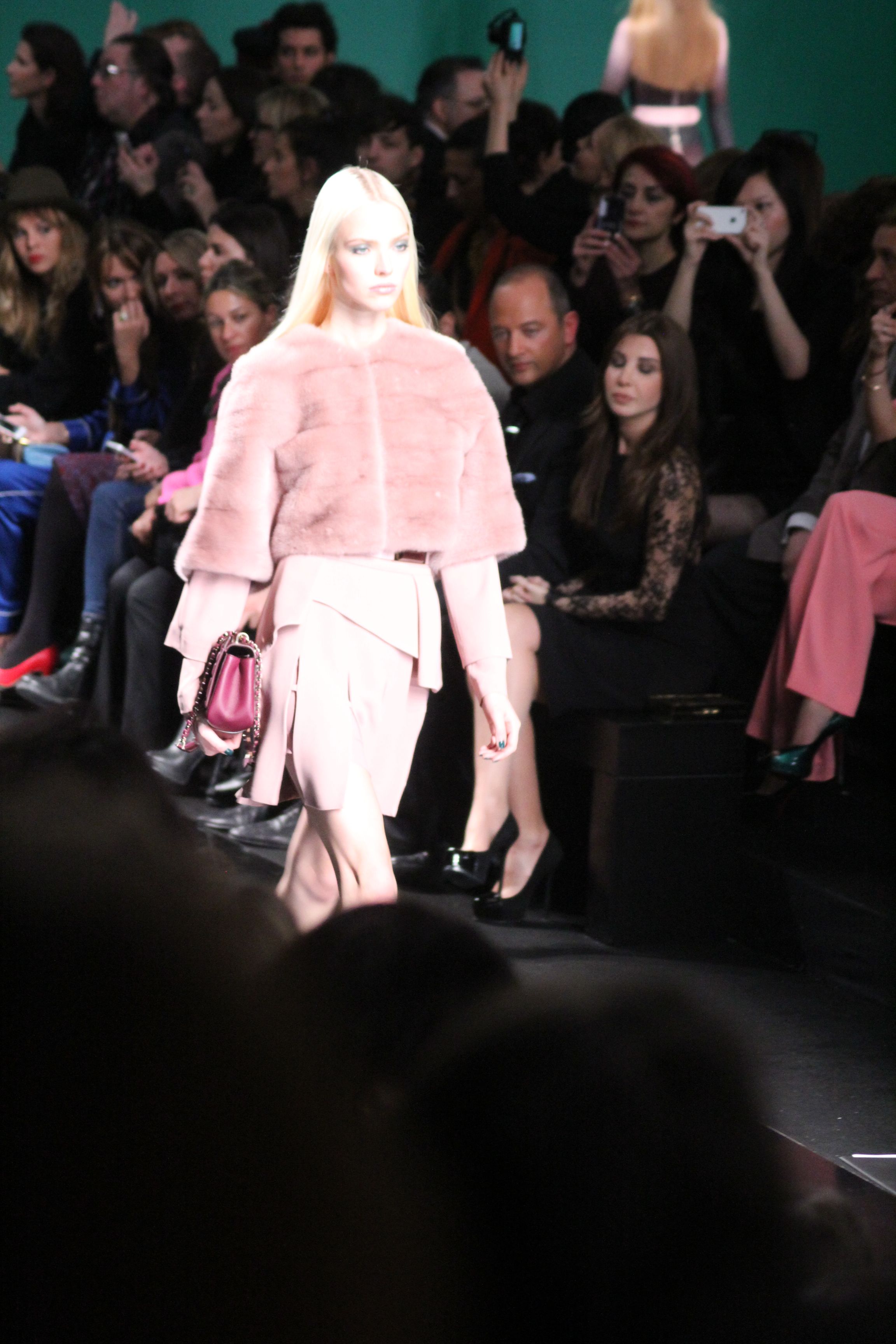 Dégradés ton sur ton, les silhouettes évoluent dans des jeux de matières précieuses : ici, un manteau en fourrure diapré et structuré se dessine de manière élégante et sensuelle. Là, un jeu de paillettes brodées parsème et illumine une robe vertigineuse.