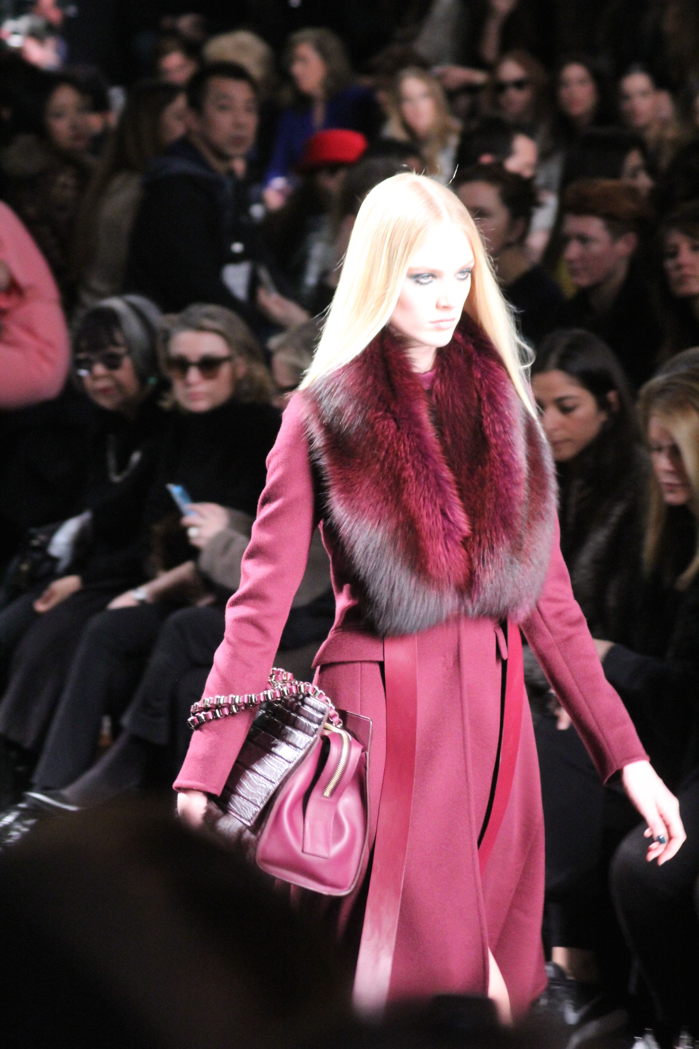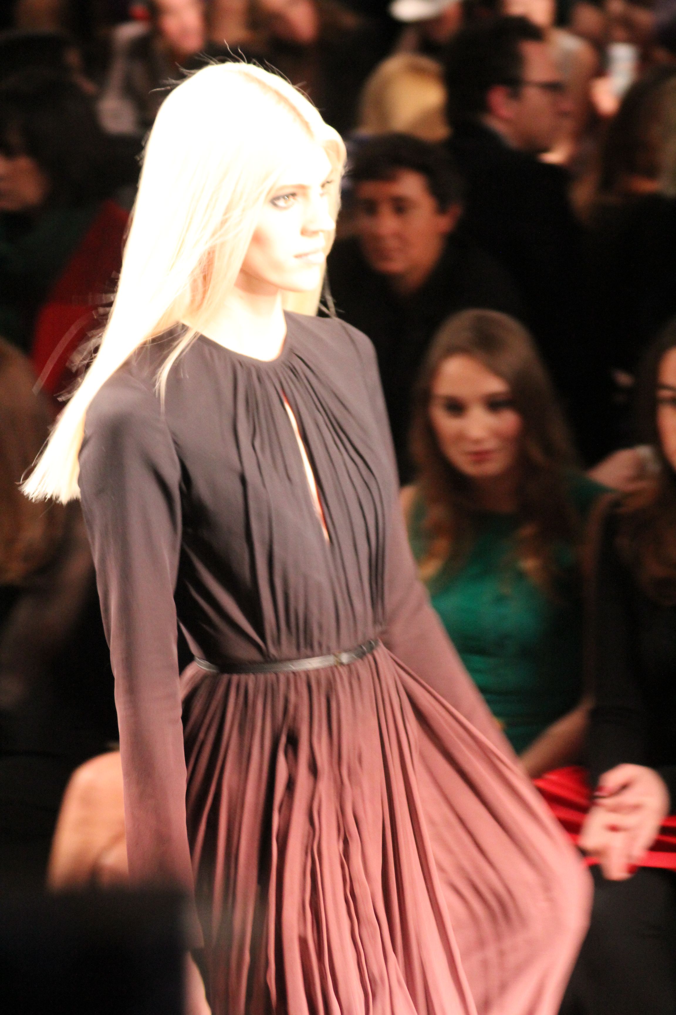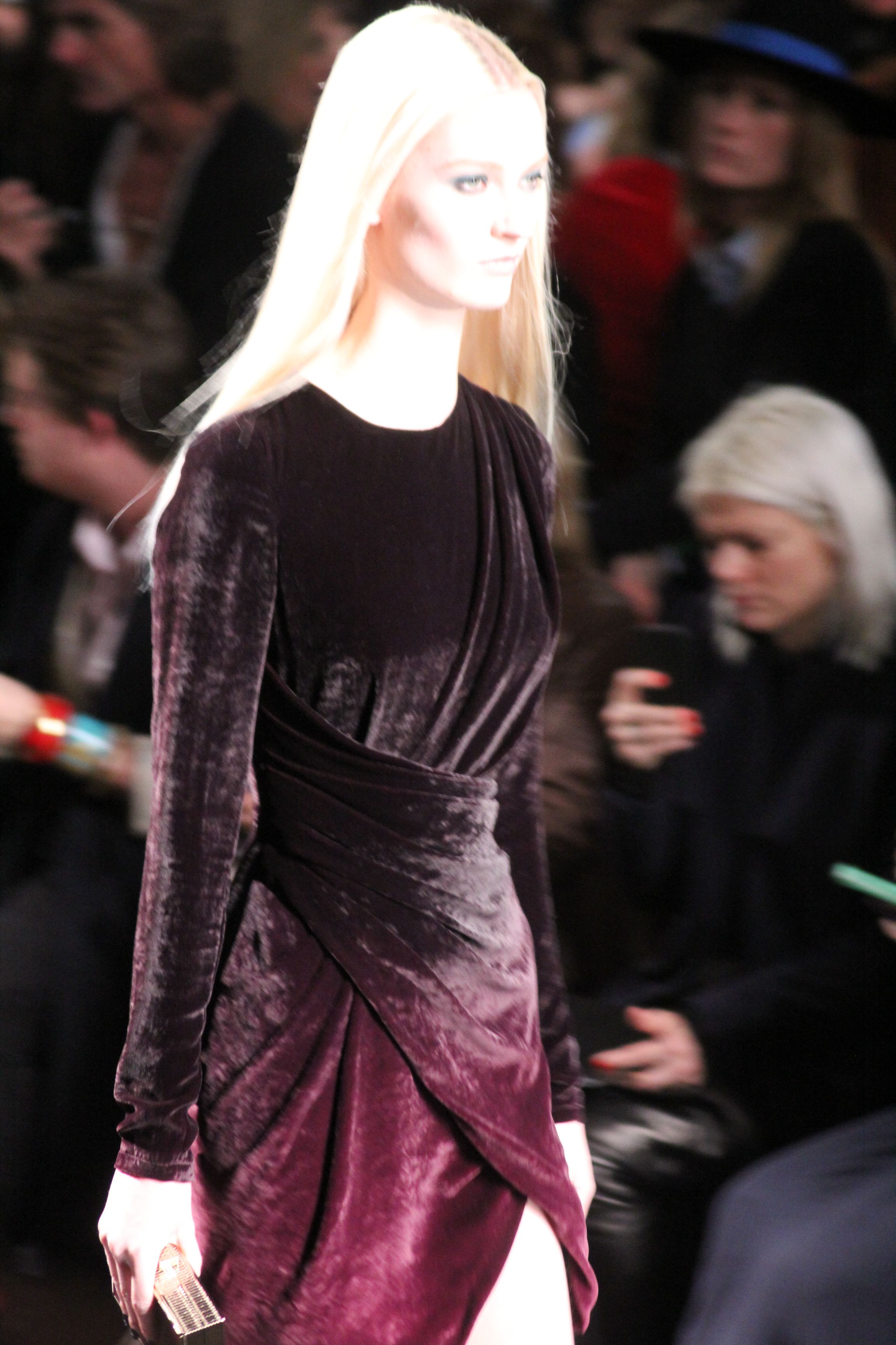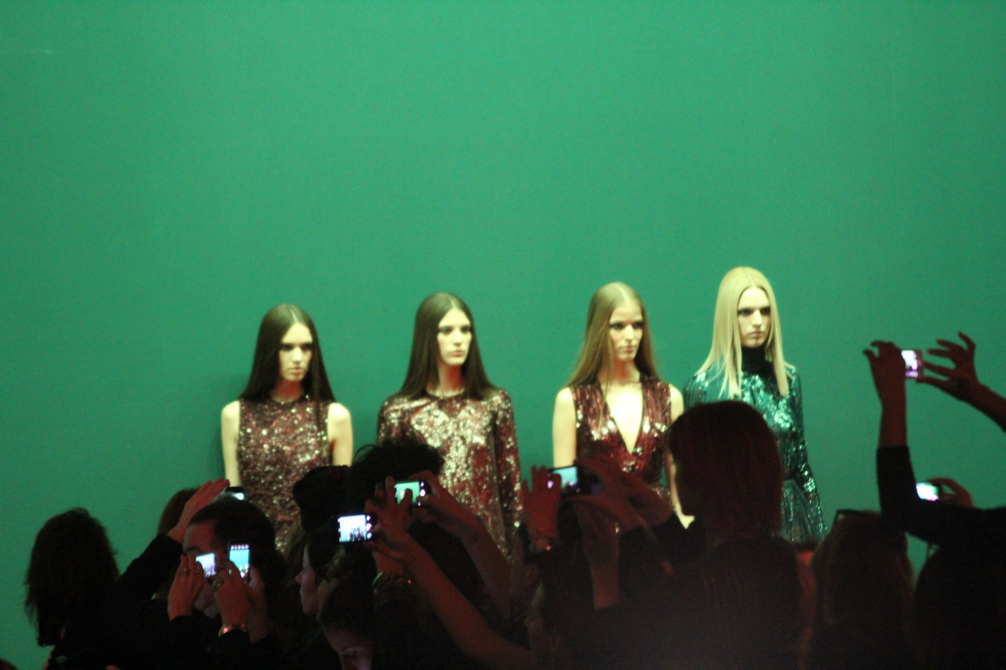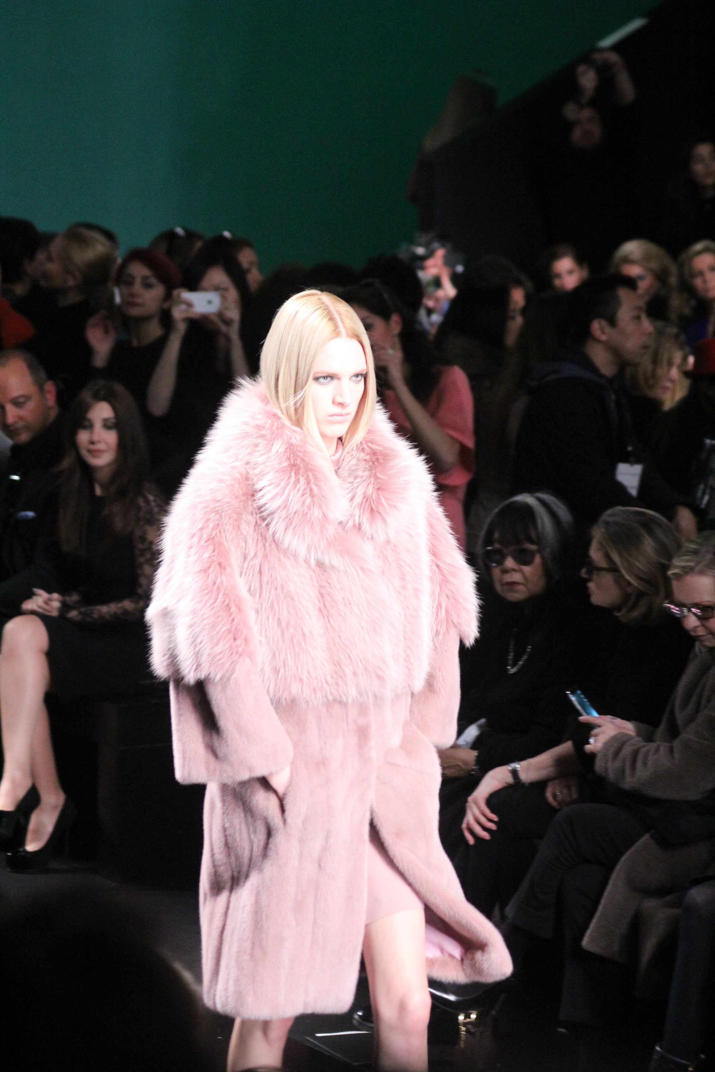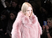 Dégradés ton sur ton, les silhouettes évoluent dans des jeux de matières précieuses : ici, un manteau en fourrure diapré et structuré se dessine de manière élégante et sensuelle. Là, un jeu de paillettes brodées parsème et illumine une robe vertigineuse.