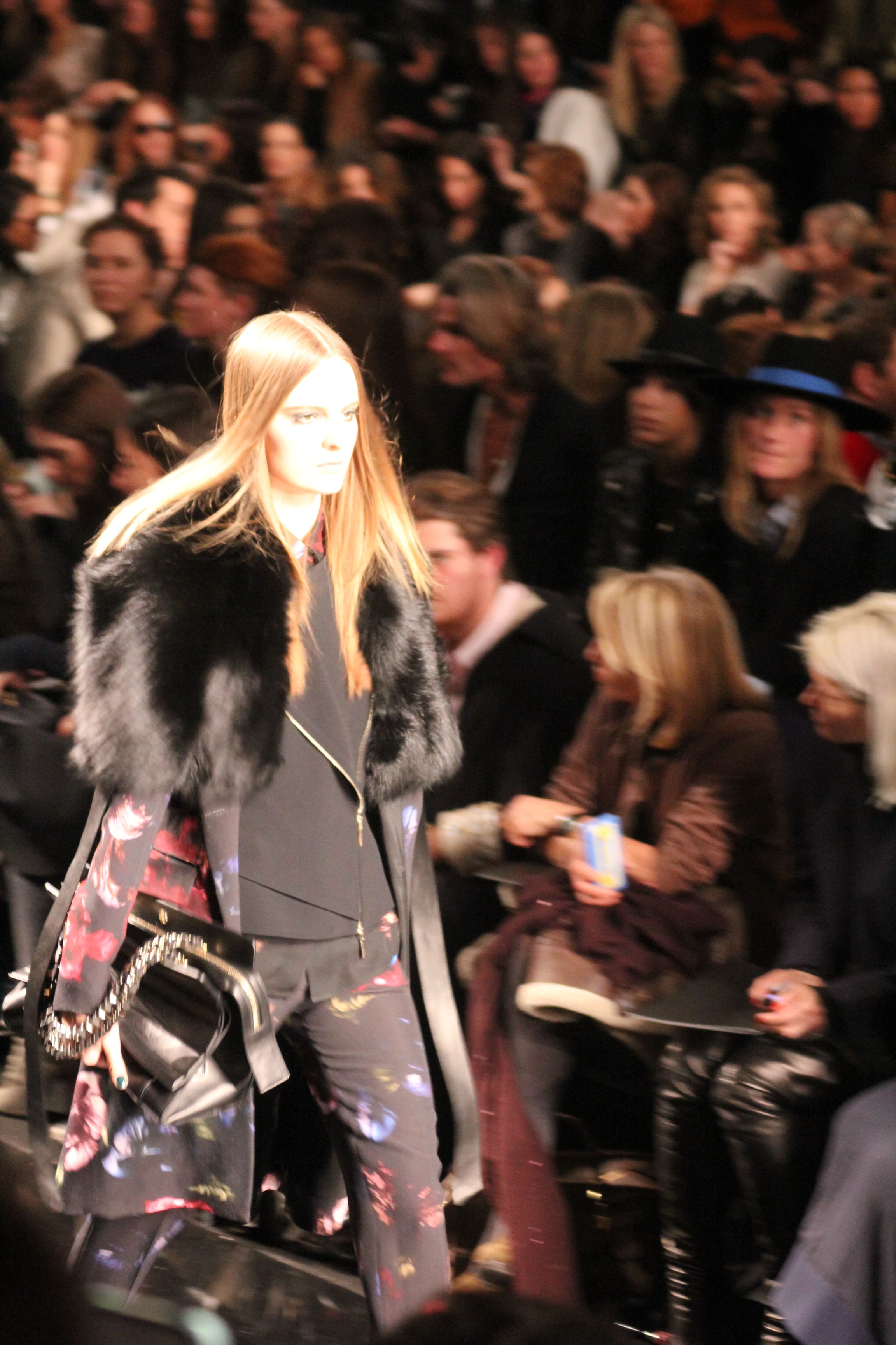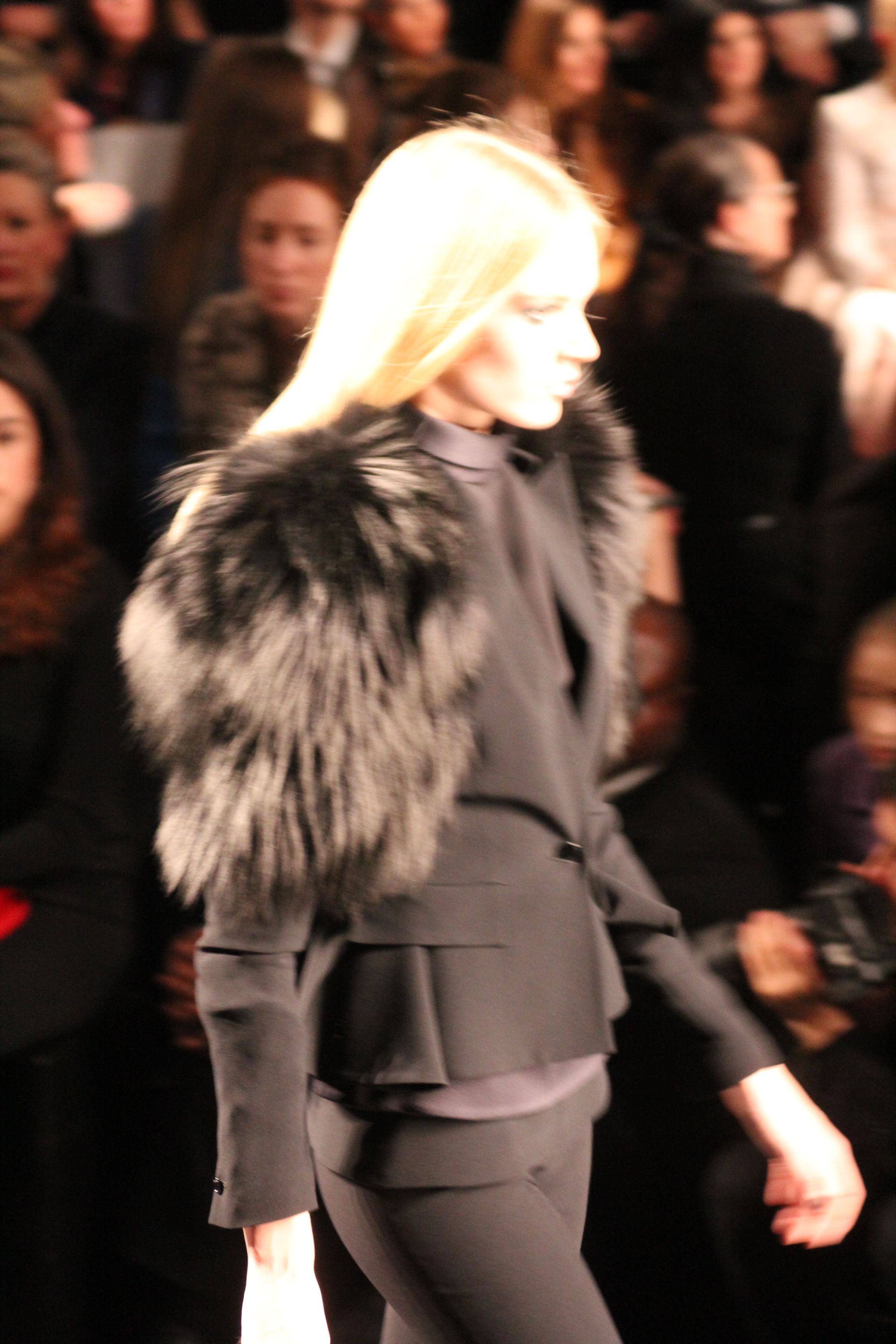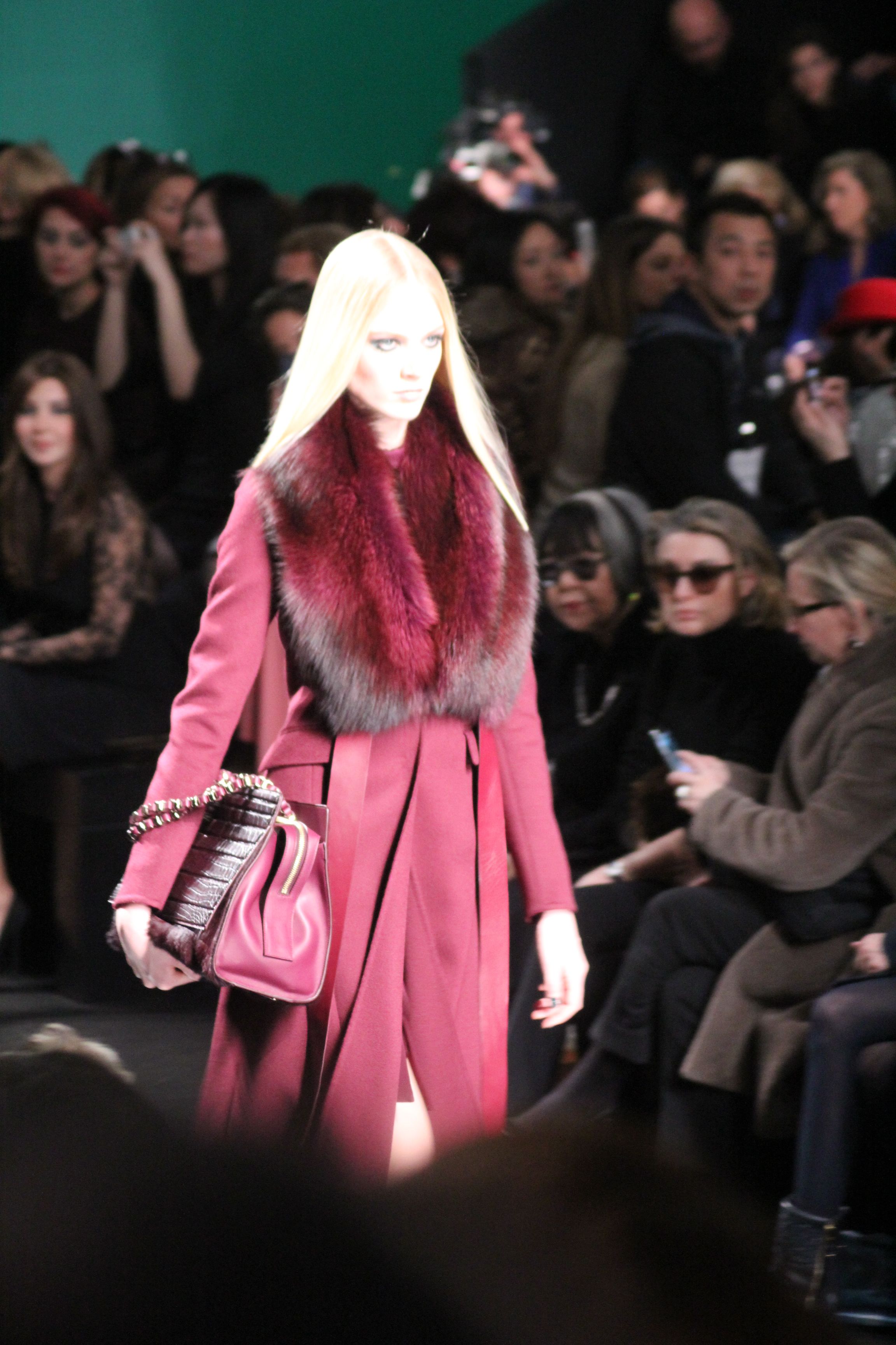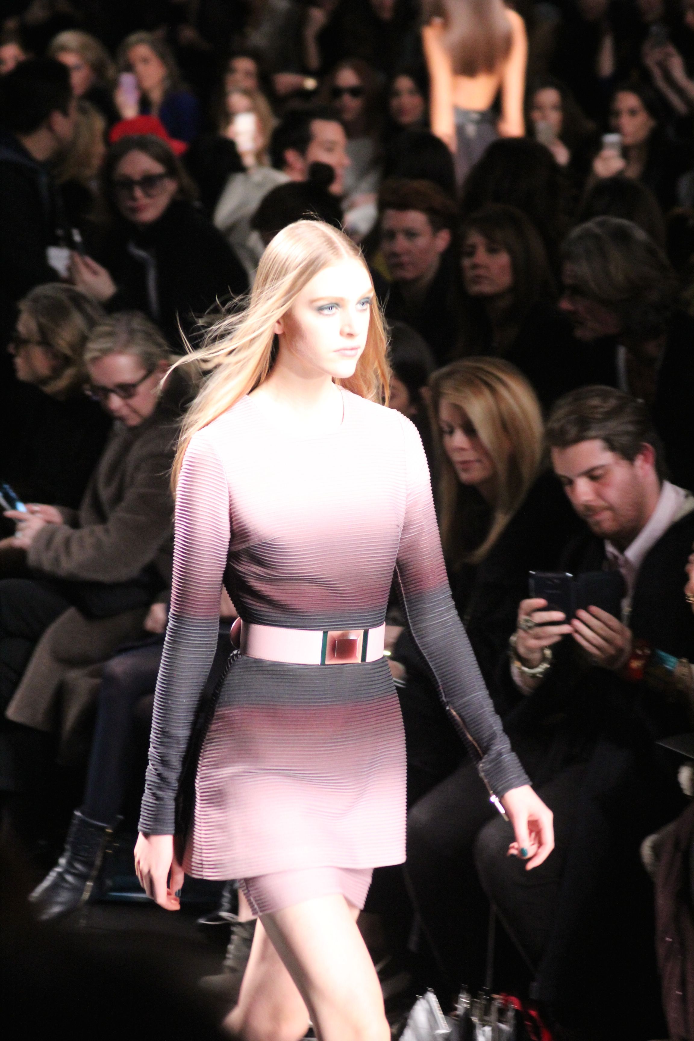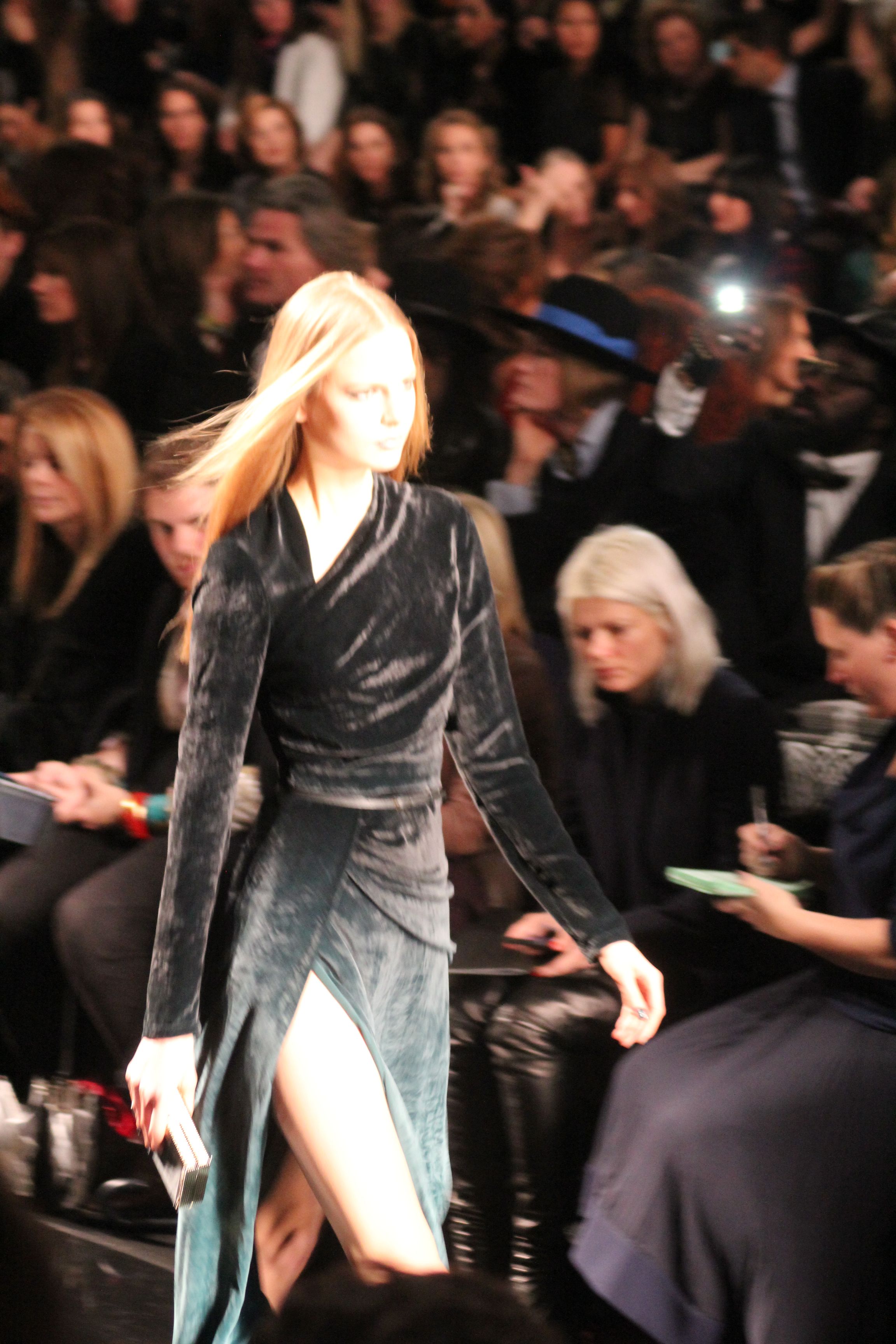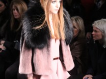 Dégradés ton sur ton, les silhouettes évoluent dans des jeux de matières précieuses : ici, un manteau en fourrure diapré et structuré se dessine de manière élégante et sensuelle. Là, un jeu de paillettes brodées parsème et illumine une robe vertigineuse.