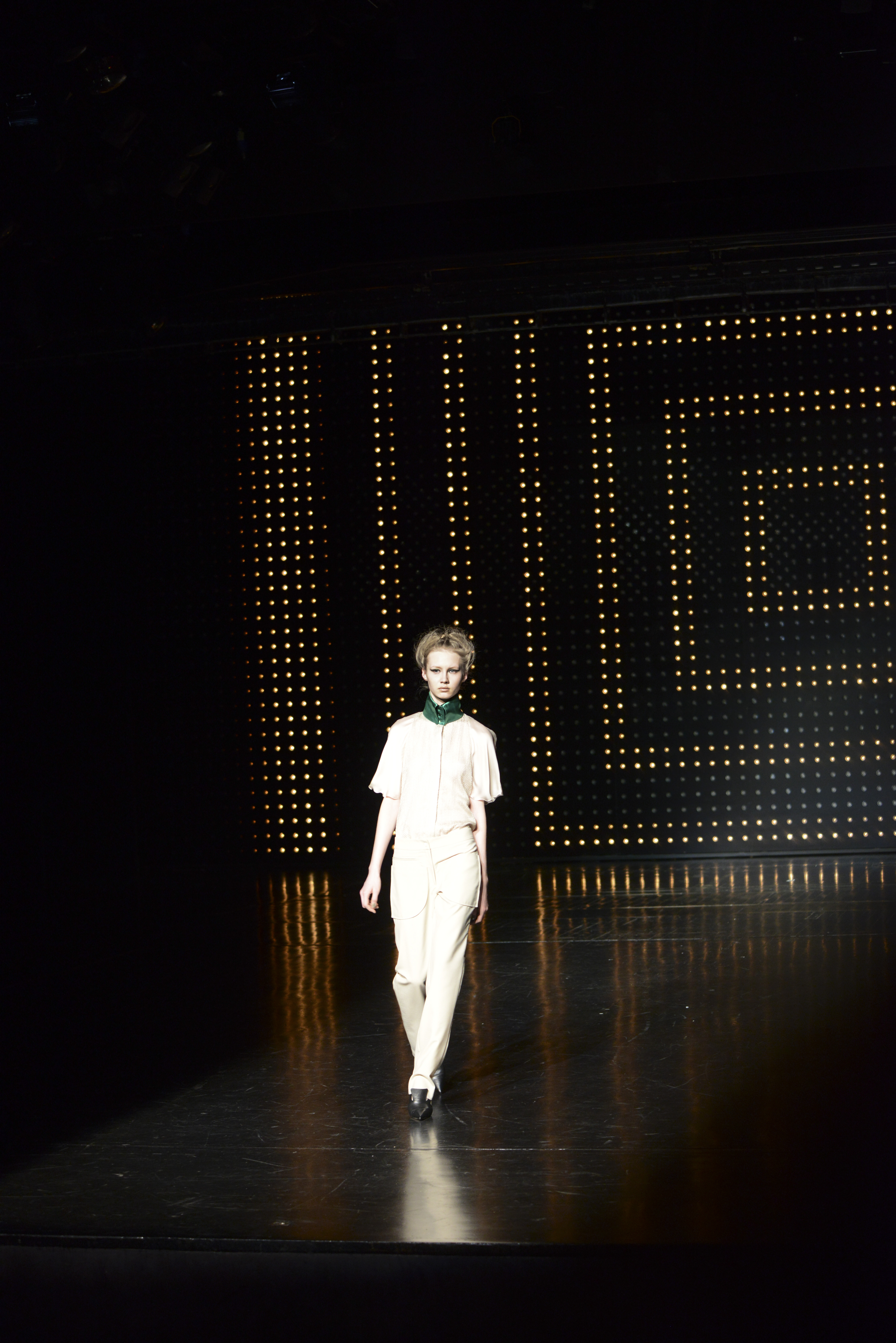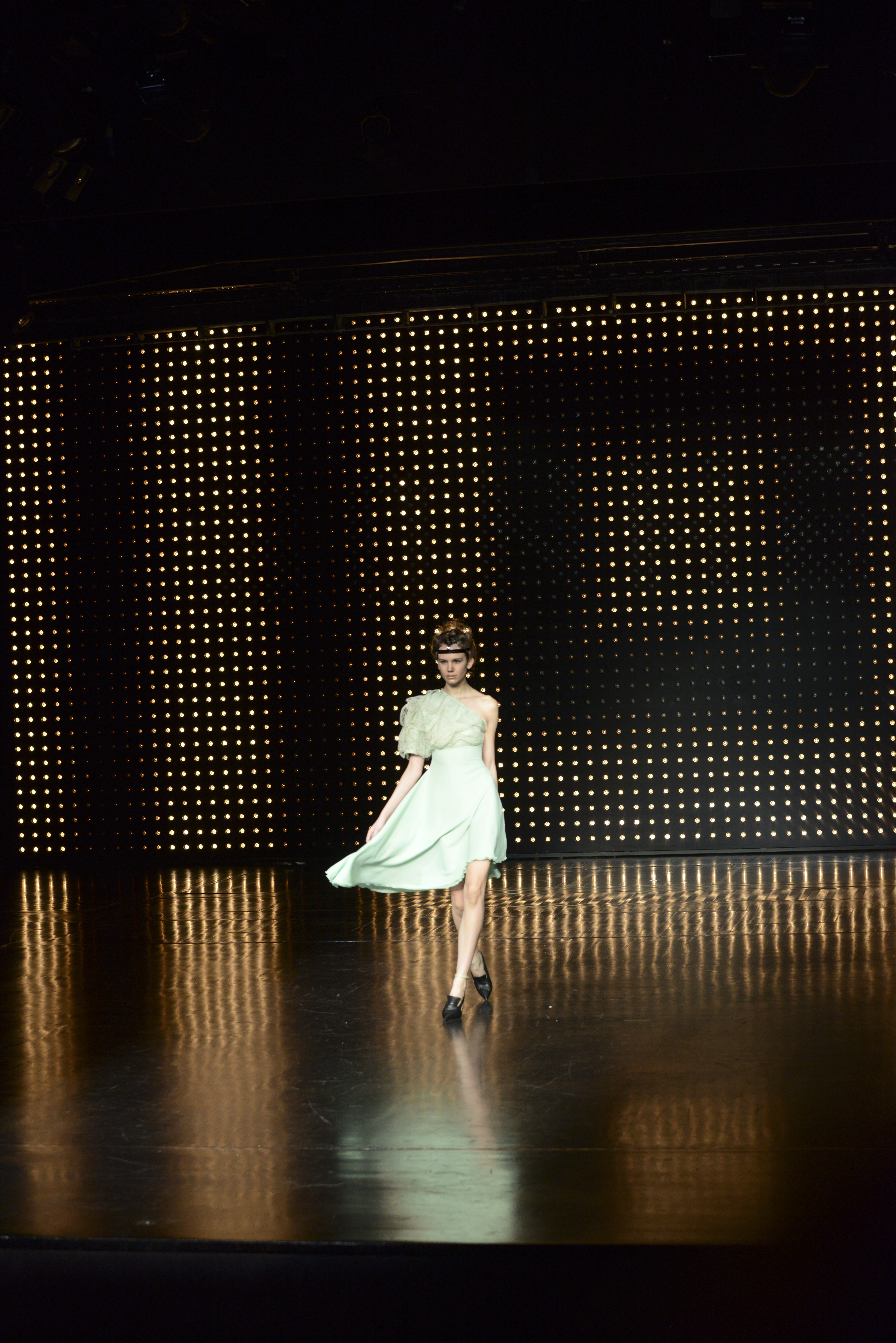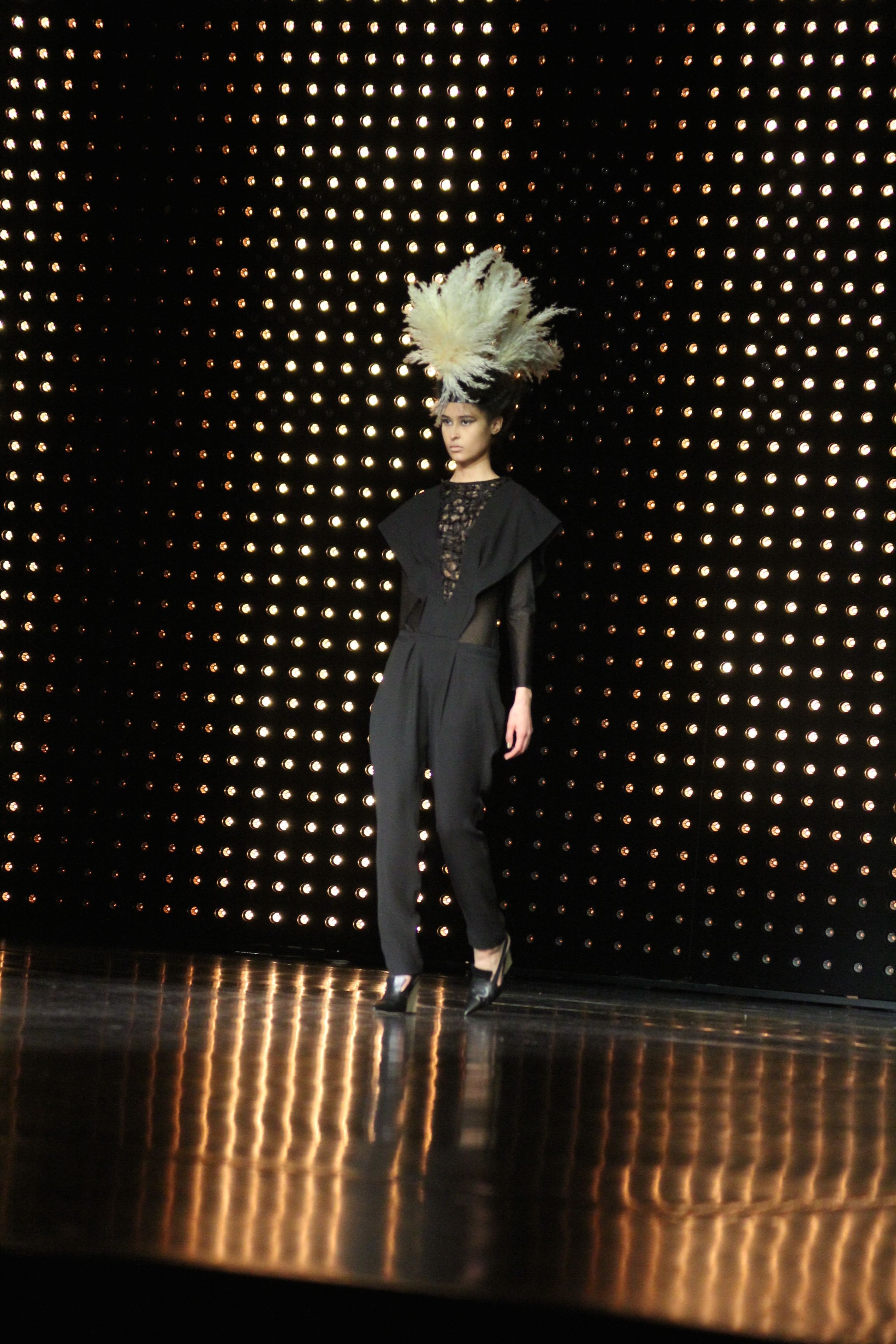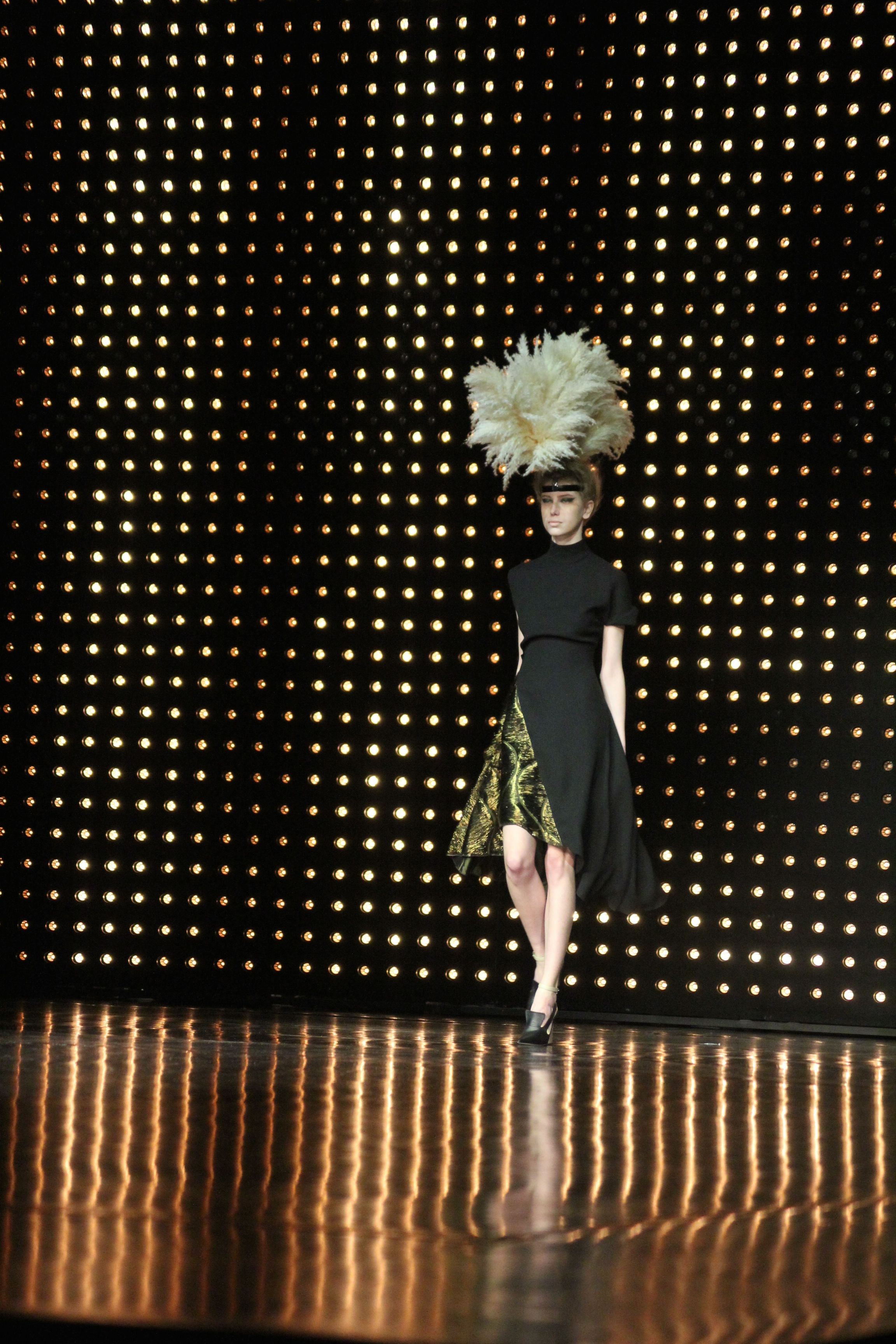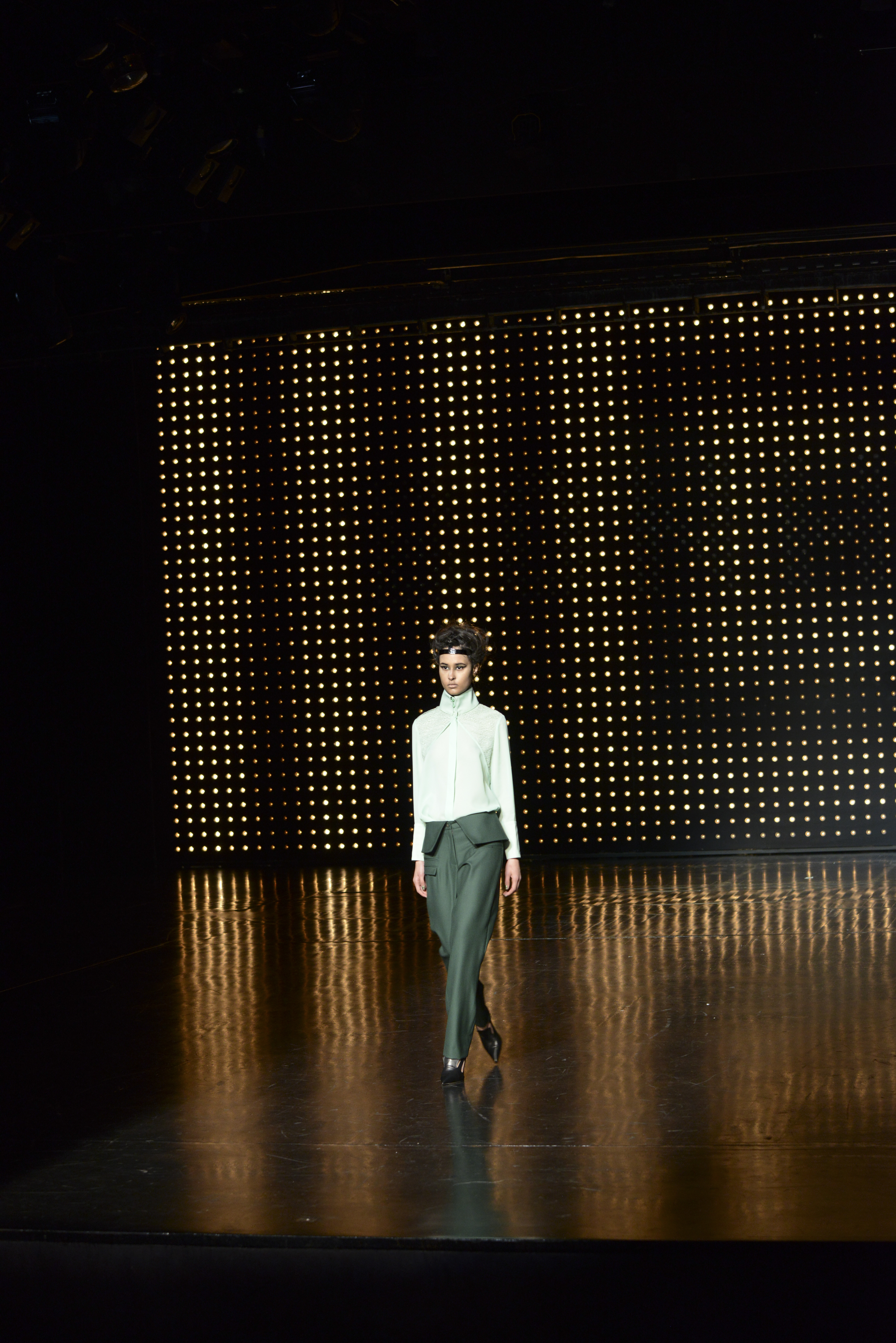 Dans des tons terre et nude mêlés aux bleus intenses et au noir, les robes, les jupes et les pantalons sont rehaussées de touches vertes, du kaki au vert d’eau en passant par le vert métallique, couleur unique du scarabée. Les matières sont fortes, la laine, le cachemire ou encore le tartan jouent et se superposent avec la transparence de la mousseline ou du voile. Les tenues sont parfois accessoirisées par des plumes rappelant la finesse des oiseaux et faisant écho au magnifique cabaret qui servait de cadre à ce défilé.