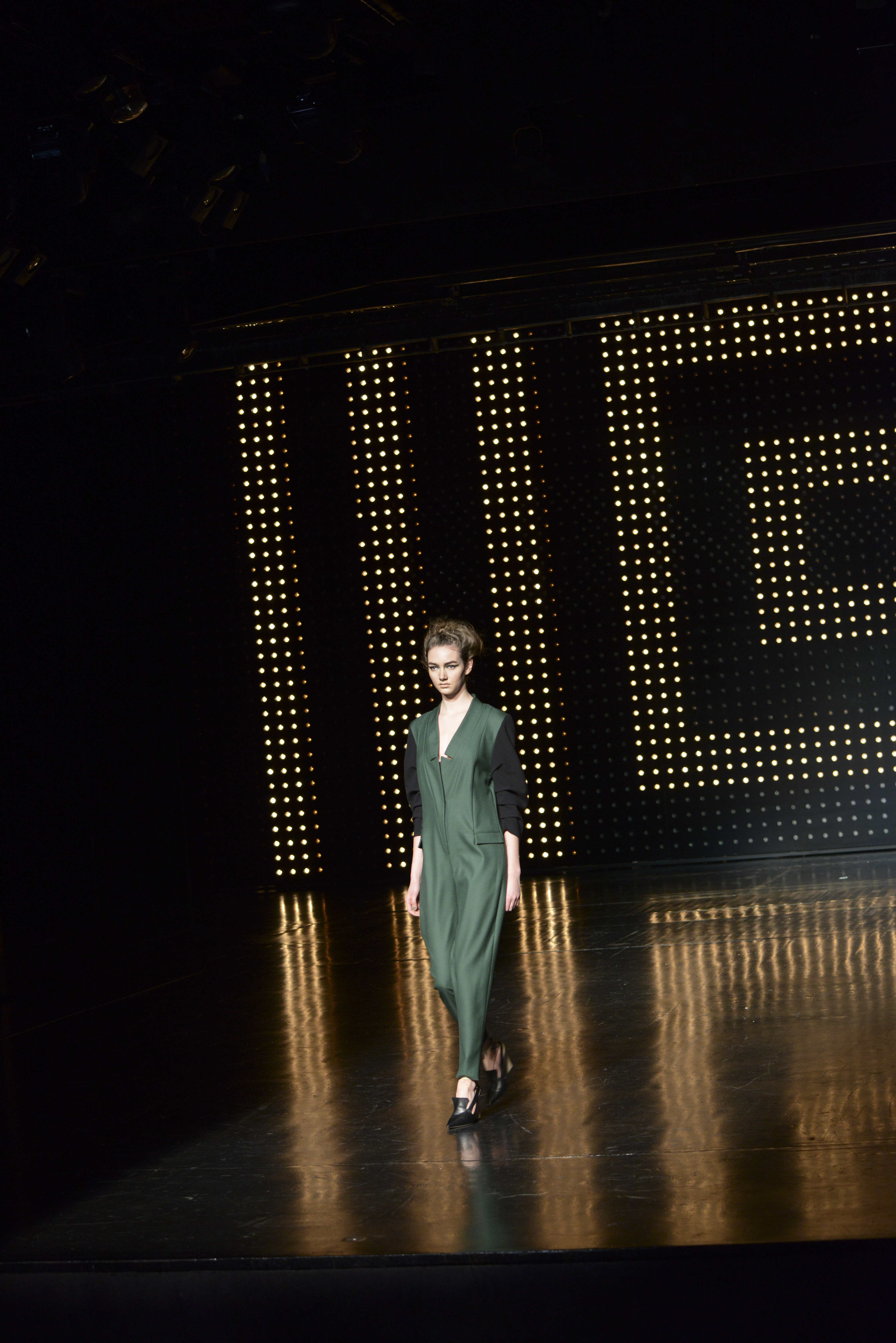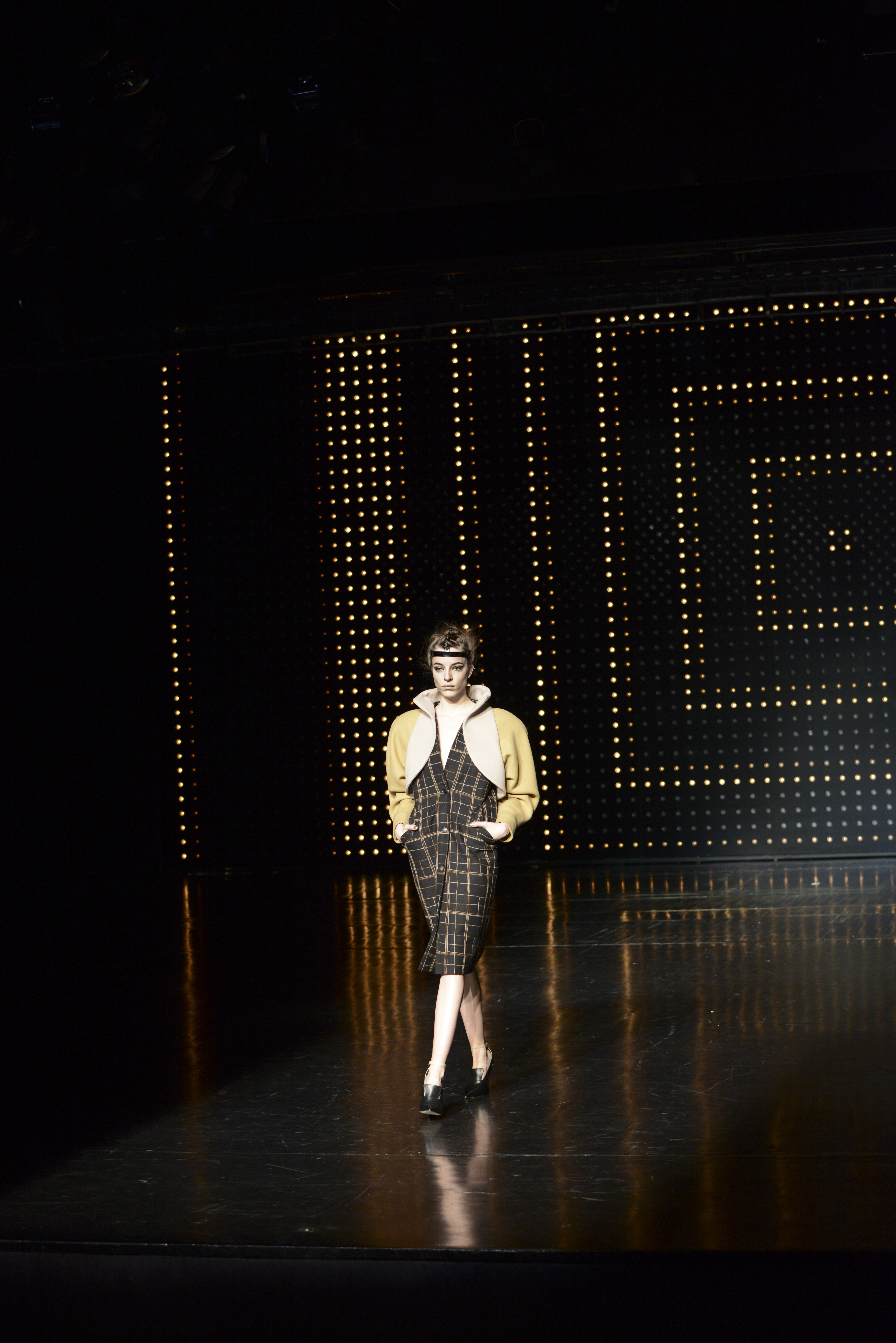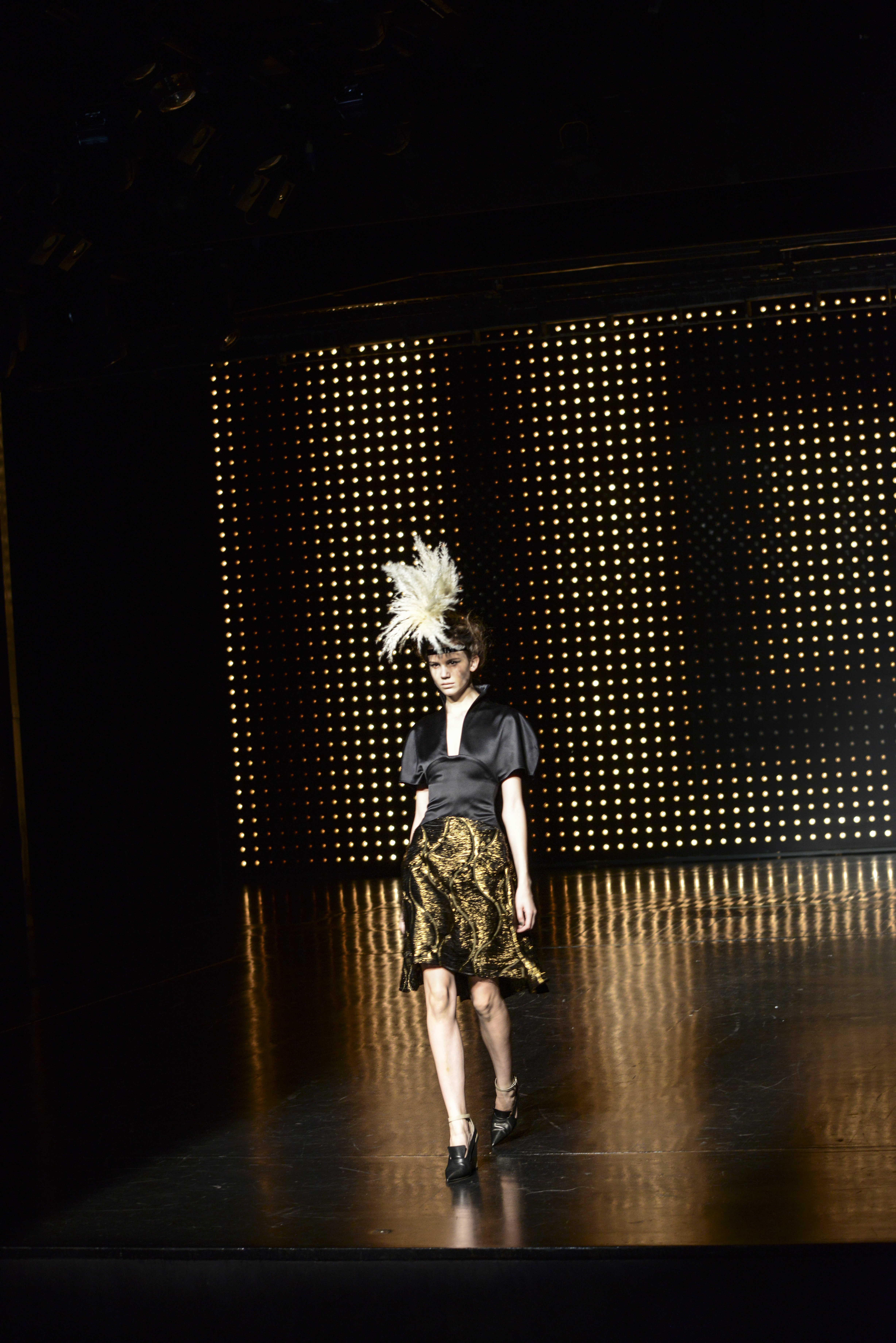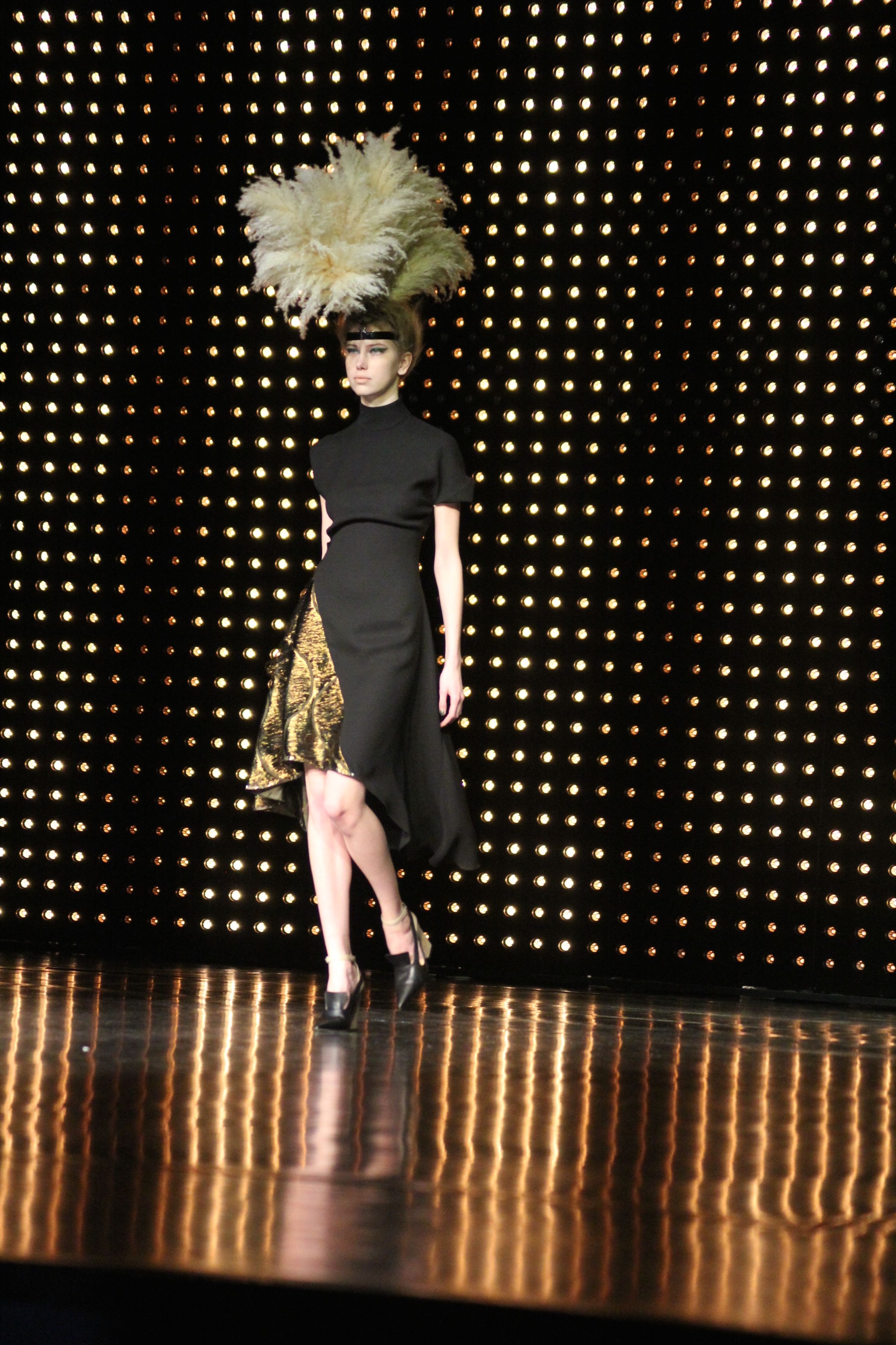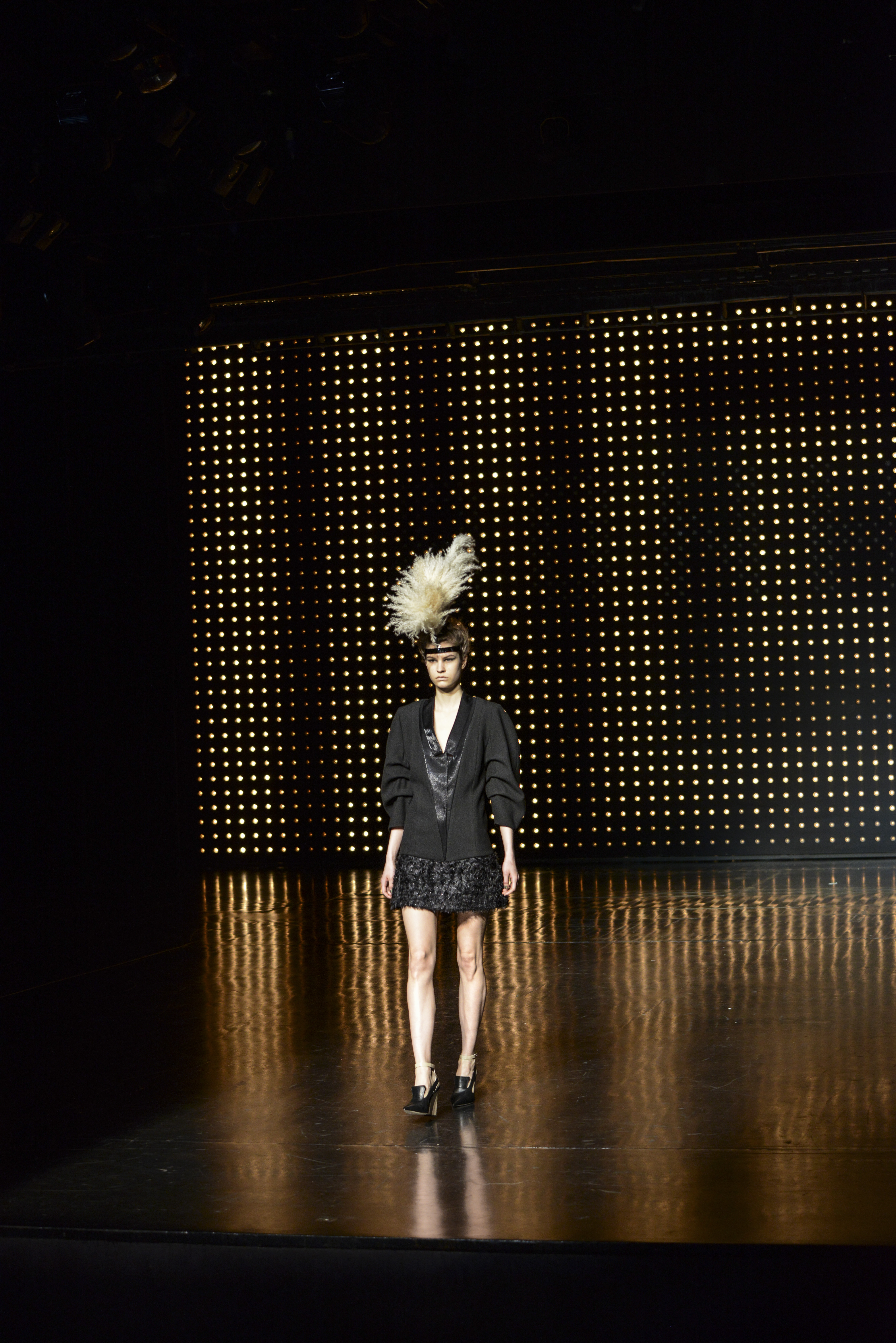 Dans des tons terre et nude mêlés aux bleus intenses et au noir, les robes, les jupes et les pantalons sont rehaussées de touches vertes, du kaki au vert d’eau en passant par le vert métallique, couleur unique du scarabée. Les matières sont fortes, la laine, le cachemire ou encore le tartan jouent et se superposent avec la transparence de la mousseline ou du voile. Les tenues sont parfois accessoirisées par des plumes rappelant la finesse des oiseaux et faisant écho au magnifique cabaret qui servait de cadre à ce défilé.