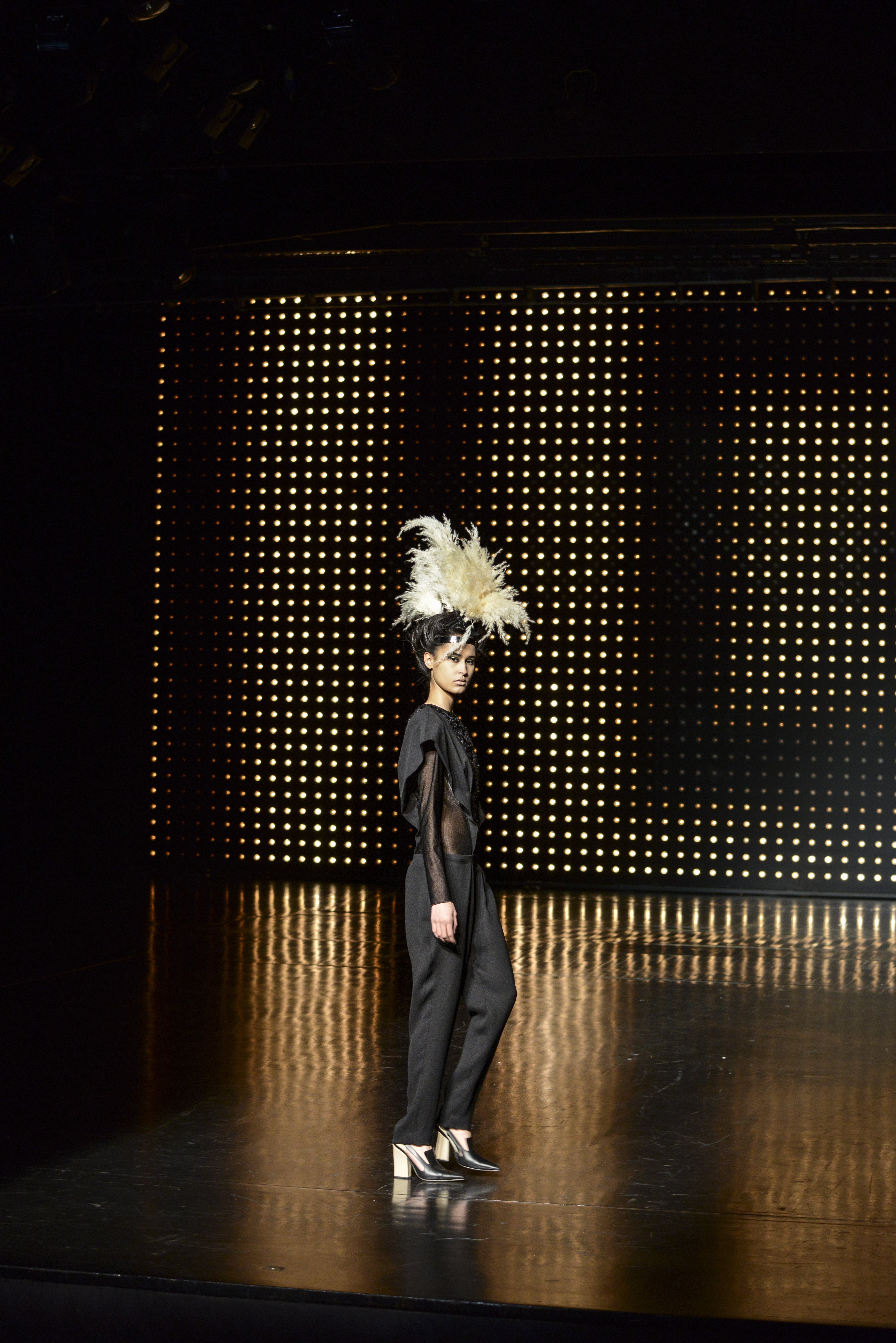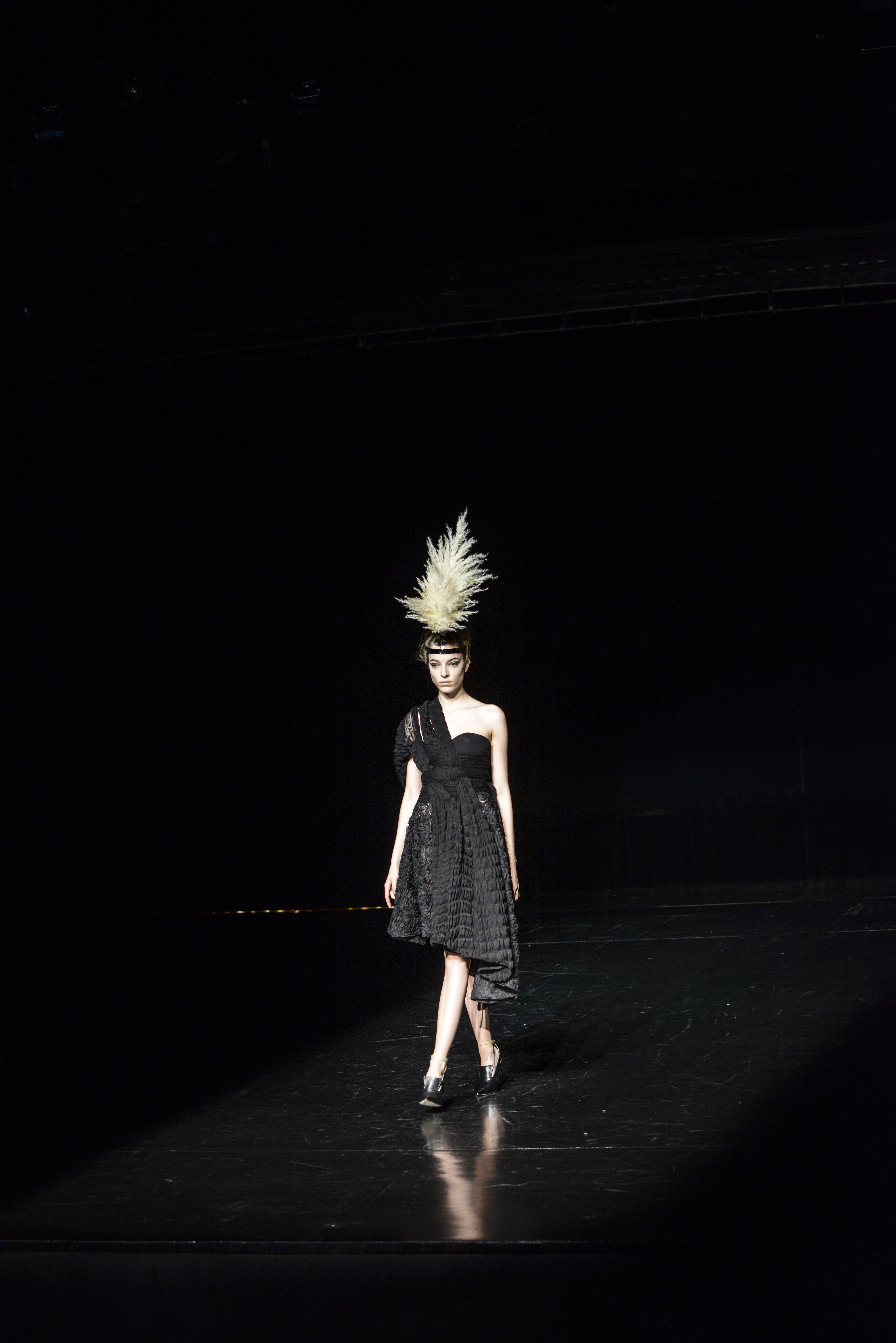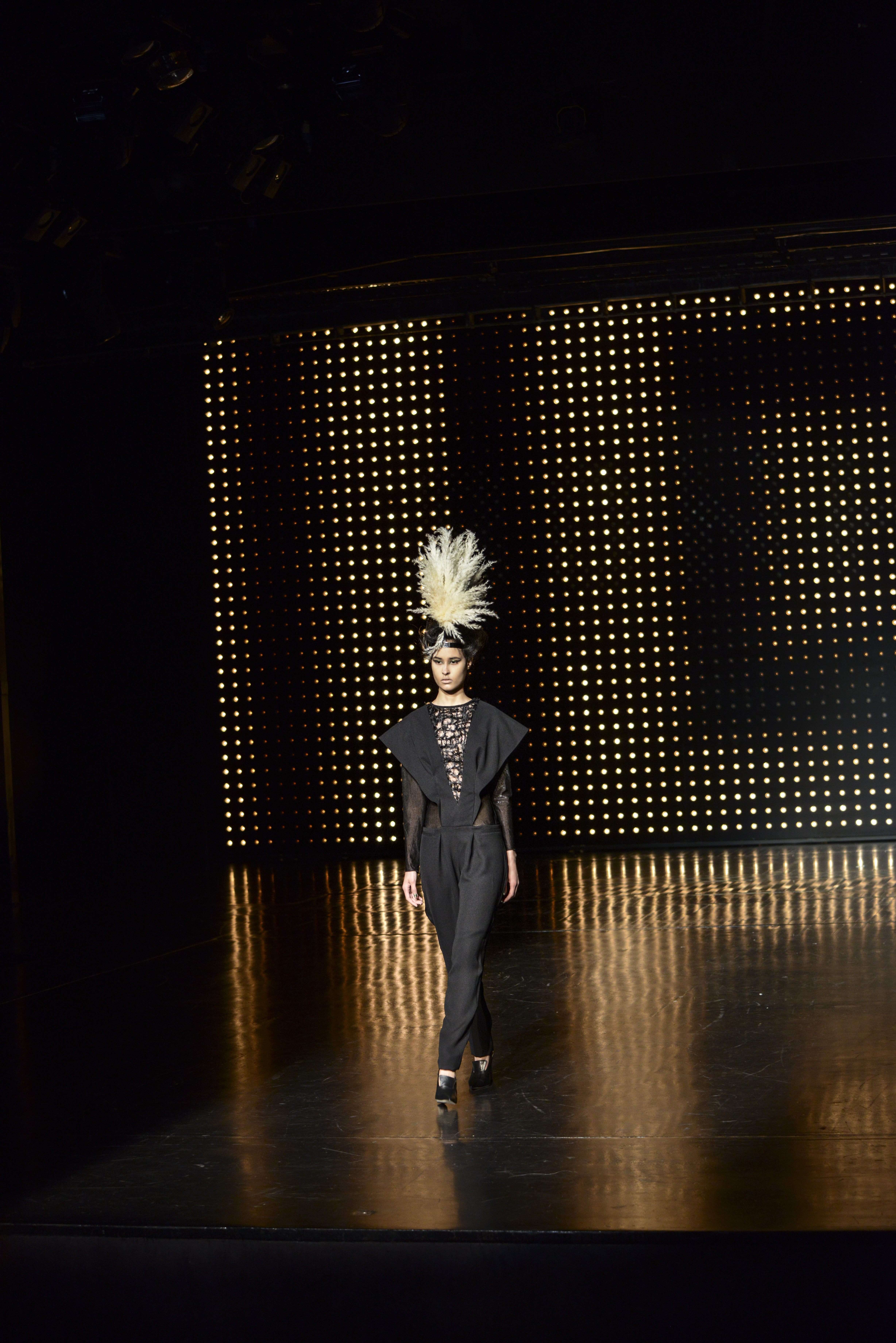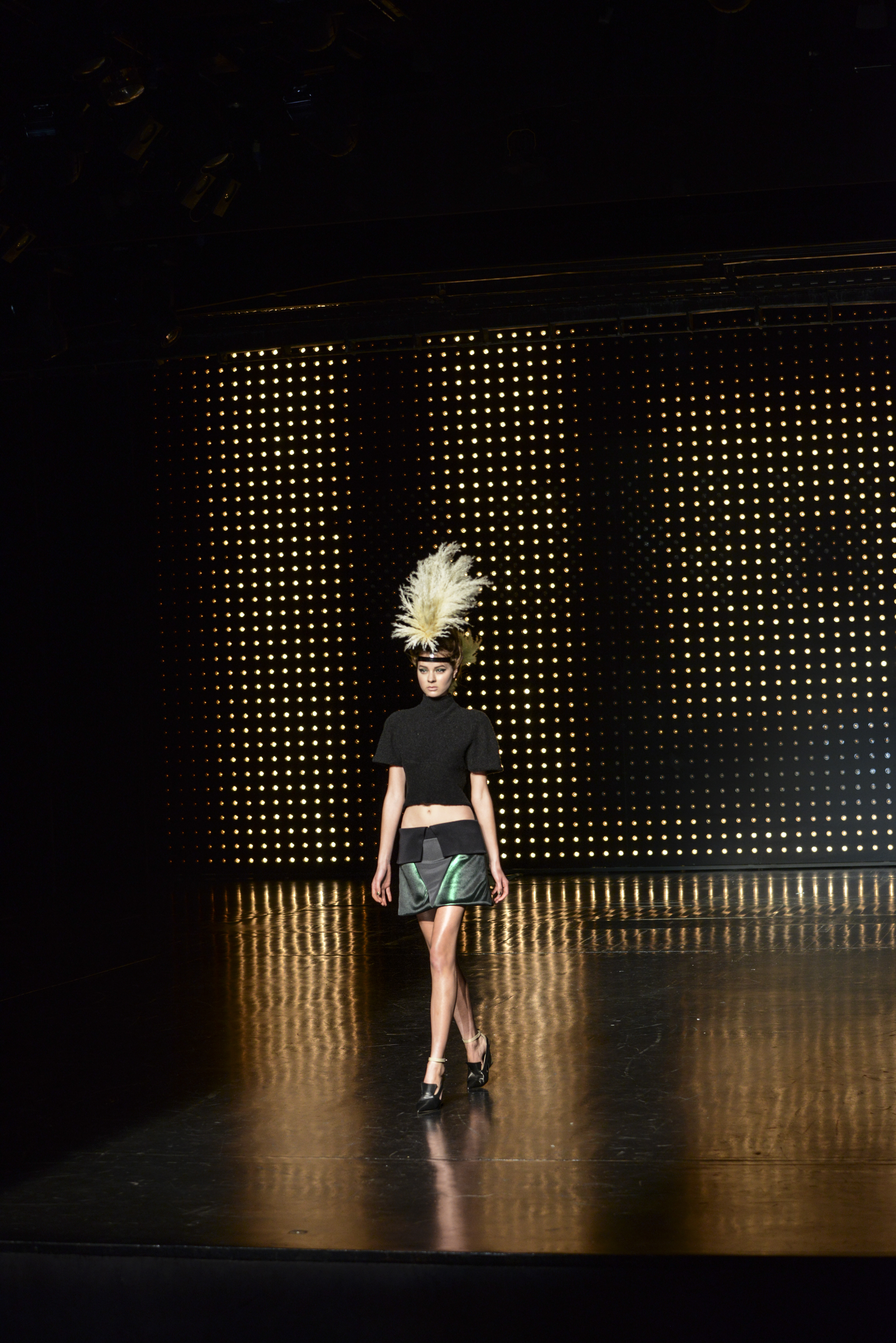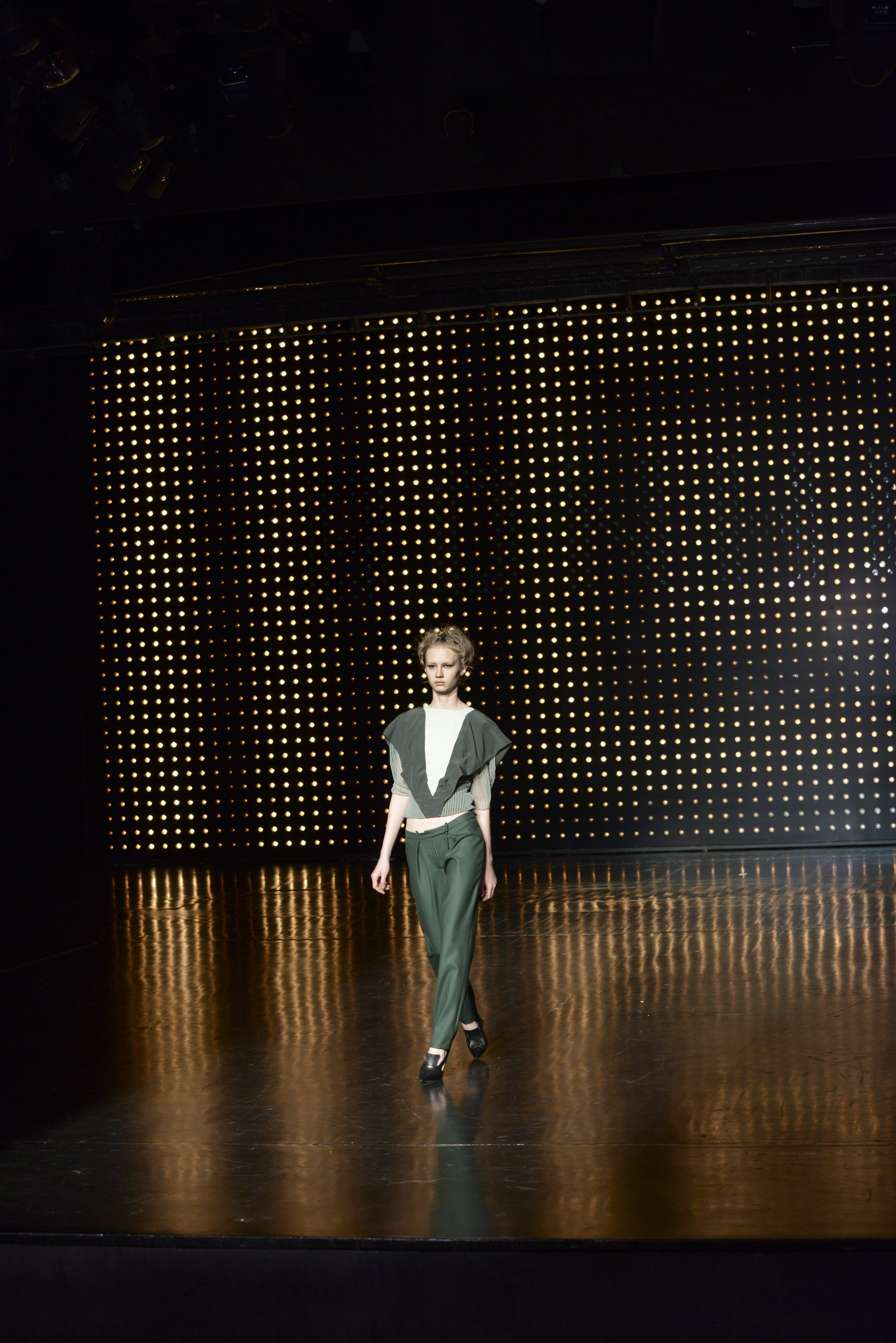 Dans des tons terre et nude mêlés aux bleus intenses et au noir, les robes, les jupes et les pantalons sont rehaussées de touches vertes, du kaki au vert d’eau en passant par le vert métallique, couleur unique du scarabée. Les matières sont fortes, la laine, le cachemire ou encore le tartan jouent et se superposent avec la transparence de la mousseline ou du voile. Les tenues sont parfois accessoirisées par des plumes rappelant la finesse des oiseaux et faisant écho au magnifique cabaret qui servait de cadre à ce défilé.