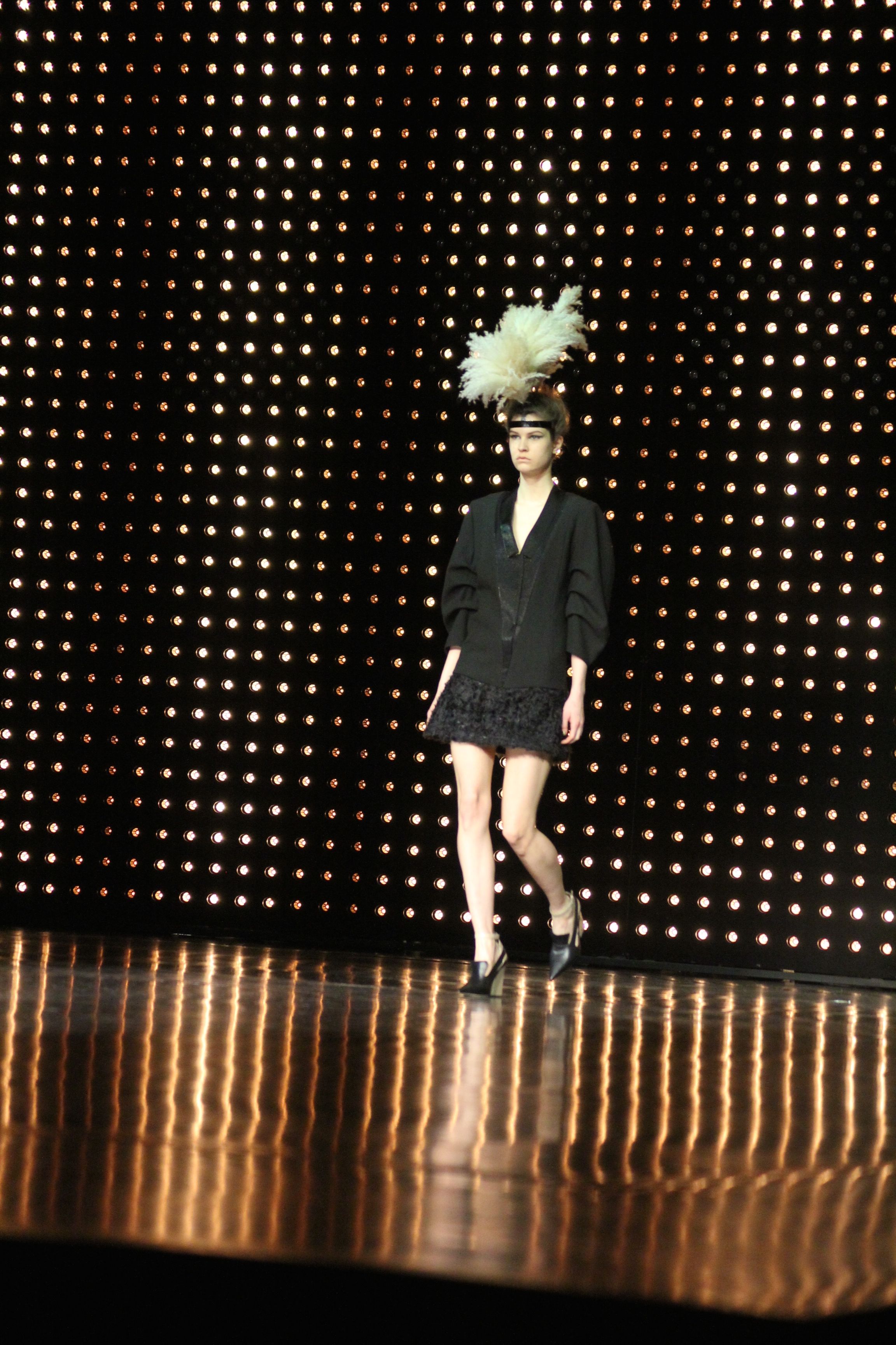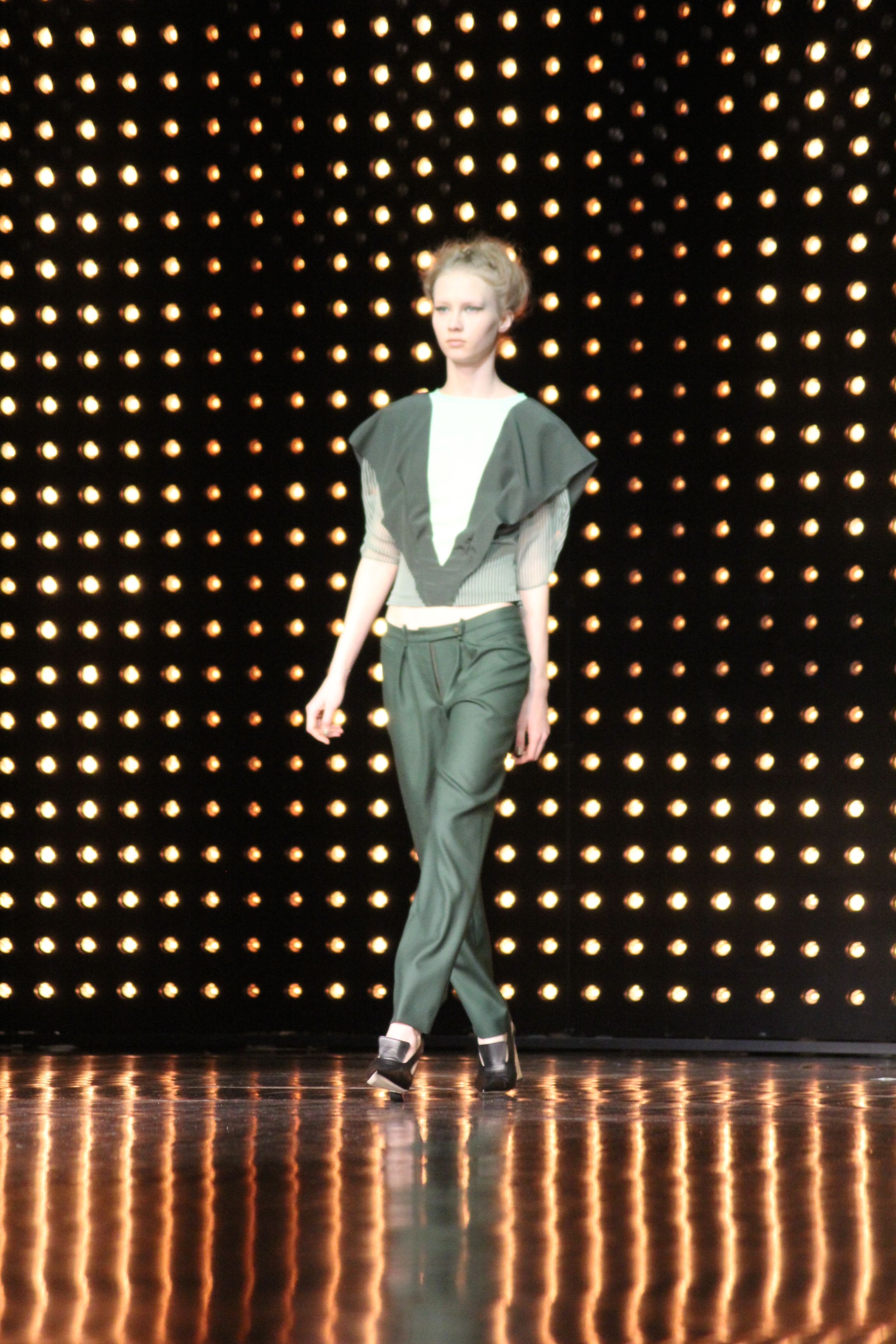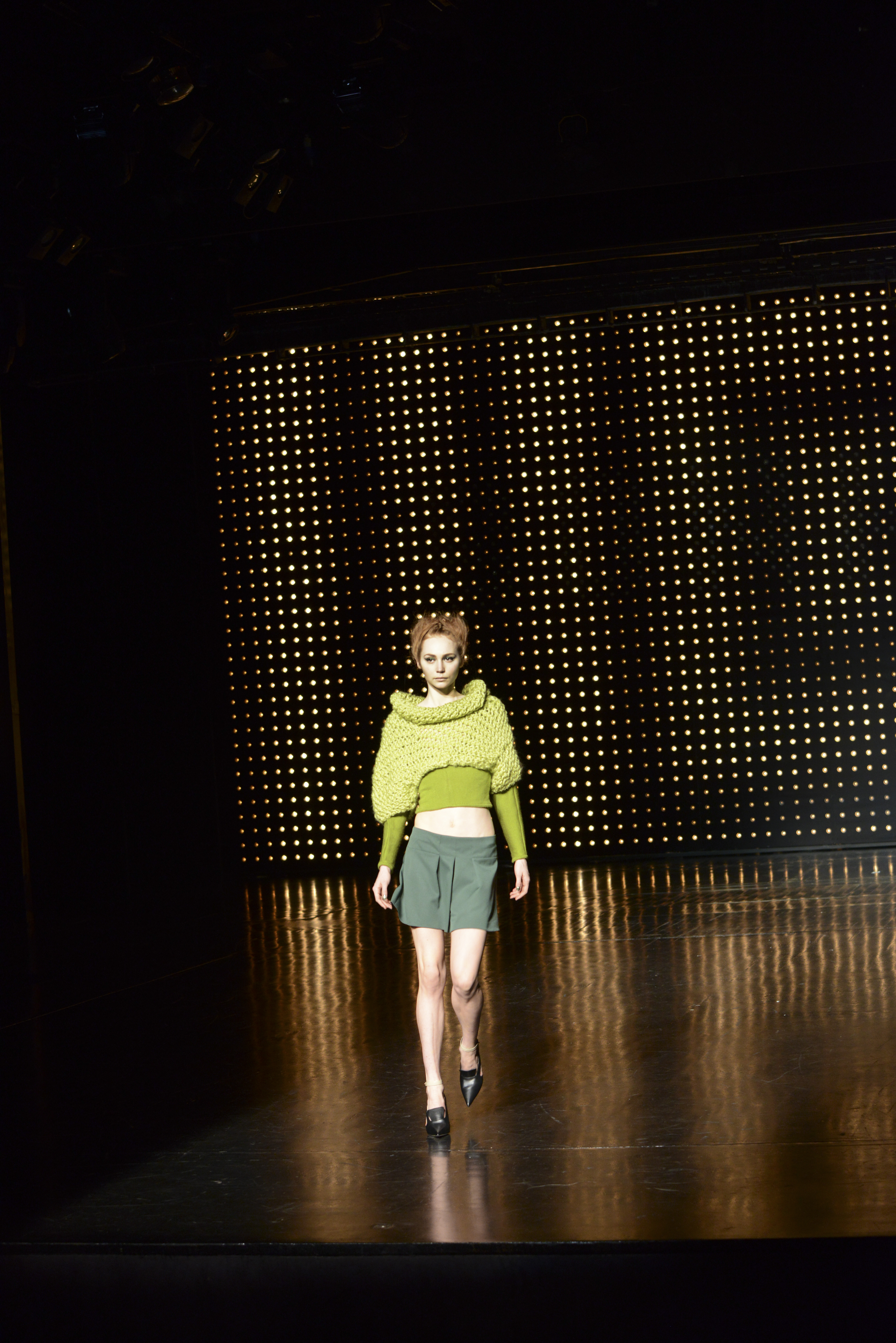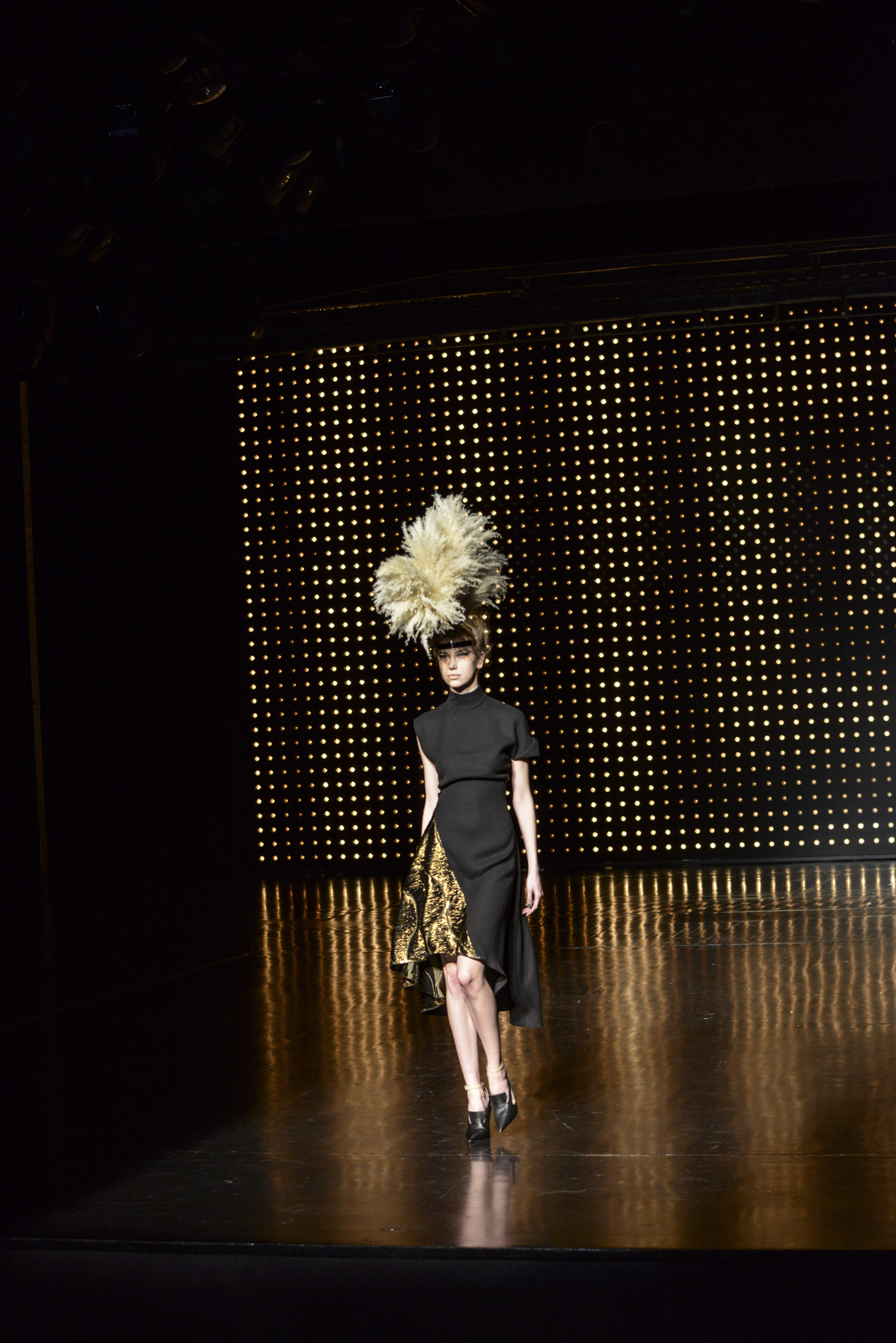 Dans des tons terre et nude mêlés aux bleus intenses et au noir, les robes, les jupes et les pantalons sont rehaussées de touches vertes, du kaki au vert d’eau en passant par le vert métallique, couleur unique du scarabée. Les matières sont fortes, la laine, le cachemire ou encore le tartan jouent et se superposent avec la transparence de la mousseline ou du voile. Les tenues sont parfois accessoirisées par des plumes rappelant la finesse des oiseaux et faisant écho au magnifique cabaret qui servait de cadre à ce défilé.