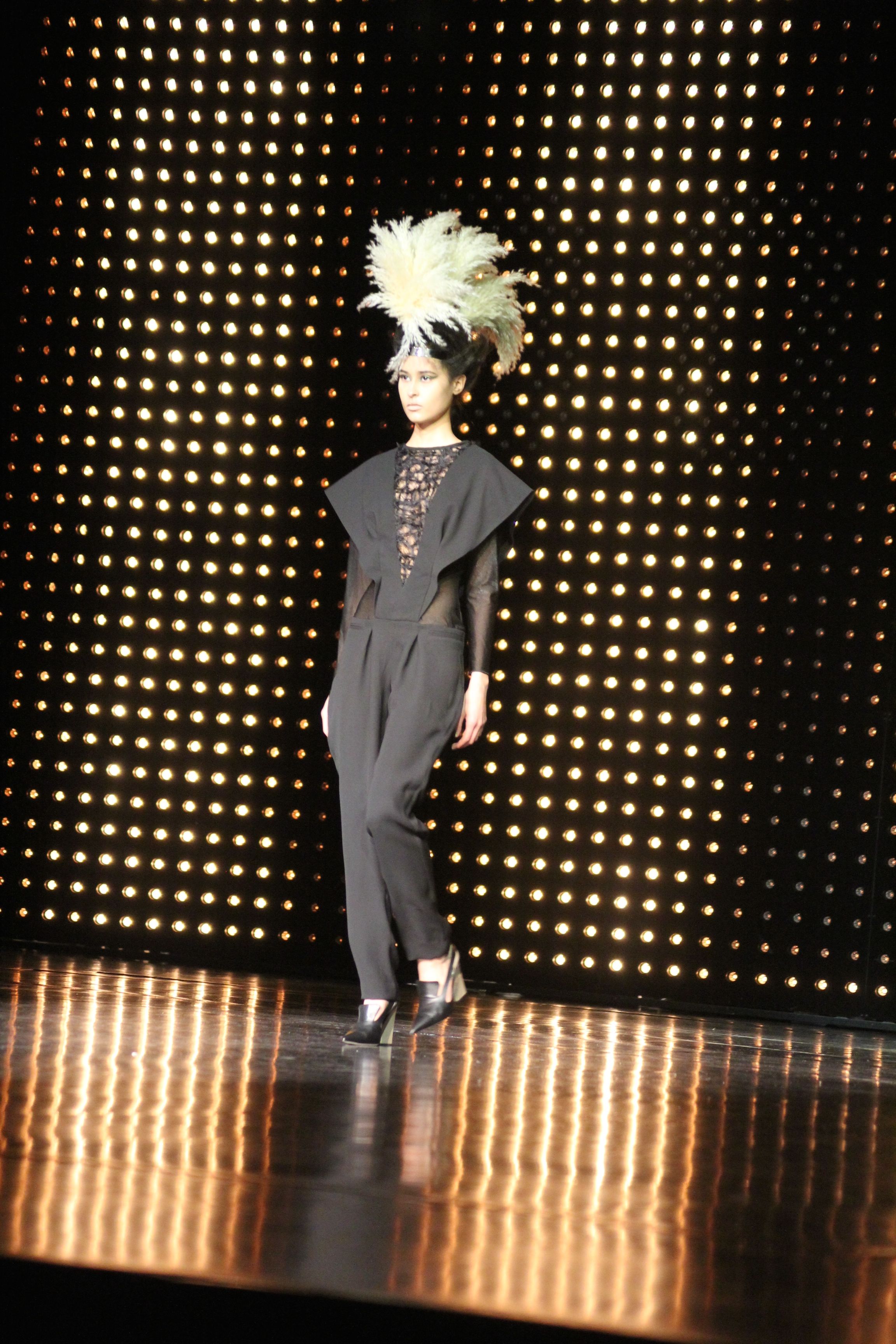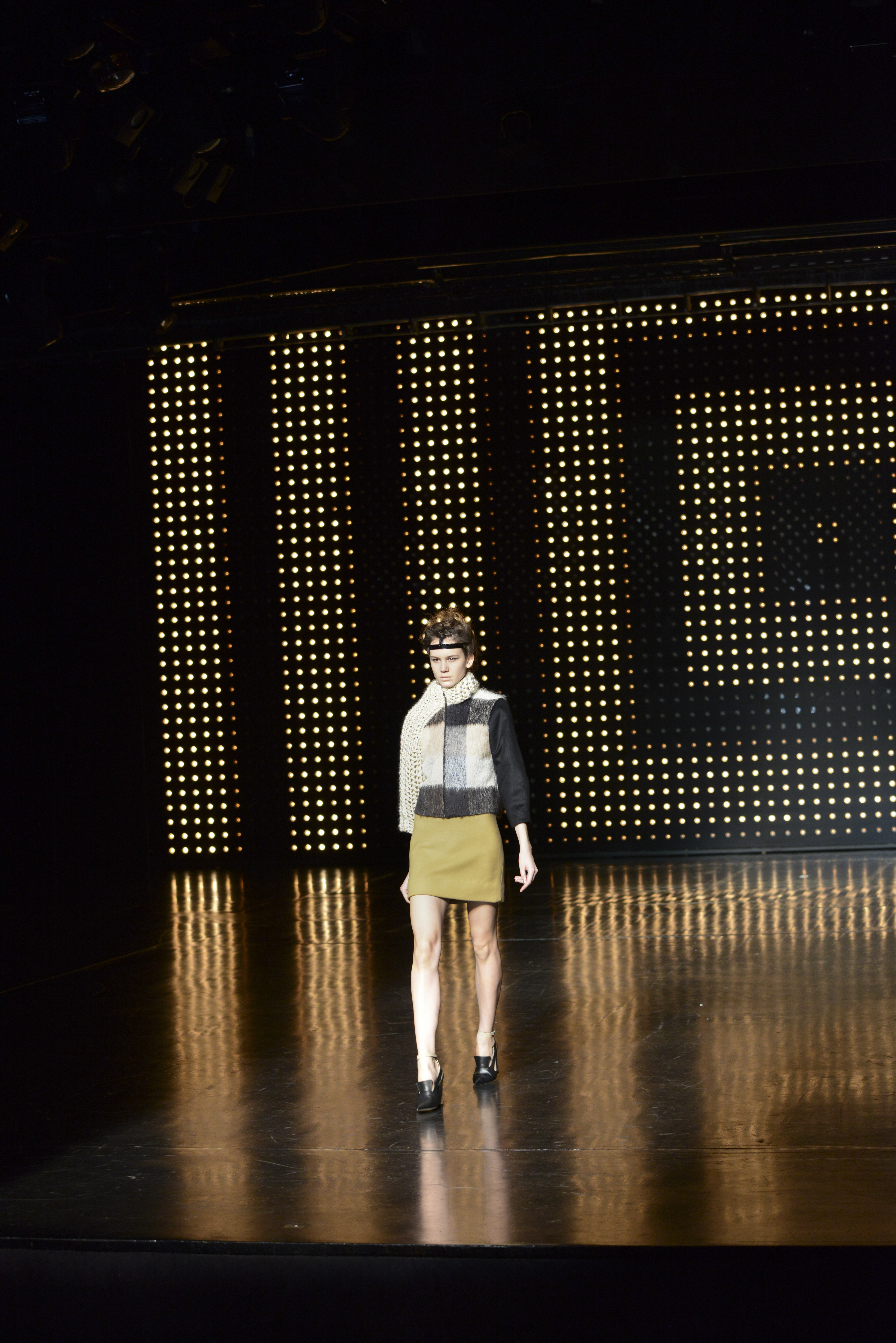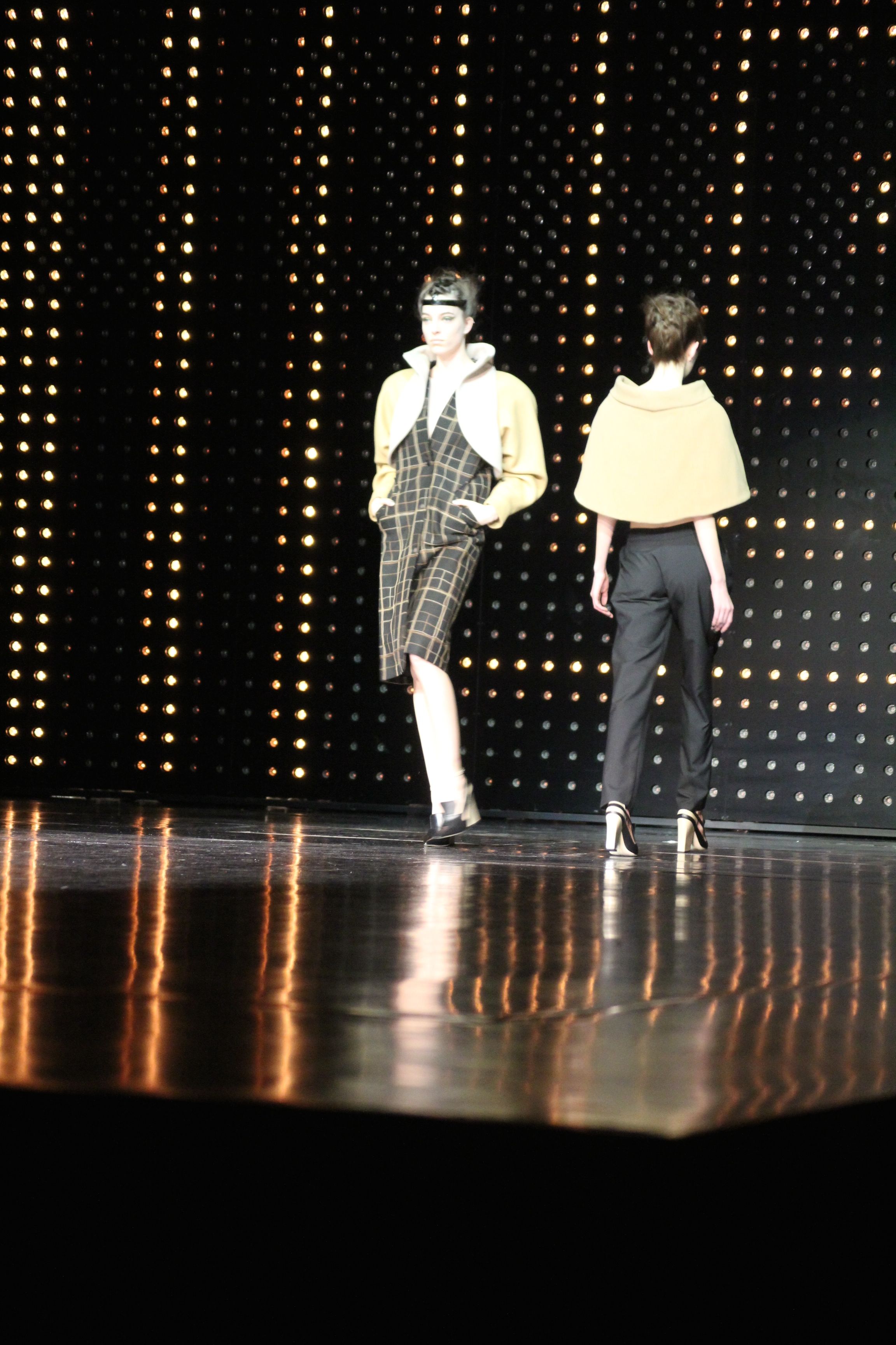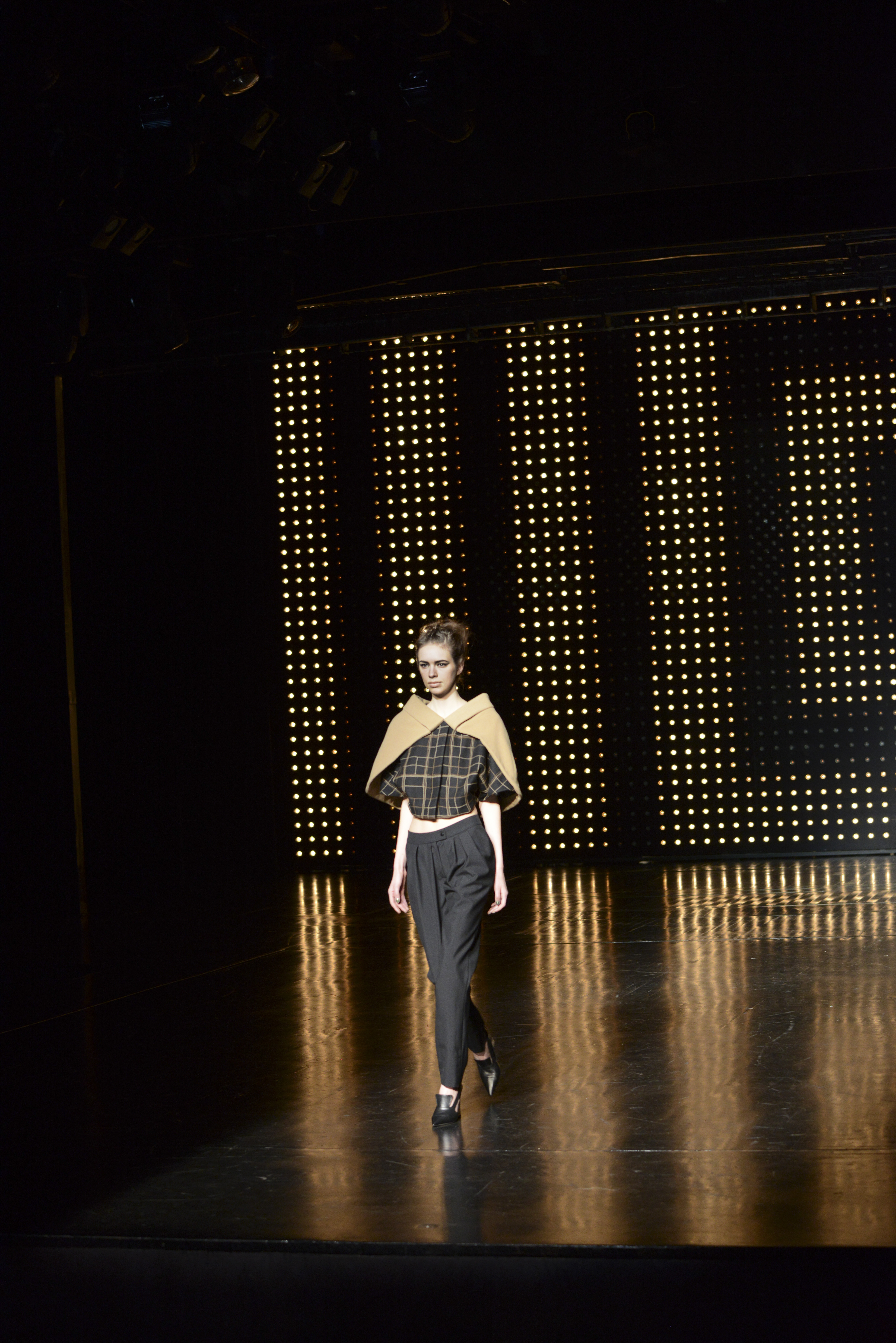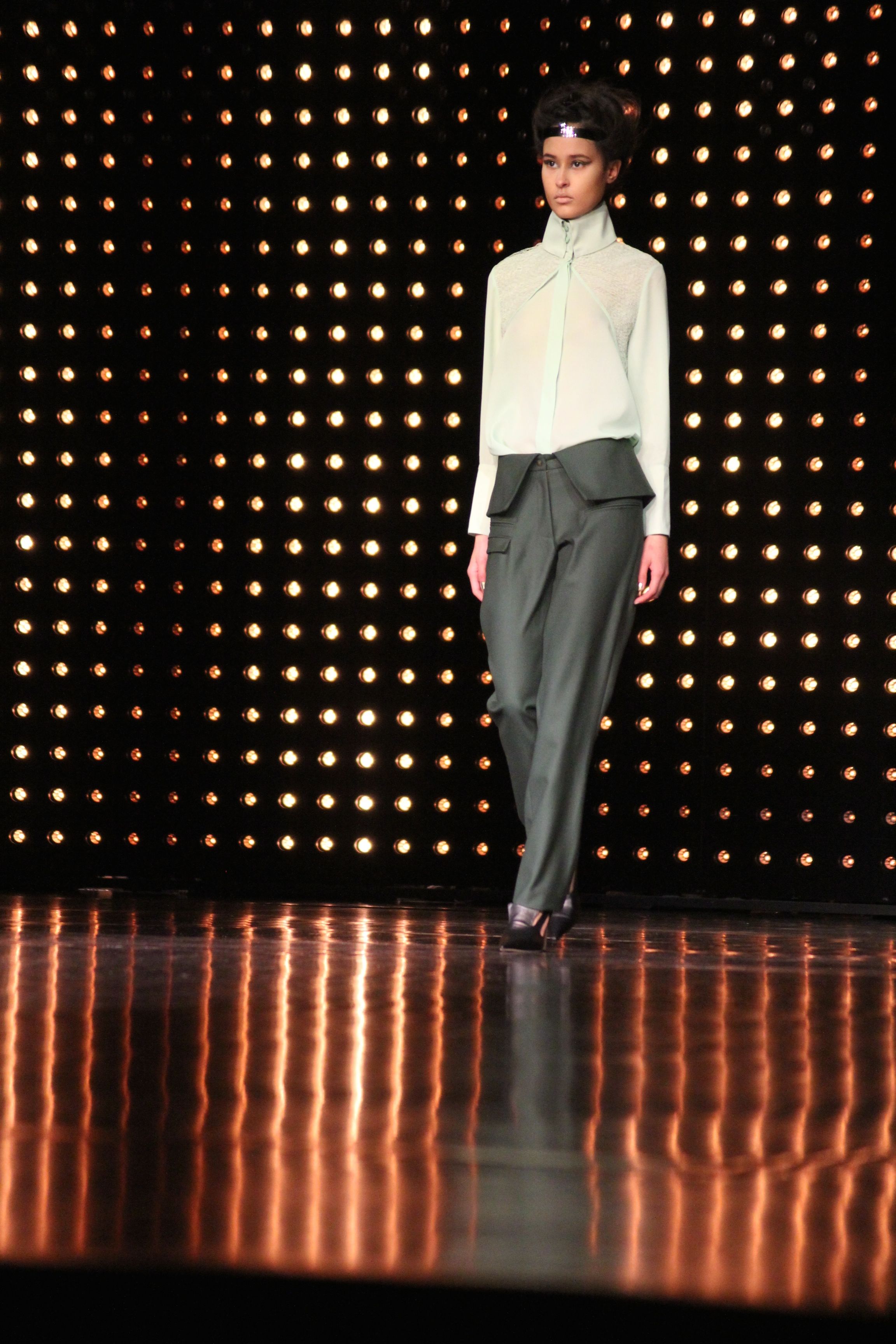 Dans des tons terre et nude mêlés aux bleus intenses et au noir, les robes, les jupes et les pantalons sont rehaussées de touches vertes, du kaki au vert d’eau en passant par le vert métallique, couleur unique du scarabée. Les matières sont fortes, la laine, le cachemire ou encore le tartan jouent et se superposent avec la transparence de la mousseline ou du voile. Les tenues sont parfois accessoirisées par des plumes rappelant la finesse des oiseaux et faisant écho au magnifique cabaret qui servait de cadre à ce défilé.