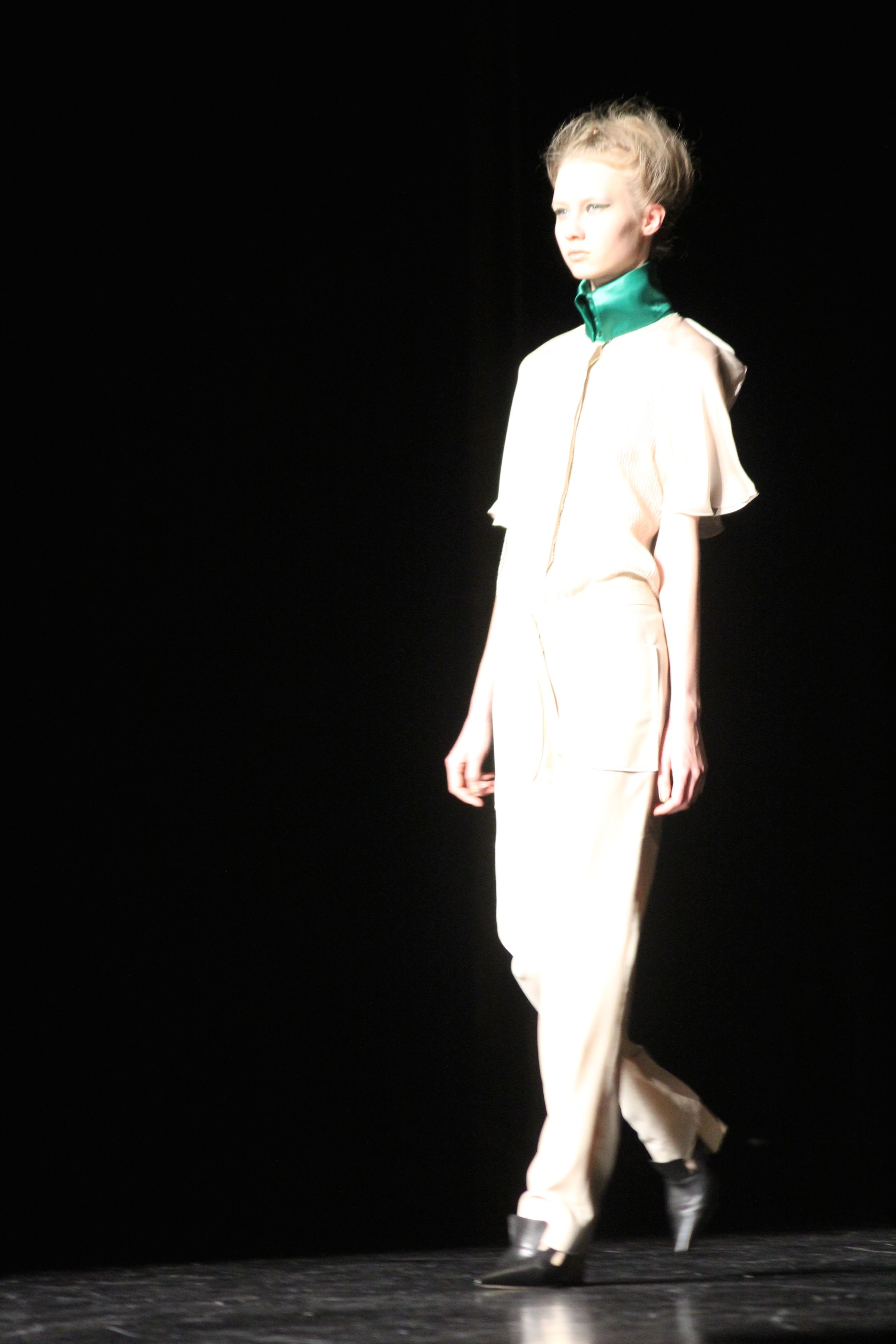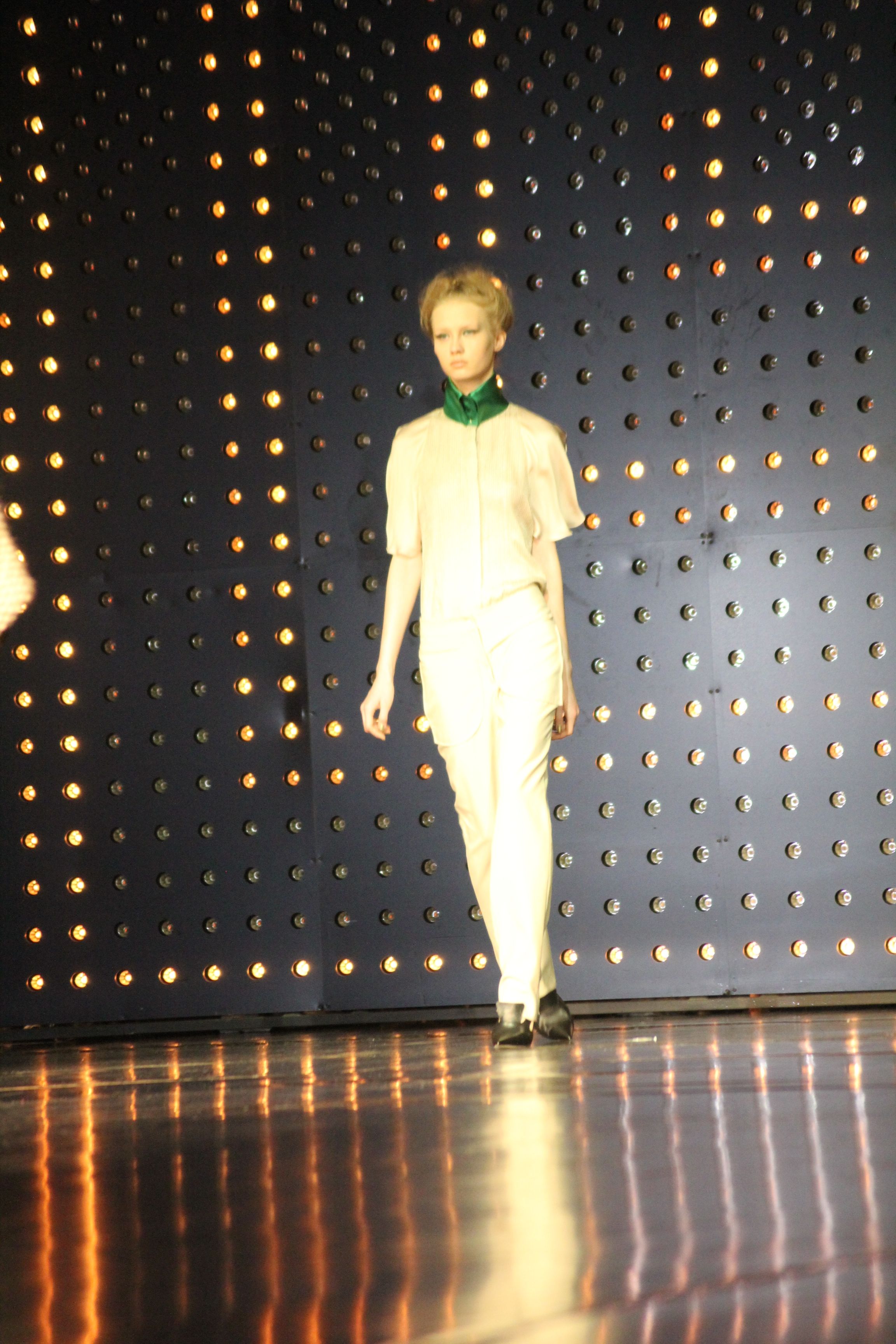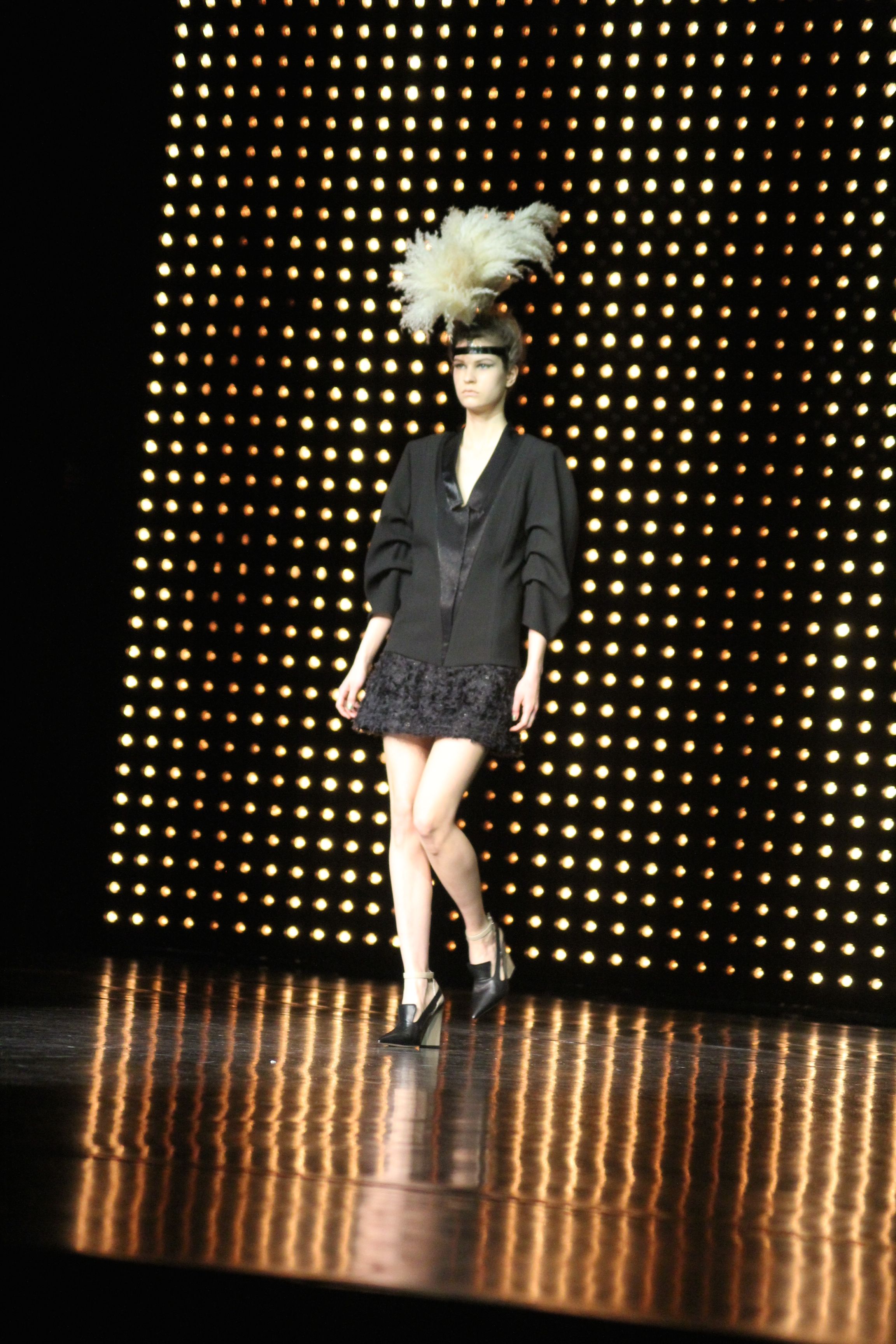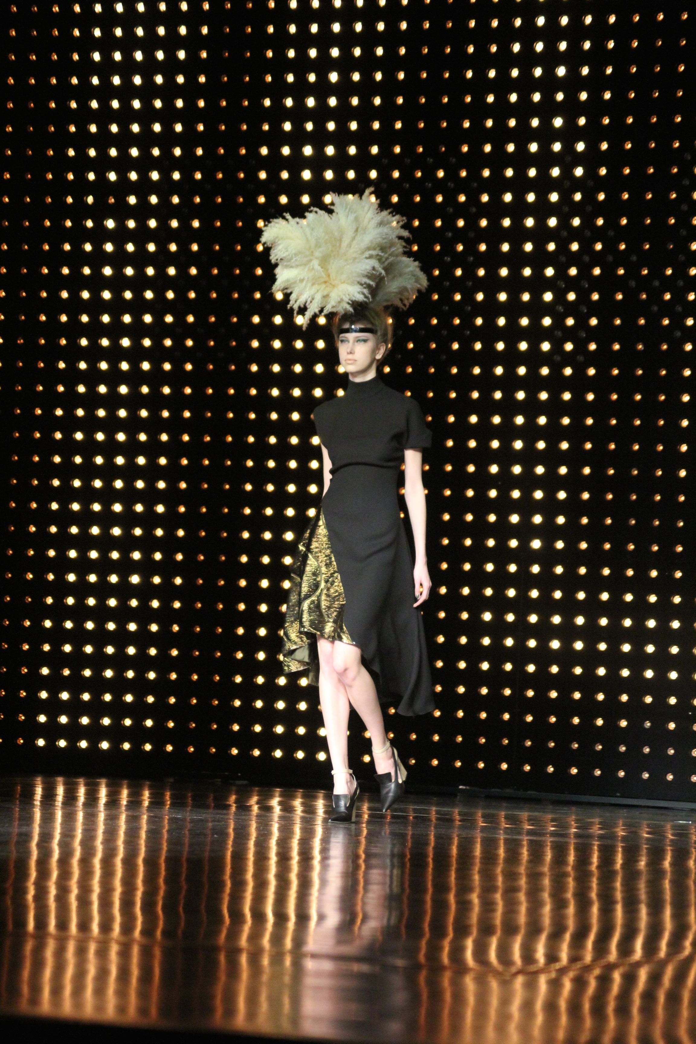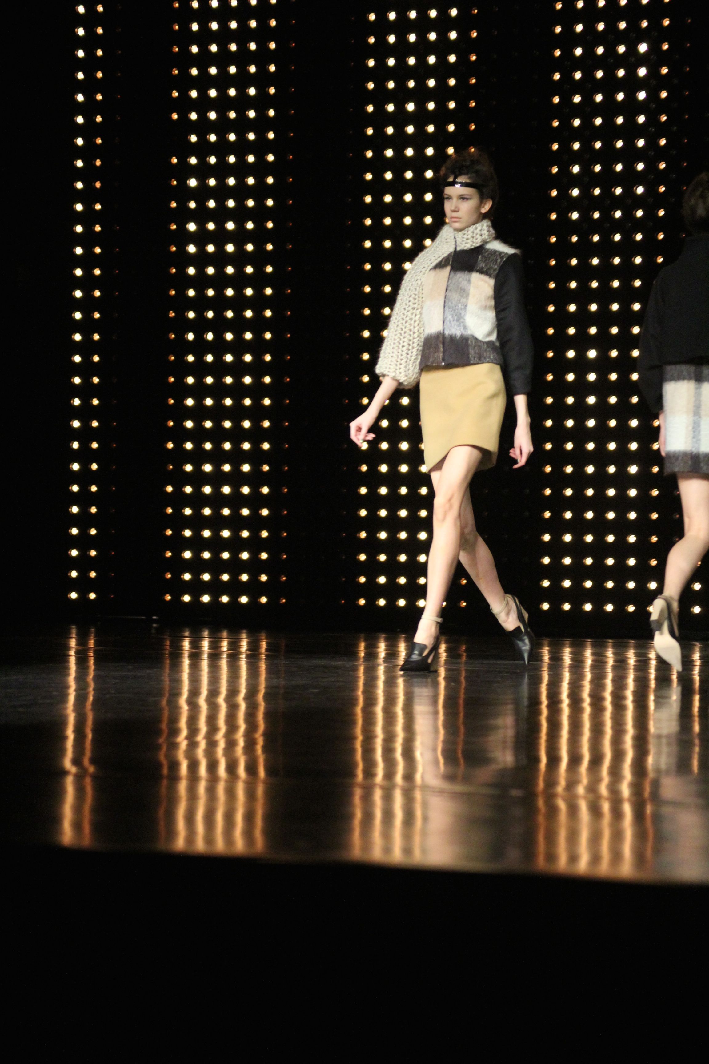 Dans des tons terre et nude mêlés aux bleus intenses et au noir, les robes, les jupes et les pantalons sont rehaussées de touches vertes, du kaki au vert d’eau en passant par le vert métallique, couleur unique du scarabée. Les matières sont fortes, la laine, le cachemire ou encore le tartan jouent et se superposent avec la transparence de la mousseline ou du voile. Les tenues sont parfois accessoirisées par des plumes rappelant la finesse des oiseaux et faisant écho au magnifique cabaret qui servait de cadre à ce défilé.