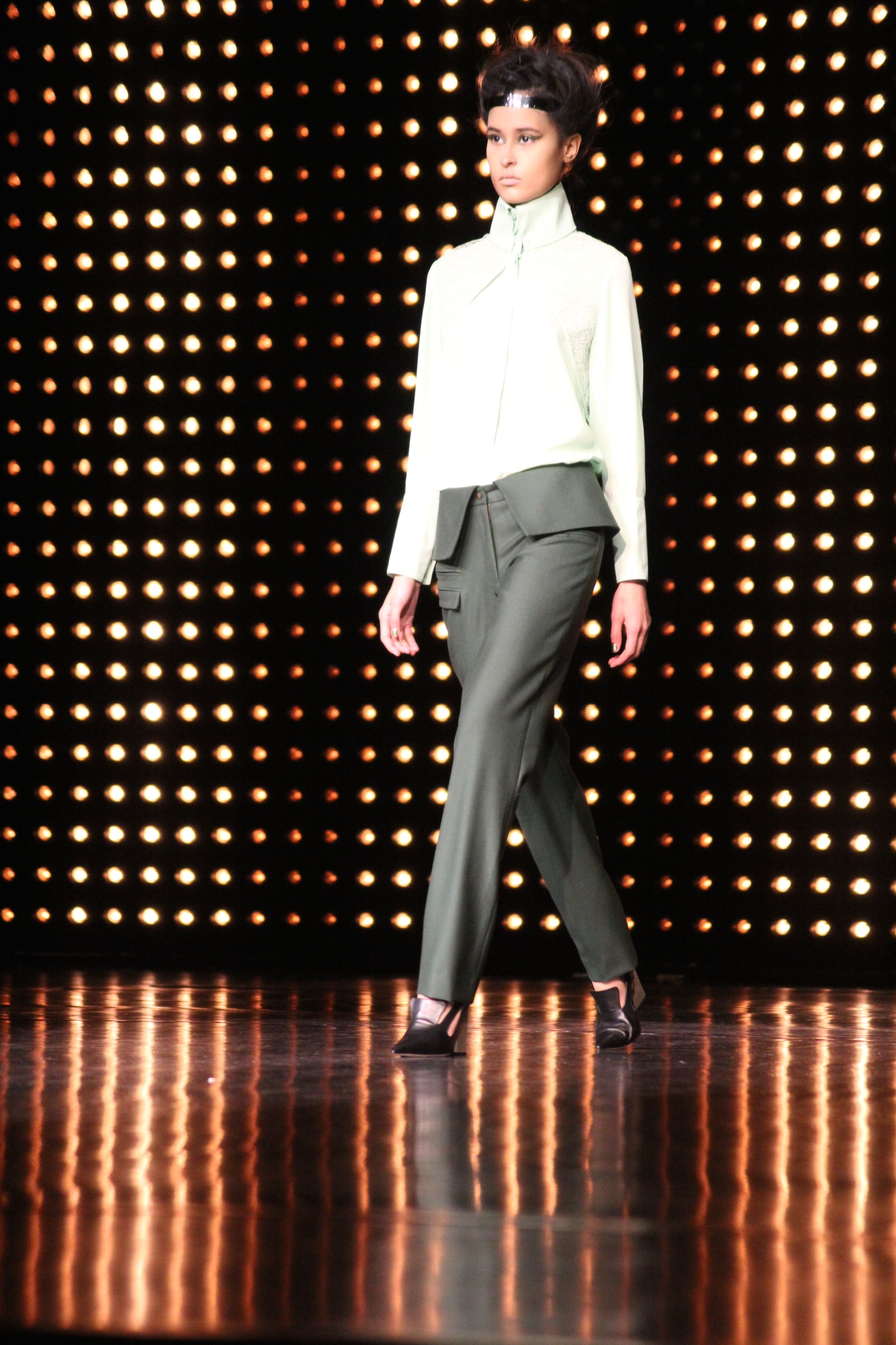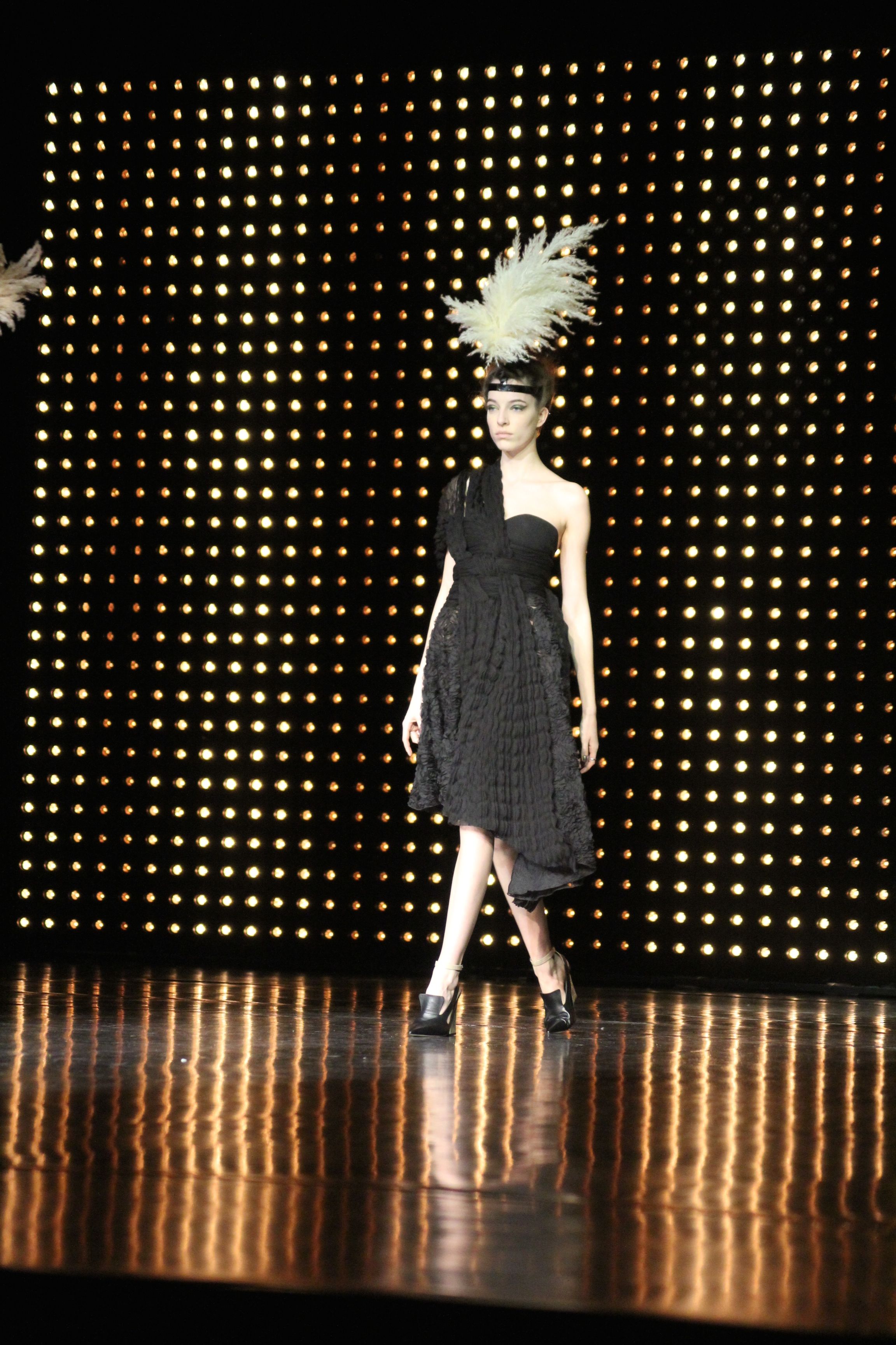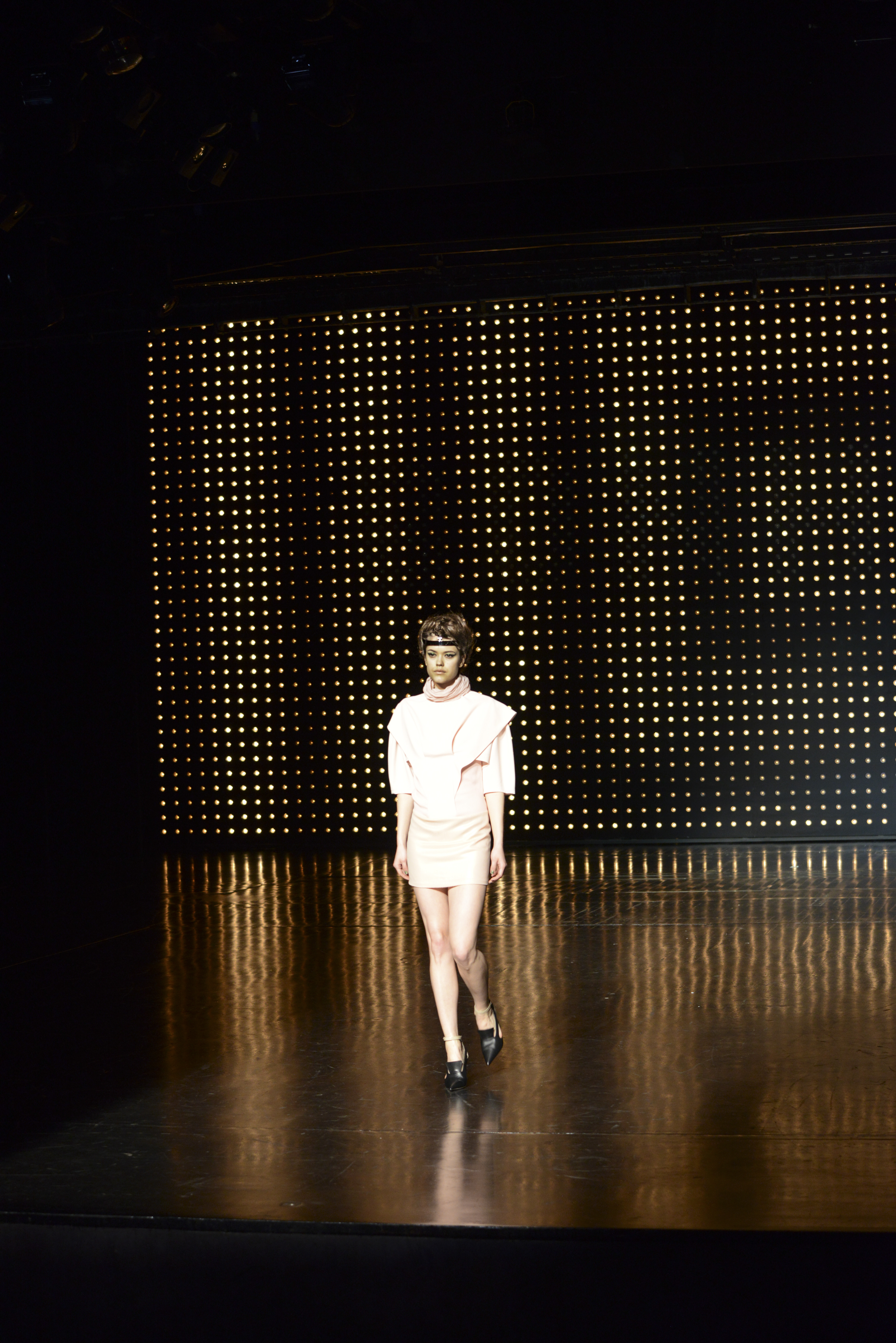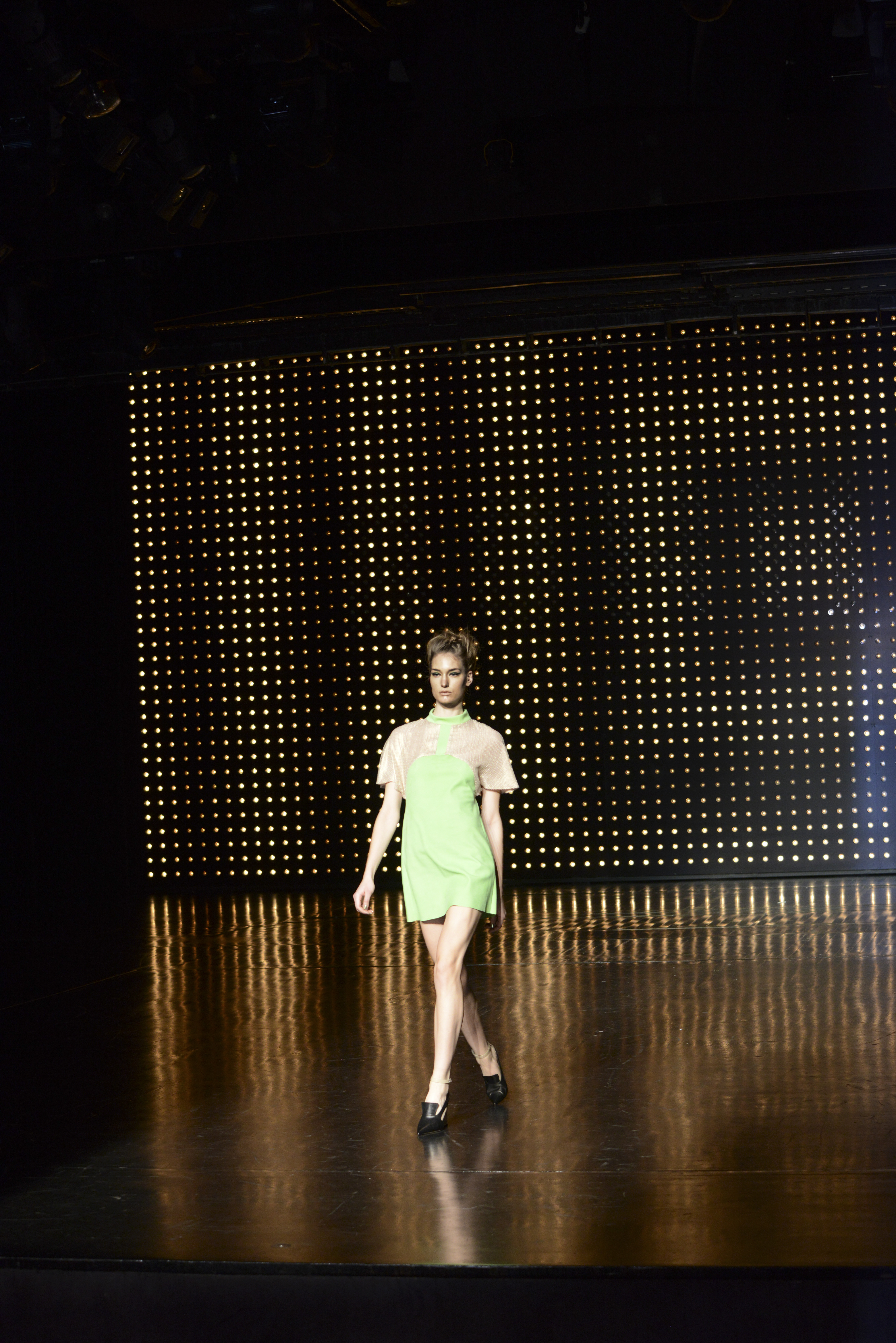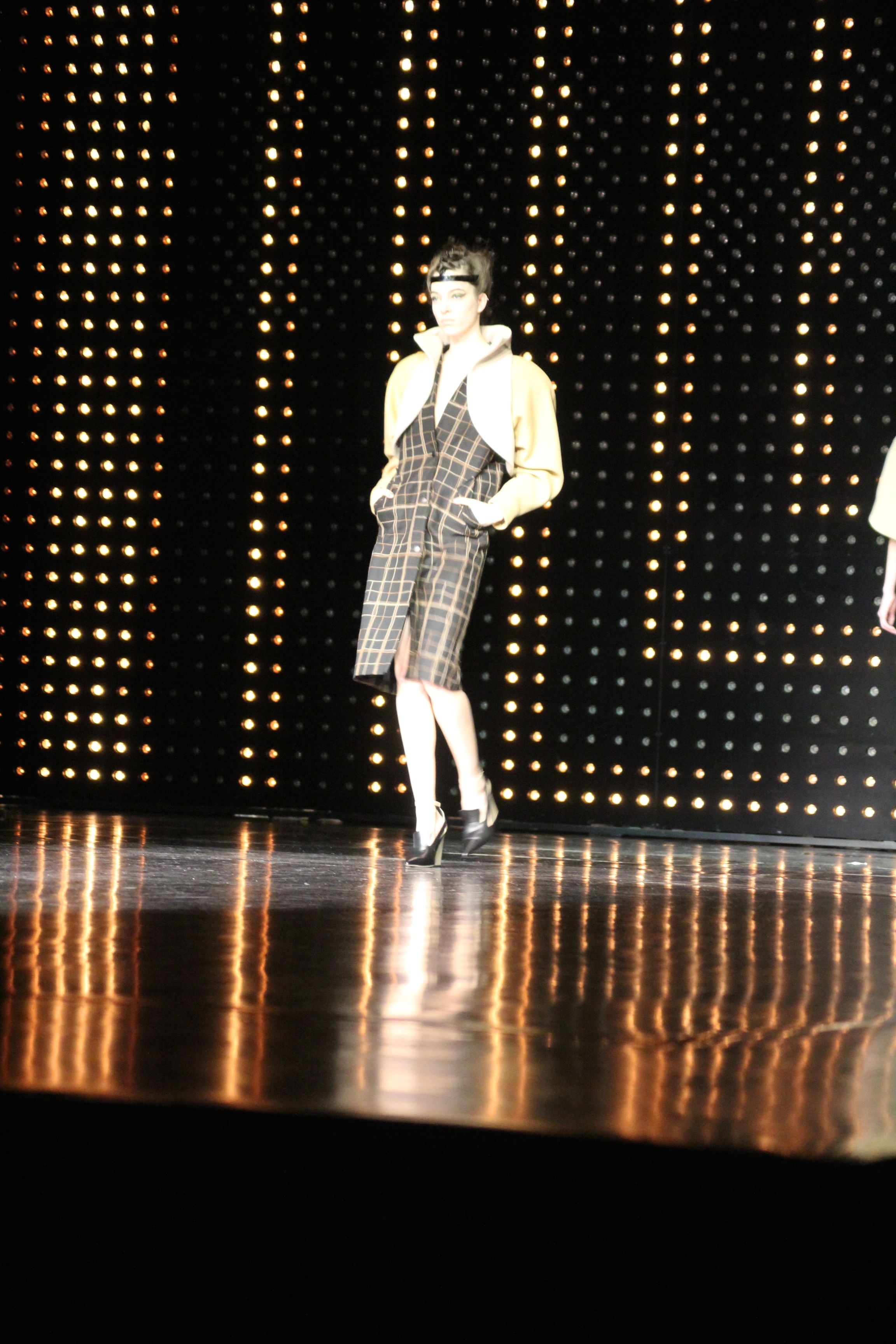 Dans des tons terre et nude mêlés aux bleus intenses et au noir, les robes, les jupes et les pantalons sont rehaussées de touches vertes, du kaki au vert d’eau en passant par le vert métallique, couleur unique du scarabée. Les matières sont fortes, la laine, le cachemire ou encore le tartan jouent et se superposent avec la transparence de la mousseline ou du voile. Les tenues sont parfois accessoirisées par des plumes rappelant la finesse des oiseaux et faisant écho au magnifique cabaret qui servait de cadre à ce défilé.