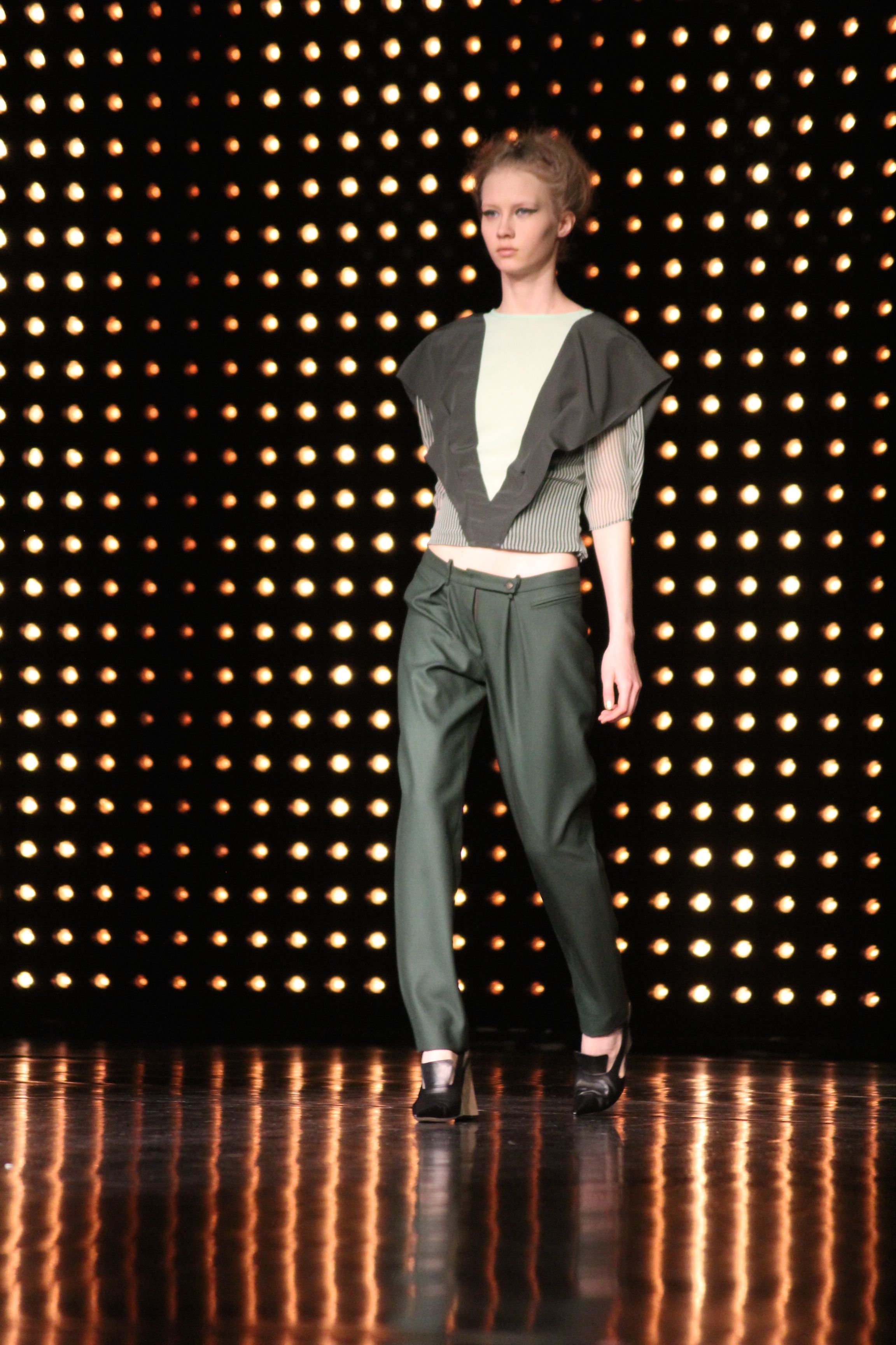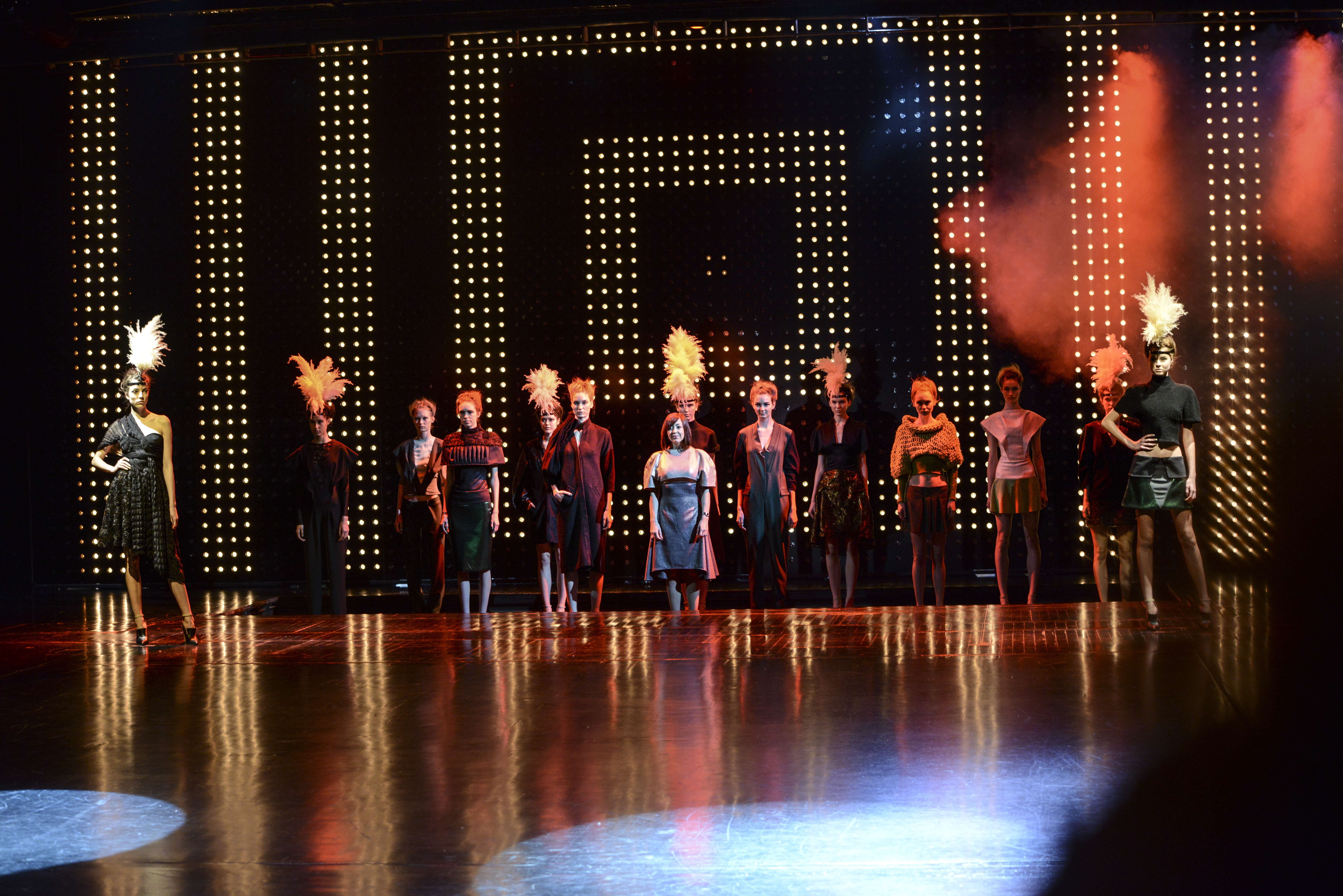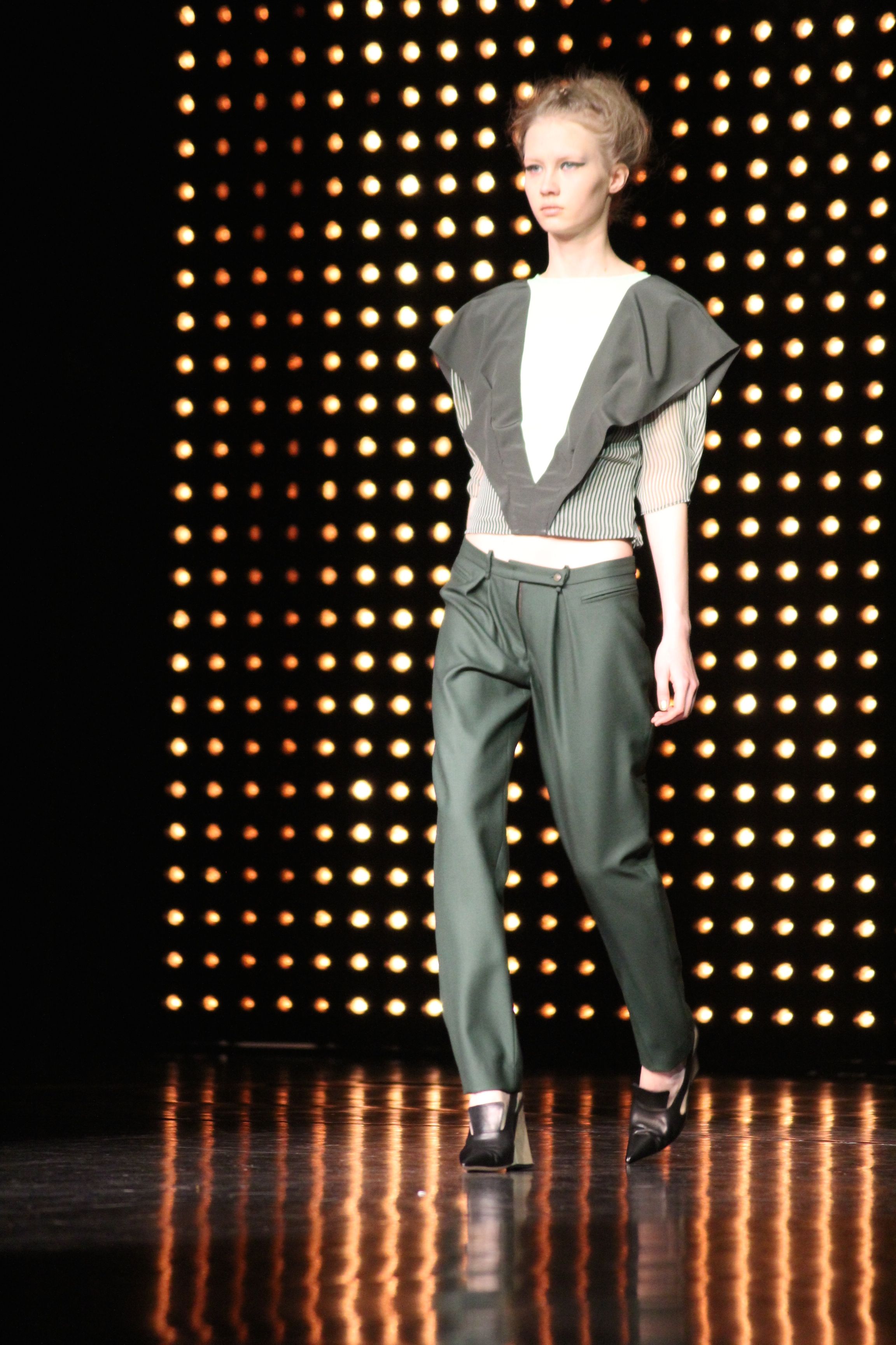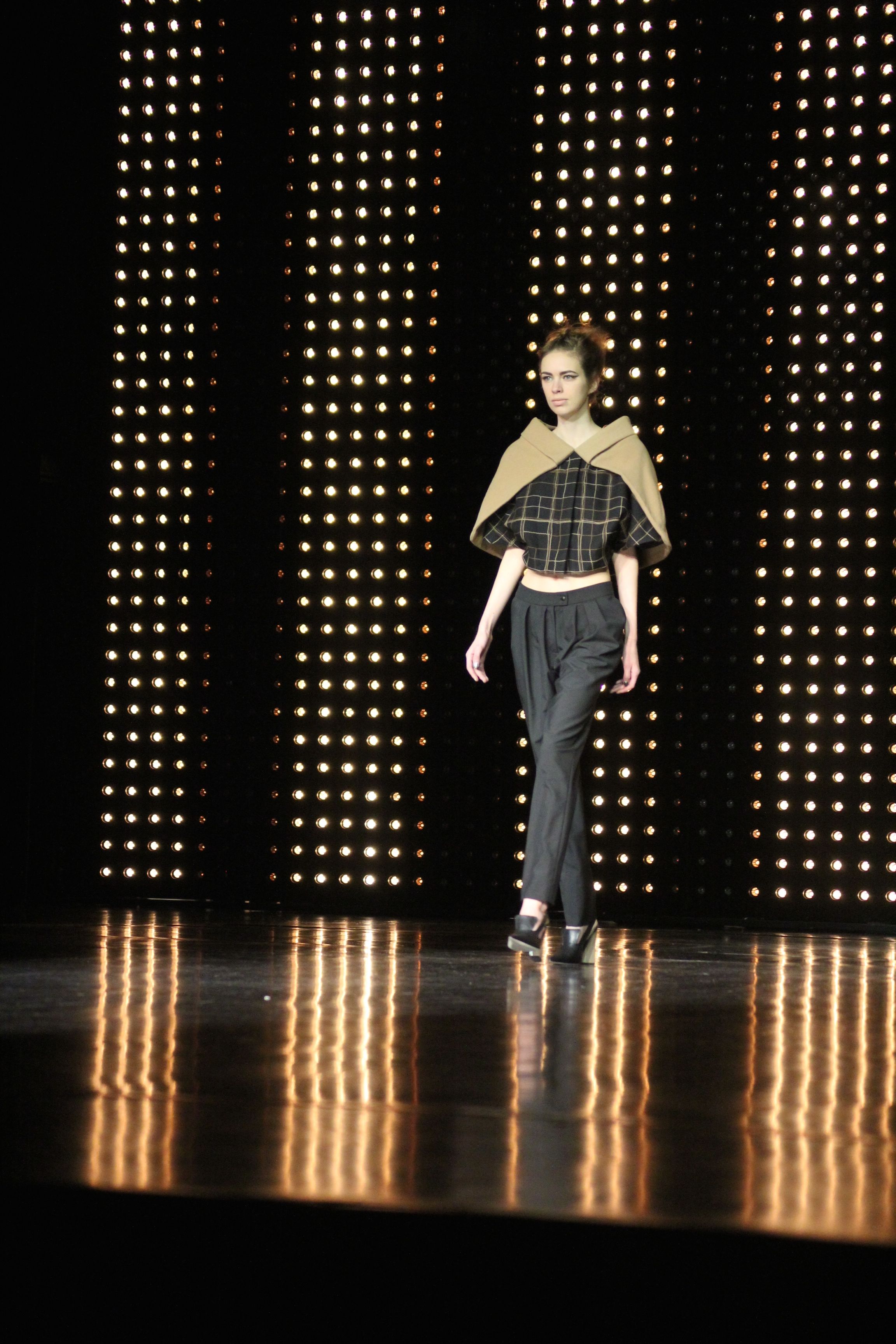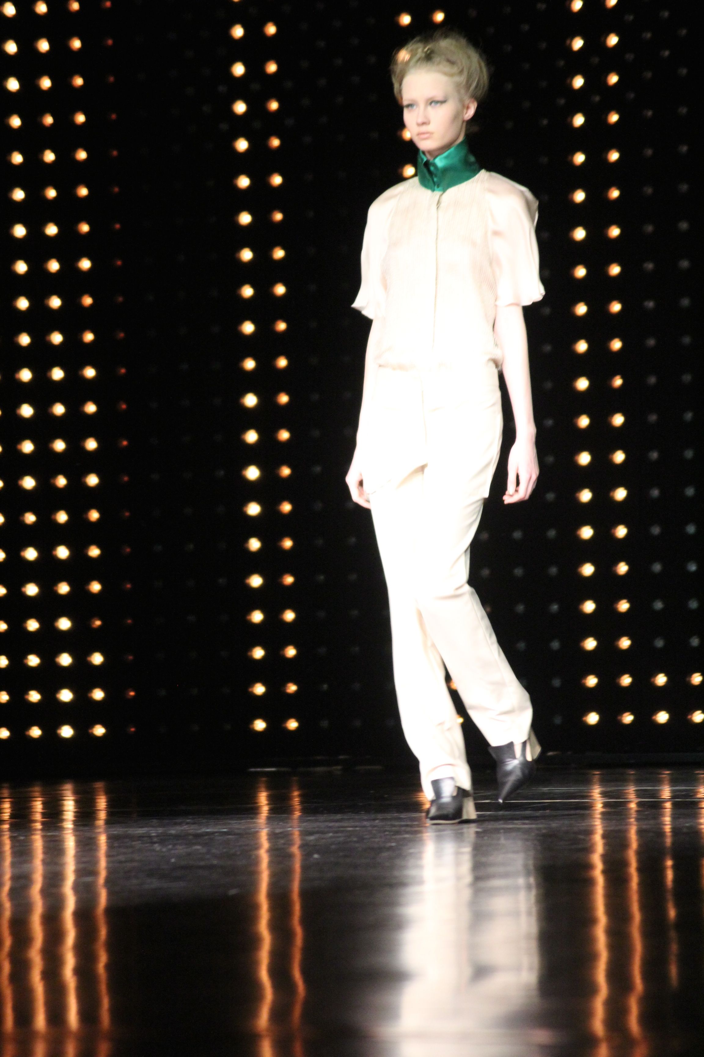 Dans des tons terre et nude mêlés aux bleus intenses et au noir, les robes, les jupes et les pantalons sont rehaussées de touches vertes, du kaki au vert d’eau en passant par le vert métallique, couleur unique du scarabée. Les matières sont fortes, la laine, le cachemire ou encore le tartan jouent et se superposent avec la transparence de la mousseline ou du voile. Les tenues sont parfois accessoirisées par des plumes rappelant la finesse des oiseaux et faisant écho au magnifique cabaret qui servait de cadre à ce défilé.