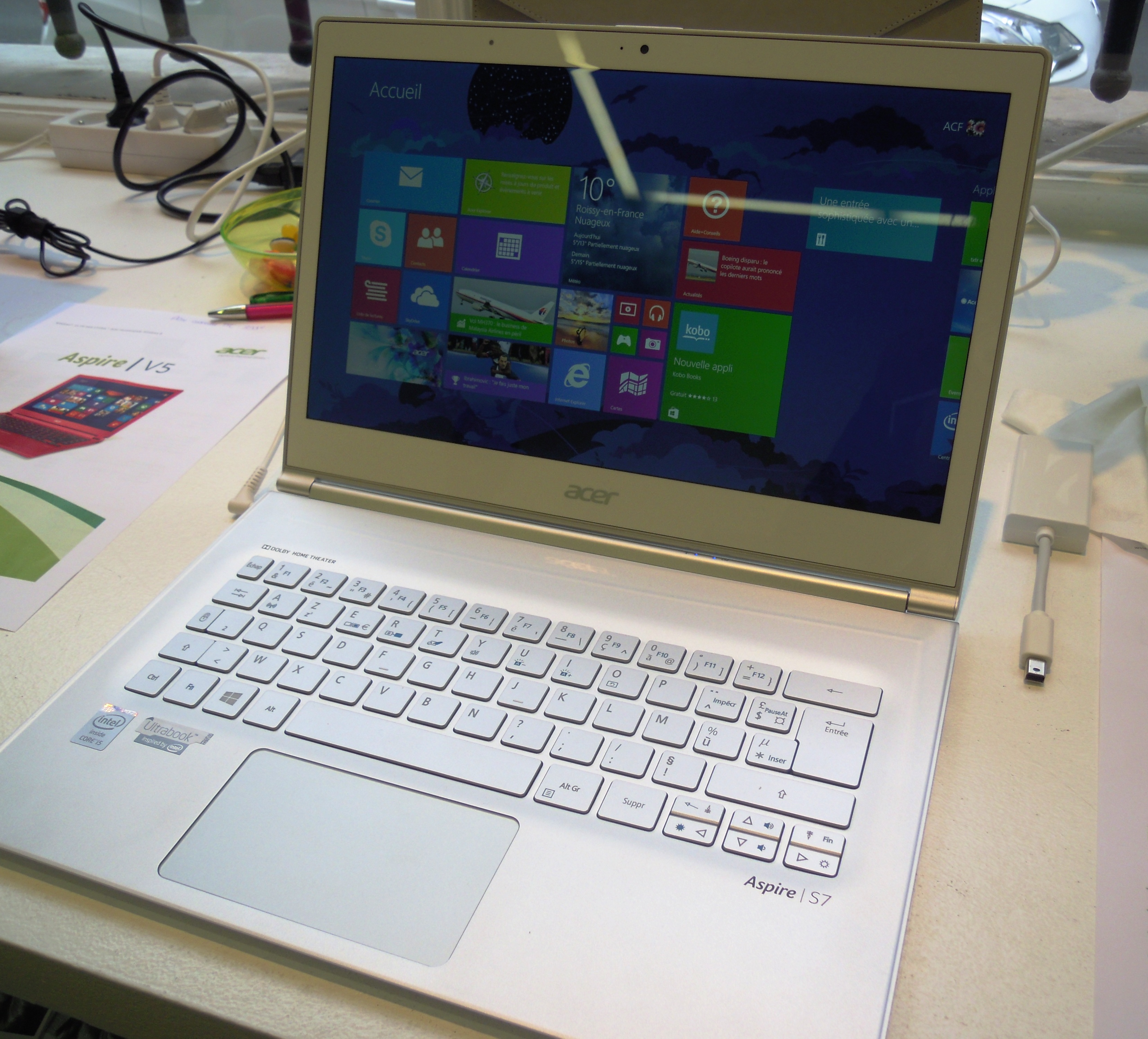 Equipés de processeurs Intel Core dernière génération, l’Aspire S7 ne doit pas vous tromper par sa taille et sa finesse ; il est un véritable ordinateur de bureau, utilisable tant au travail qu’à la maison. Grâce à des branchements amovibles, livrés avec l’ultrabook, vous pourrez connecter clés USB et prises HDMI. Un emplacement pour carte micro SD est également présent. L’expérience sera évidemment tactile, sous Windows 8.1. L’autonomie peut atteindre 7 heures pour la version 13,3 pouces. La version 11,6 pouces est livrée avec une batterie supplémentaire qui peut permettre d’atteindre 10 heures d’autonomie. Les deux modèles auront tous les deux un étui en cuir gris et une souris Bluetooth, compris dans le prix de l’ultrabook. Ce modèle ultrabook Aspire S7 se pose donc comme une ordinateur « compagnon », nomade, pratique et design !