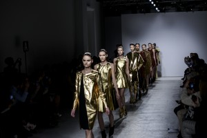 Les matières sont utilisées ici comme un appel aux éléments, le cuir or ou encore le cuir miroir. L’ensemble est attirant, la laine ou le lurex nous étonnent.