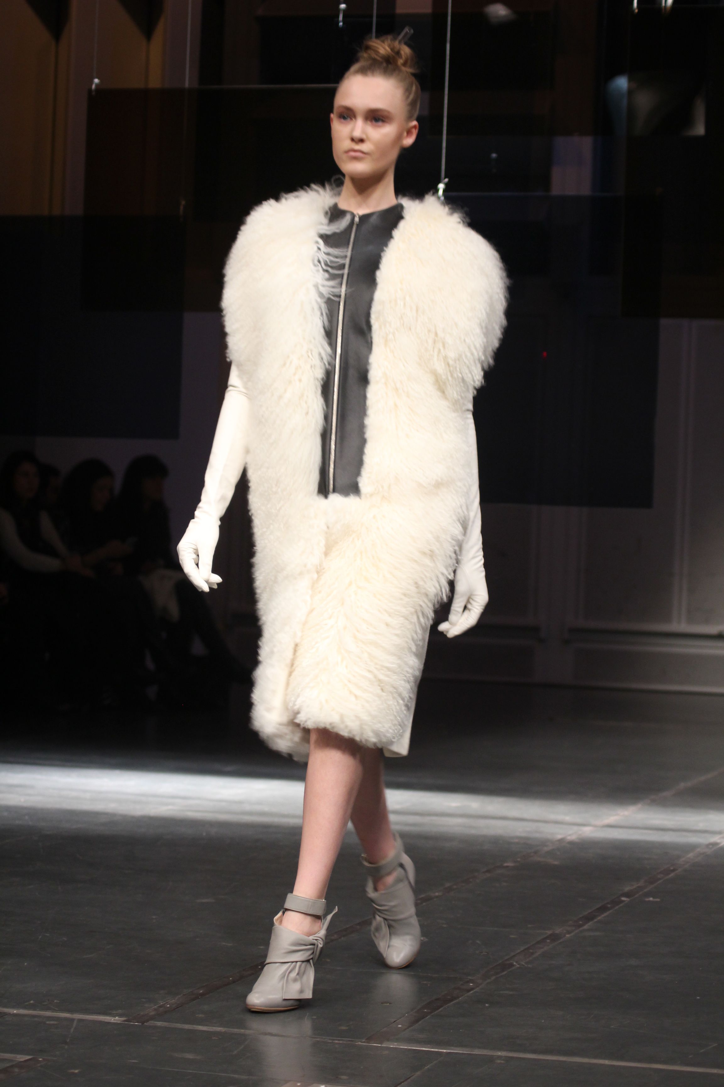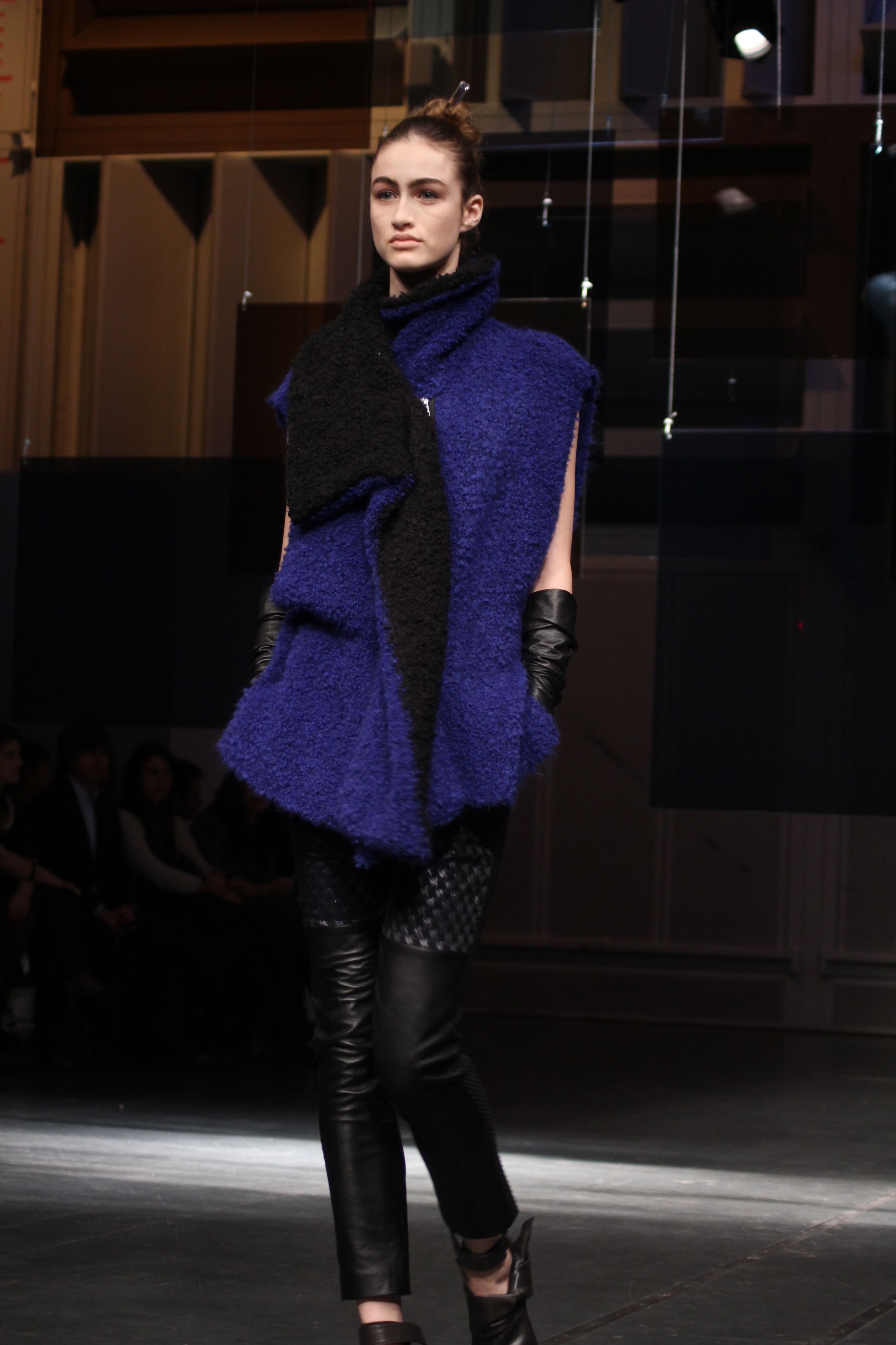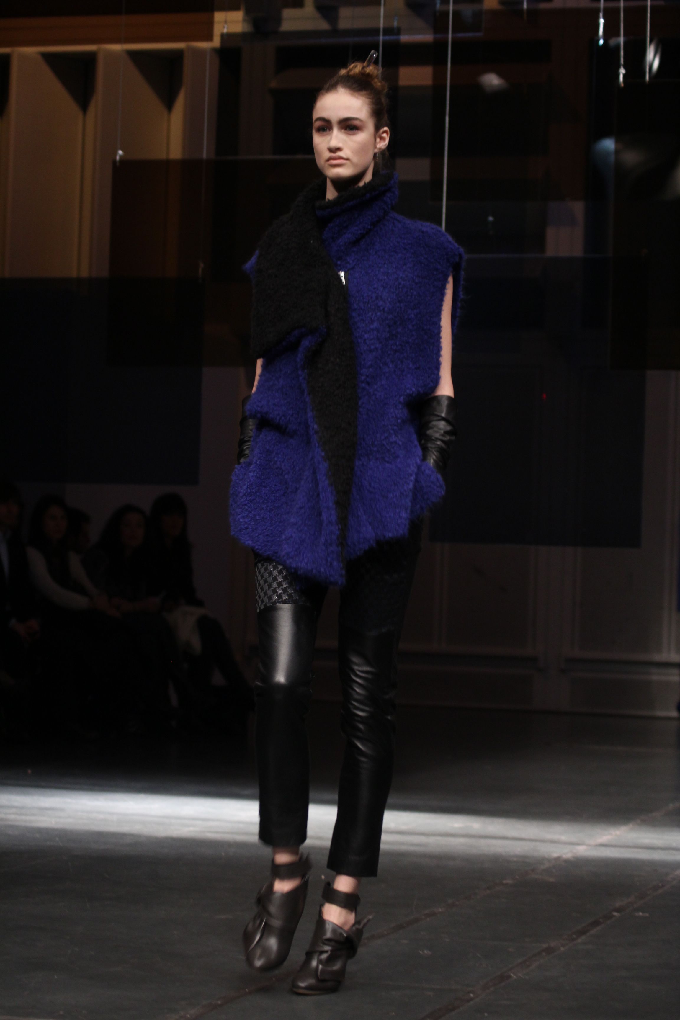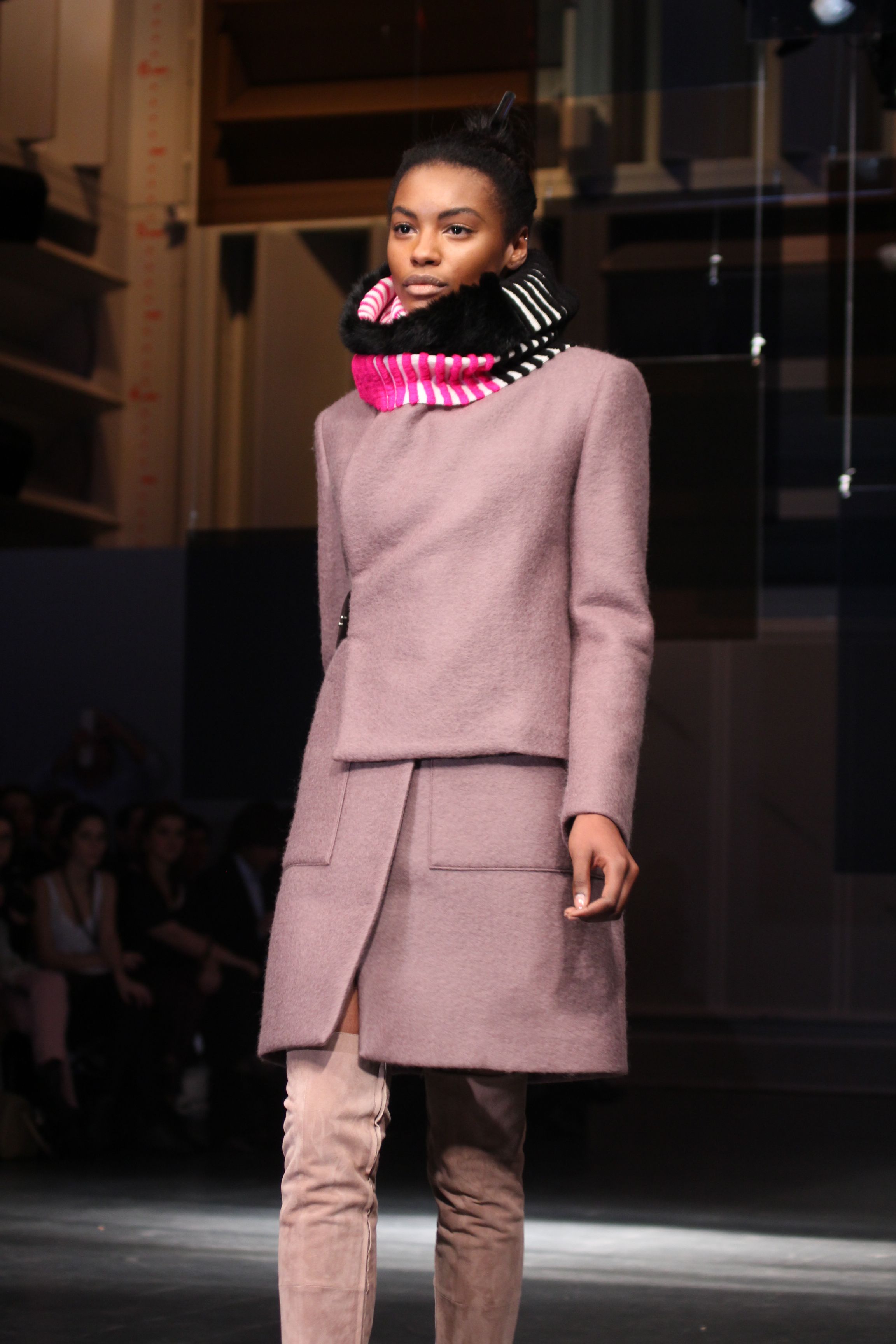 La matière avant tout confortable et facile à porter se déclinera autour de laines plissées, de tweeds double face, de cuir de fourrures, de tricots mais aussi de plissages imprimés et de tissus empruntés à la garde robe masculine qui permettront de parfaire l’effet trompe l’oeil.