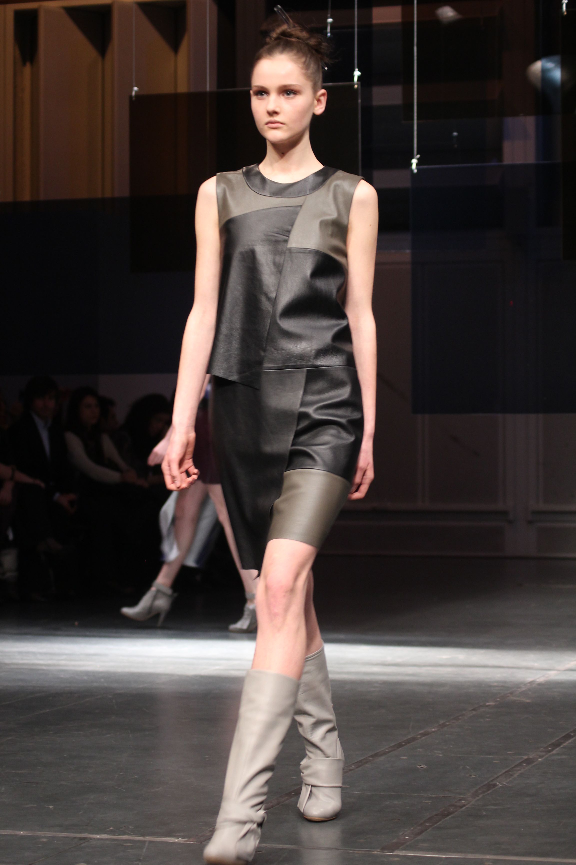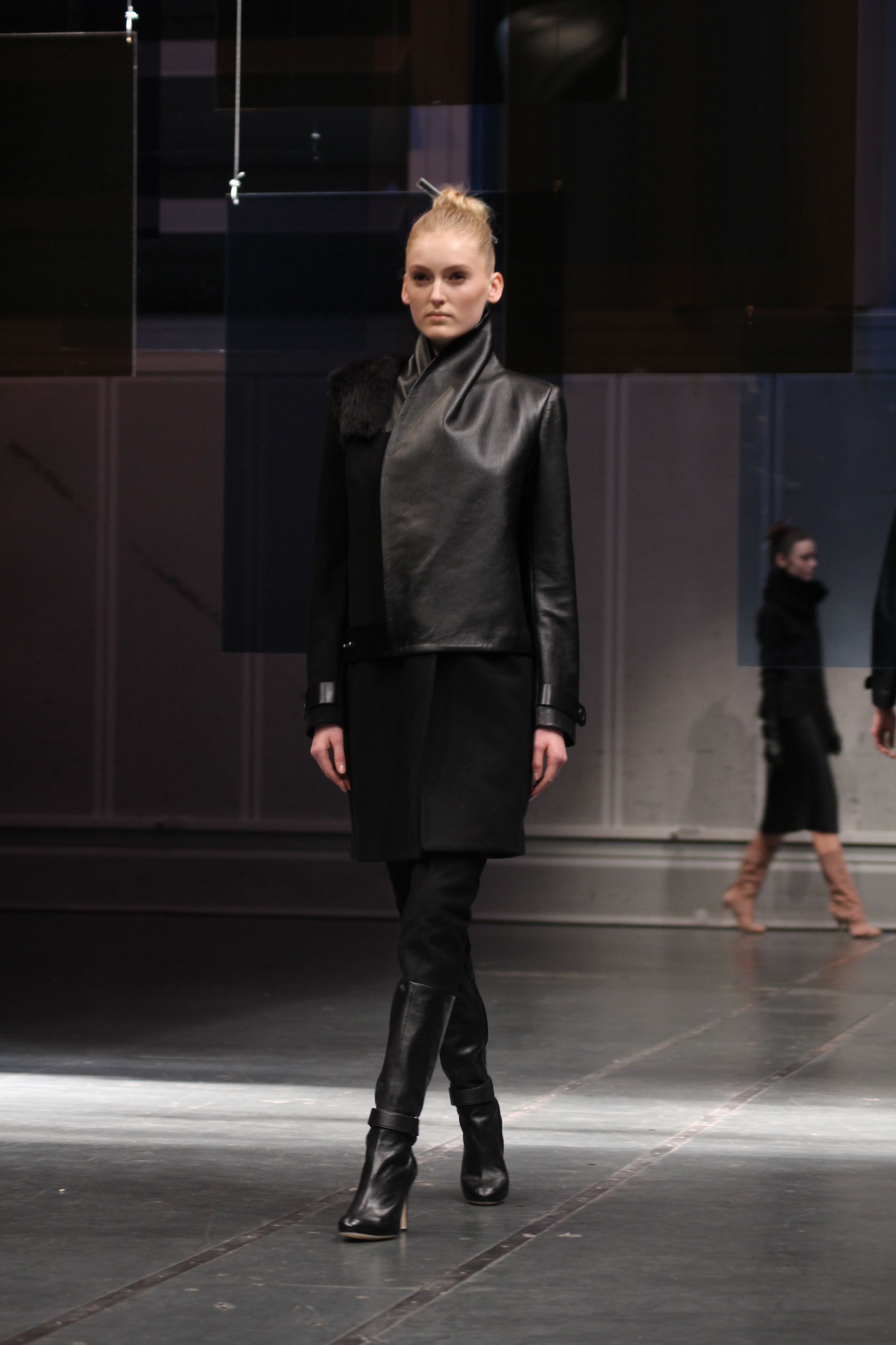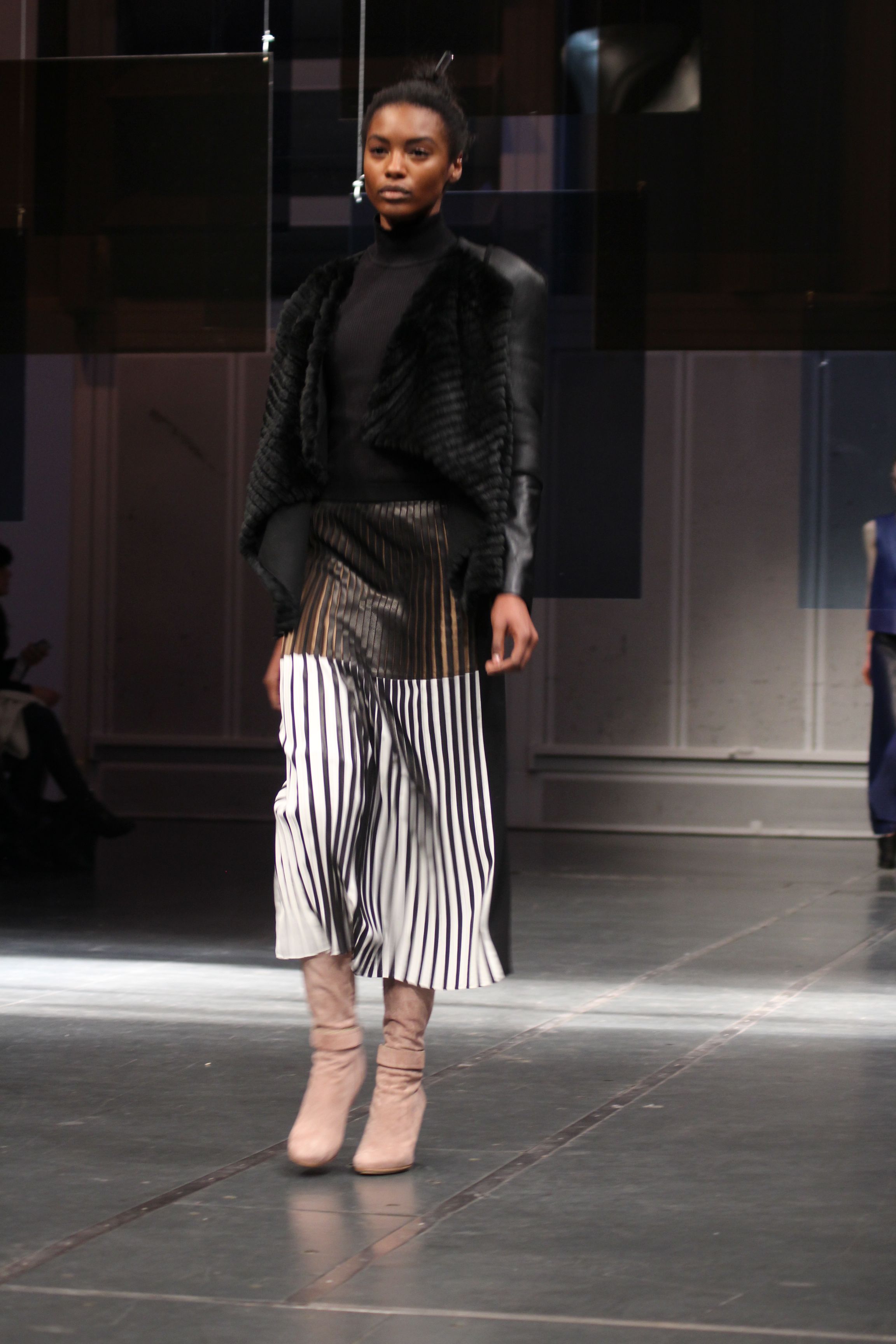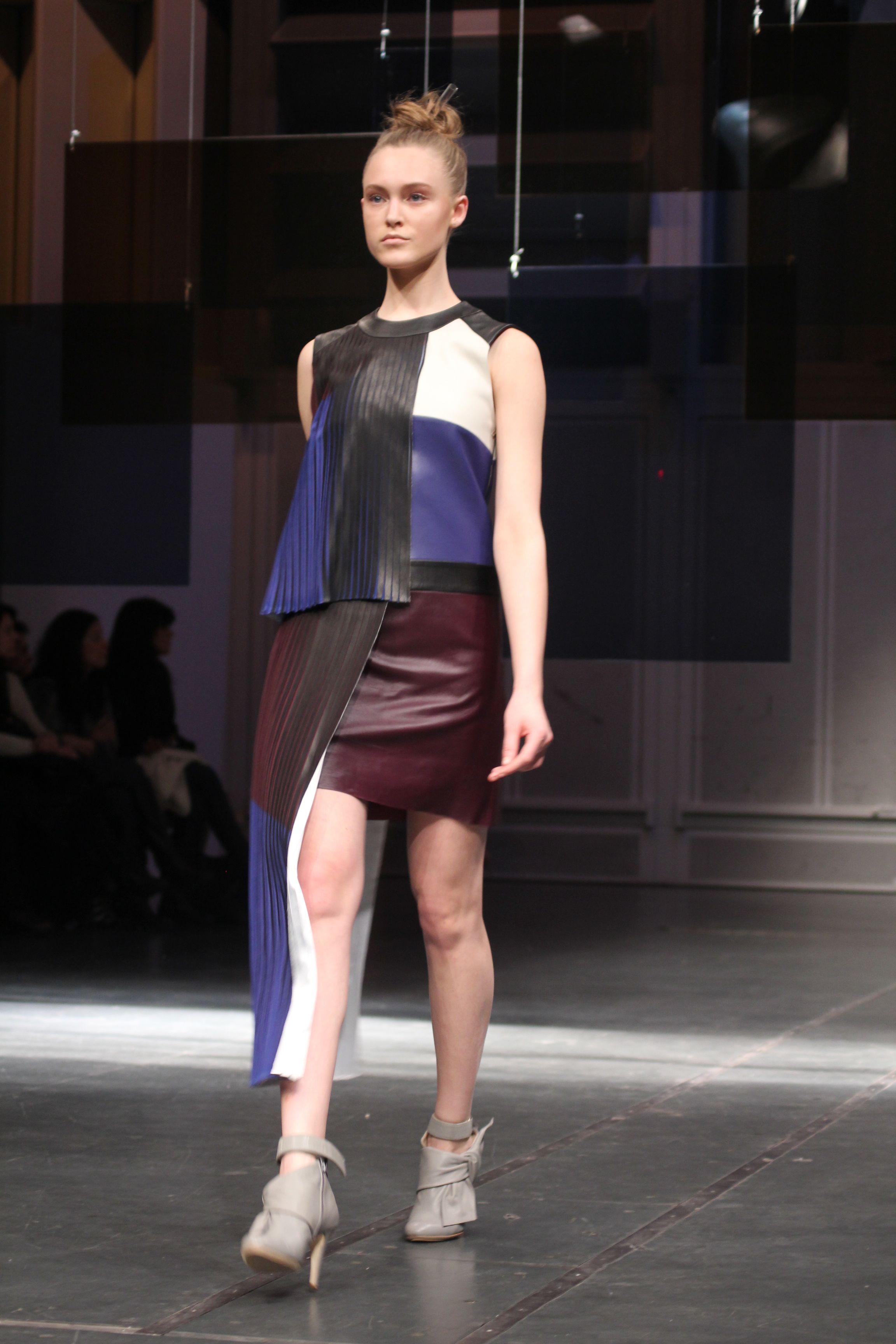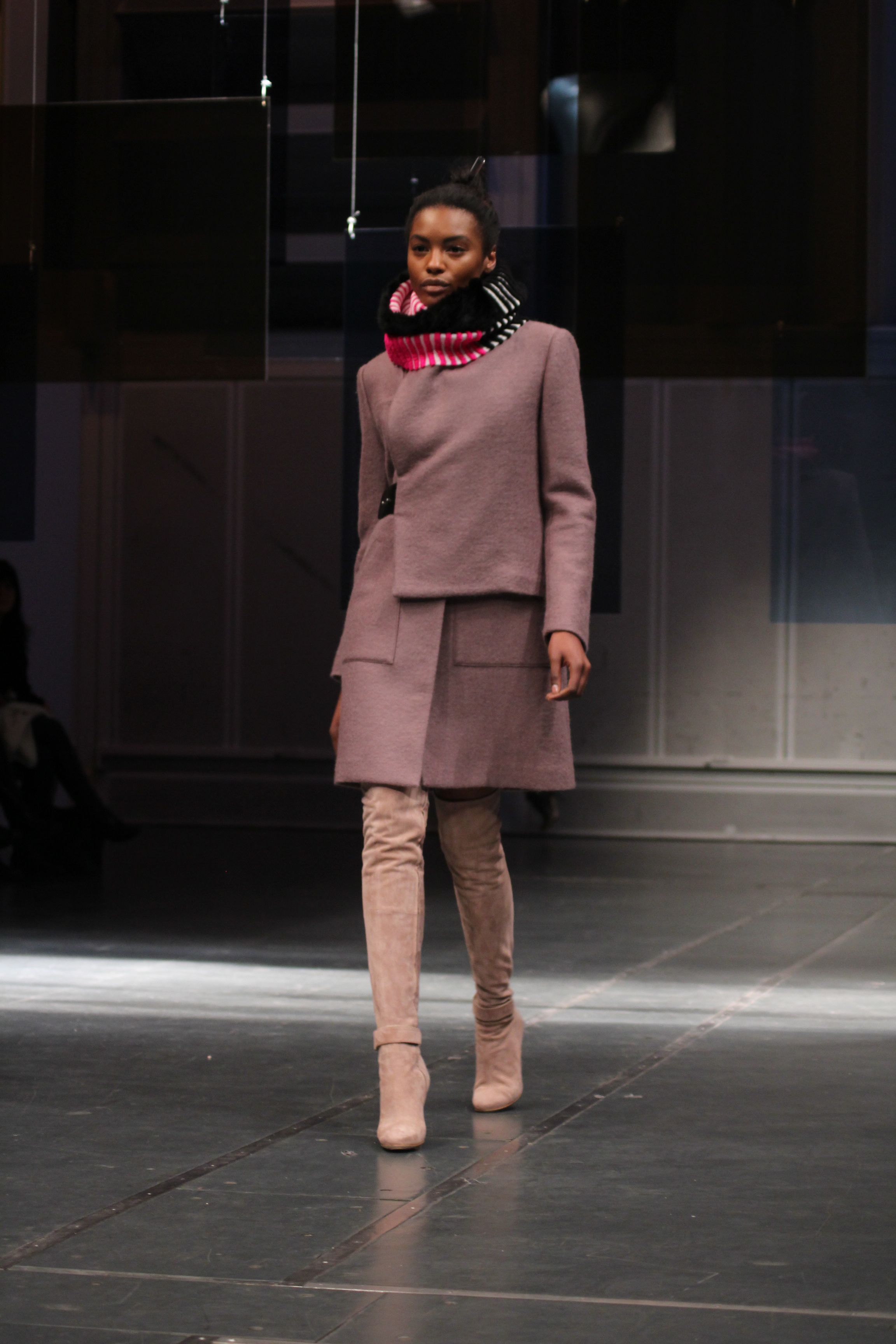 La matière avant tout confortable et facile à porter se déclinera autour de laines plissées, de tweeds double face, de cuir de fourrures, de tricots mais aussi de plissages imprimés et de tissus empruntés à la garde robe masculine qui permettront de parfaire l’effet trompe l’oeil.