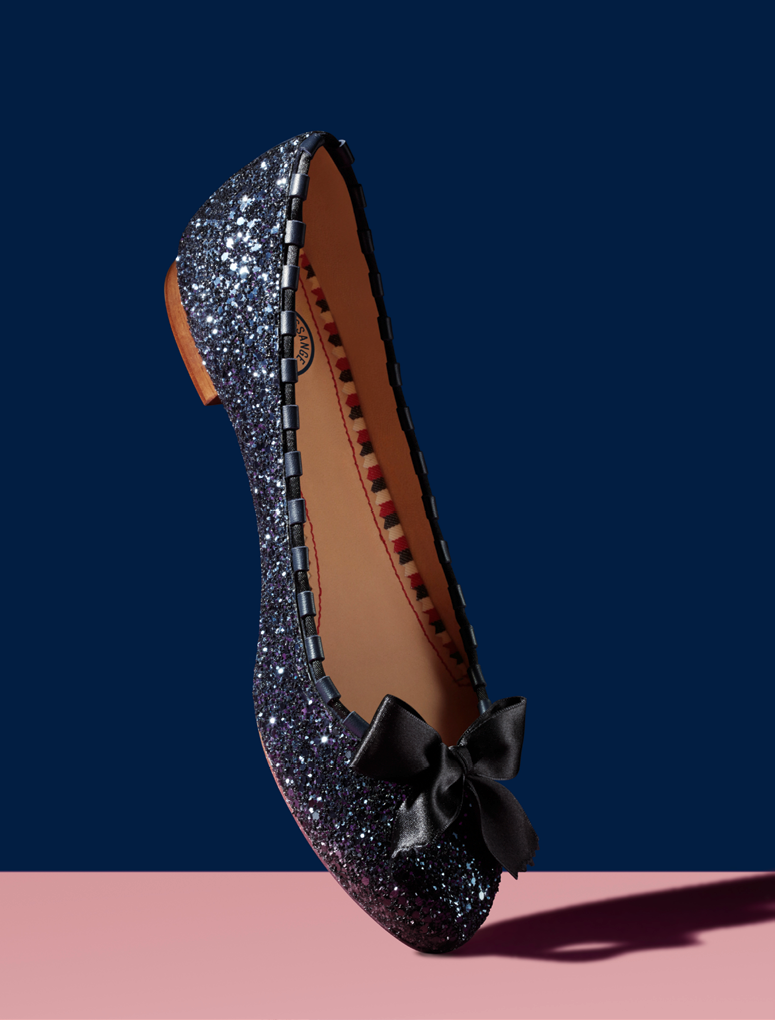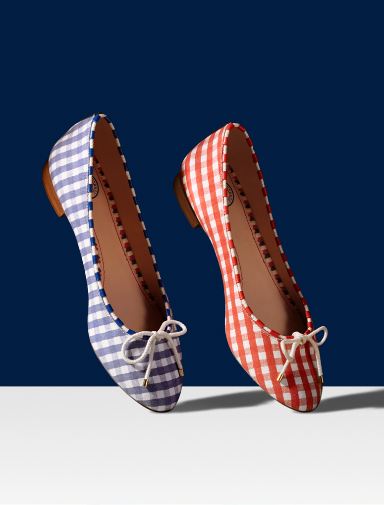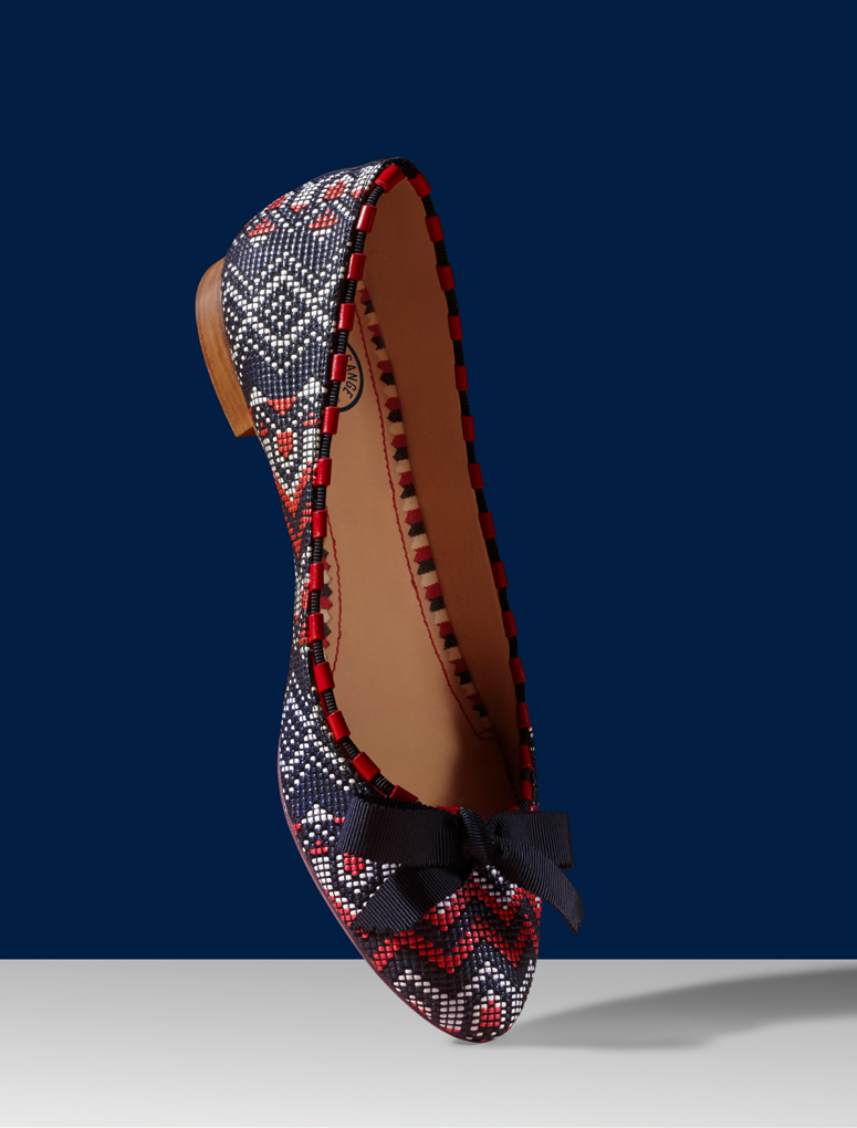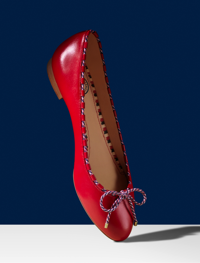 Le crédo: faire du luxe un monde joyeux ! Aujourd’hui, la célèbre « mannequin qui parle » est de retour à la création au sein de sa marque ; le résultat, une collection croisière de ballerines d’inspiration marine, dans les tons bleus, blancs et rouges.