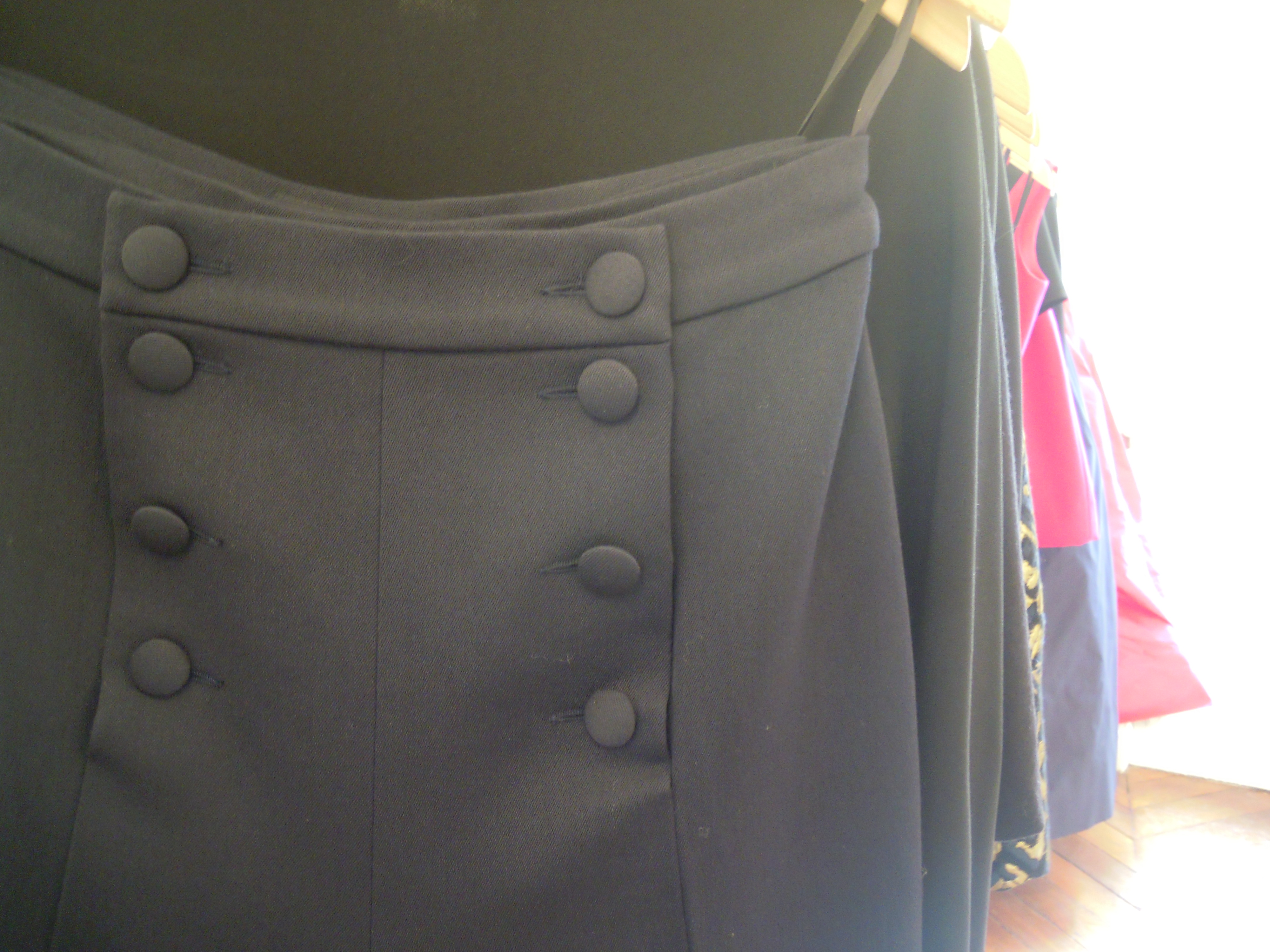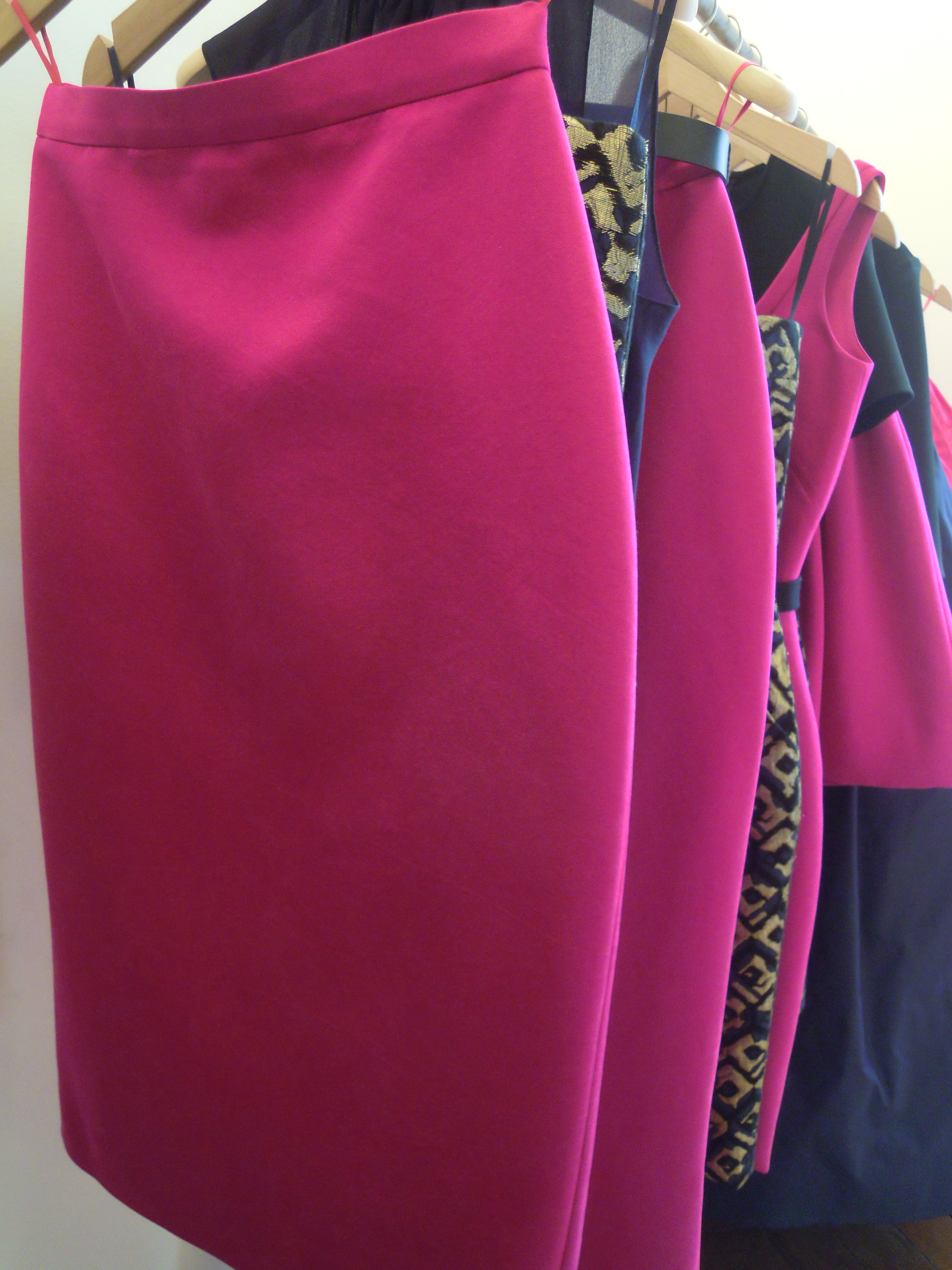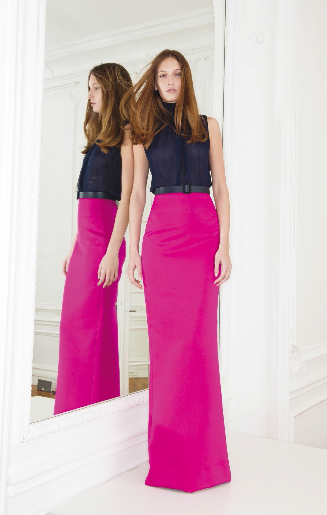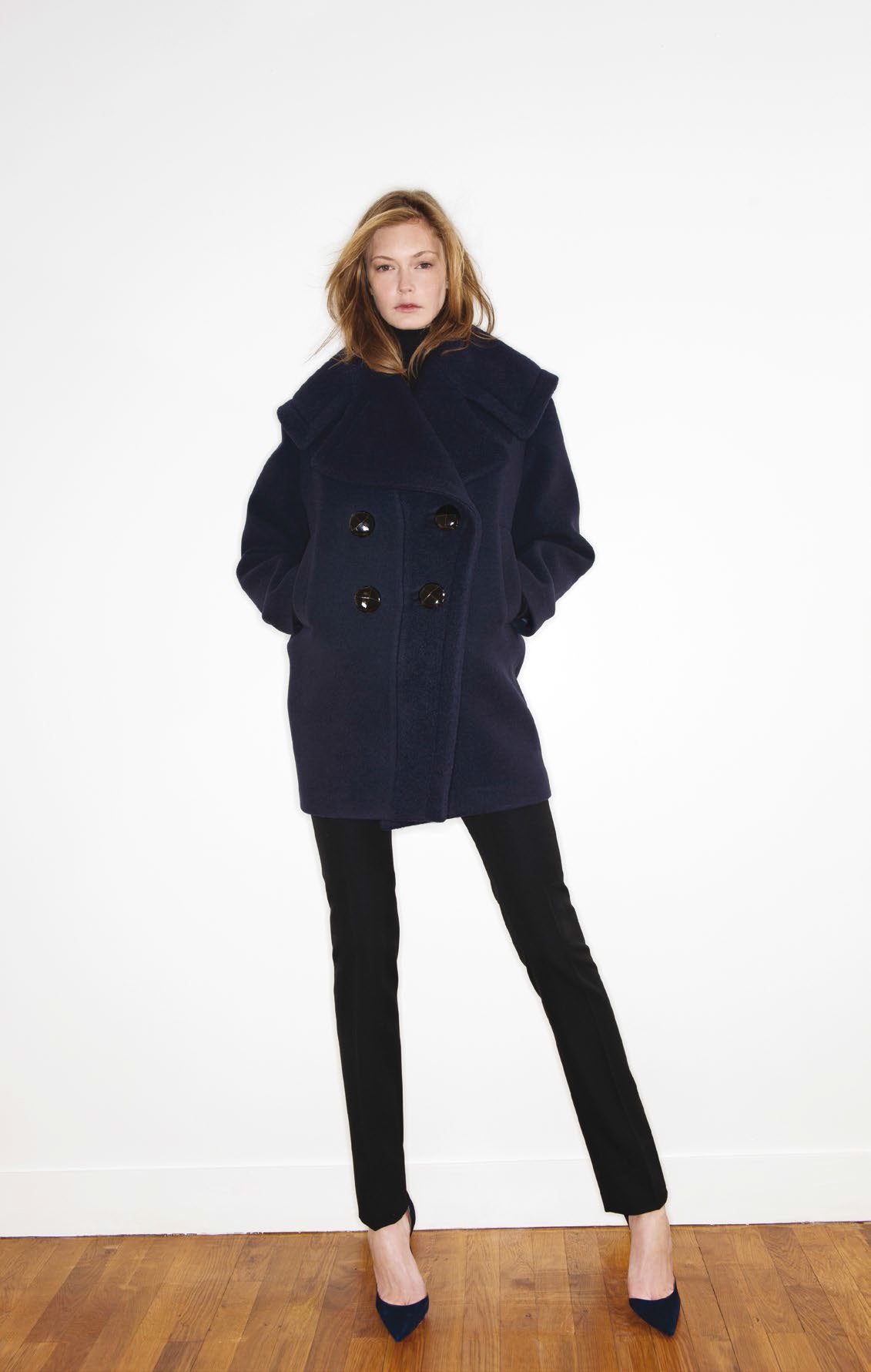 Le caban, tout d’abord, basique intemporel, a été agrandi avec son col oversize et ses boutons très années 60. Le pantalon à pont, très élégant, prend une teinte bleue marine pour se démarquer du noir. Jupes longues et robes aux coupes très simples se parent d’un rose fuchsia éclatant qui flatte tous les teints.