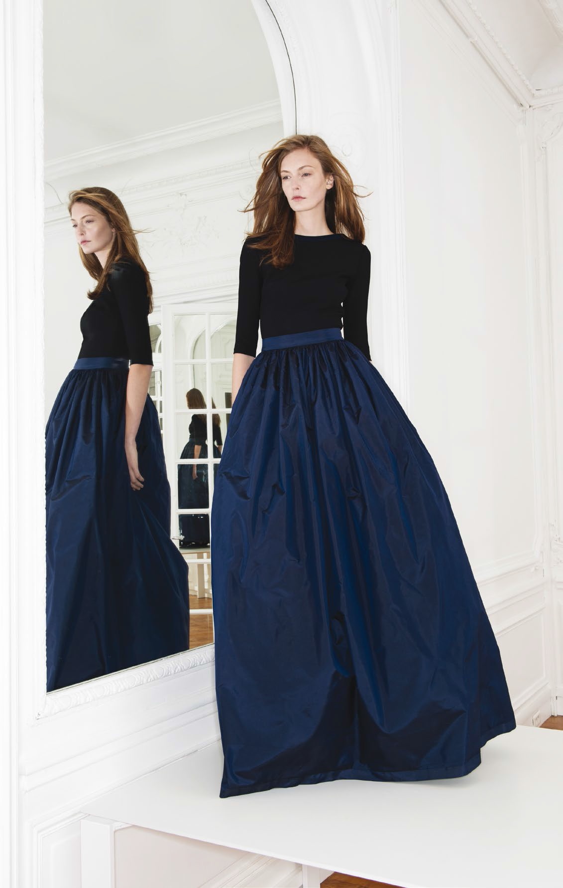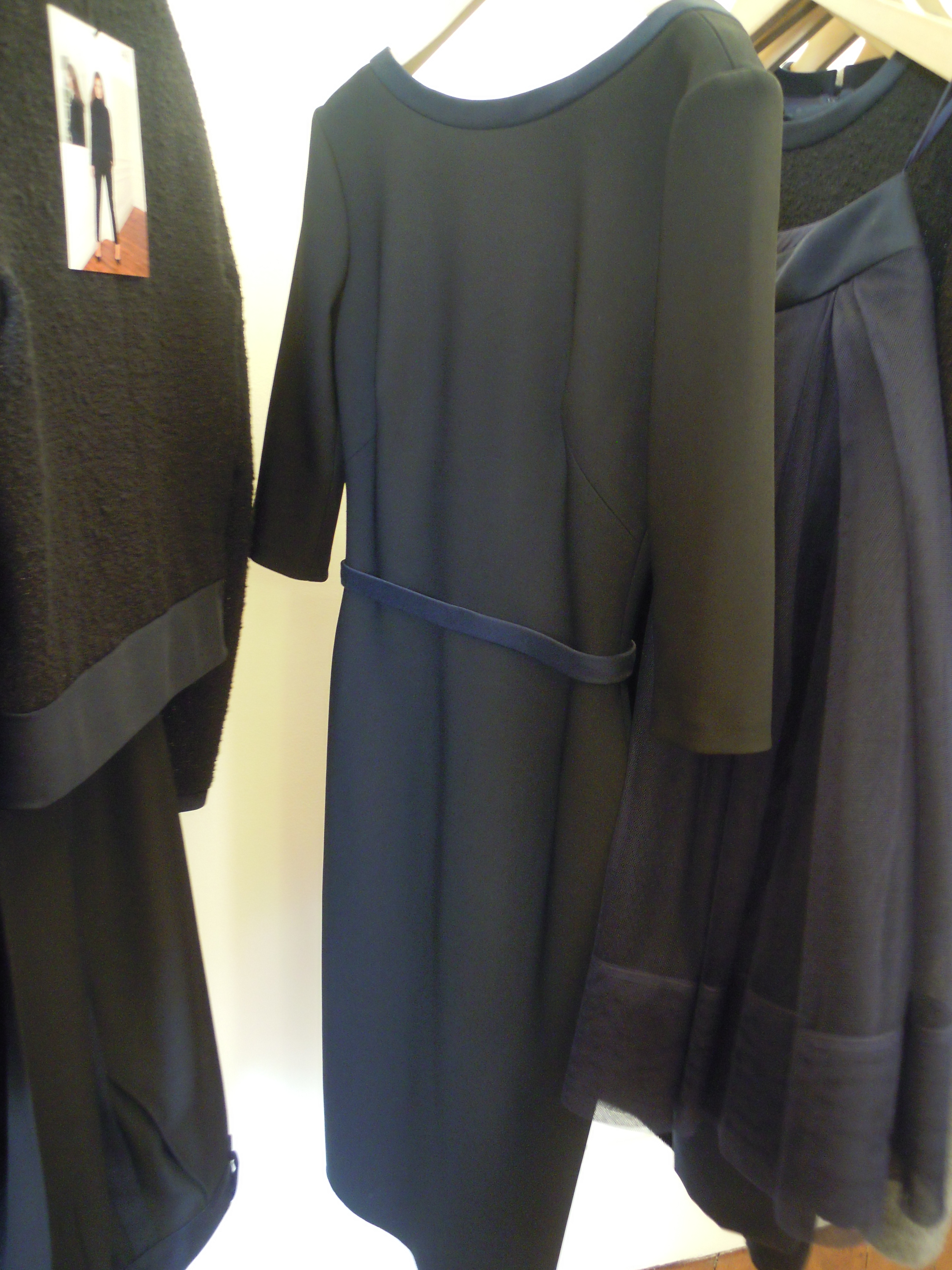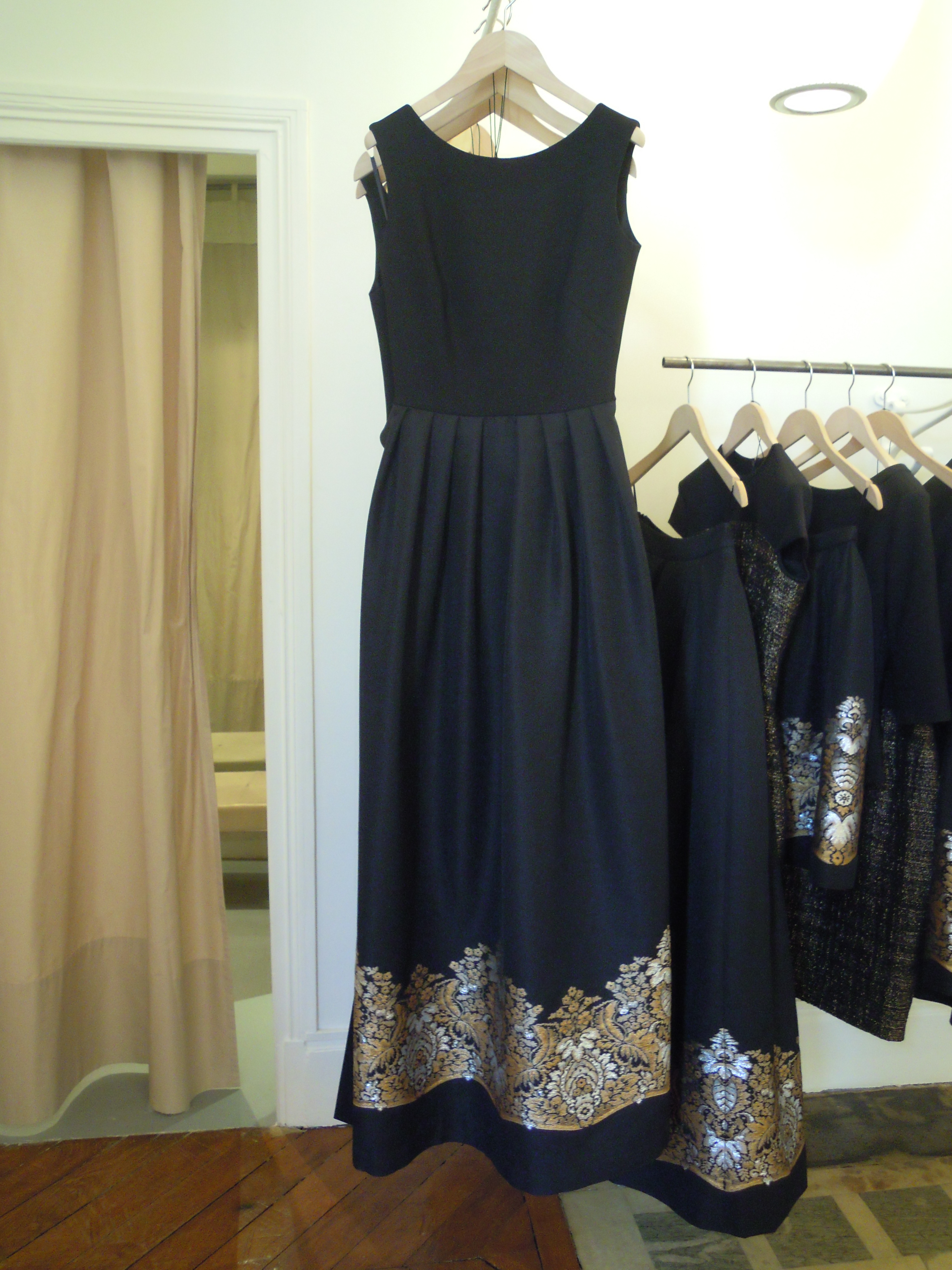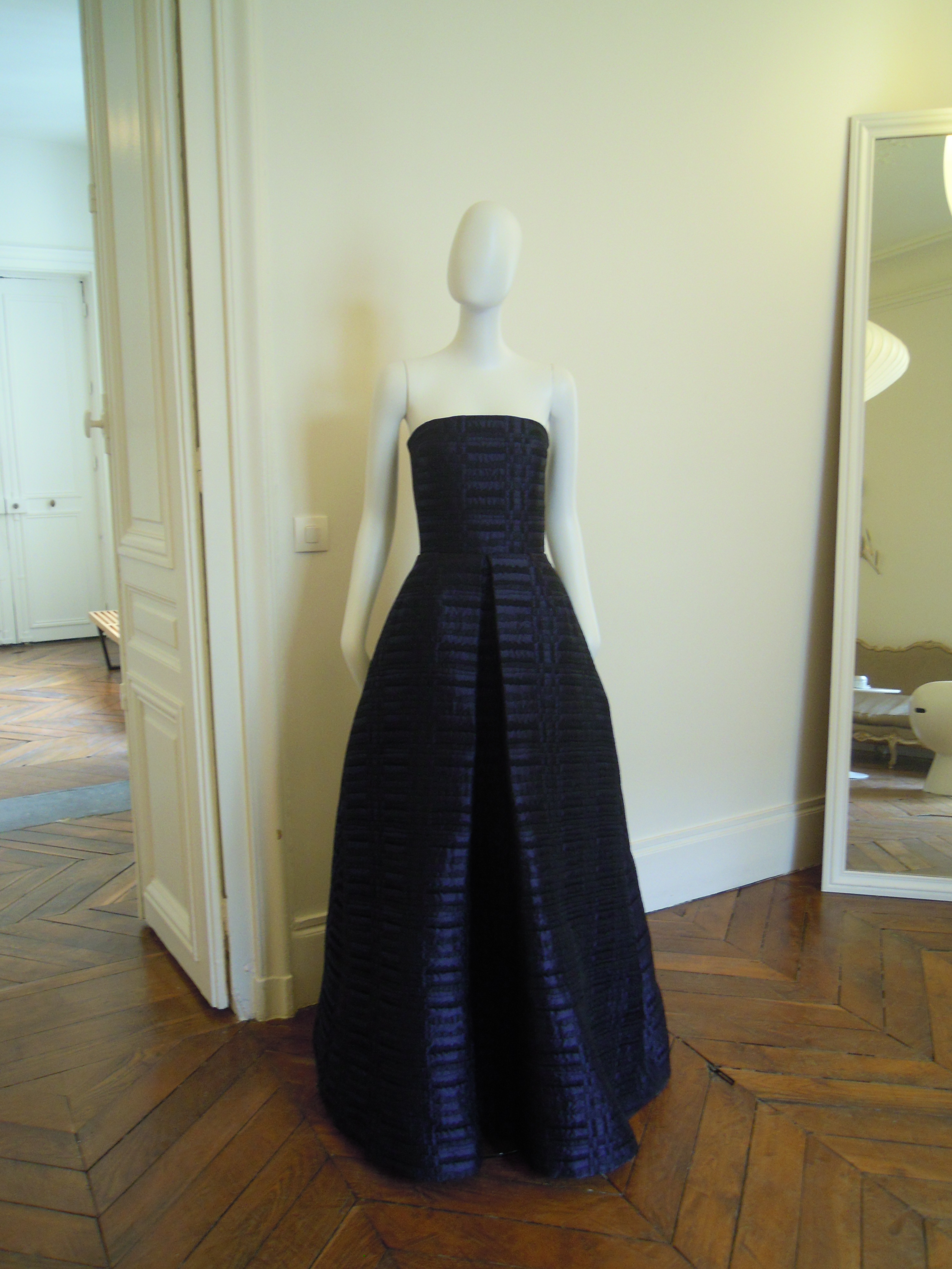 Côté soirée, Martin Grant a voulu mettre en valeur le tweed de deux manières différentes ; l’un est bleu marine et doré, l’autre est noir, mais se compose de discrets fils de lurex qui lui donnent une brillance élégante. Les robes du soir son structurées avec des lignes qui mettent en valeur les silhouettes. Le bleu marine et le noir sont associés, cette fois-ci, pour s’adoucir.