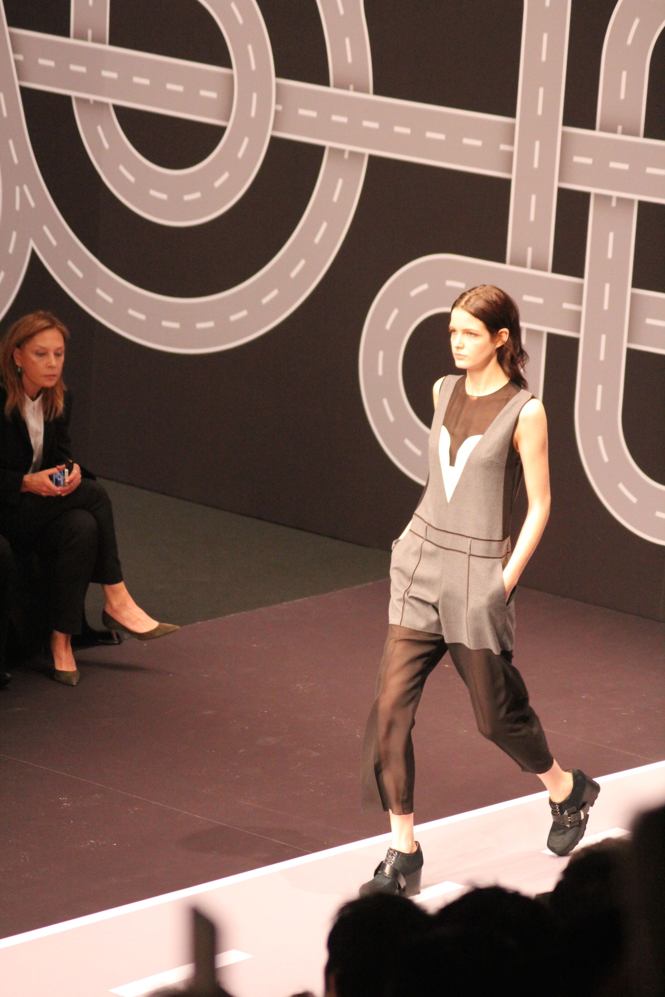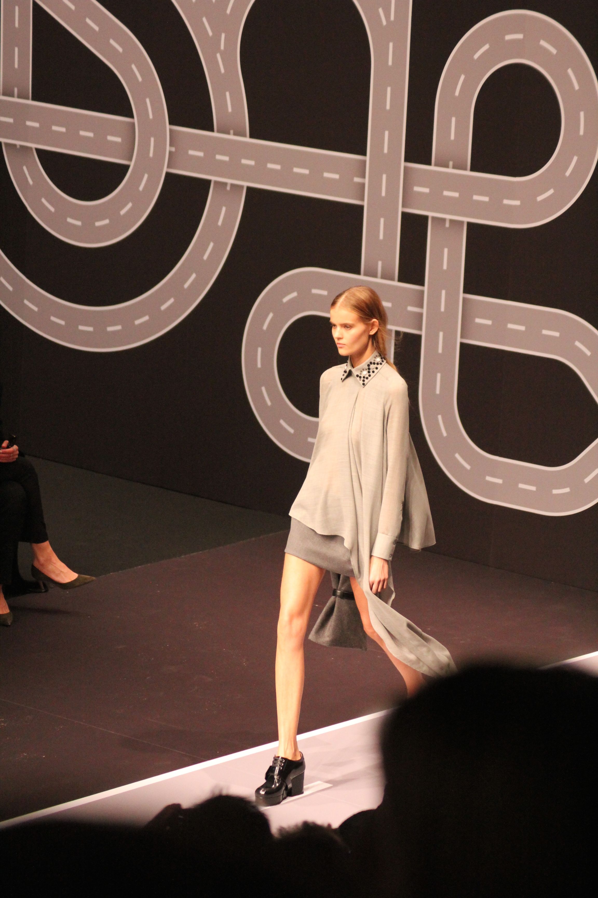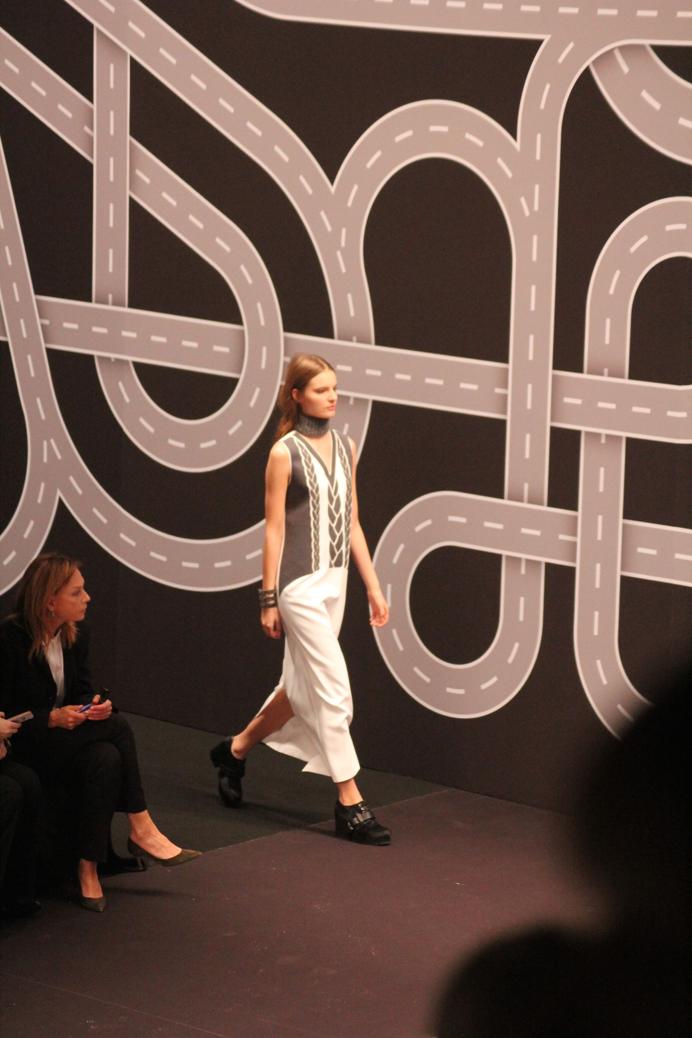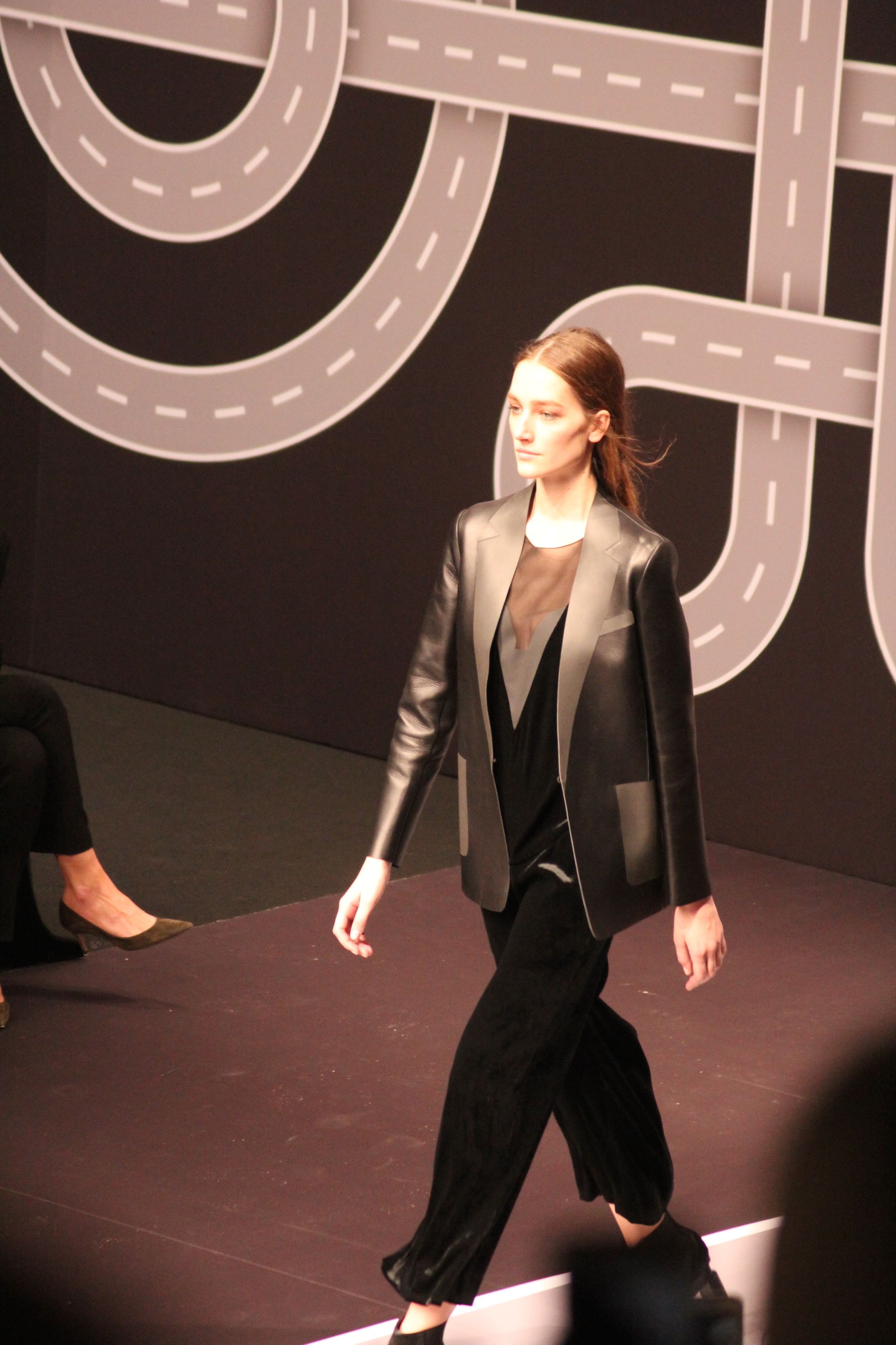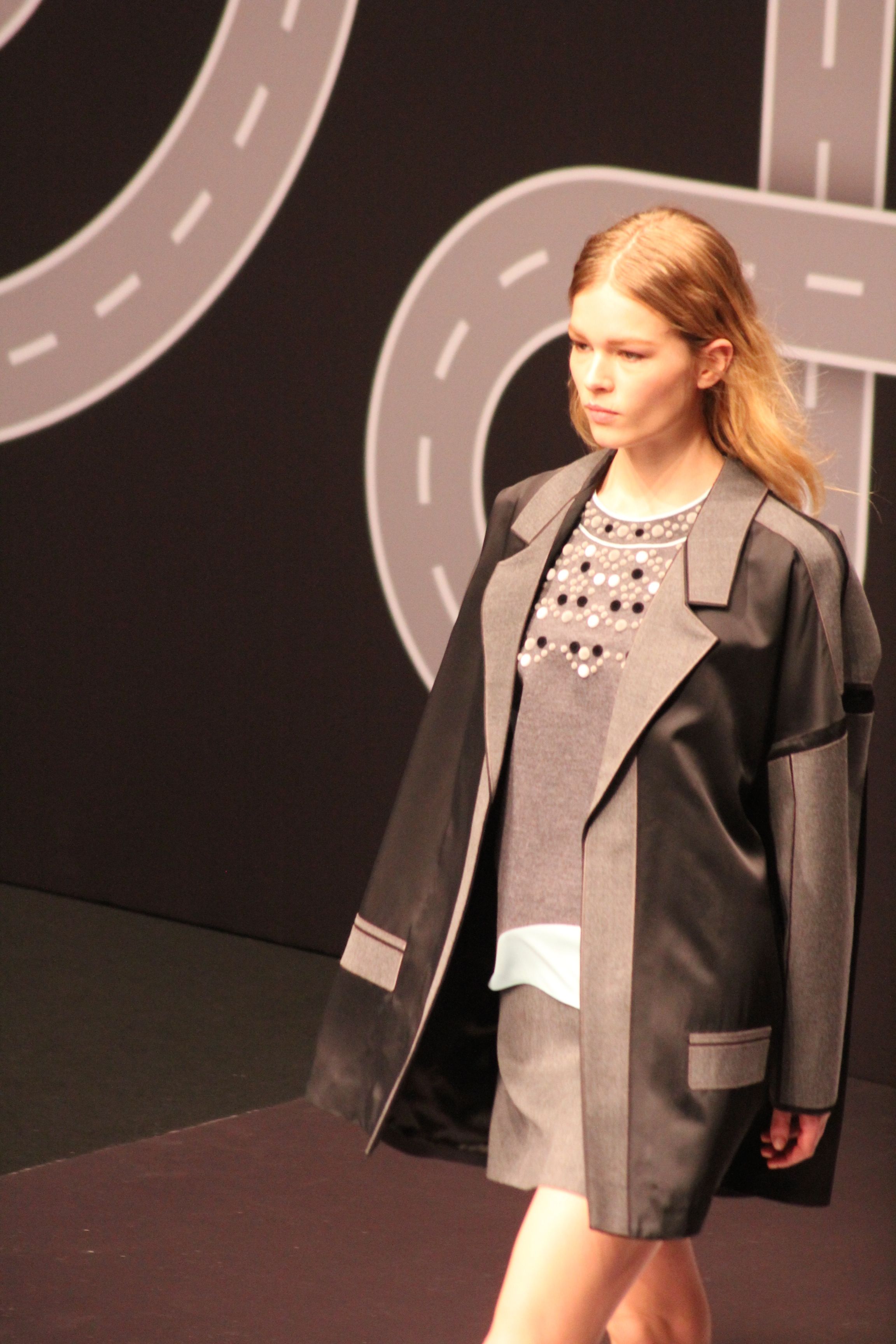 Le décor d’autoroute ainsi que les réverbères étaient là pour planter le décor. Joans As Police Woman jouait quand à elle la bande son de ce road trip. Le bitume inspire donc la mode, les gris omniprésents, le noir et le blanc.