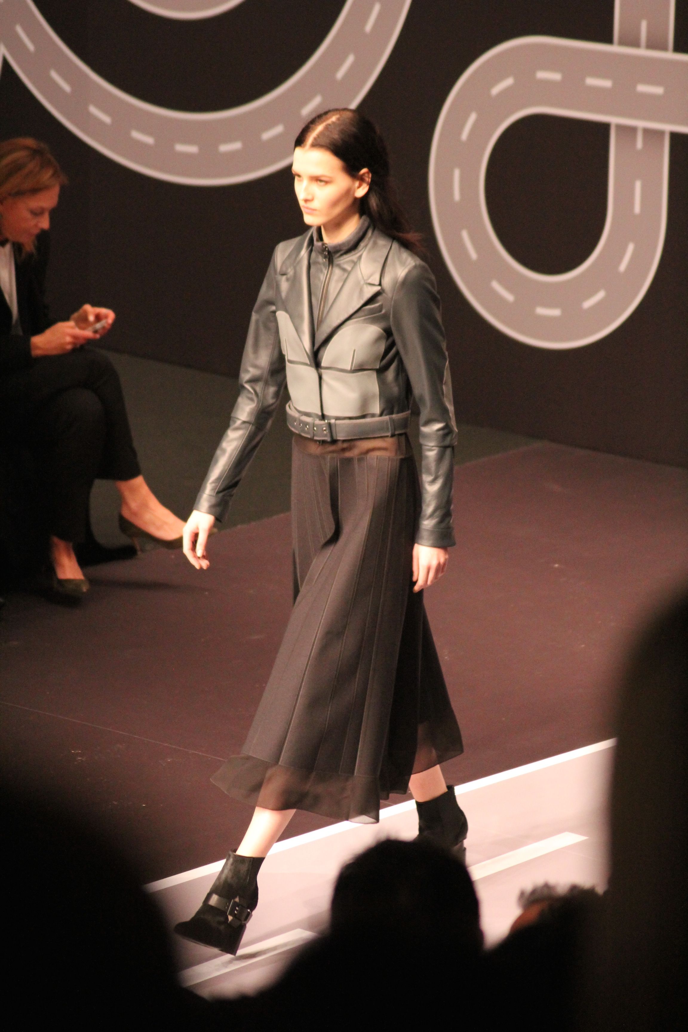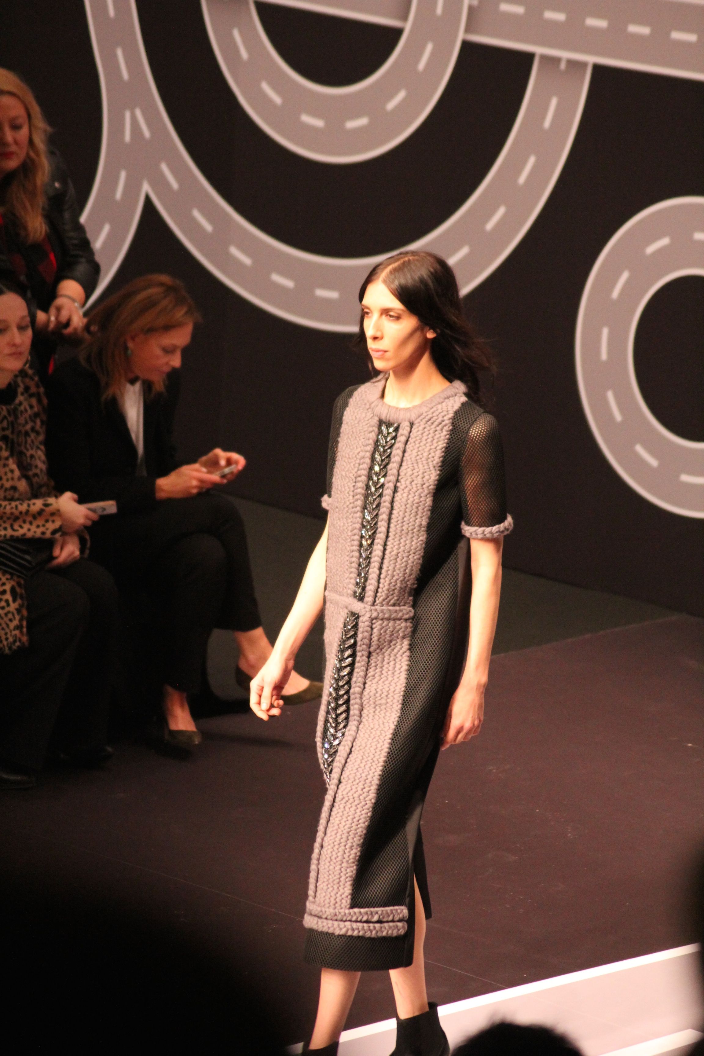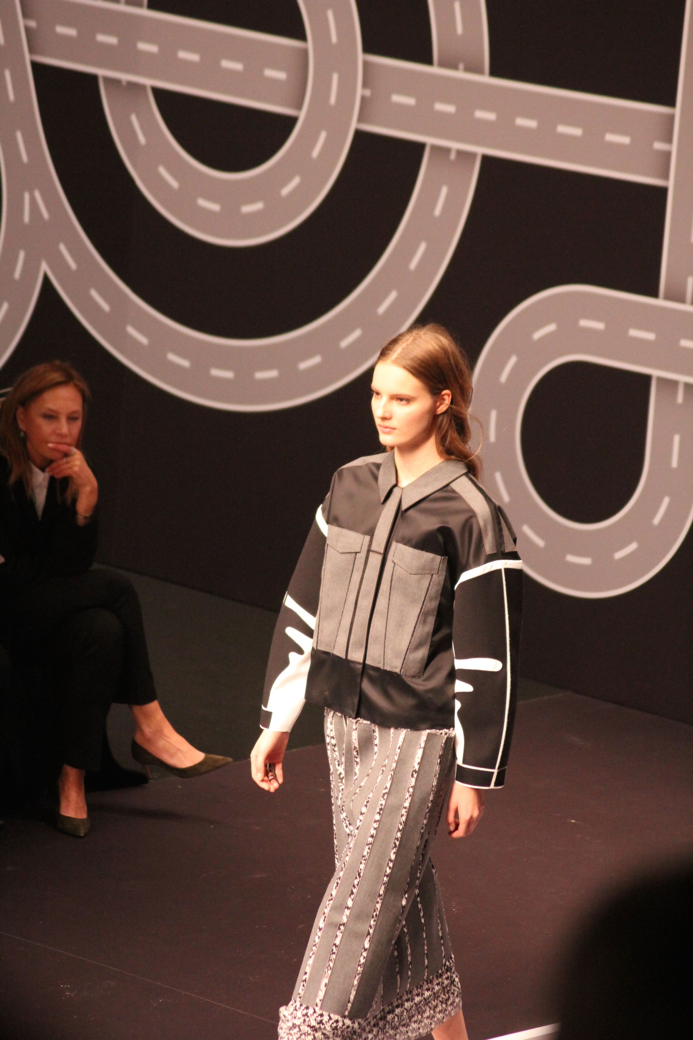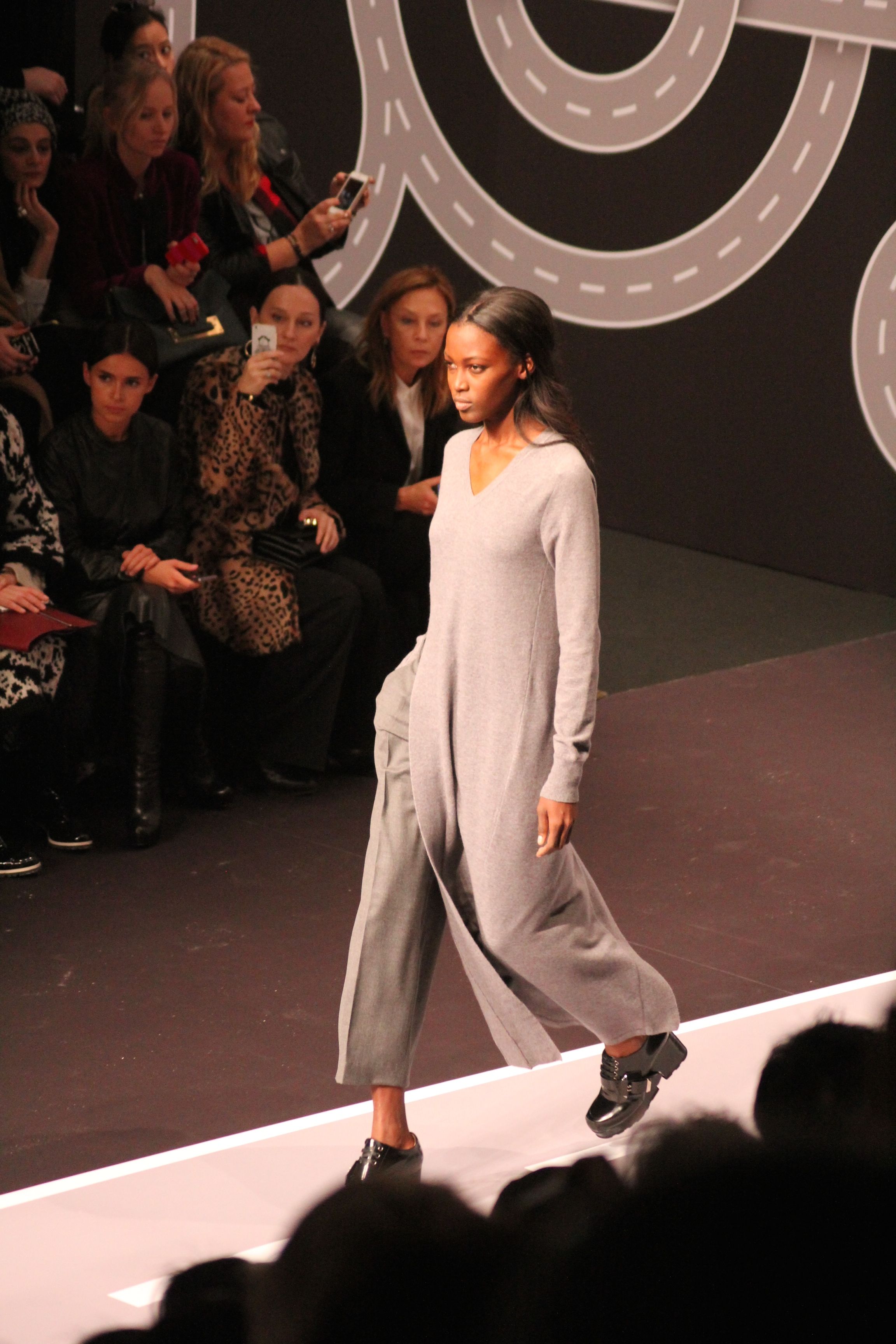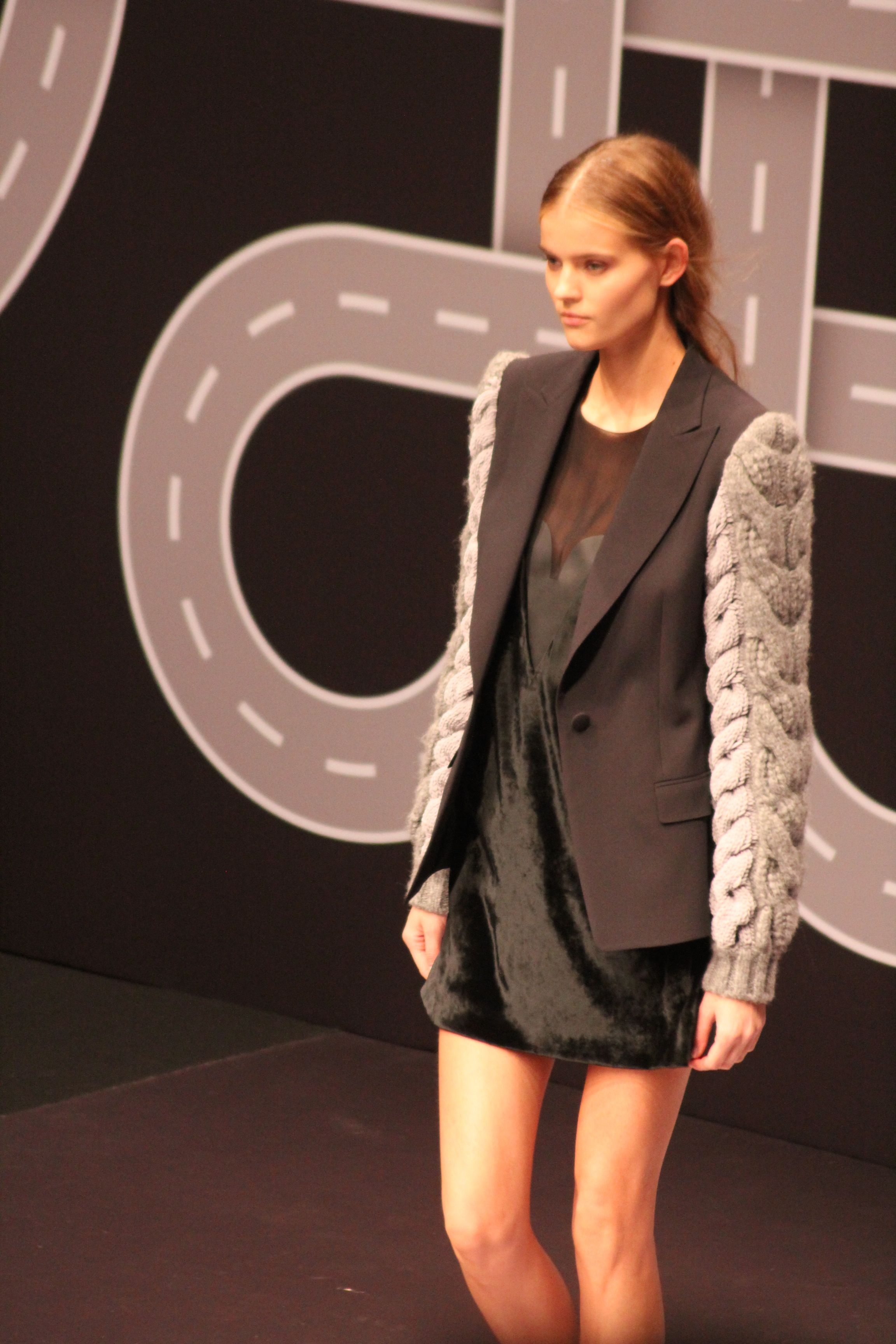 Le décor d’autoroute ainsi que les réverbères étaient là pour planter le décor. Joans As Police Woman jouait quand à elle la bande son de ce road trip. Le bitume inspire donc la mode, les gris omniprésents, le noir et le blanc.
