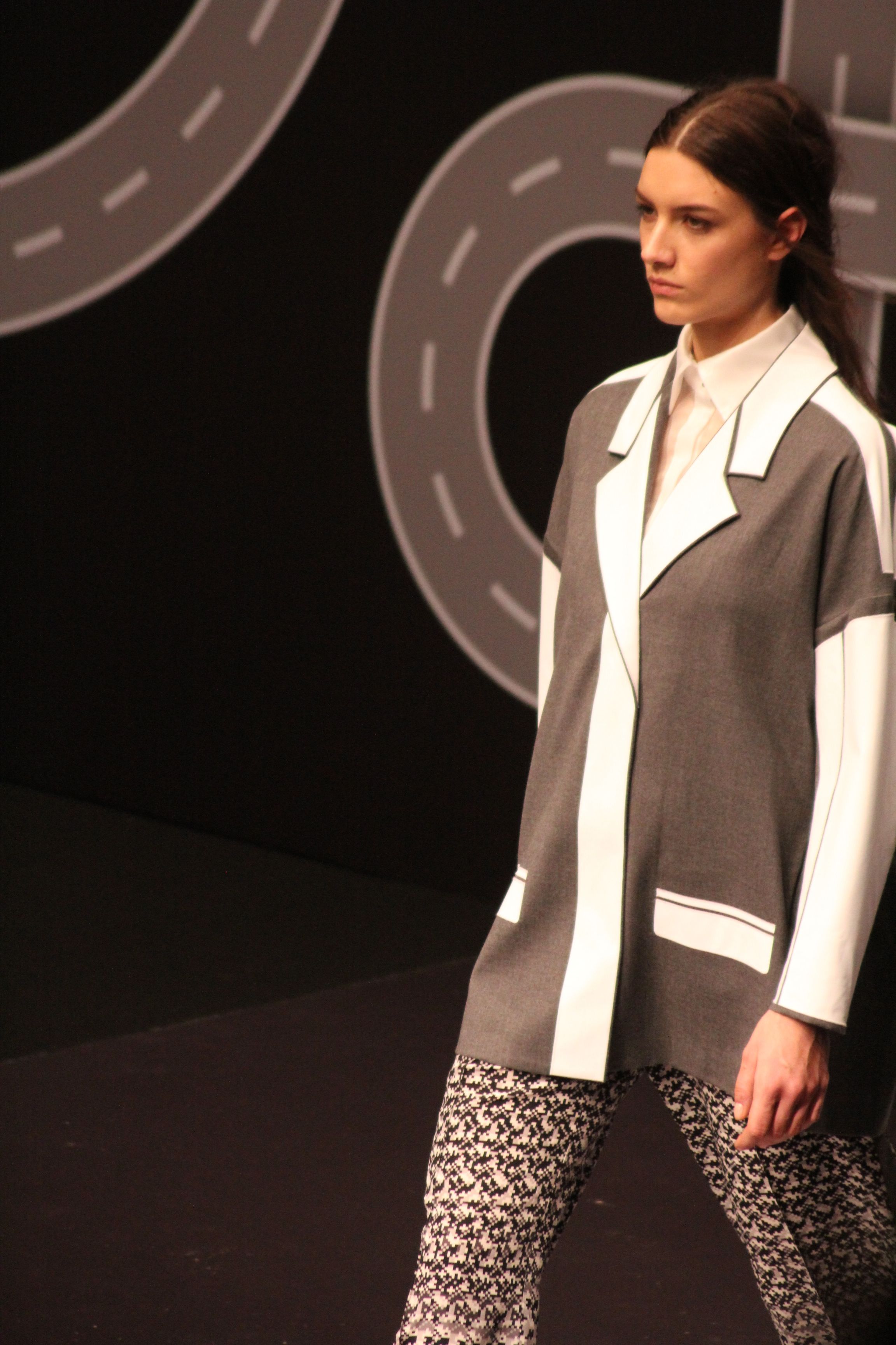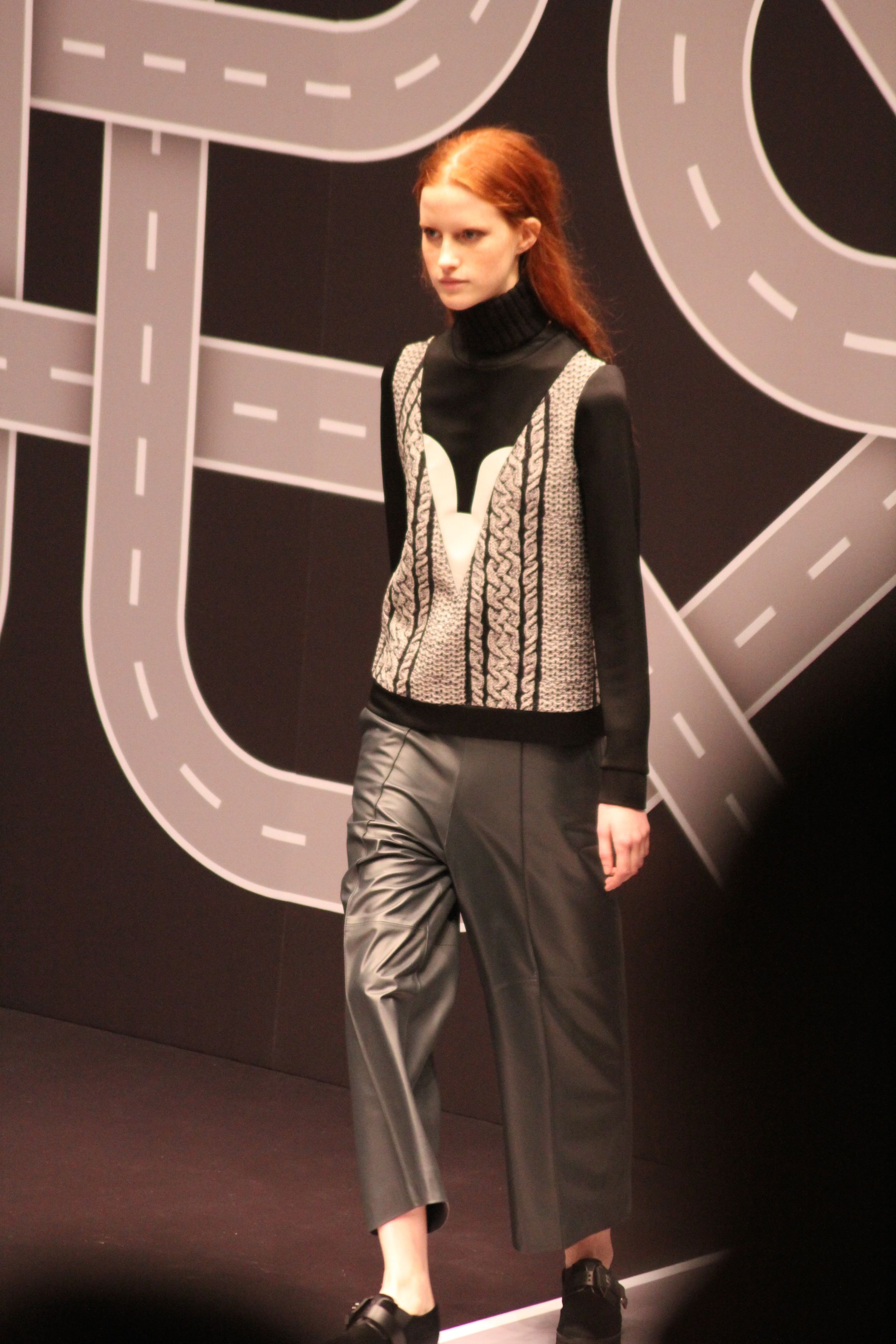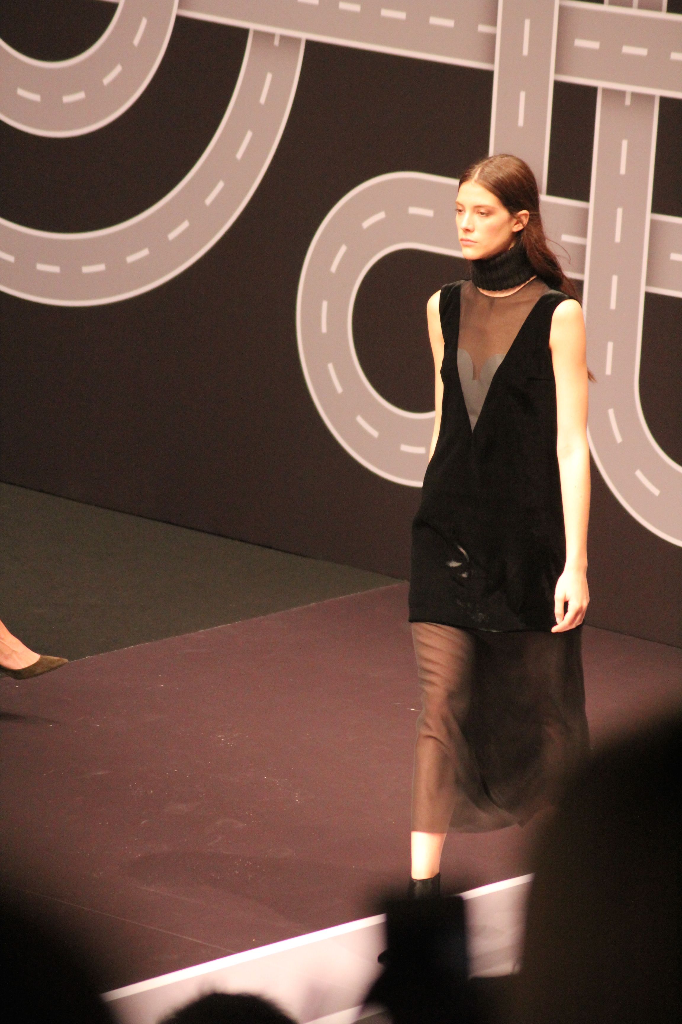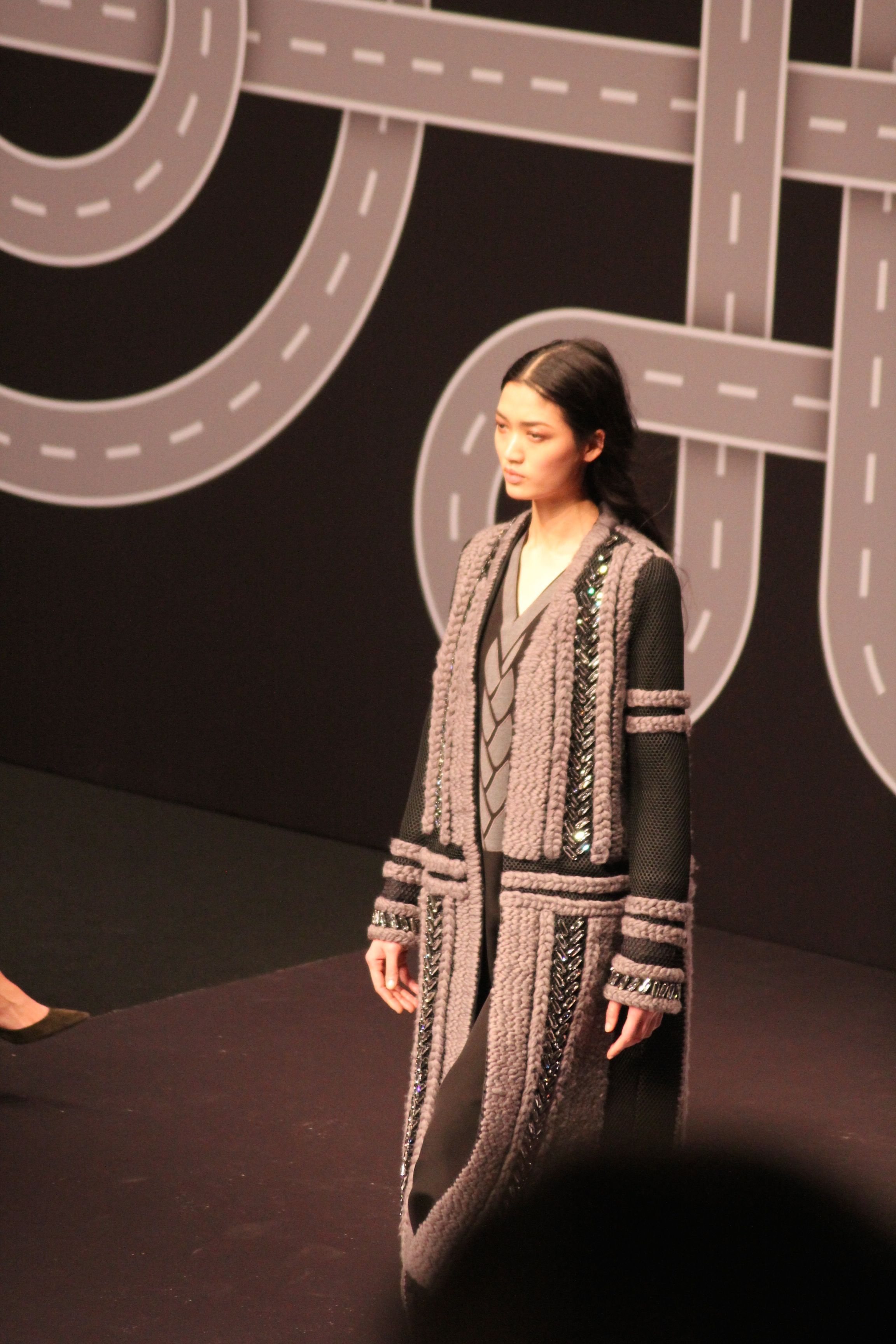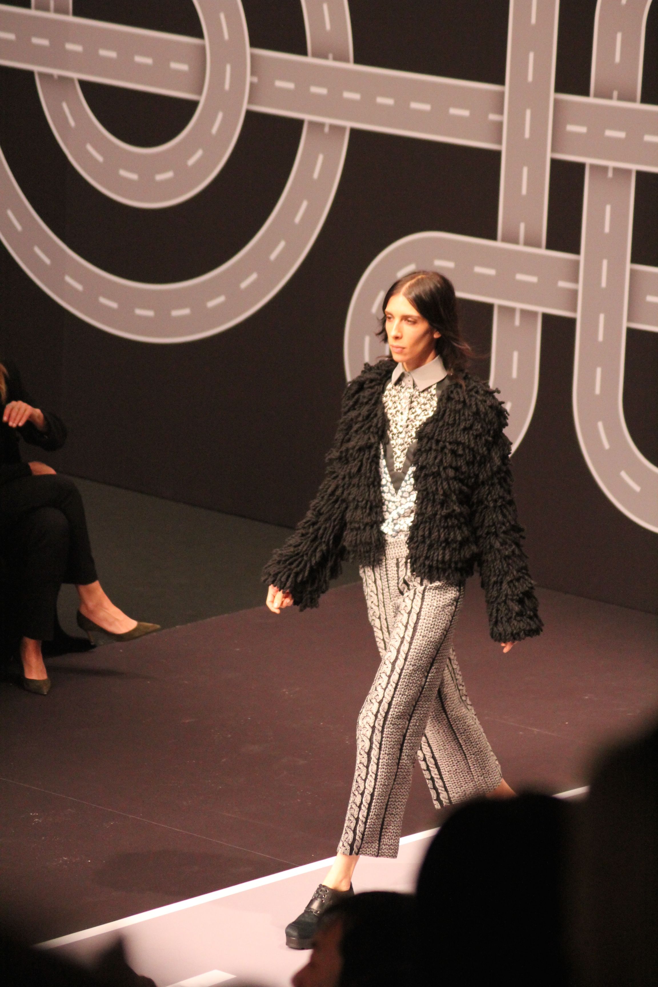 Le décor d’autoroute ainsi que les réverbères étaient là pour planter le décor. Joans As Police Woman jouait quand à elle la bande son de ce road trip. Le bitume inspire donc la mode, les gris omniprésents, le noir et le blanc.