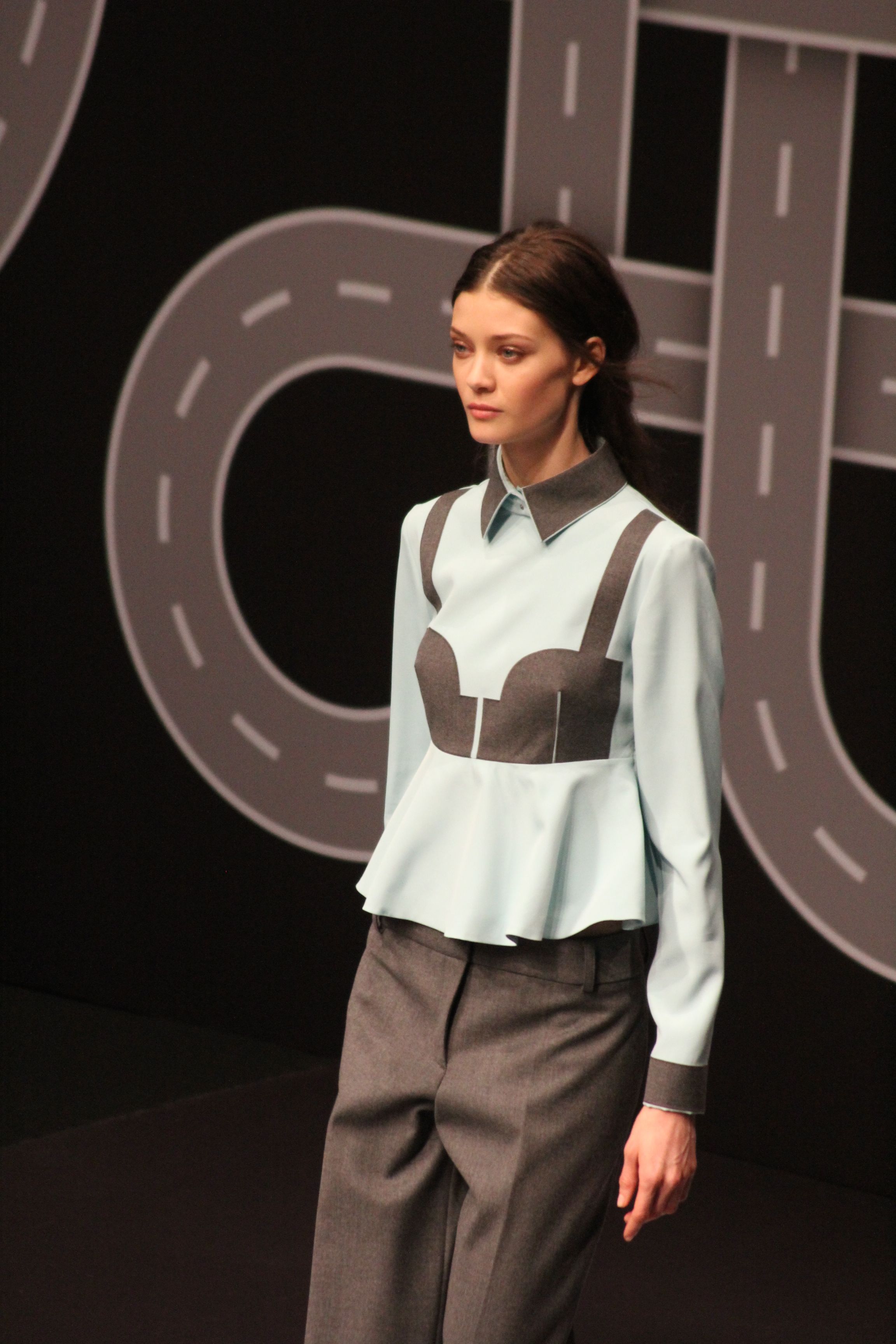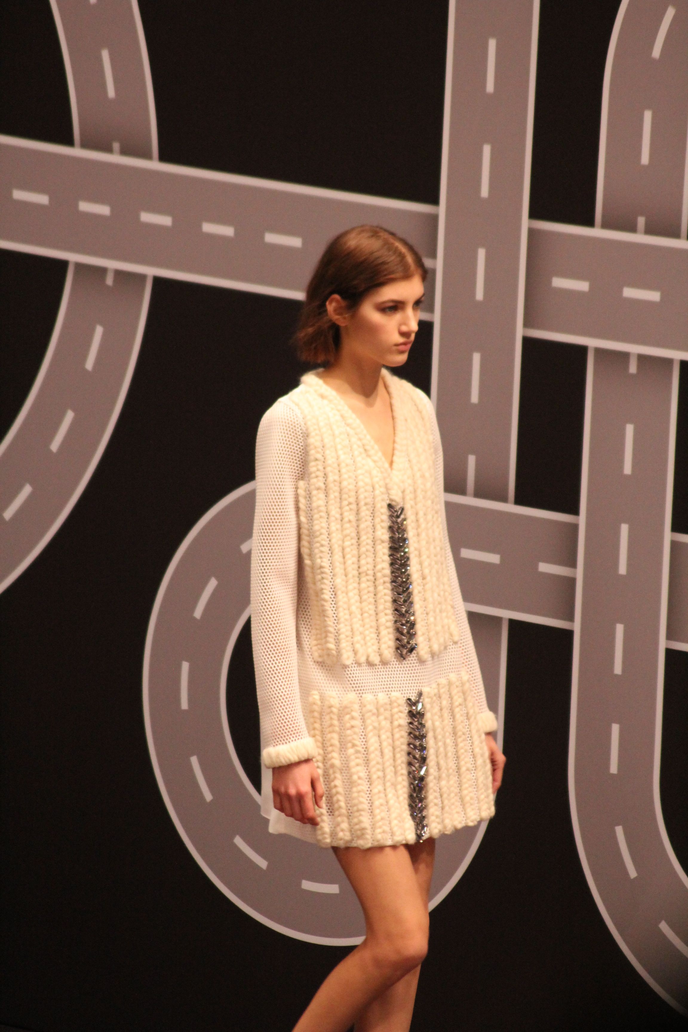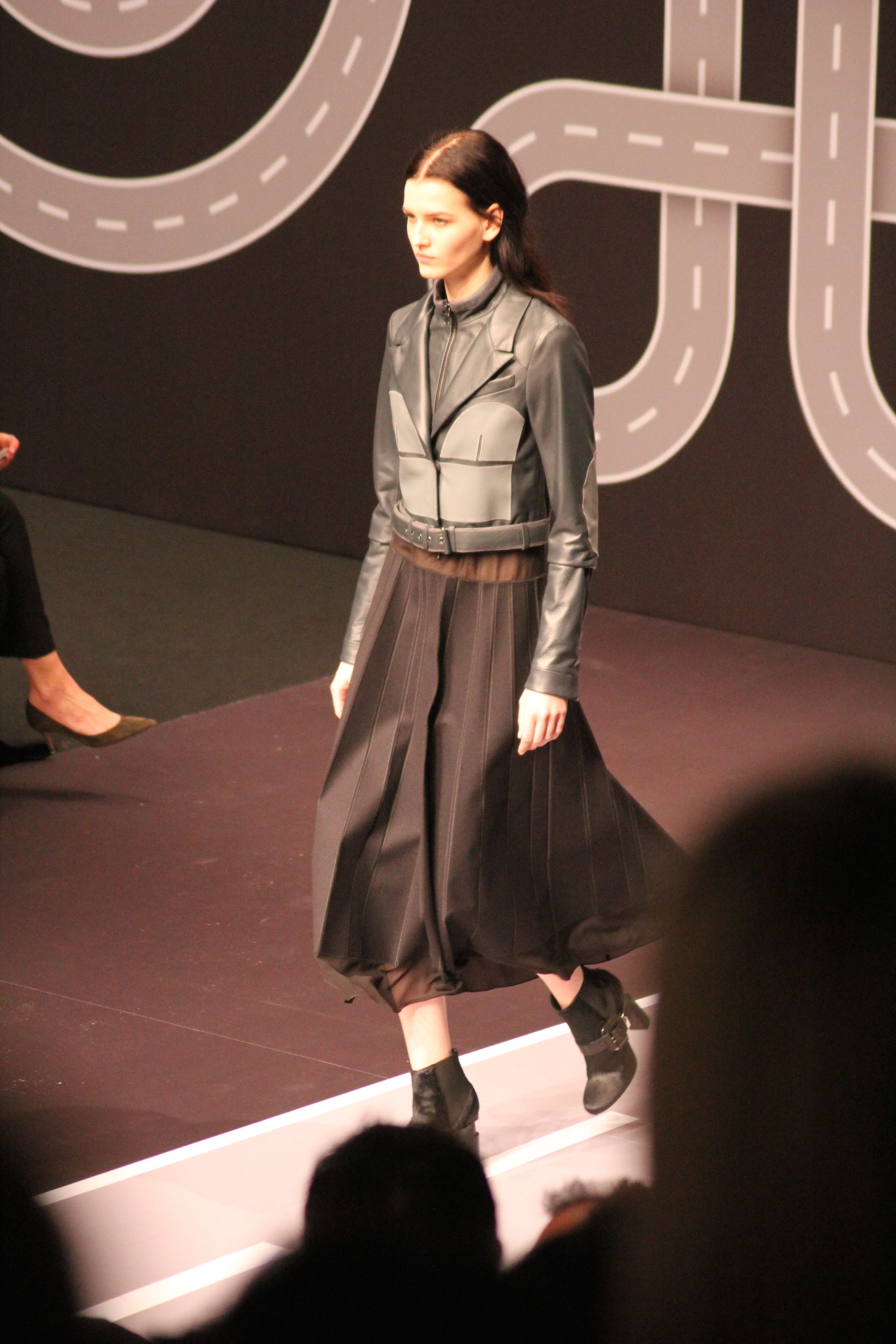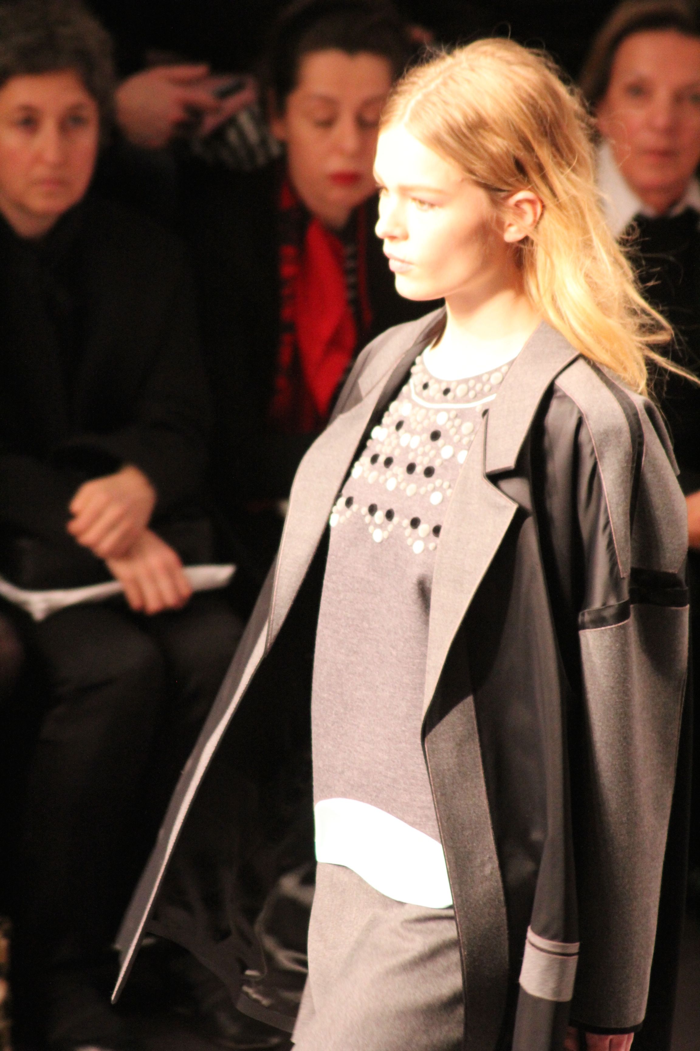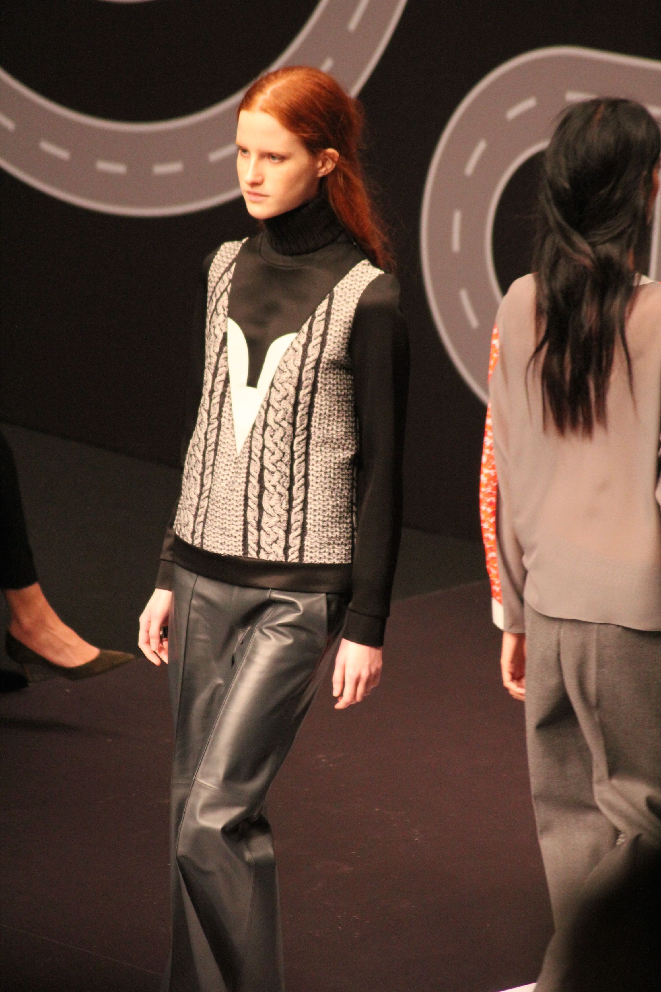 Le décor d’autoroute ainsi que les réverbères étaient là pour planter le décor. Joans As Police Woman jouait quand à elle la bande son de ce road trip. Le bitume inspire donc la mode, les gris omniprésents, le noir et le blanc.