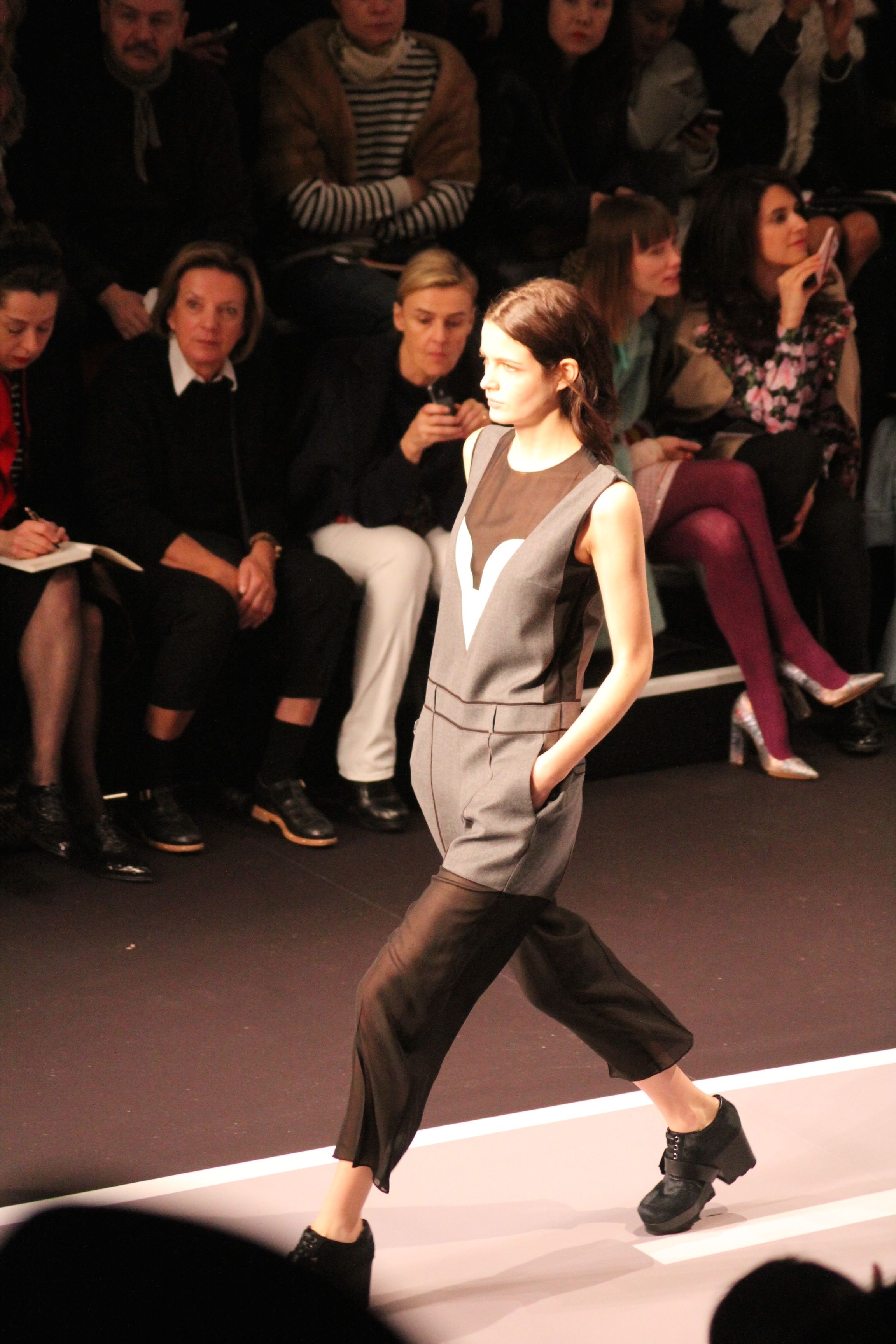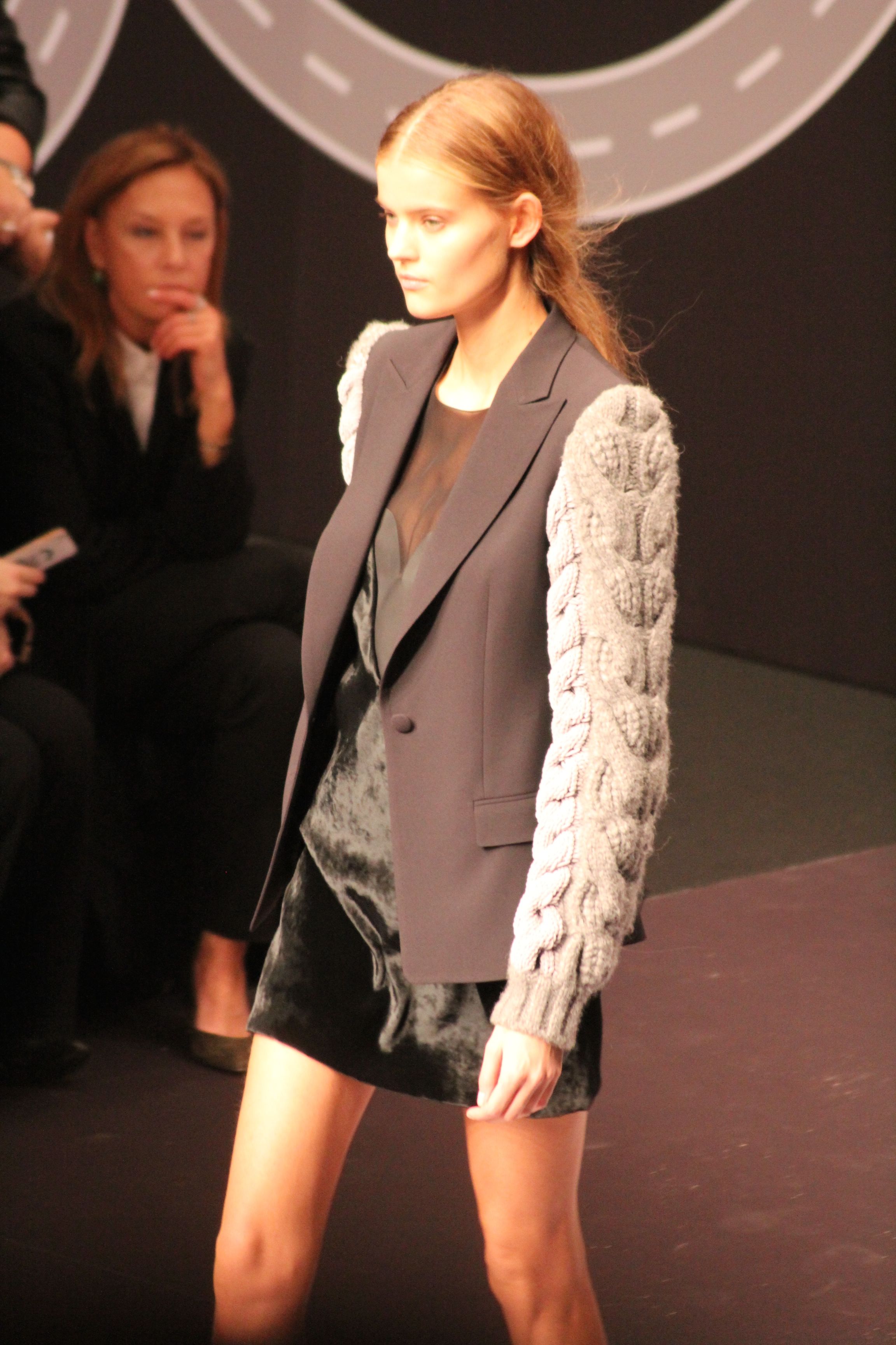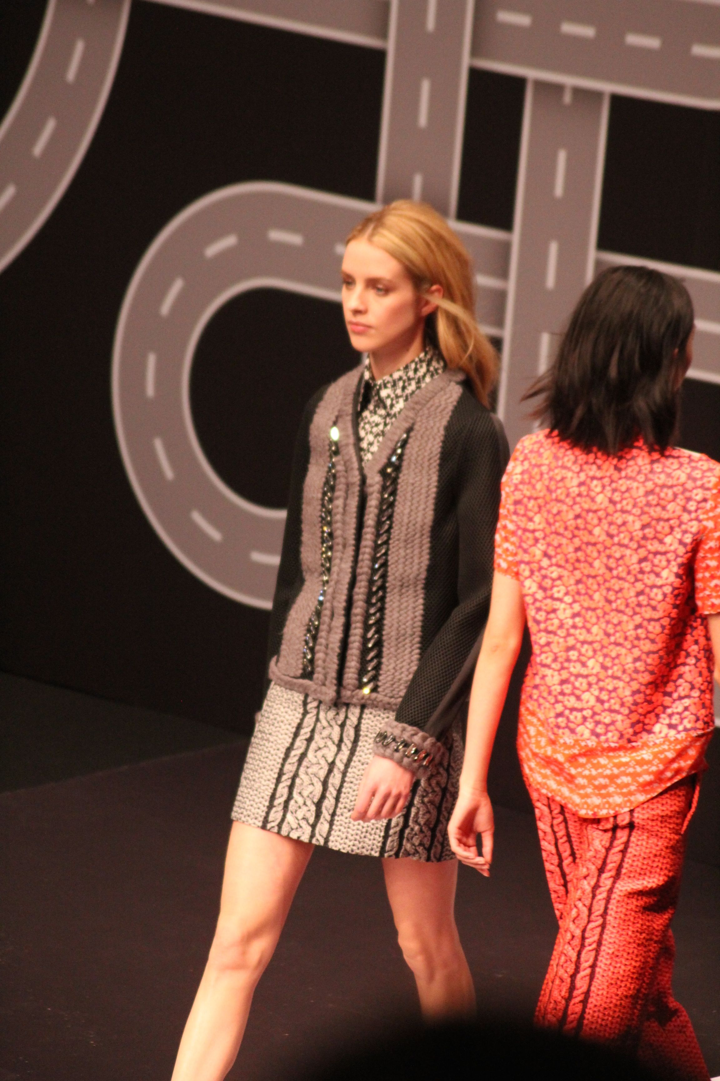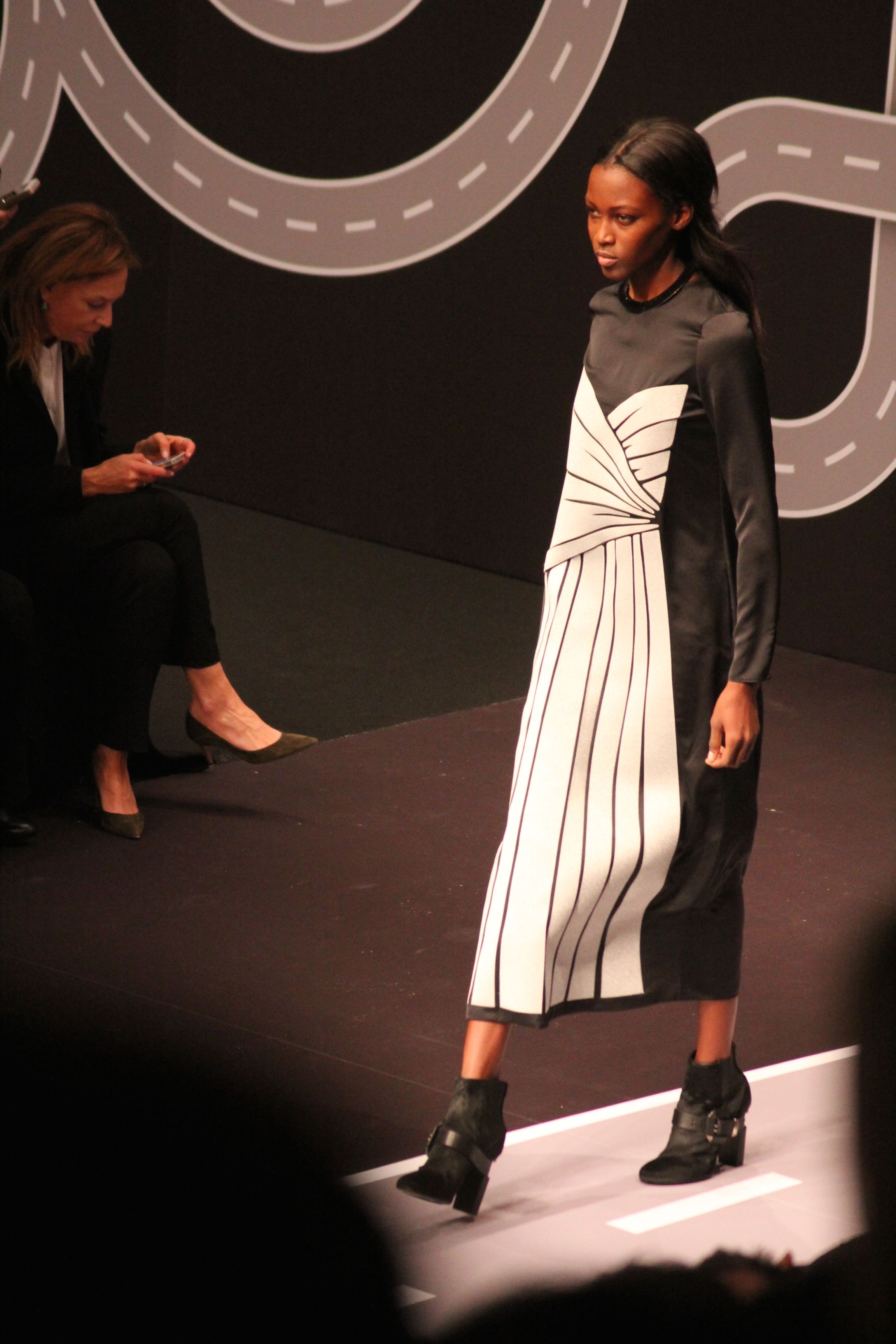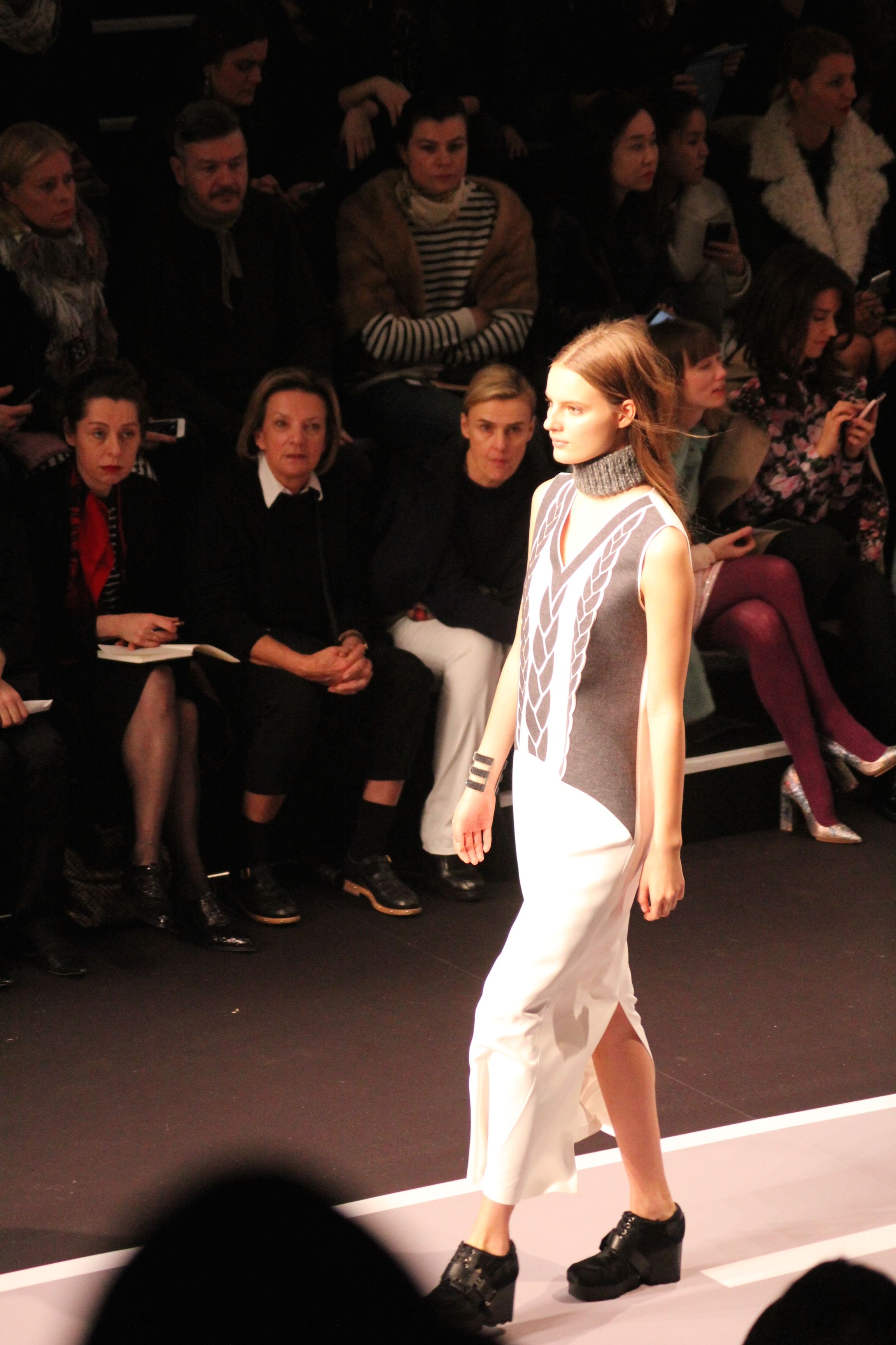 Le décor d’autoroute ainsi que les réverbères étaient là pour planter le décor. Joans As Police Woman jouait quand à elle la bande son de ce road trip. Le bitume inspire donc la mode, les gris omniprésents, le noir et le blanc.