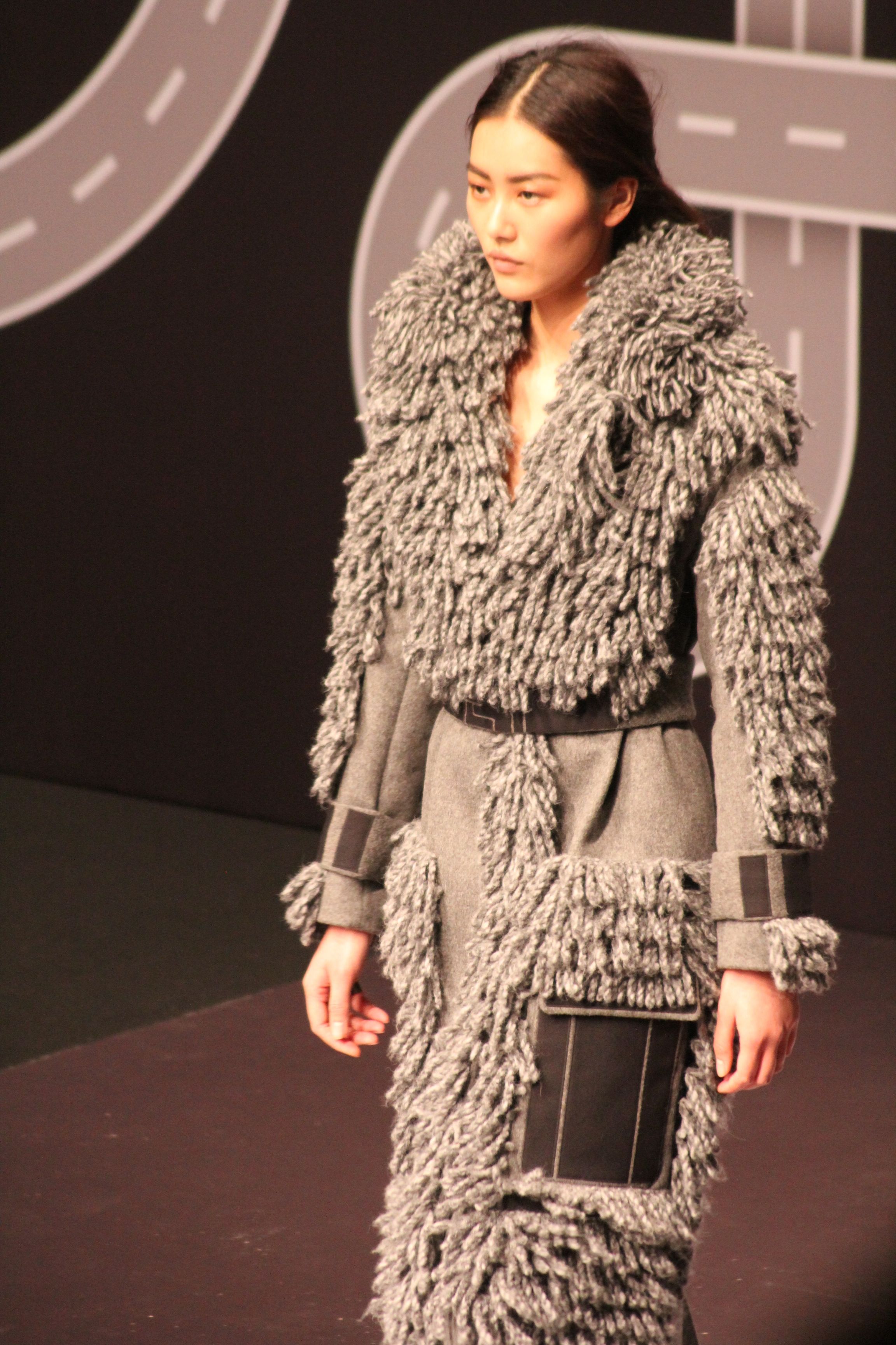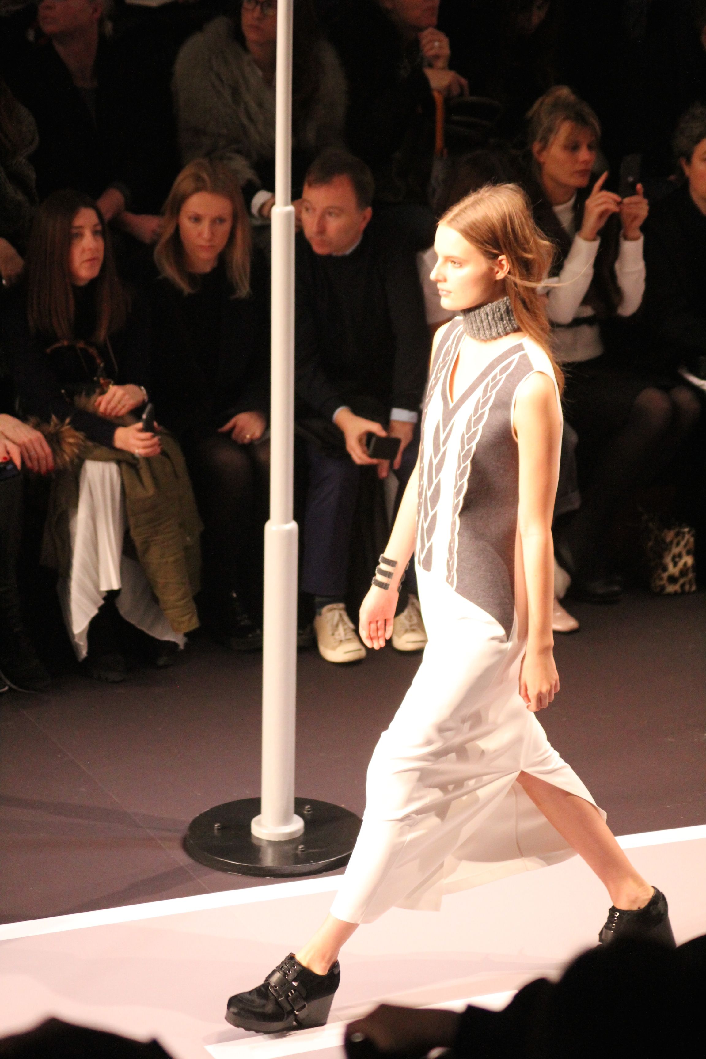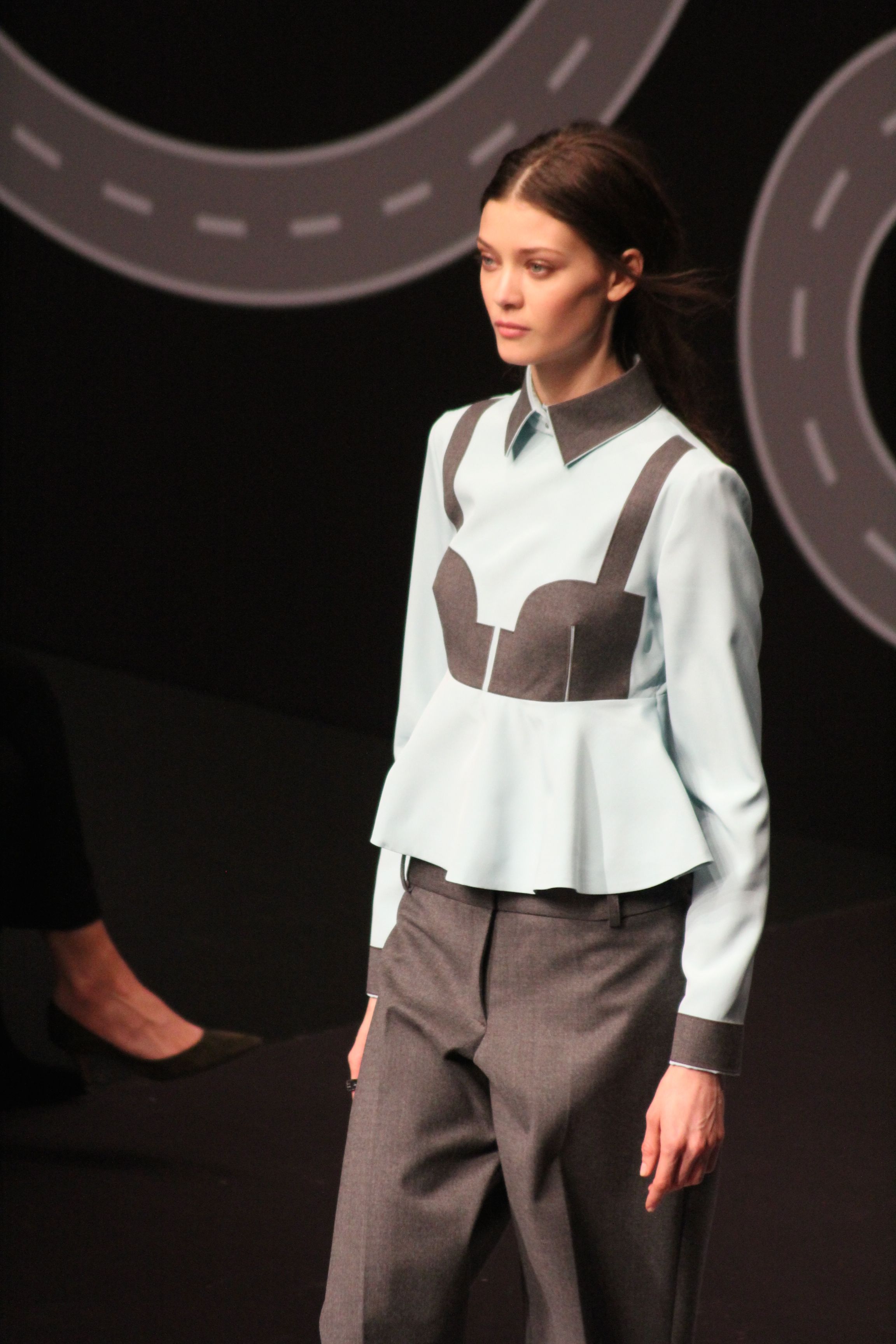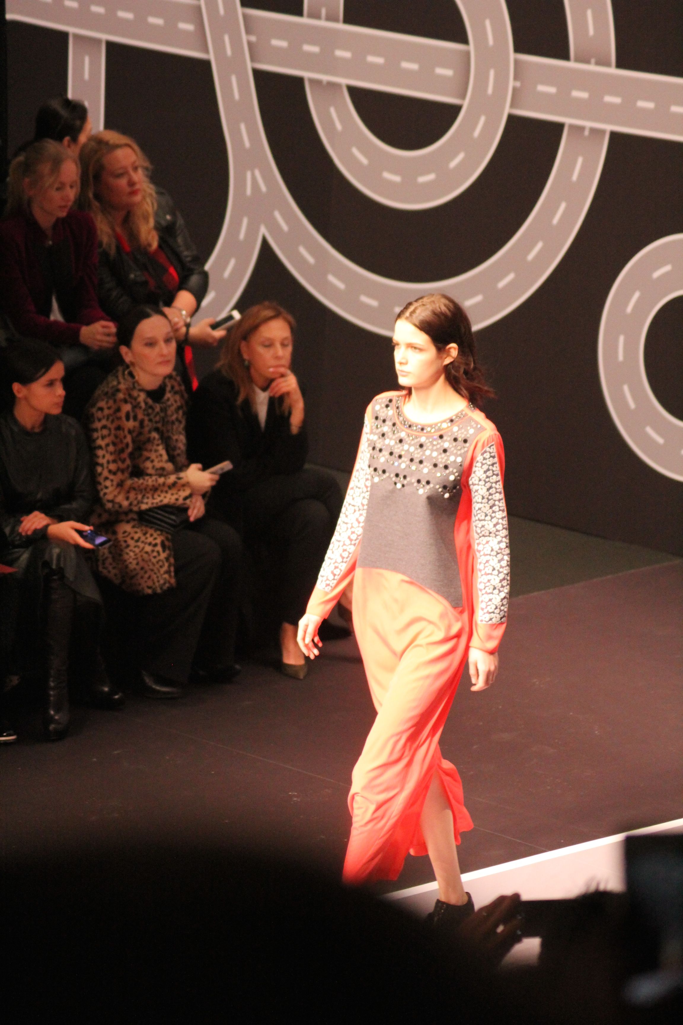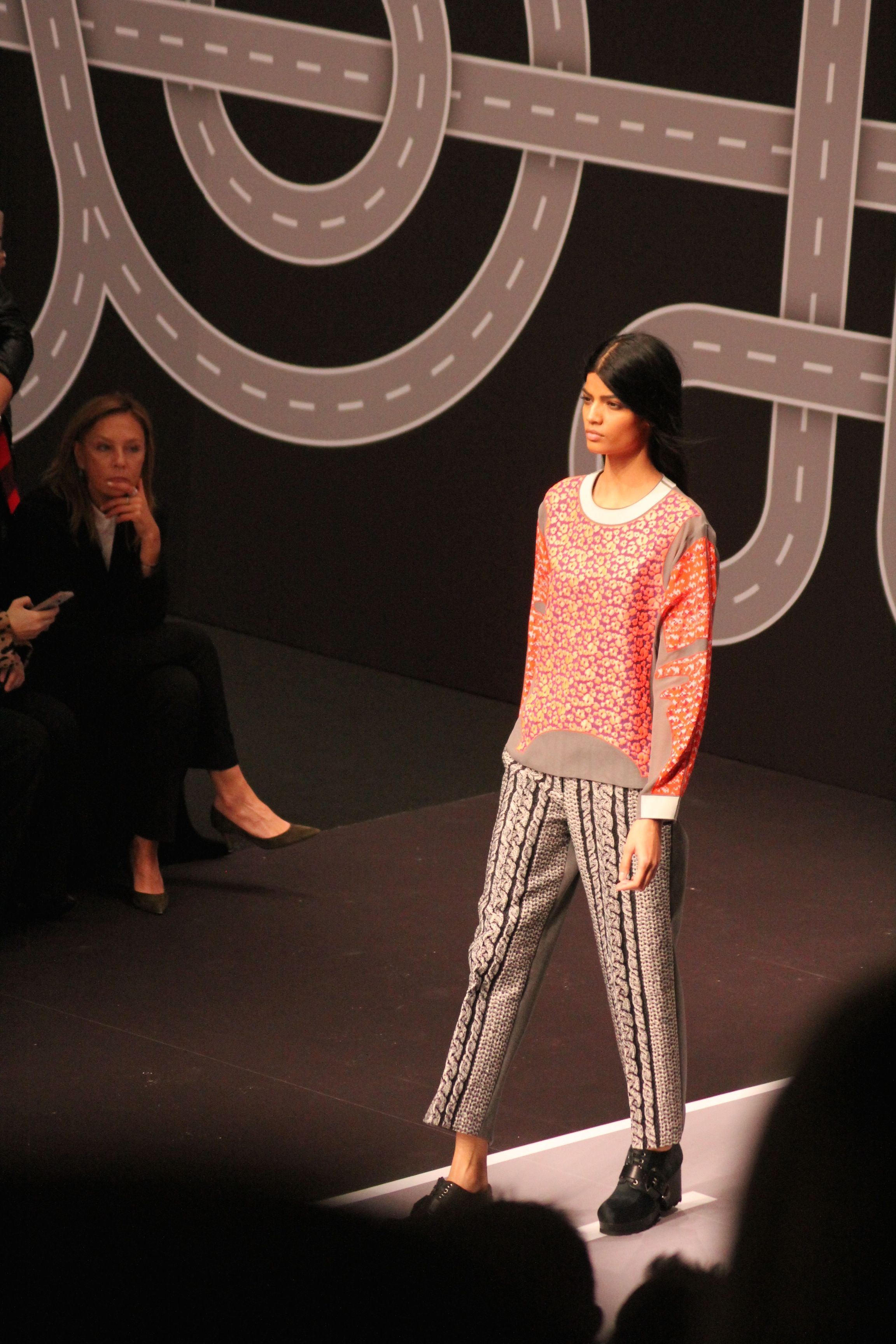 Le décor d’autoroute ainsi que les réverbères étaient là pour planter le décor. Joans As Police Woman jouait quand à elle la bande son de ce road trip. Le bitume inspire donc la mode, les gris omniprésents, le noir et le blanc.