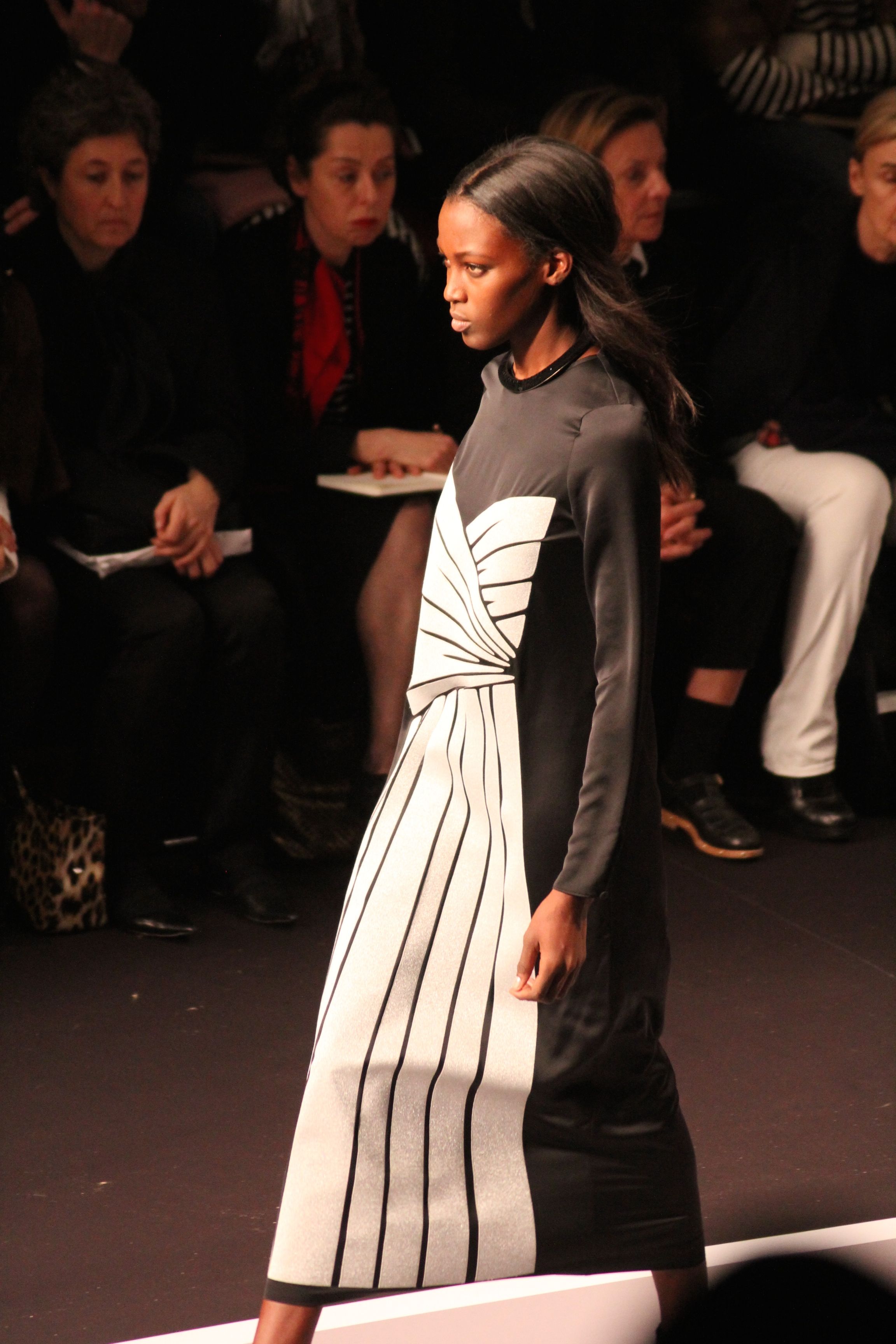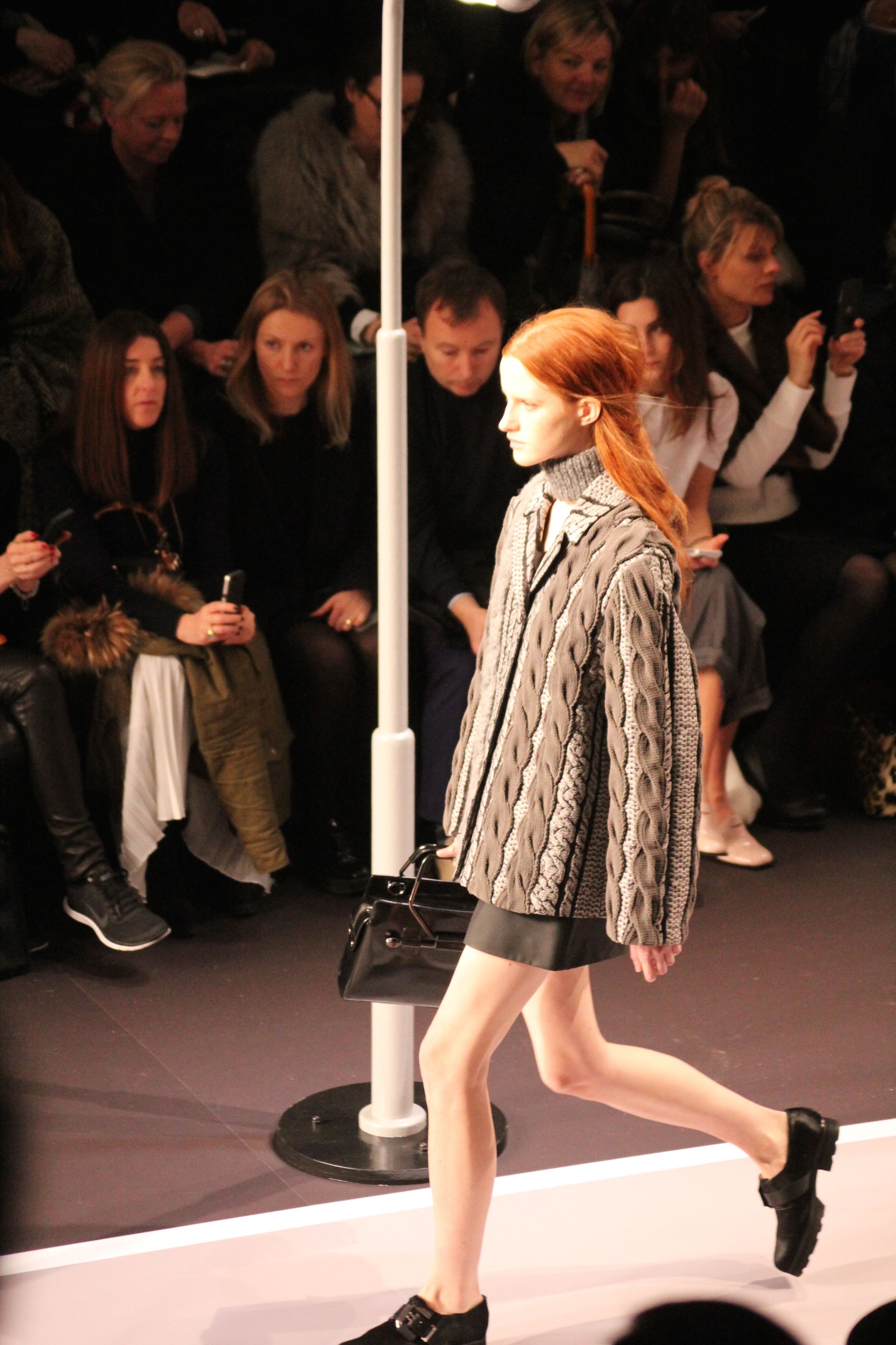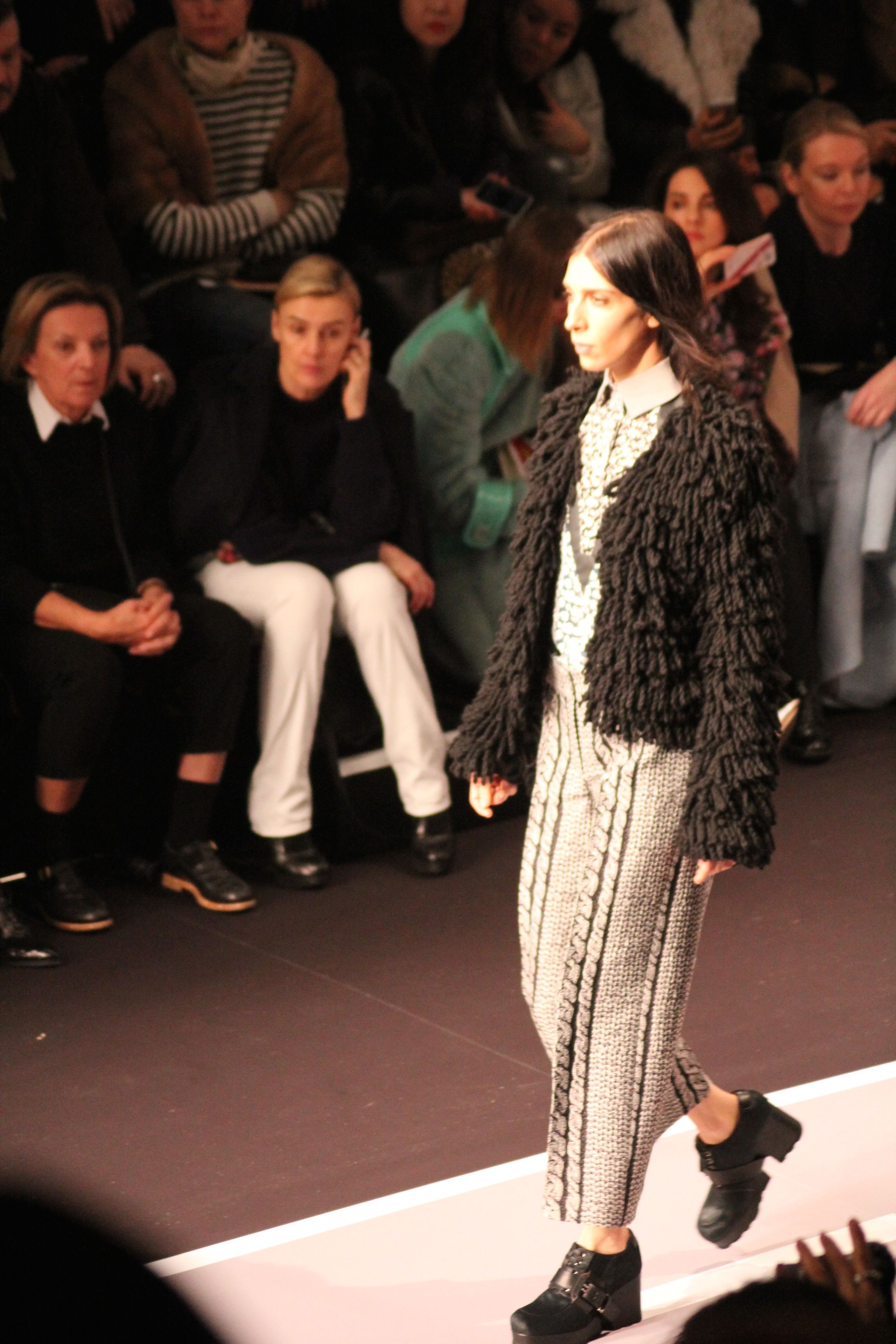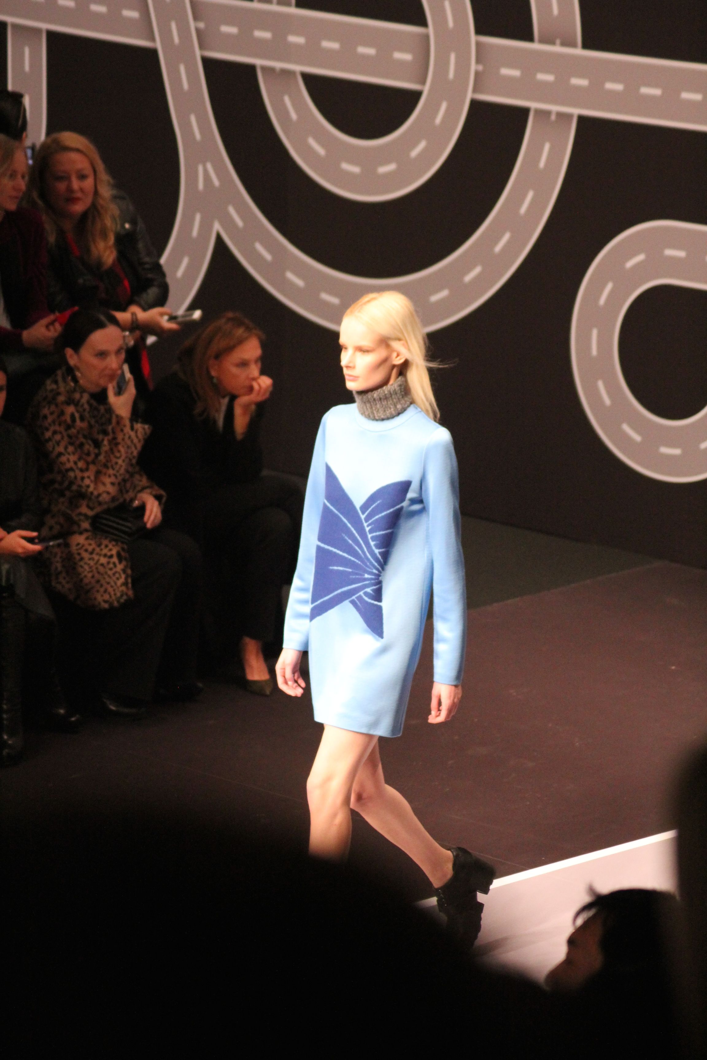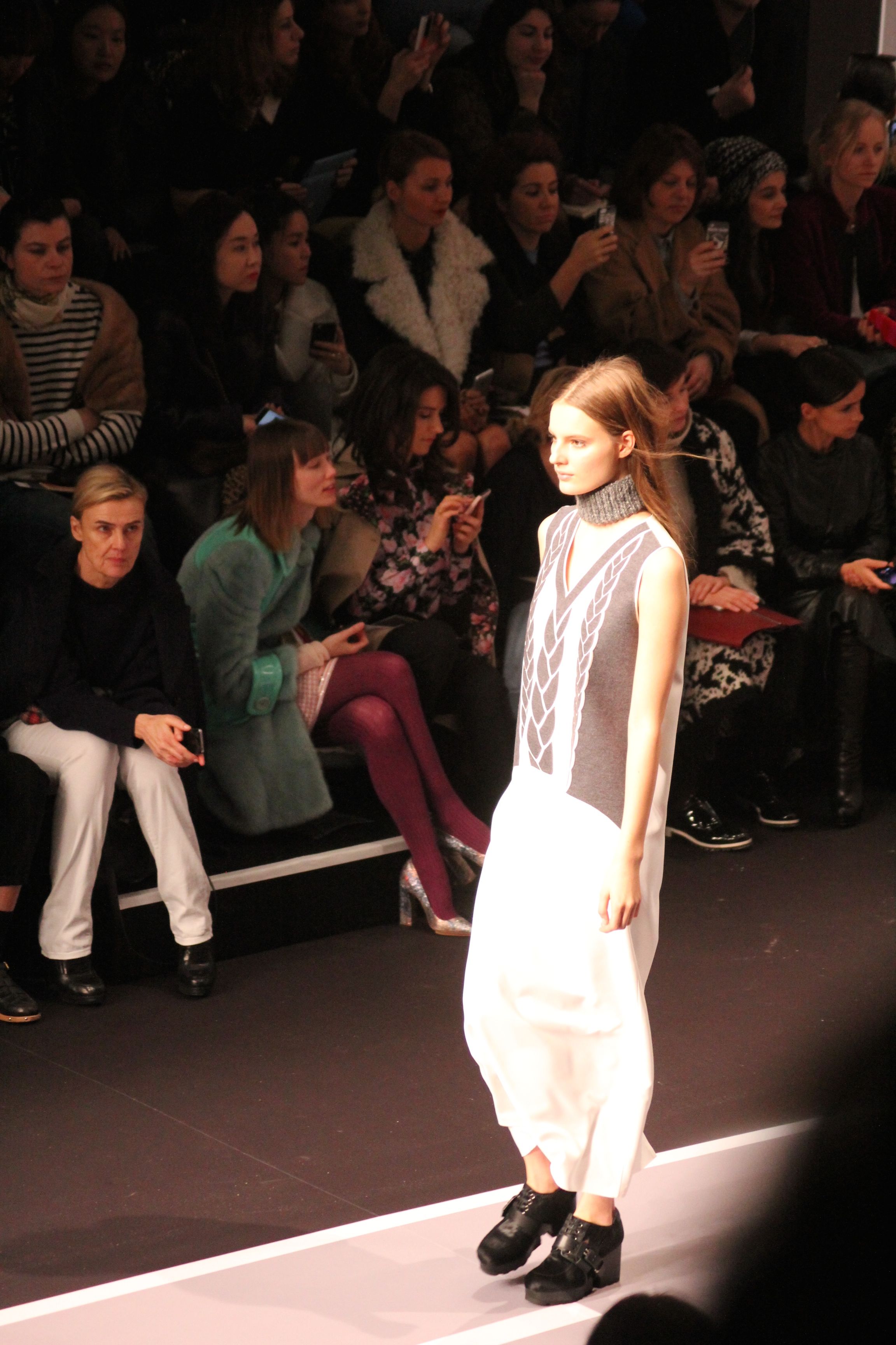 Le décor d’autoroute ainsi que les réverbères étaient là pour planter le décor. Joans As Police Woman jouait quand à elle la bande son de ce road trip. Le bitume inspire donc la mode, les gris omniprésents, le noir et le blanc.