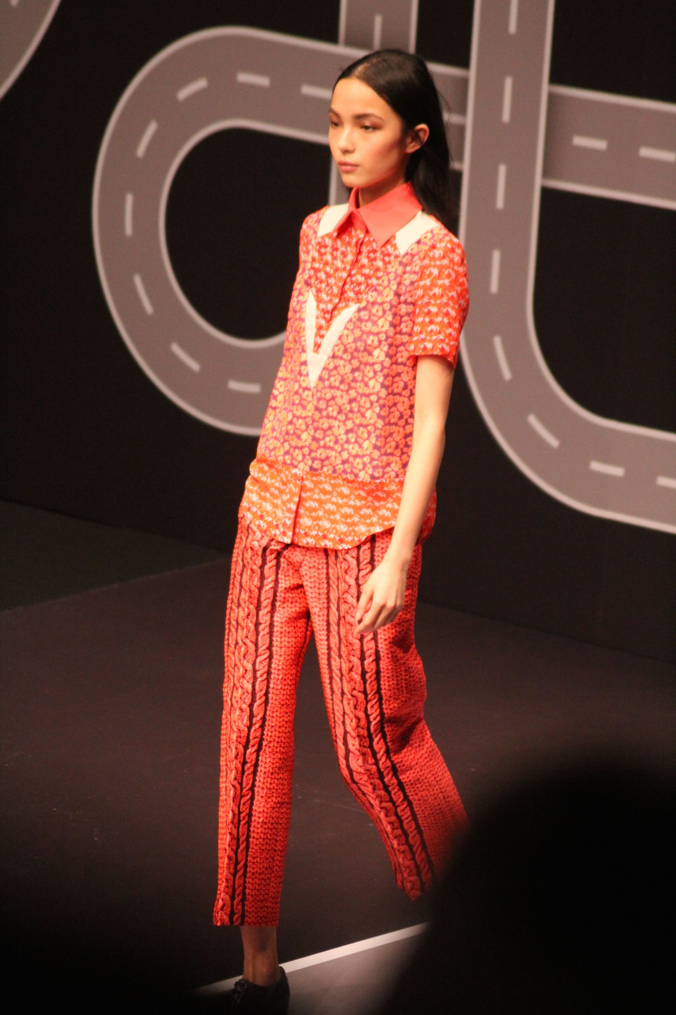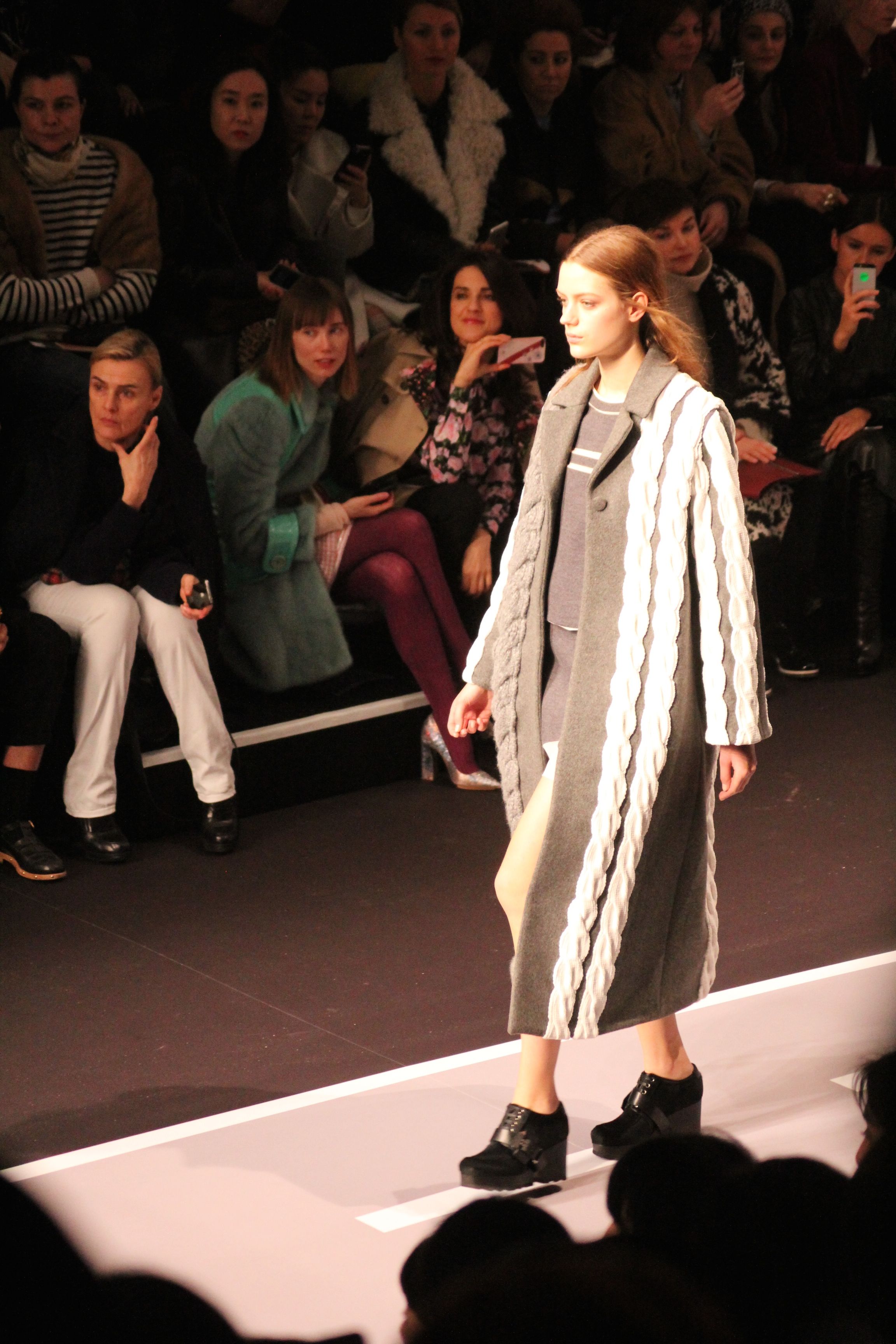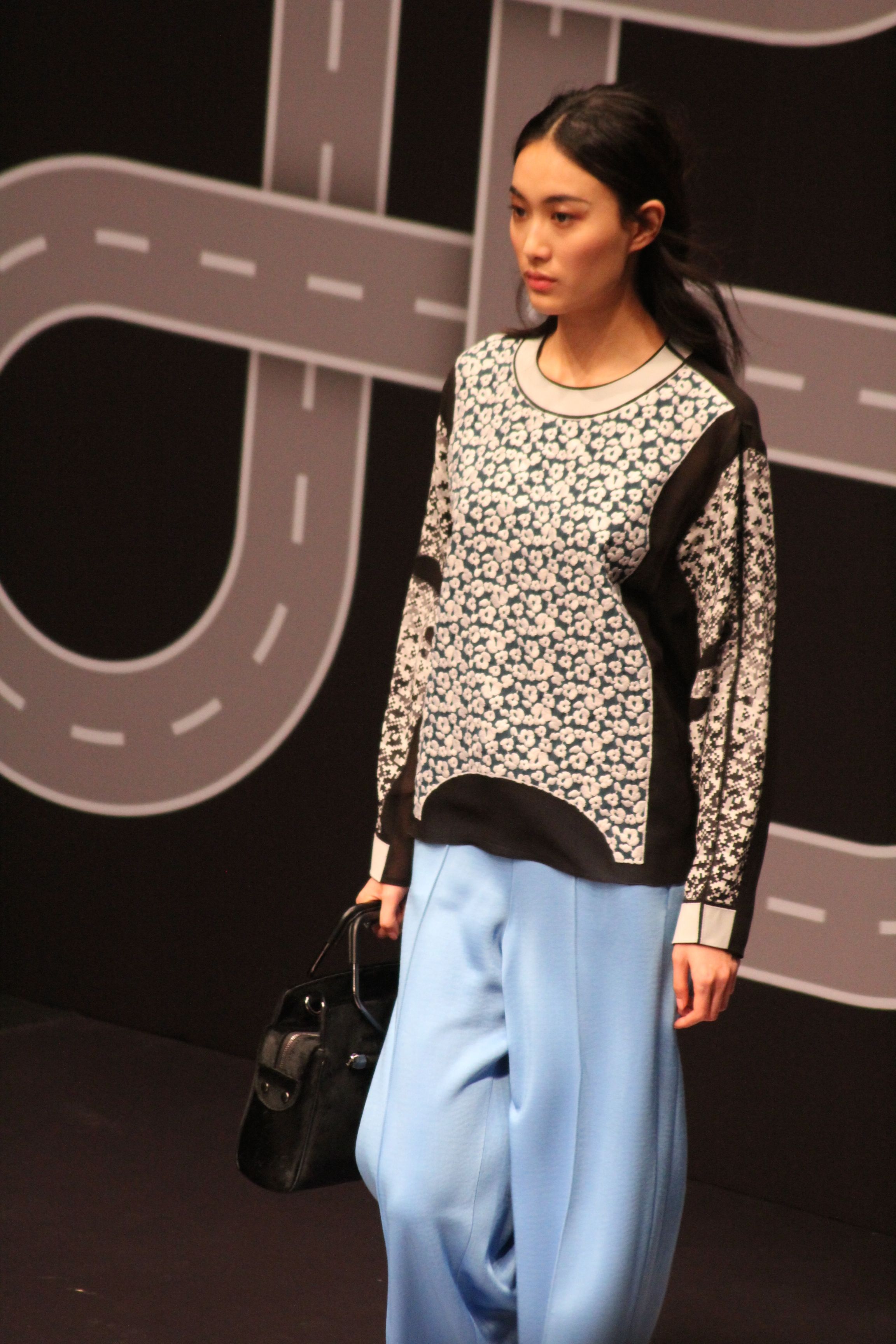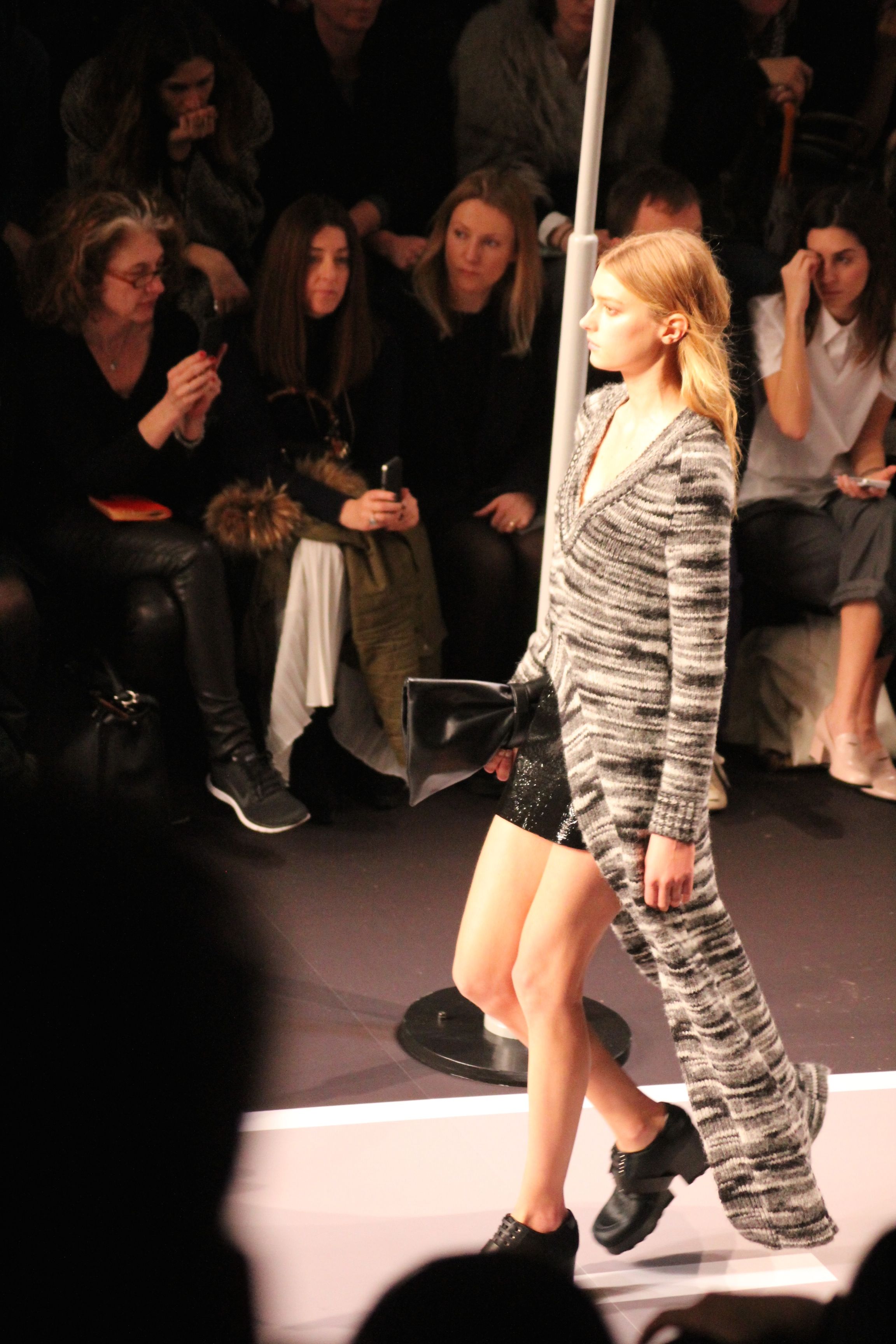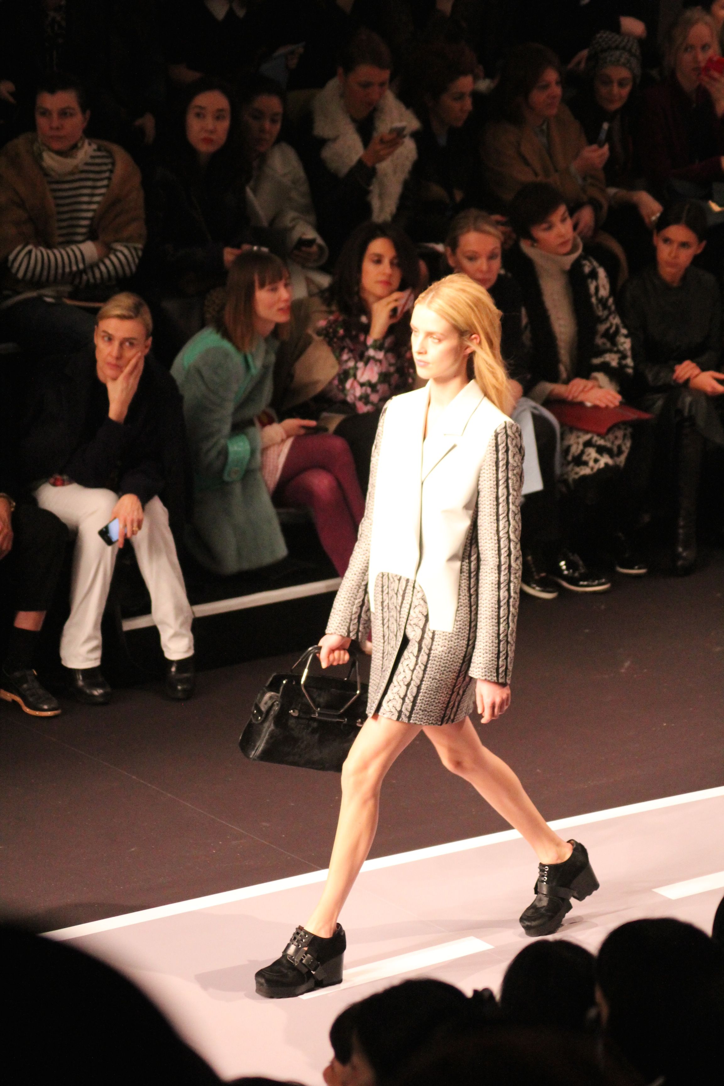 Le décor d’autoroute ainsi que les réverbères étaient là pour planter le décor. Joans As Police Woman jouait quand à elle la bande son de ce road trip. Le bitume inspire donc la mode, les gris omniprésents, le noir et le blanc.