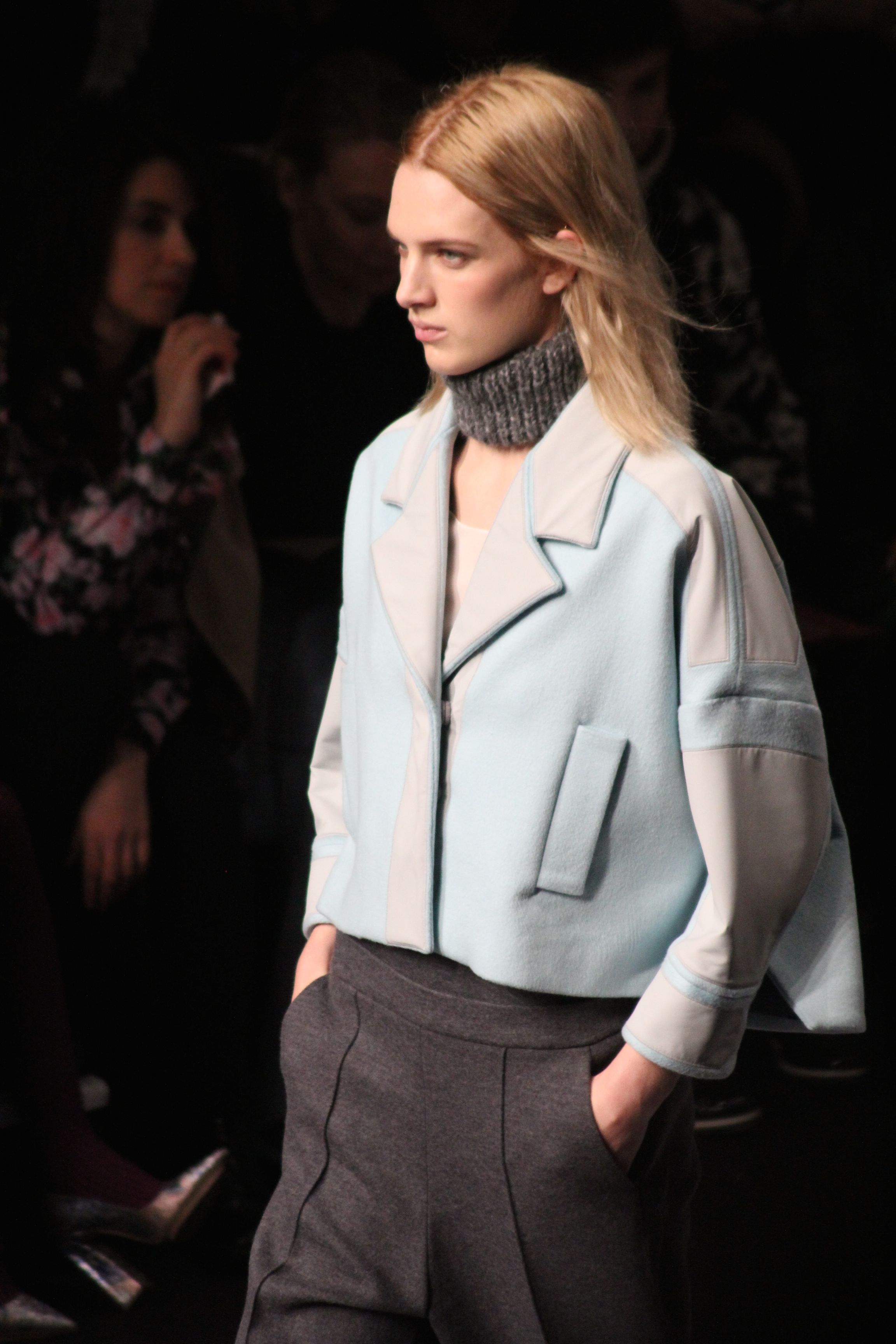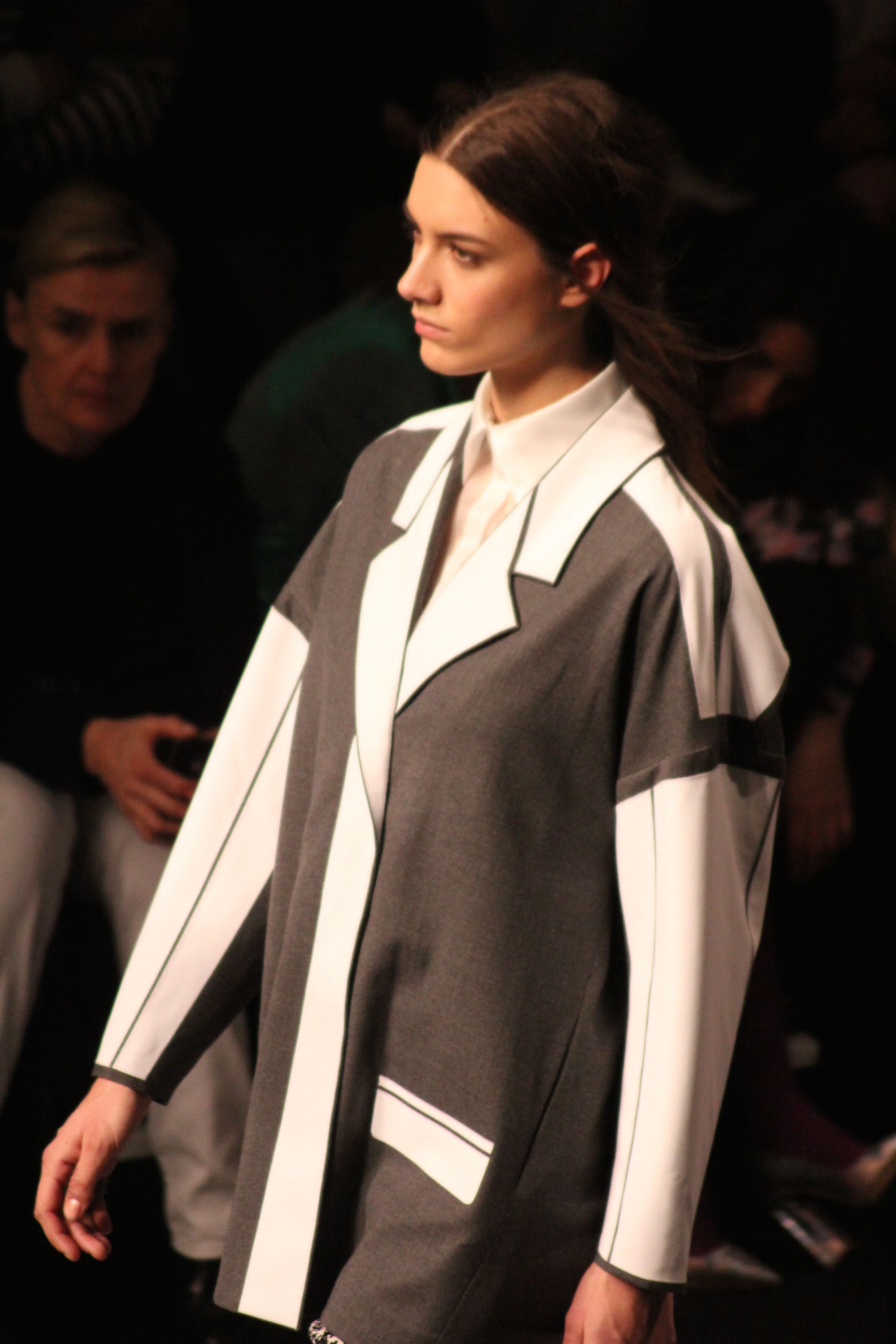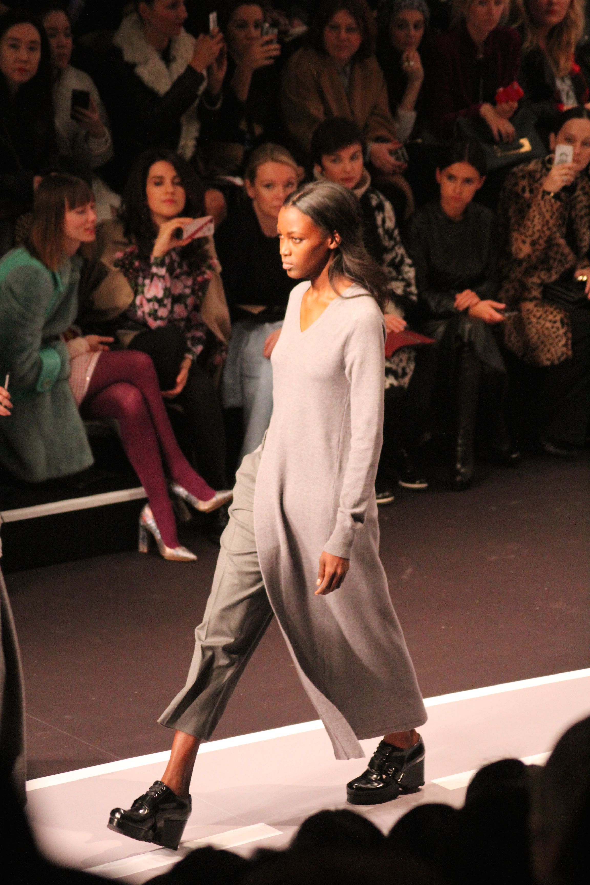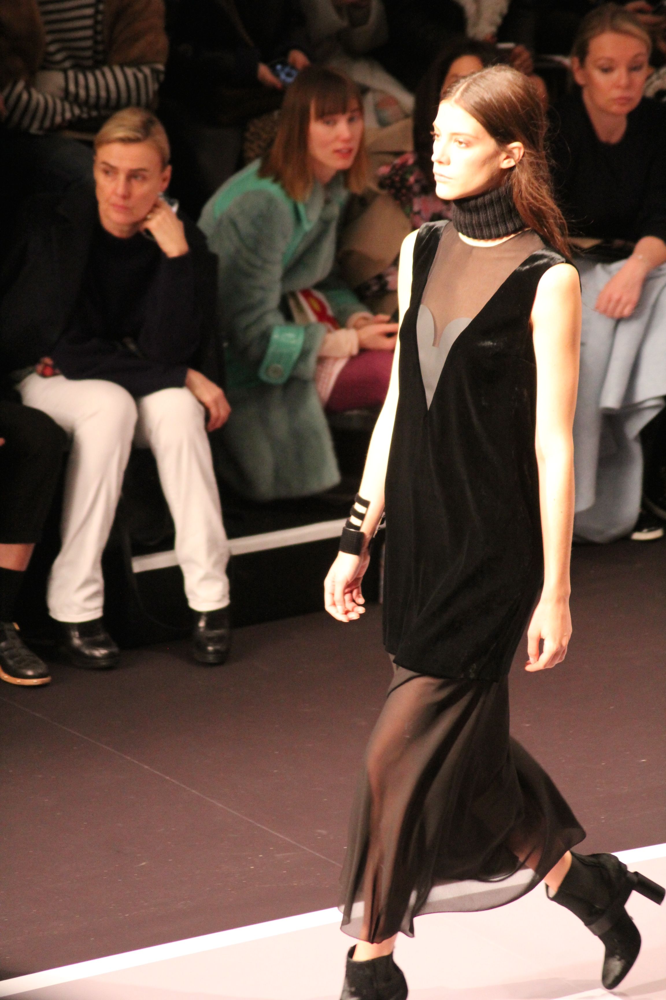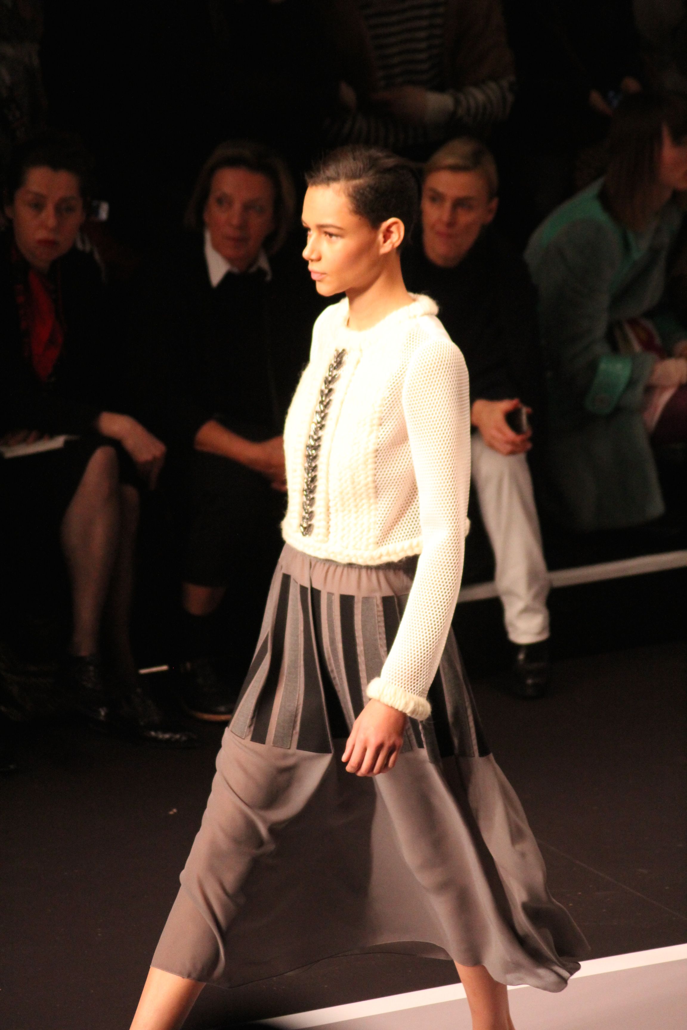 Le décor d’autoroute ainsi que les réverbères étaient là pour planter le décor. Joans As Police Woman jouait quand à elle la bande son de ce road trip. Le bitume inspire donc la mode, les gris omniprésents, le noir et le blanc.