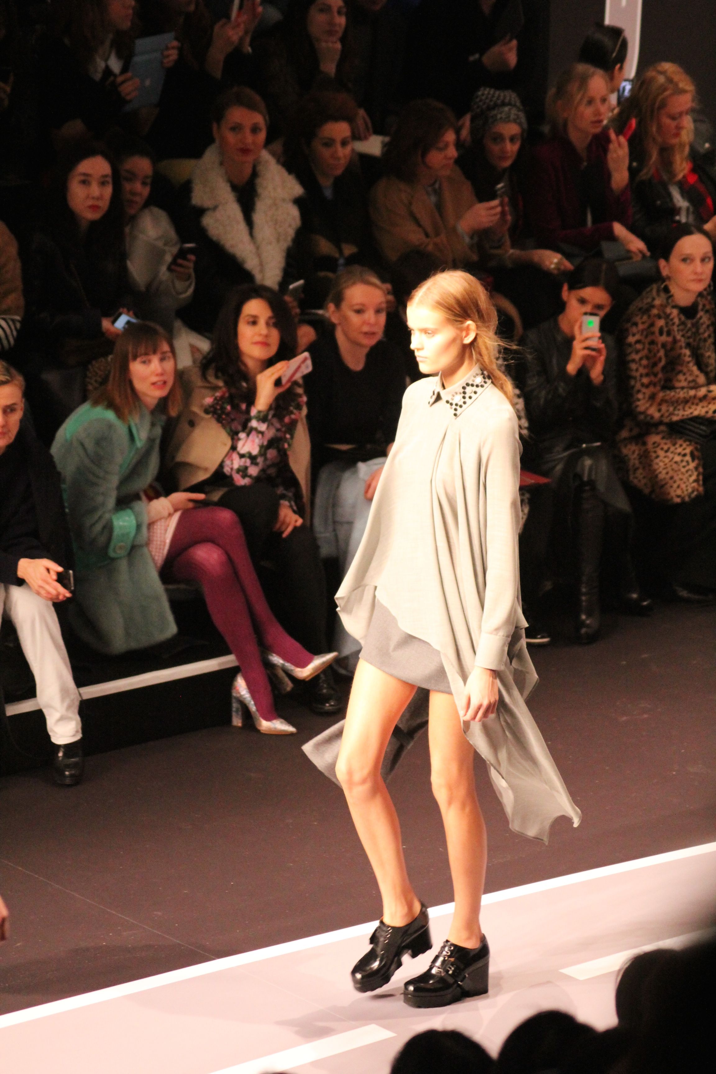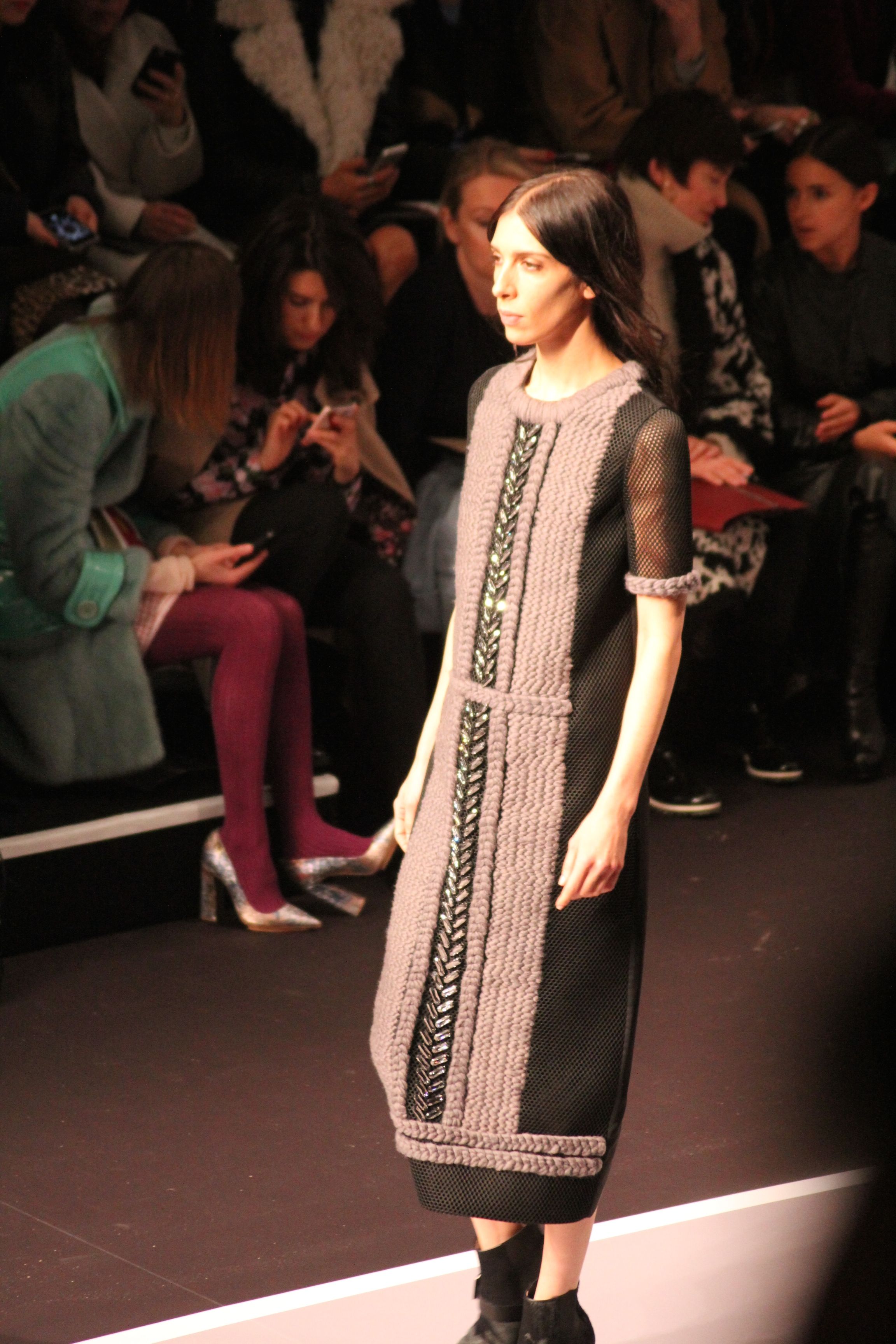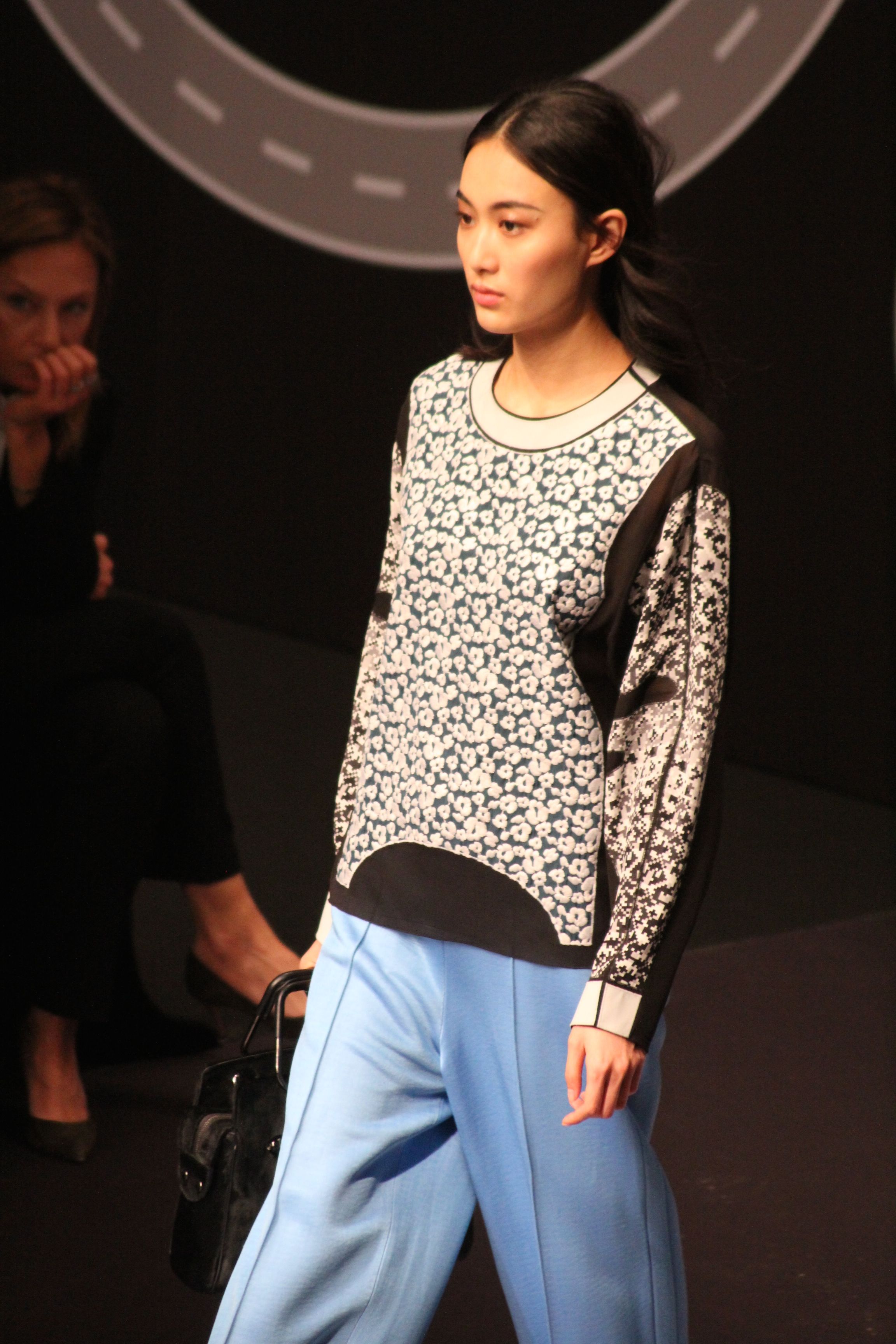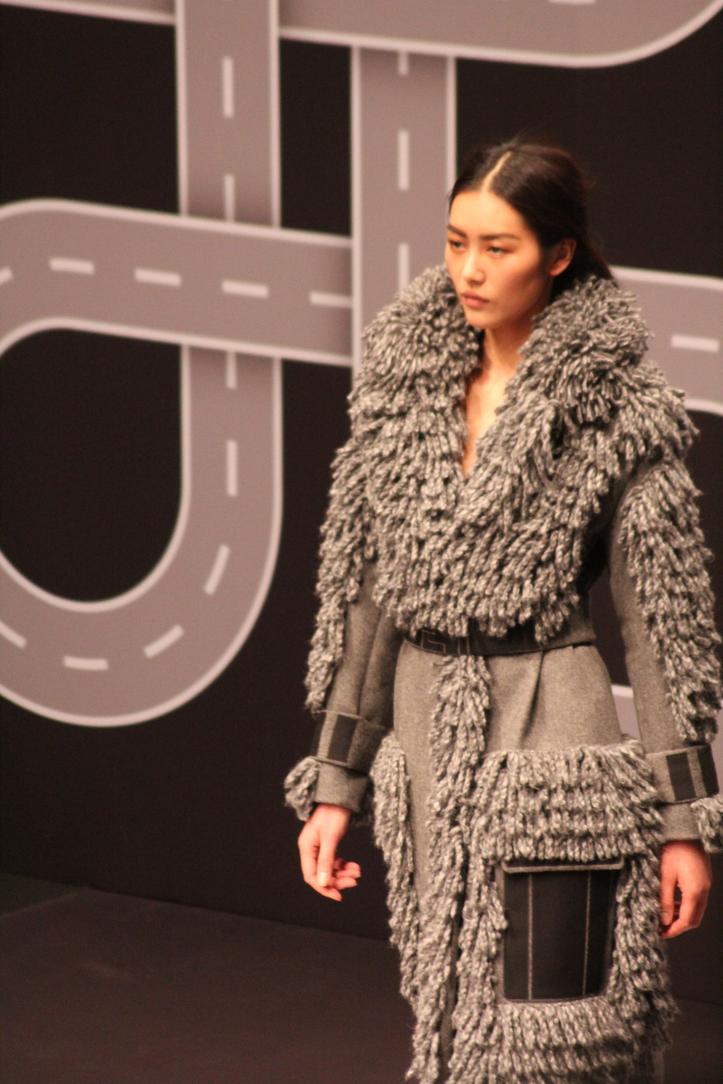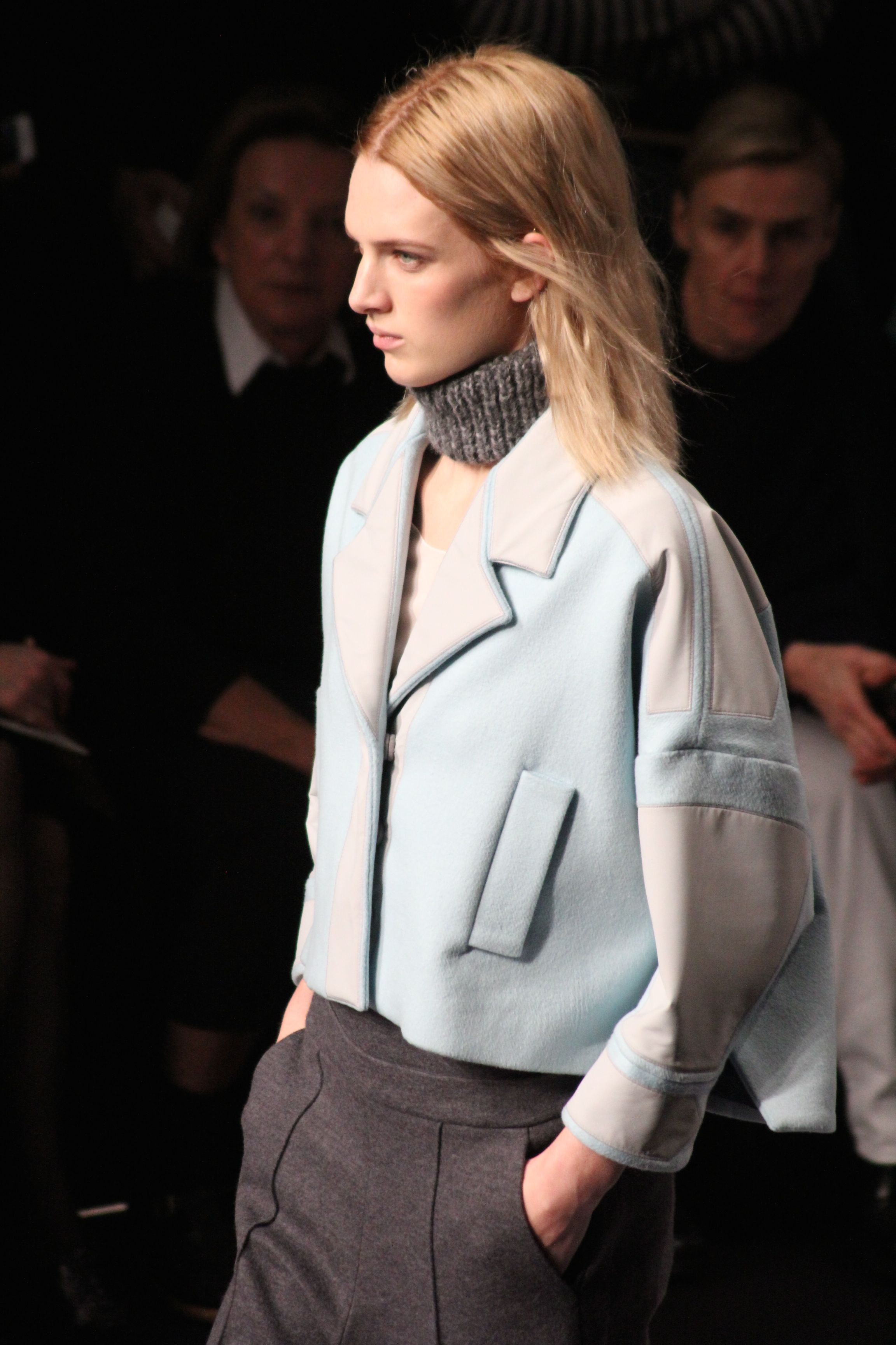 Le décor d’autoroute ainsi que les réverbères étaient là pour planter le décor. Joans As Police Woman jouait quand à elle la bande son de ce road trip. Le bitume inspire donc la mode, les gris omniprésents, le noir et le blanc.