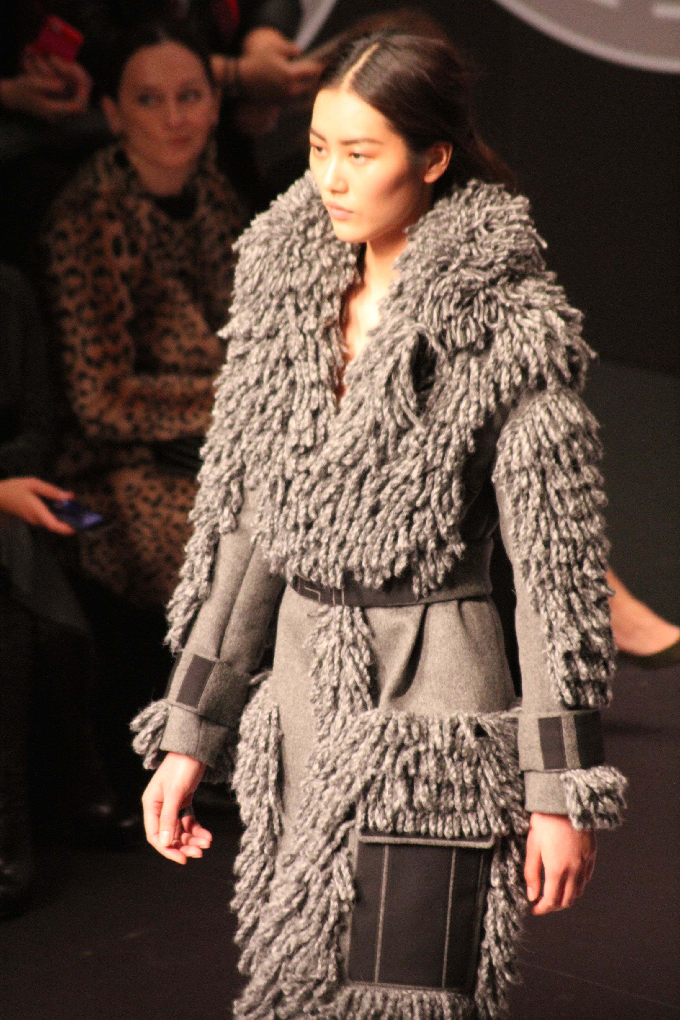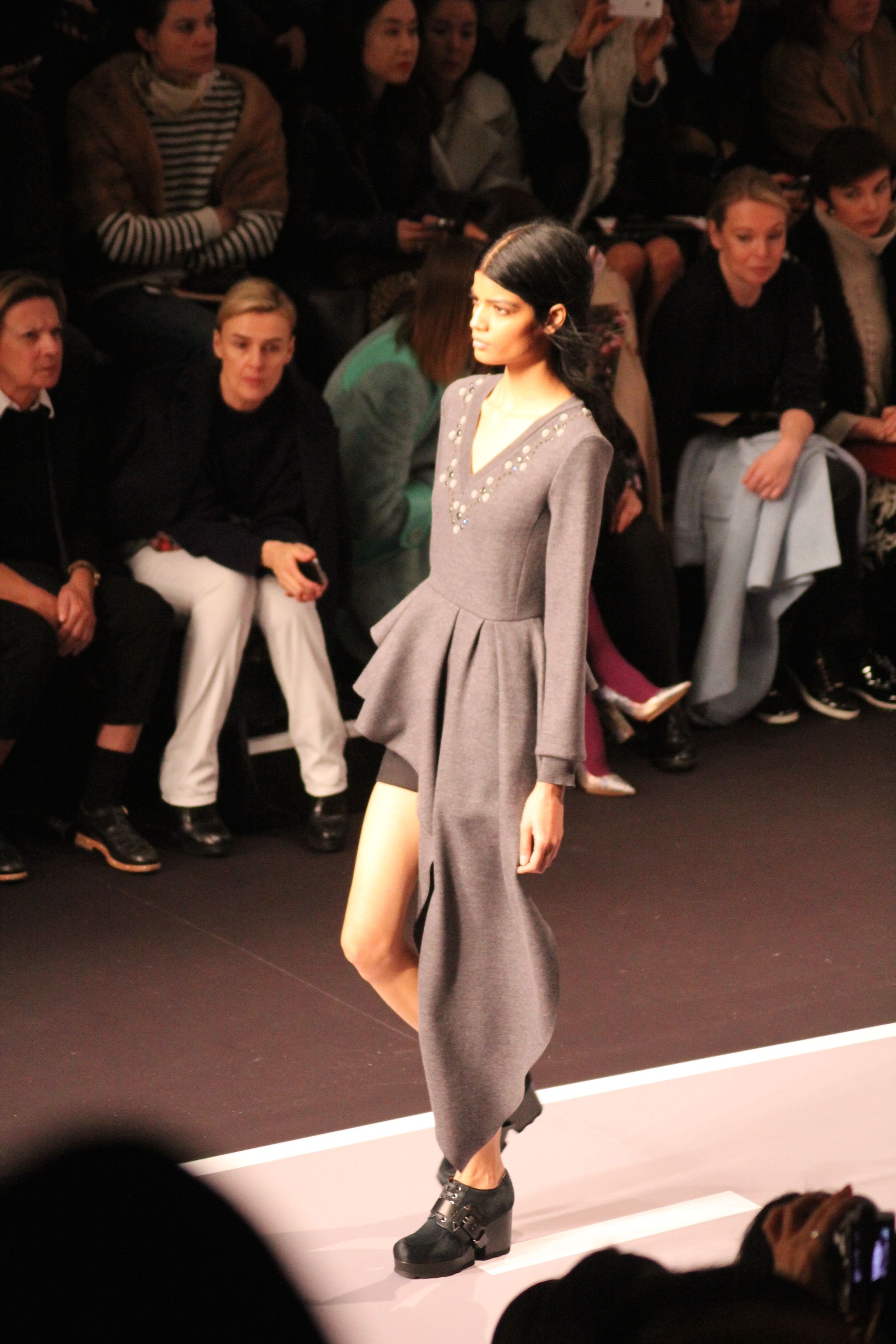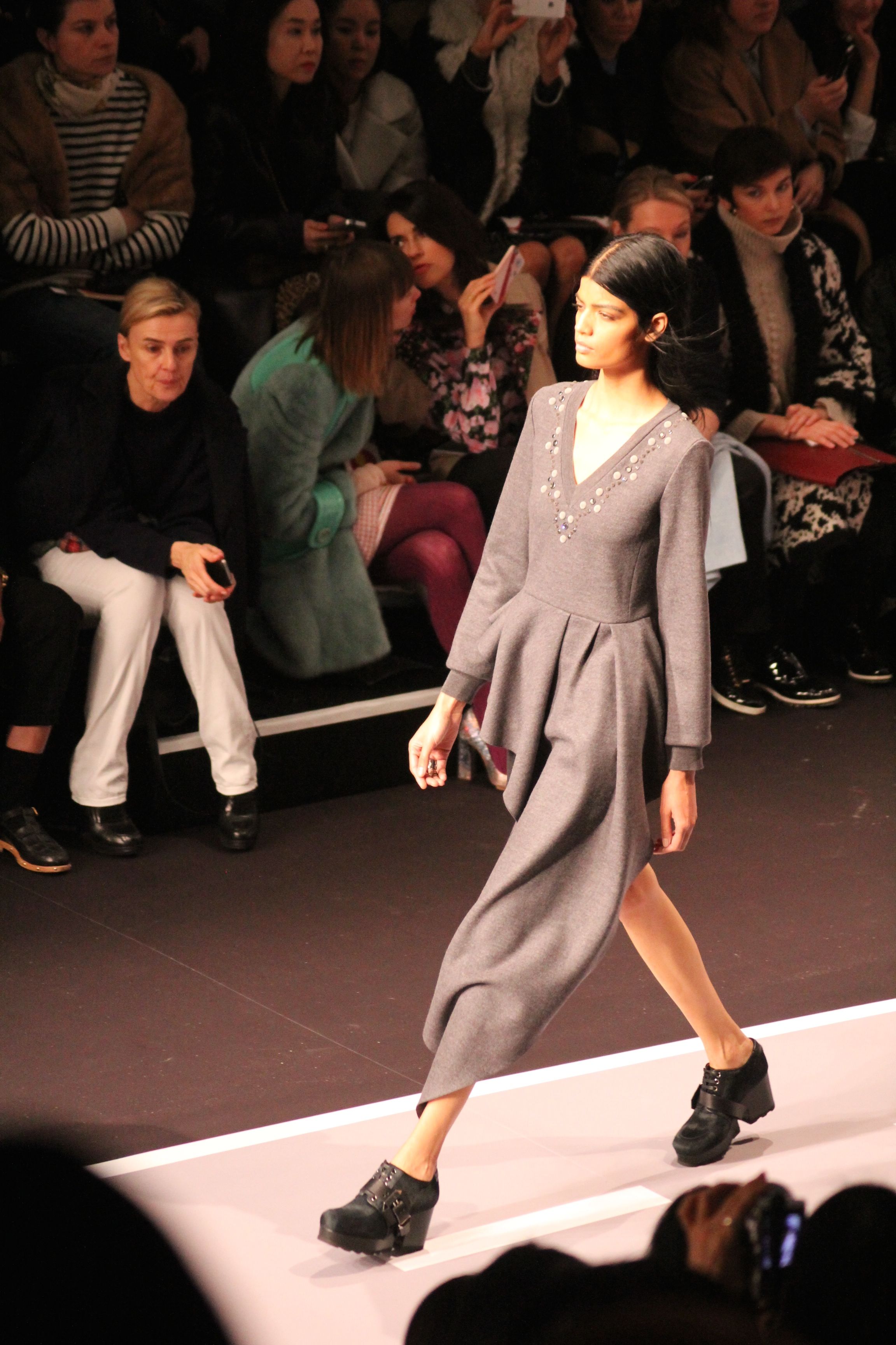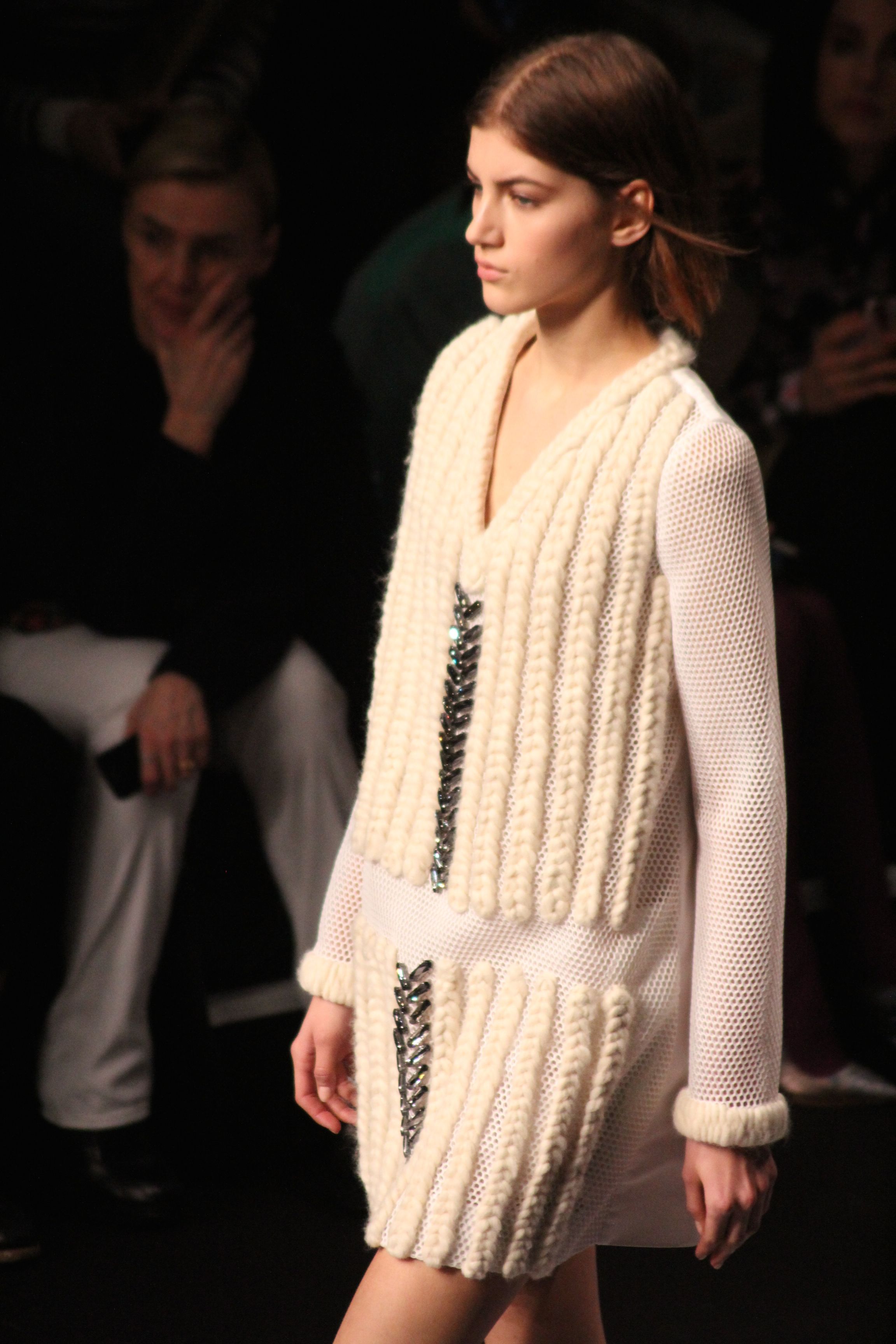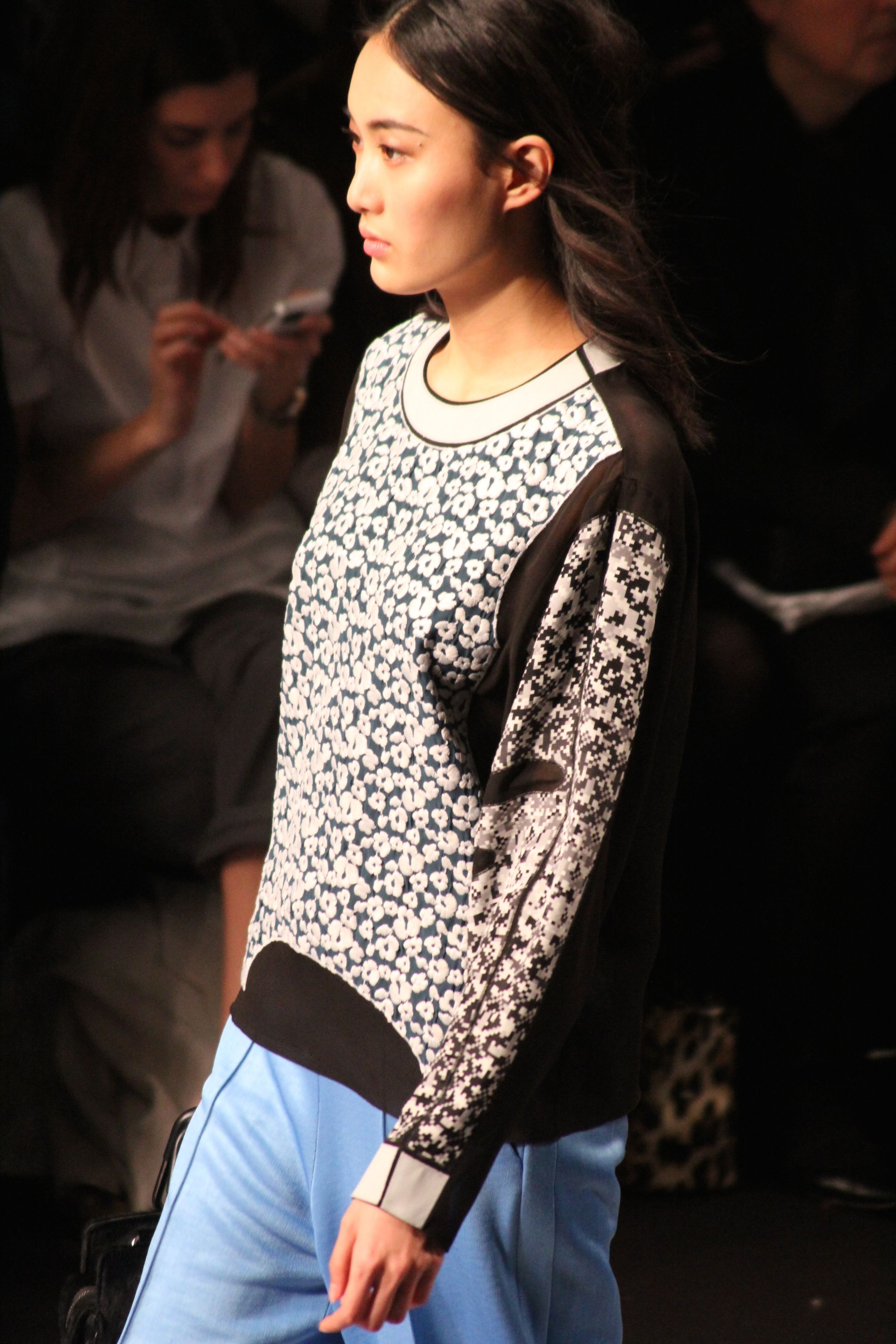 Le décor d’autoroute ainsi que les réverbères étaient là pour planter le décor. Joans As Police Woman jouait quand à elle la bande son de ce road trip. Le bitume inspire donc la mode, les gris omniprésents, le noir et le blanc.