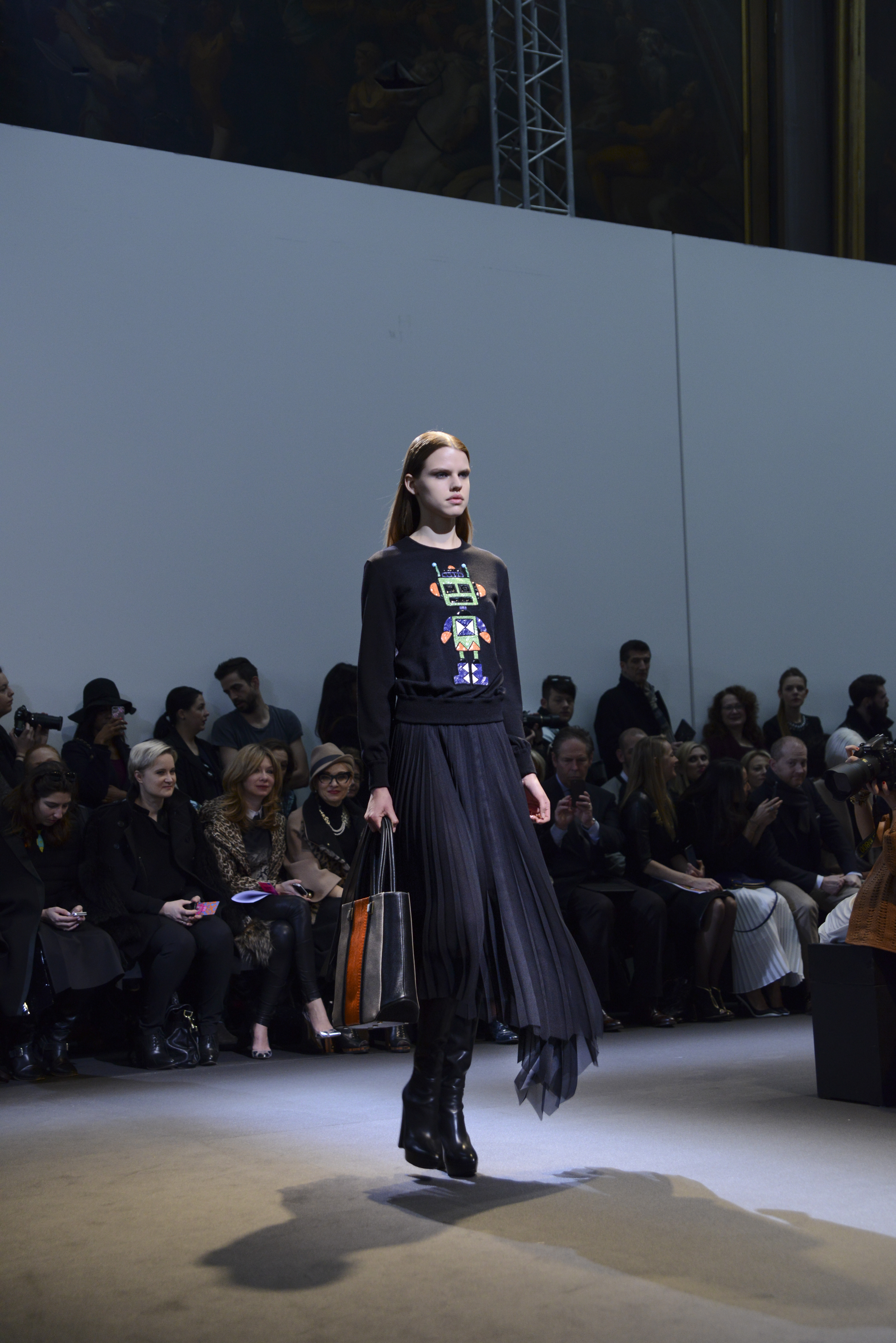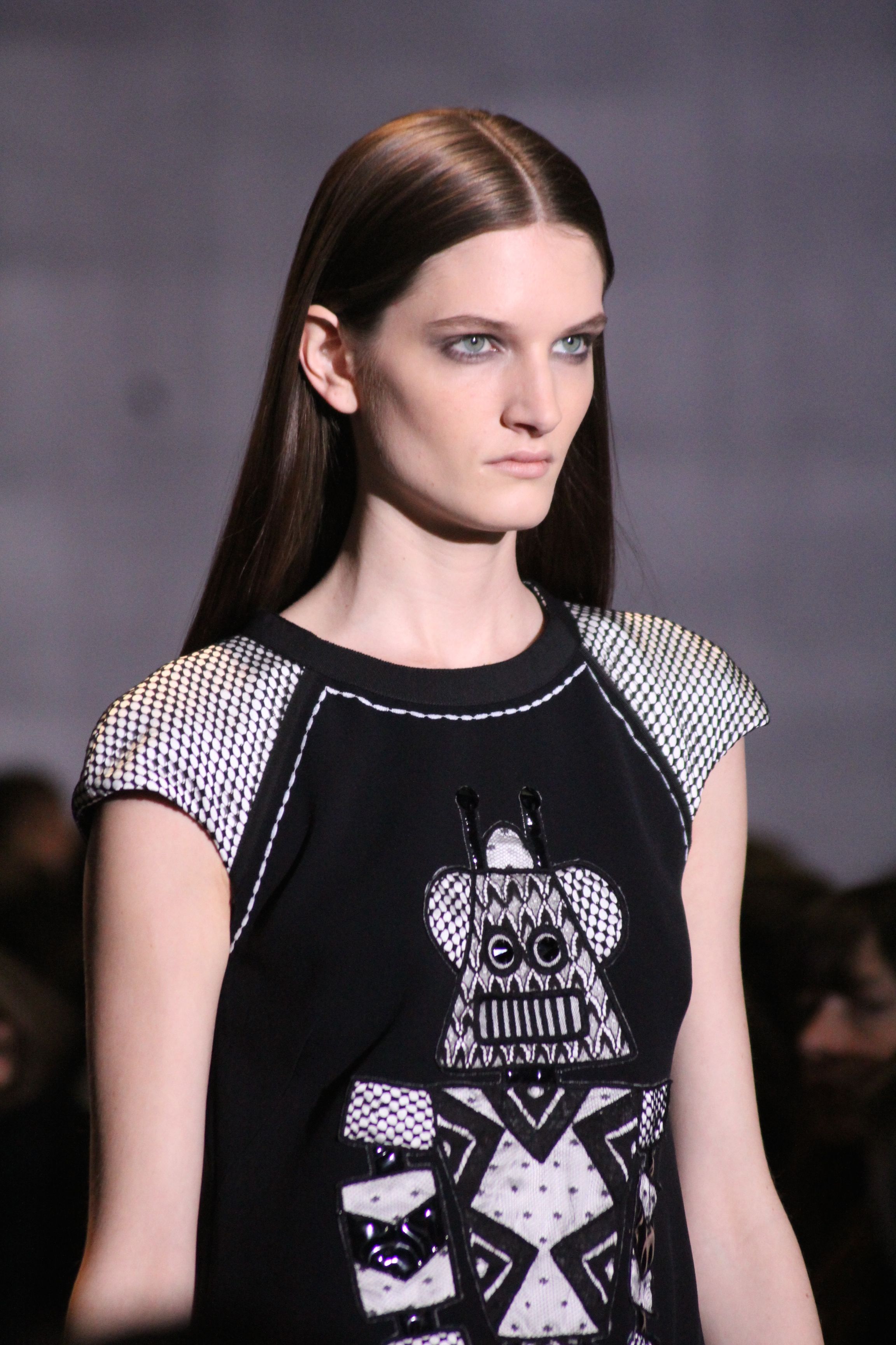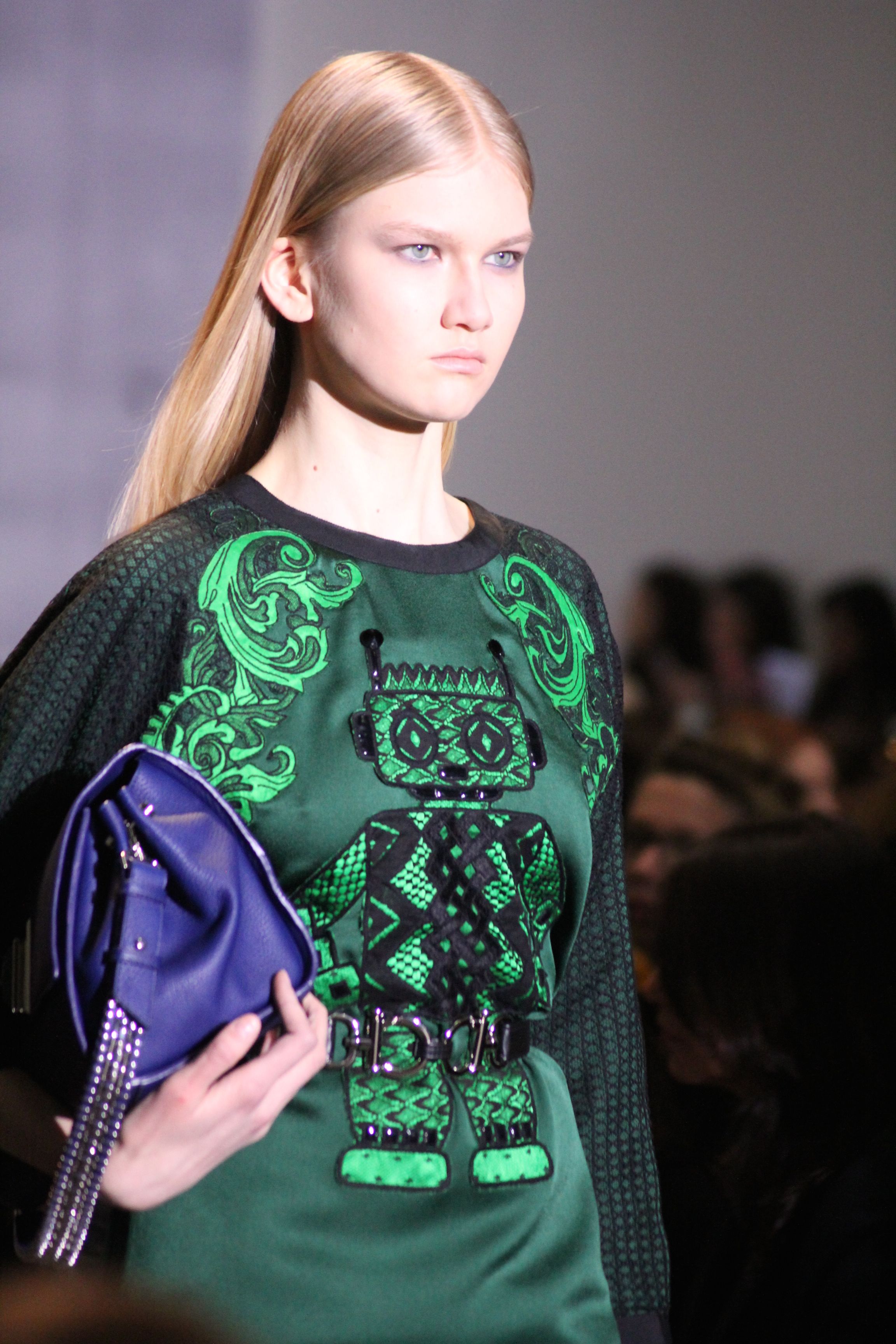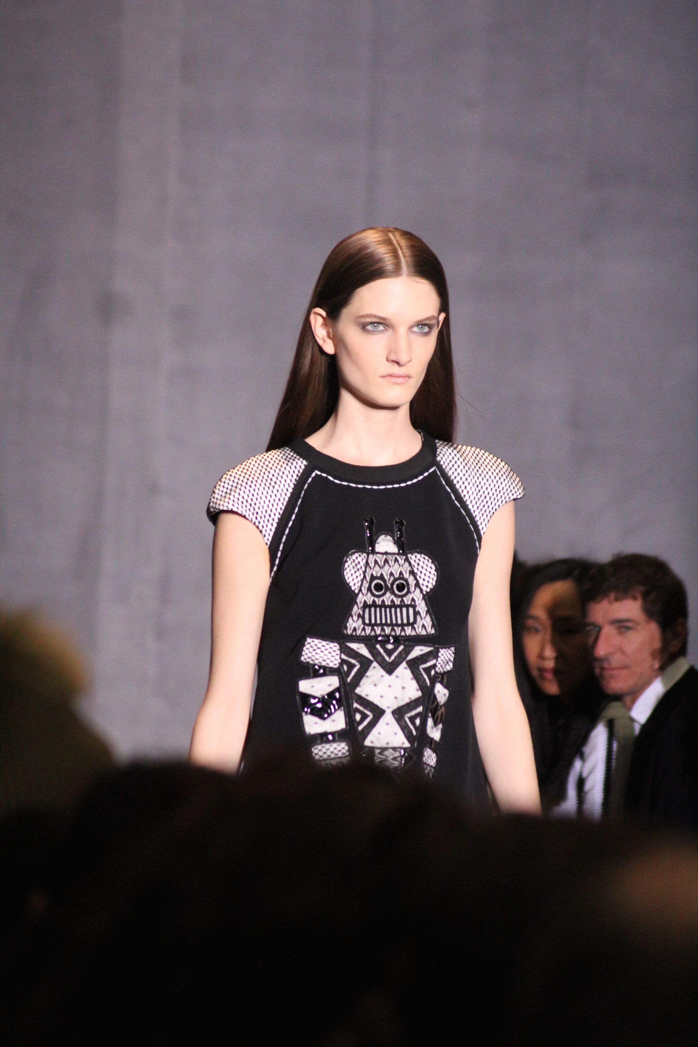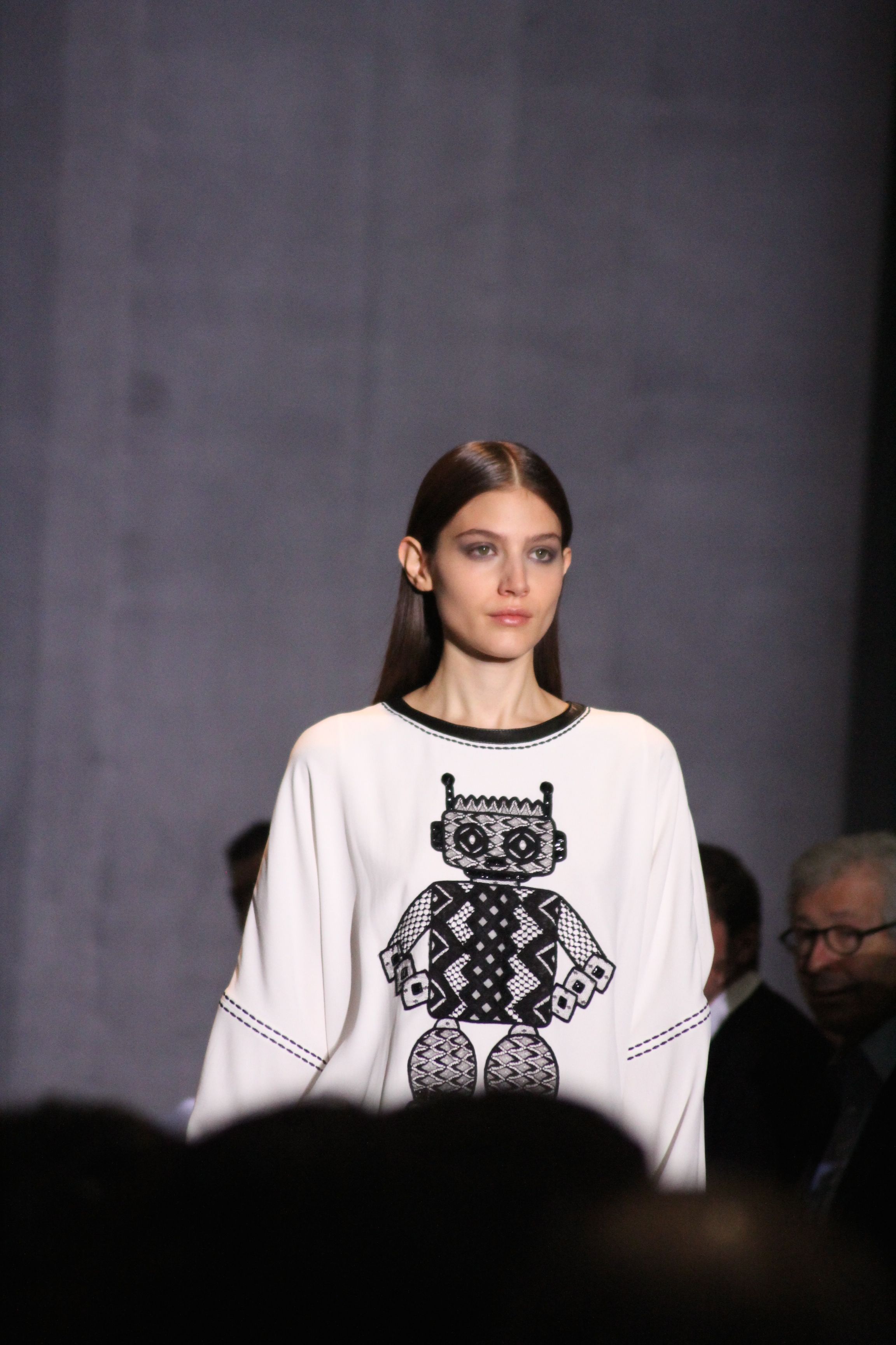Andrew Gn nous surprend avec cette « good robot collection » excentrique et graphique inspirée de l’univers de Yayoi Kusama et Tina Chow. On retrouve donc une collection bigarrée, colorée, aux imprimés graphiques et ces fameux robots. La première partie du défilé propose une femme fatale, sophistiquée peu à peu celle ci devient plus agressive avec ces couleurs flash avant de devenir robotique et psychédélique.
