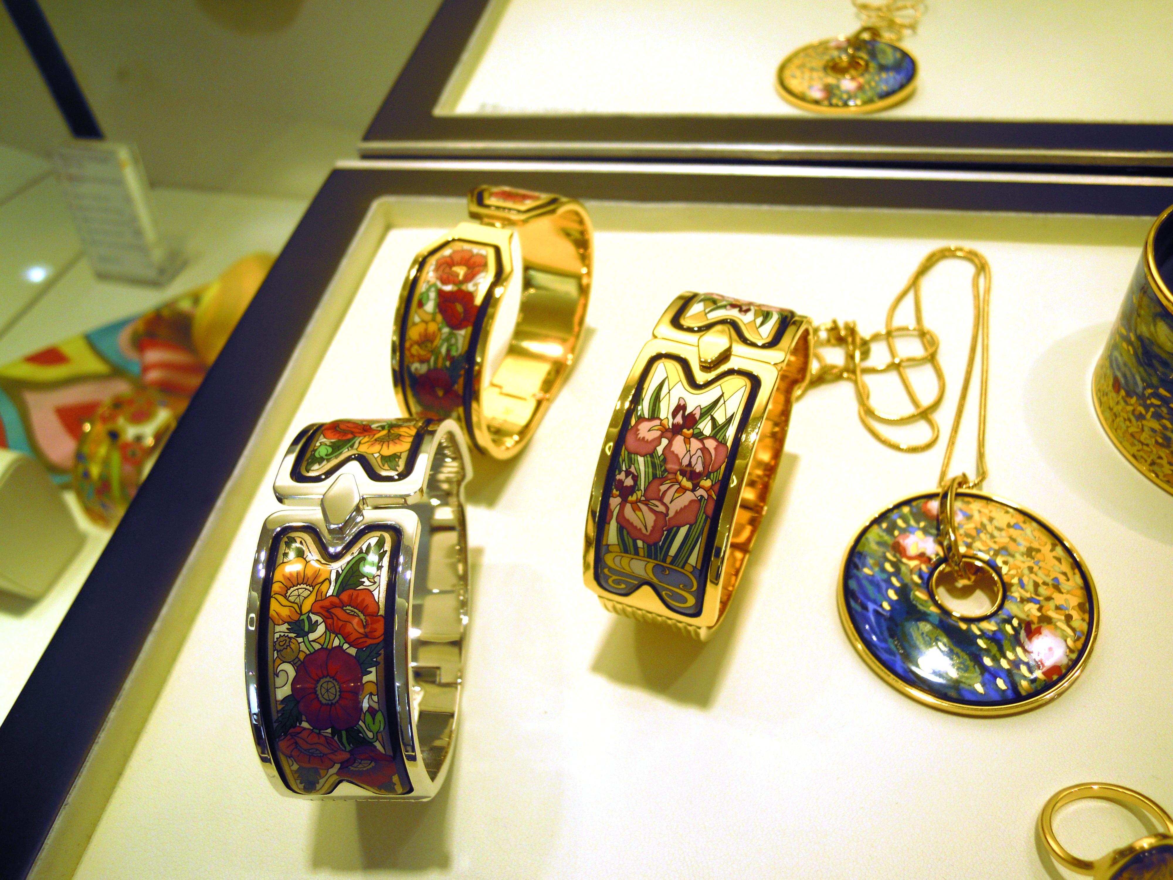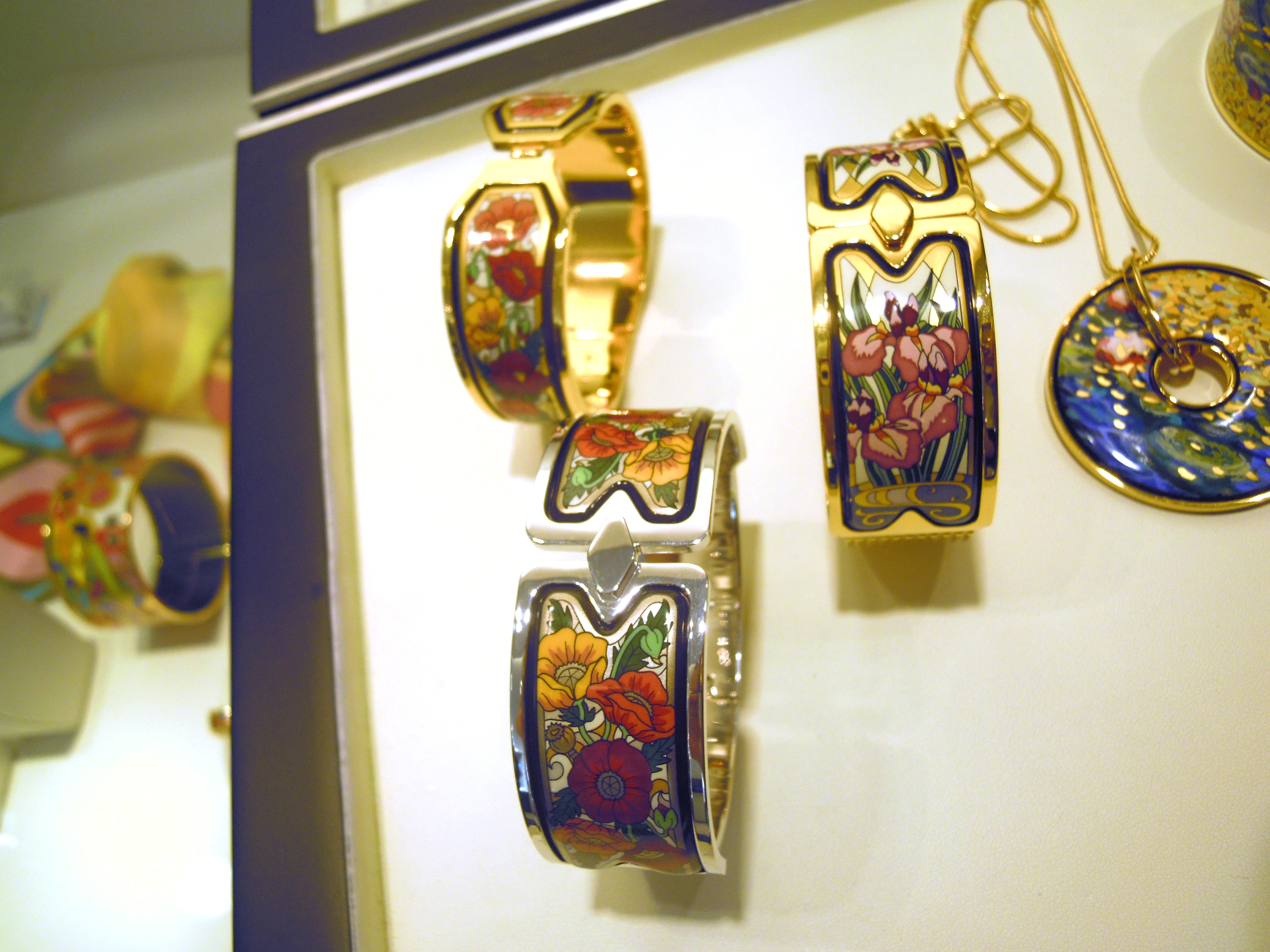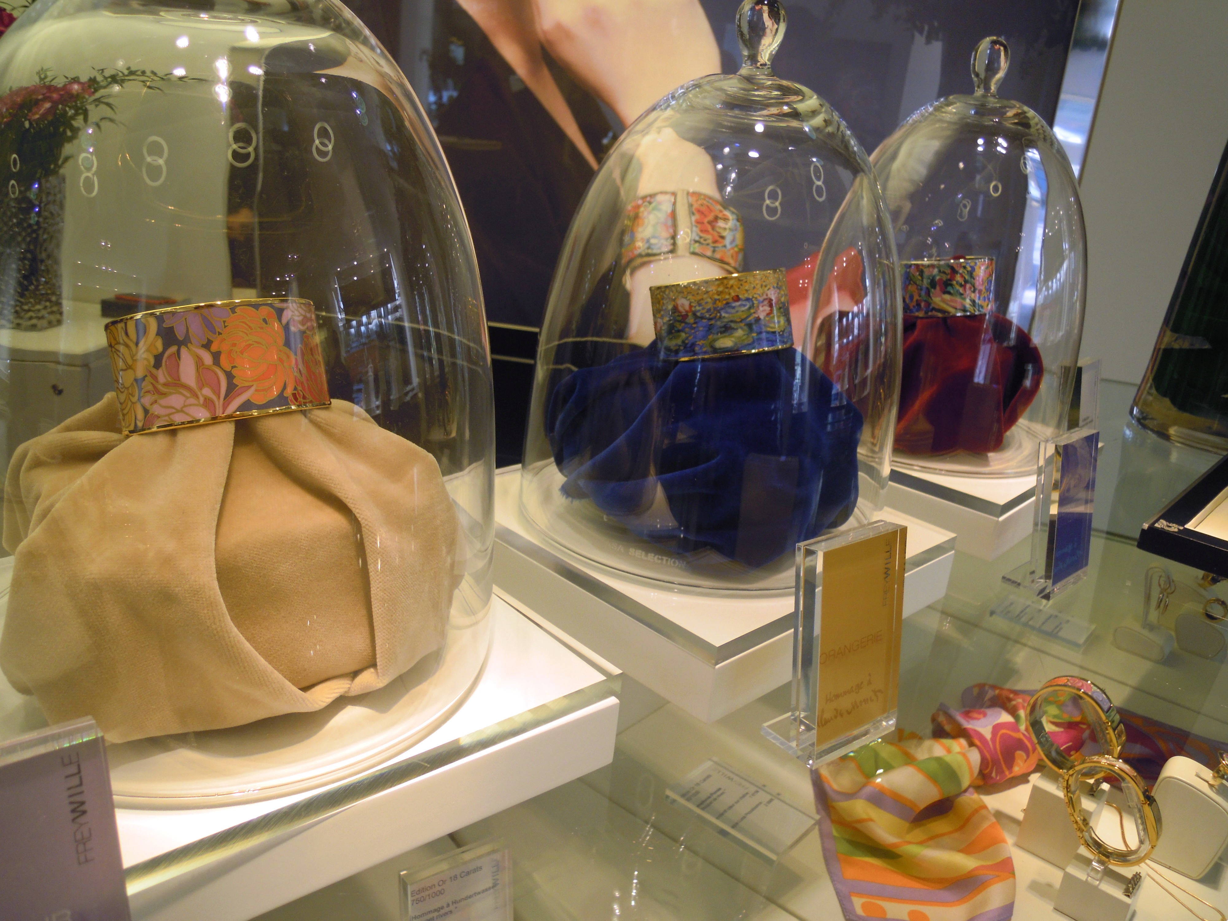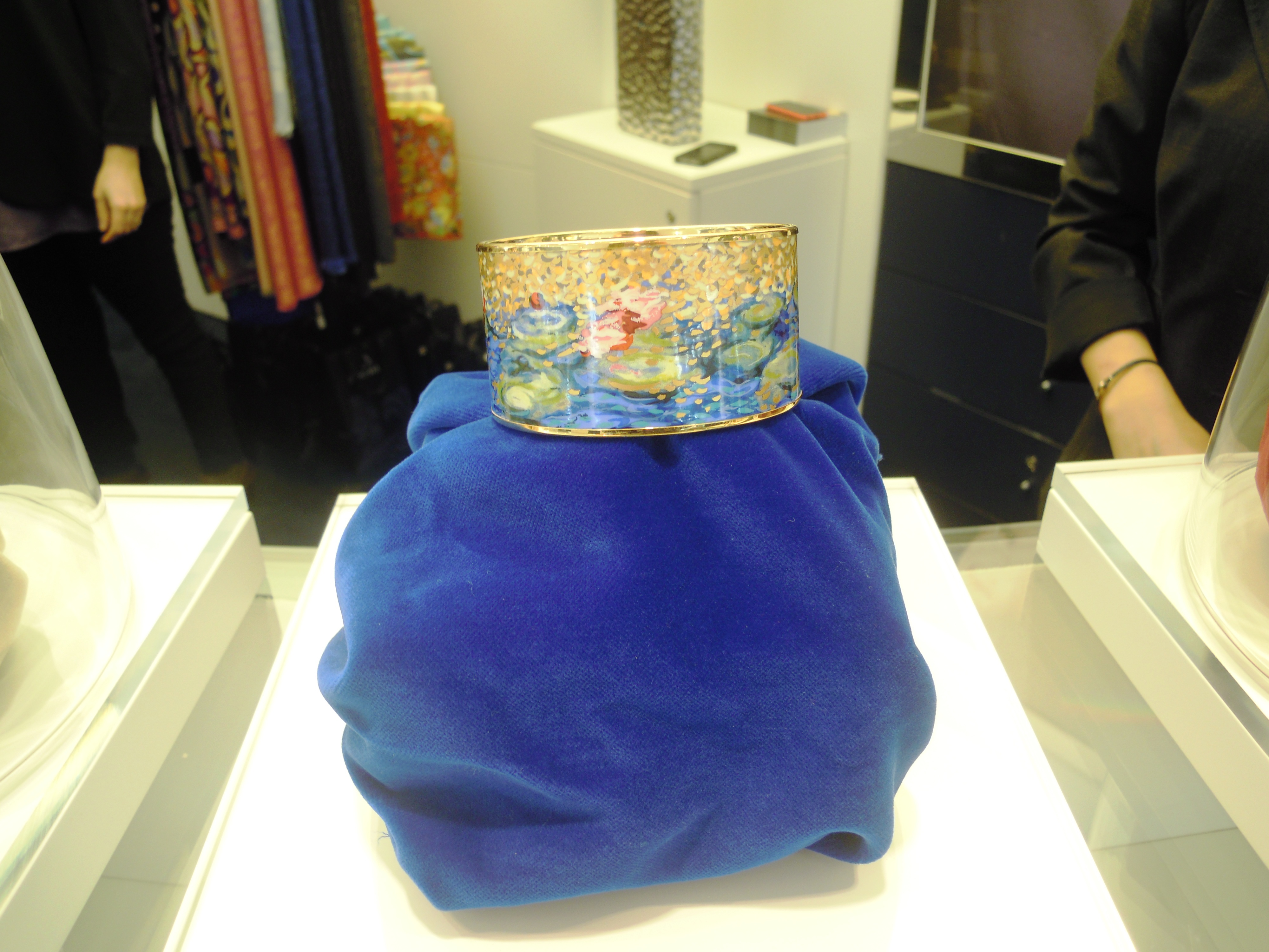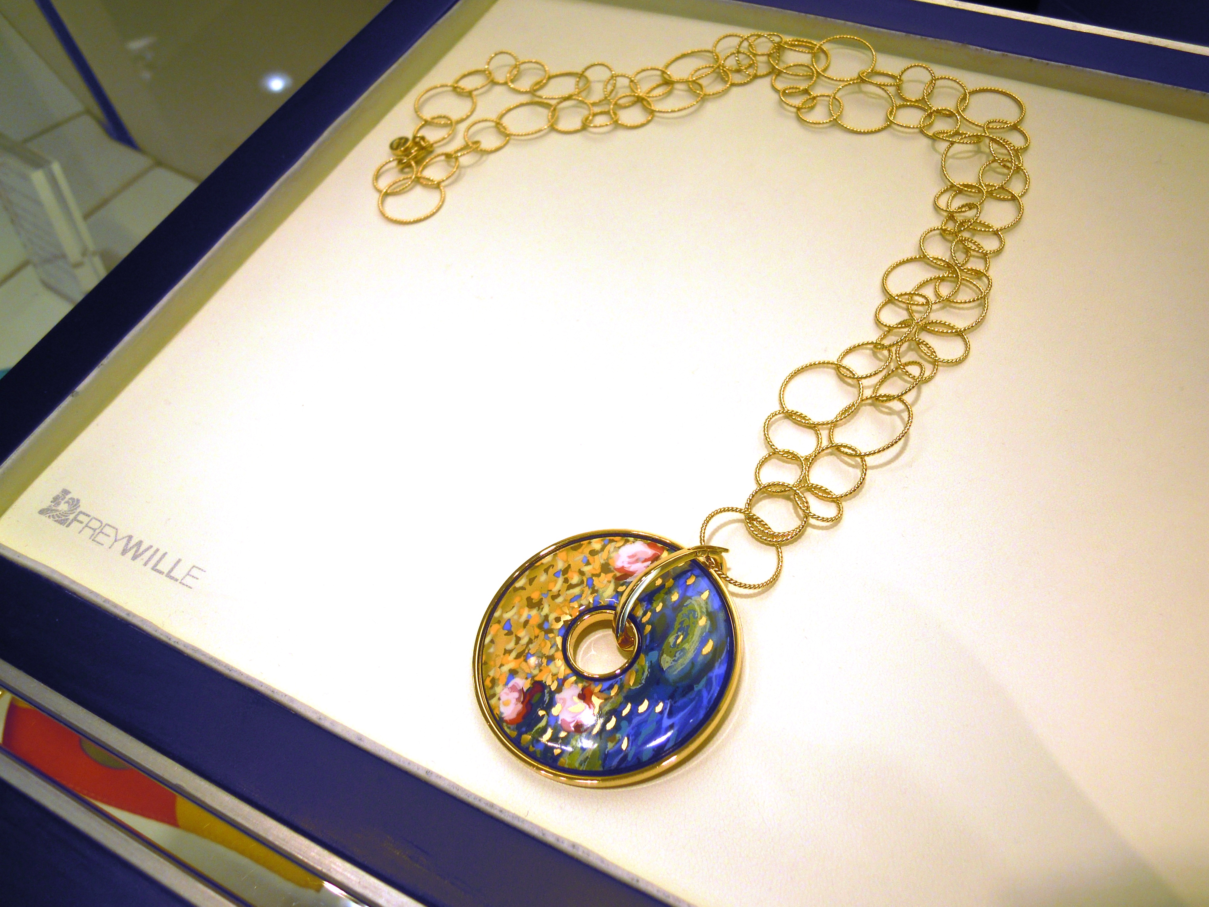 Connu pour rendre hommage, à chaque collection, aux artistes, Freywille a choisi cette fois-ci Claude Monet, le célèbre impressionniste. Le travail de l’émail est très précis et minutieux ; les couleurs sont vives et éclatantes. Il faut savoir que chacune des couleurs doit être dosée parfaitement pour obtenir le bon rendu après la cuisson de l’émail. Cet hommage se décline en 3 sets déclinés en boucles d’oreilles, manchettes, et bagues qui sont disponibles sur demande, et qui seront en boutique dans les prochains mois. 80 étapes de fabrication sont nécessaires pour obtenir la finesse des détails : un véritable travail d’orfèvre ! Les trois manchettes se nomment Honfleur, Orangerie et Giverny ; nous vous laissons les découvrir en photos ci-dessous …