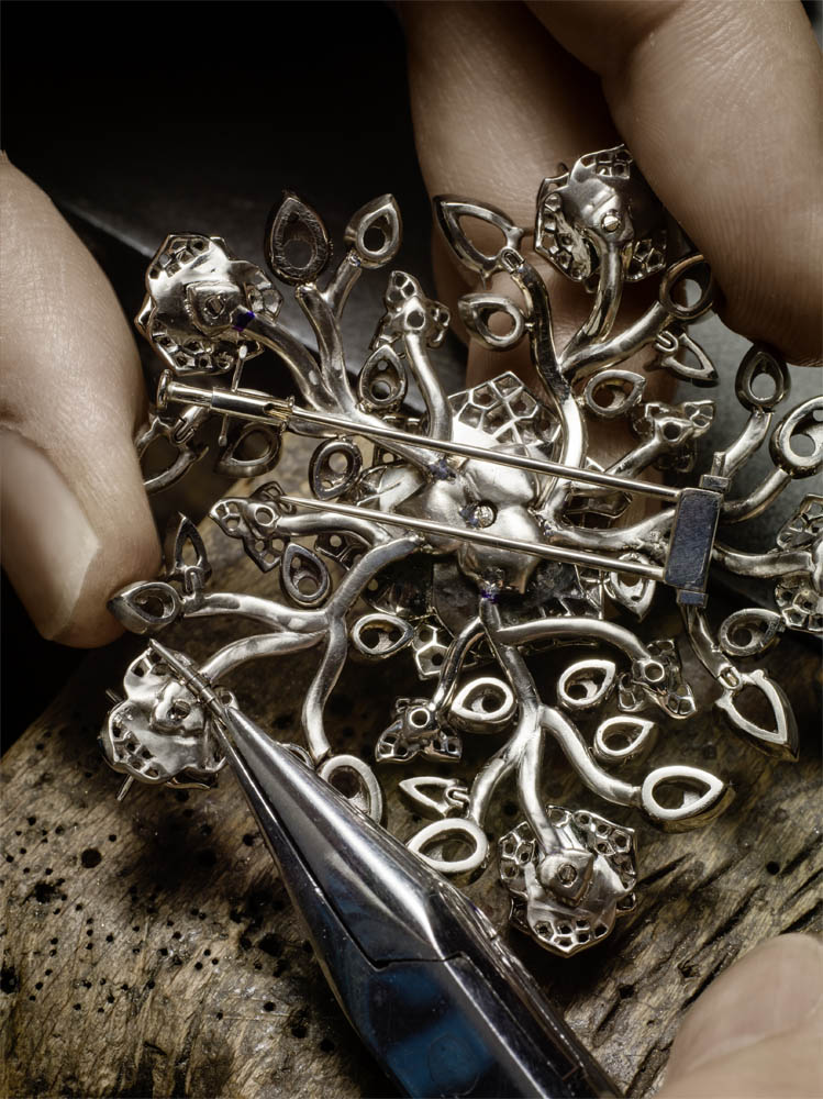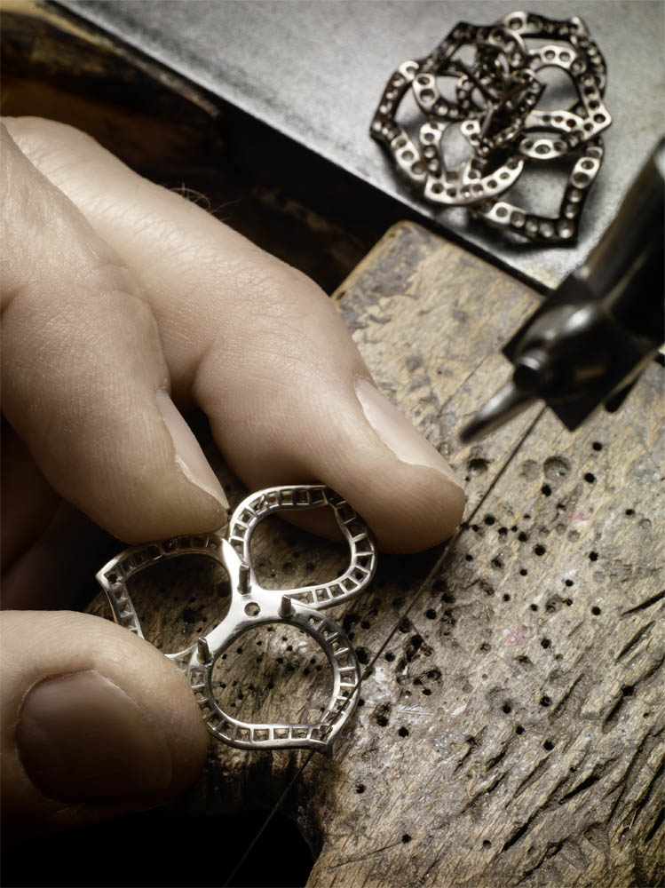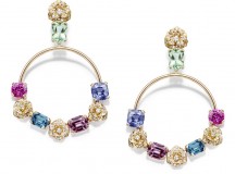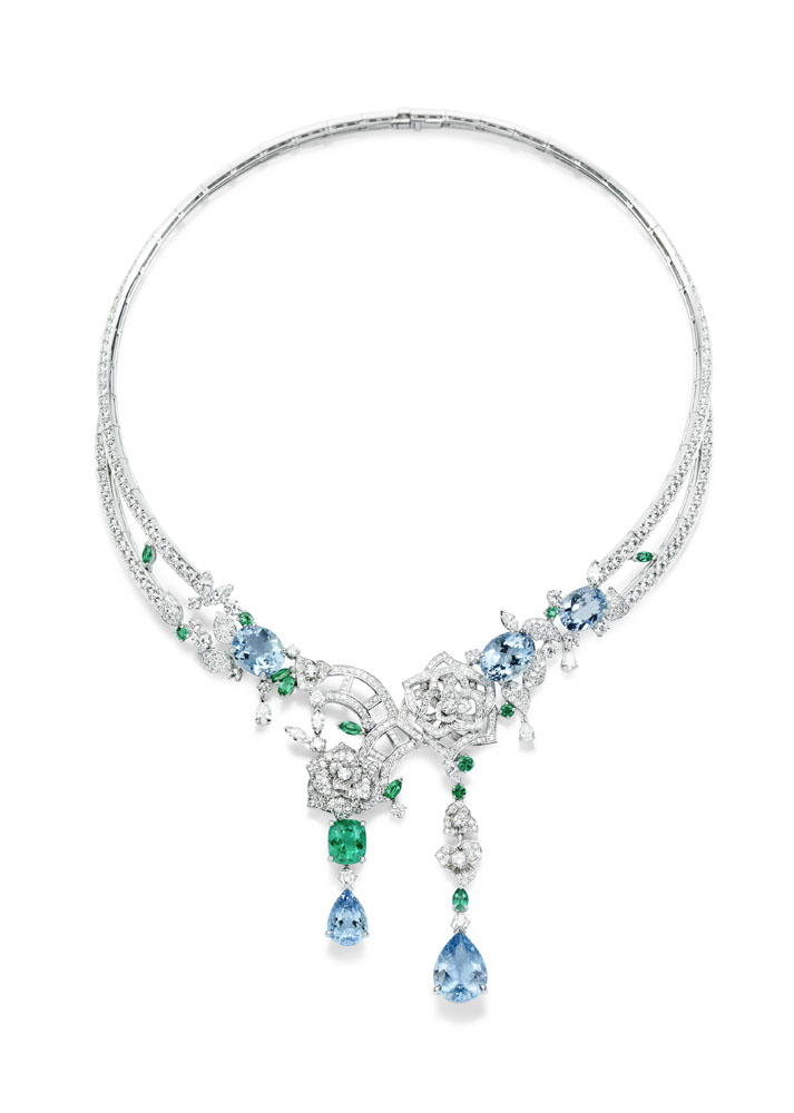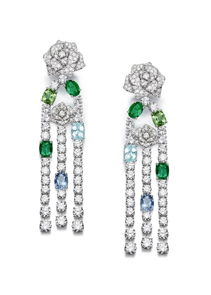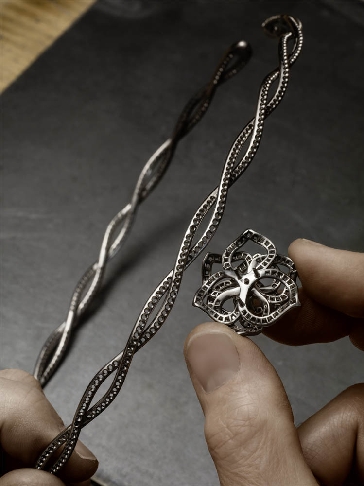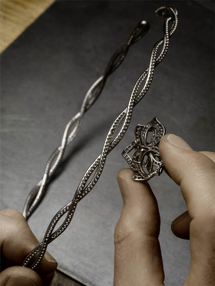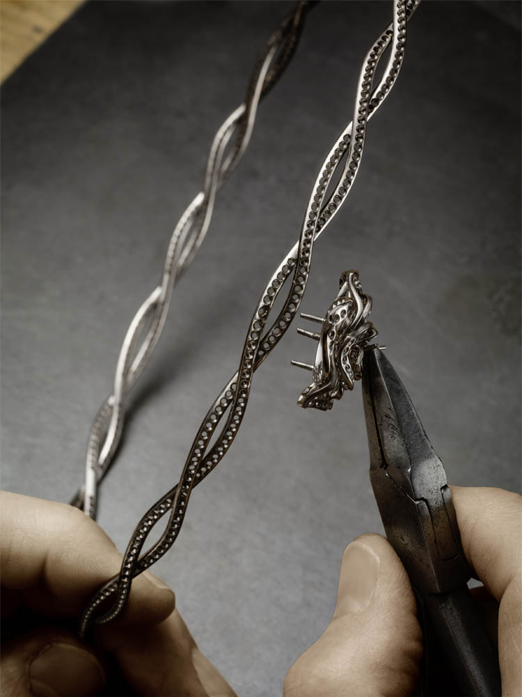 Les emmaillements précis et les chatons aux fines griffes sont fabriqués un à un à la main par les artisans joailliers de la Maison, et mettent en valeur les formes délicates et la beauté des pierres précieuses, qui épousent souplement décolletés et poignets.