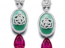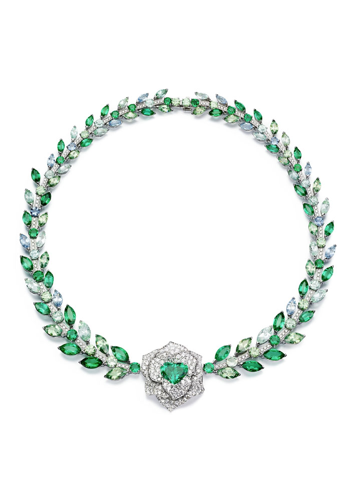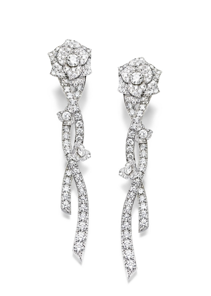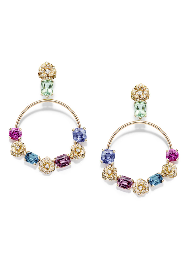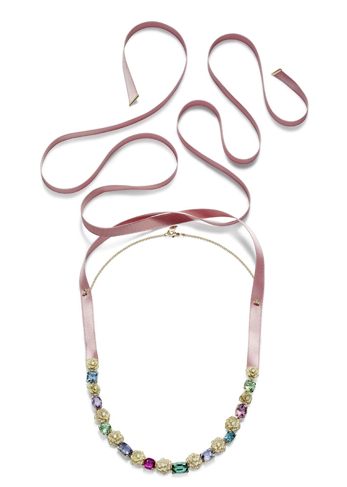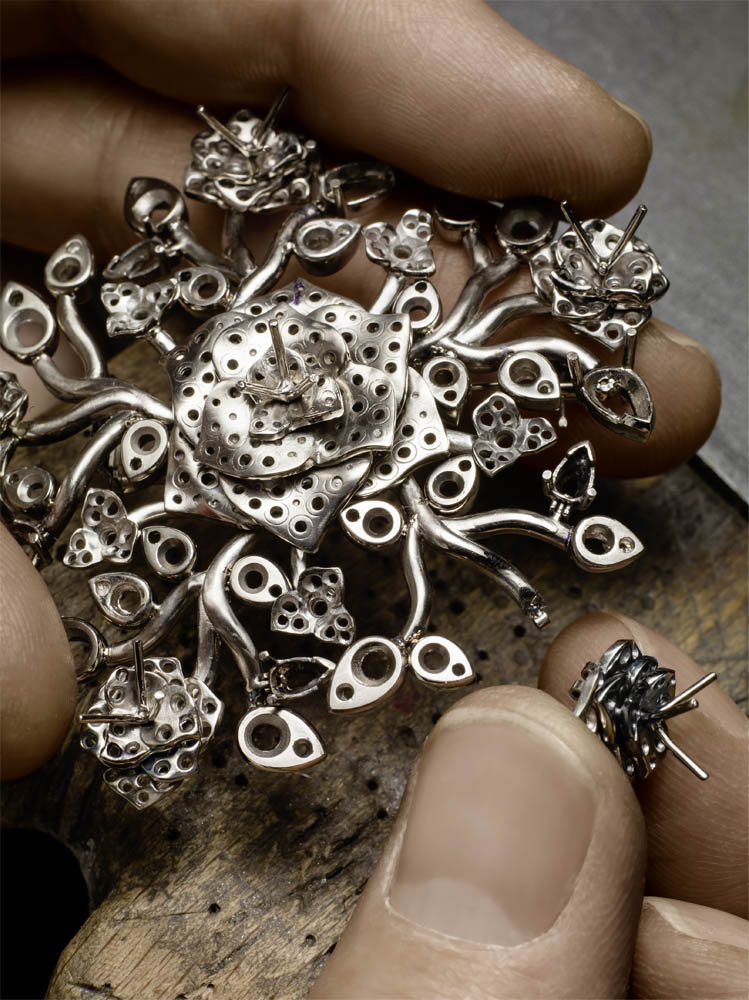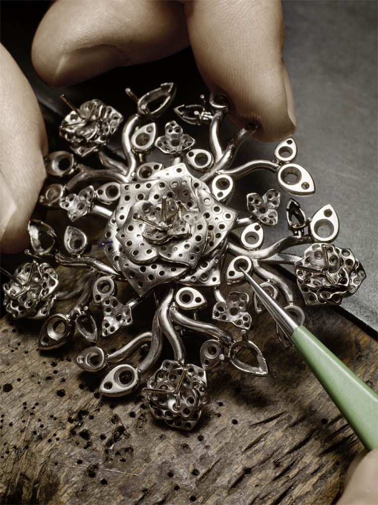 Les emmaillements précis et les chatons aux fines griffes sont fabriqués un à un à la main par les artisans joailliers de la Maison, et mettent en valeur les formes délicates et la beauté des pierres précieuses, qui épousent souplement décolletés et poignets.