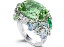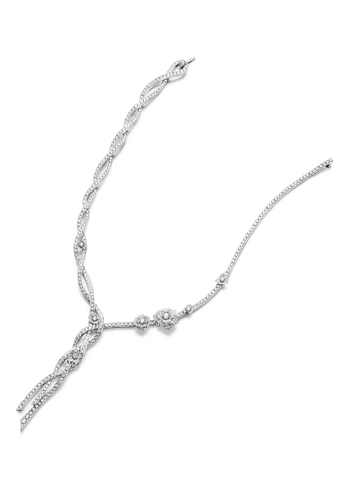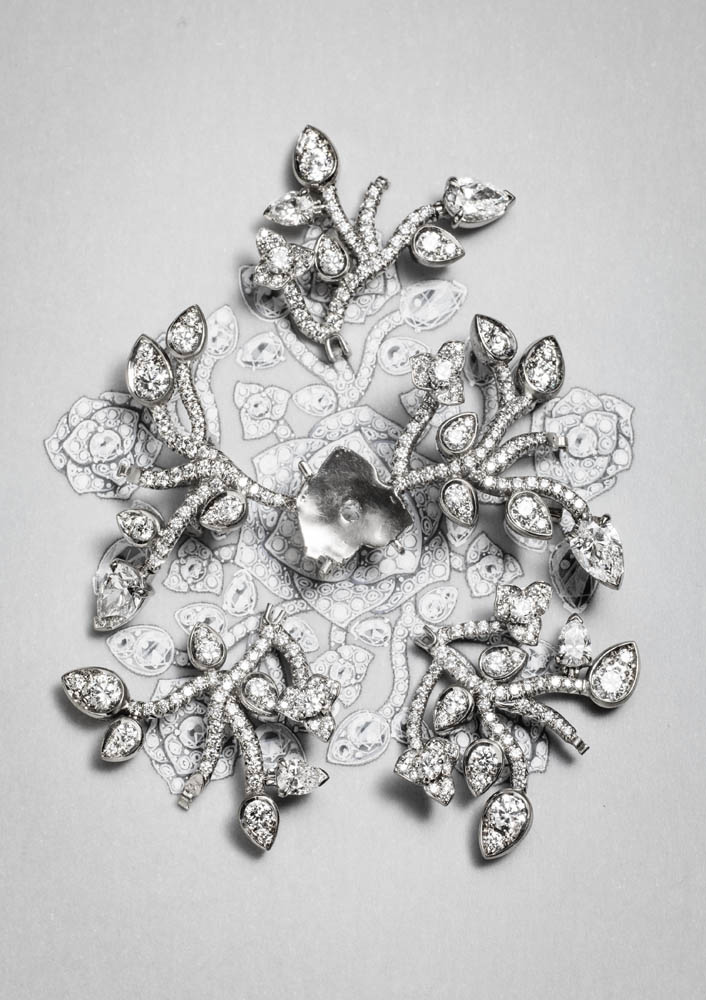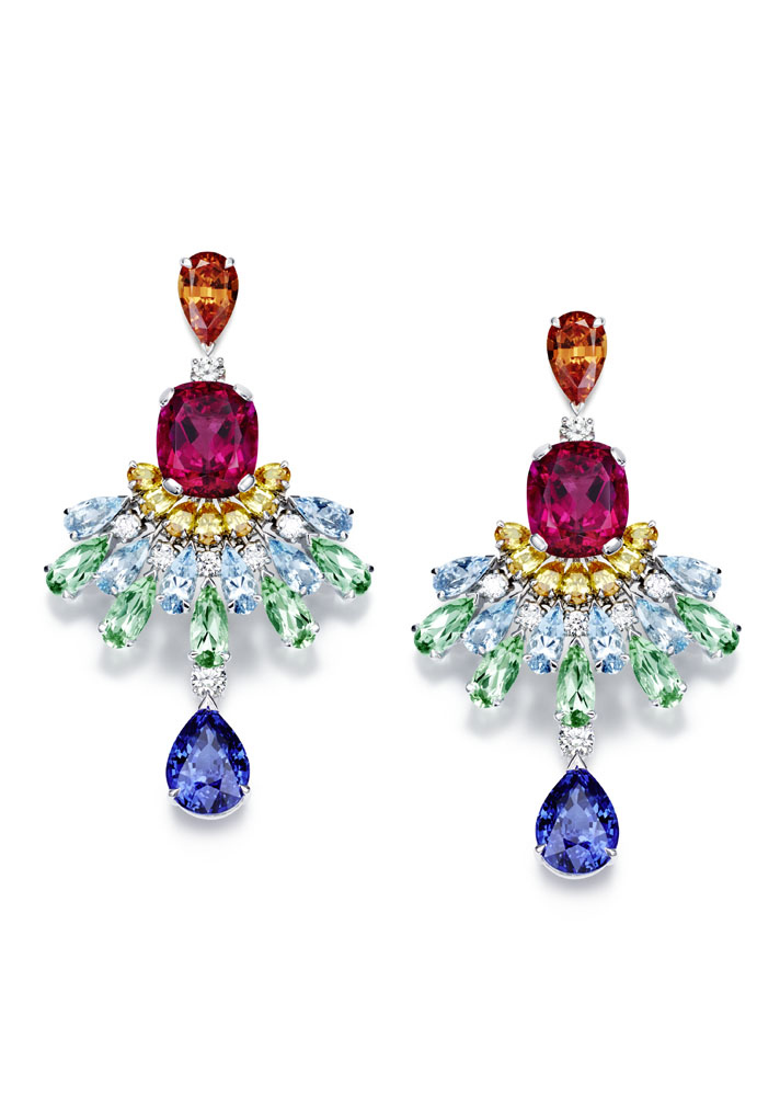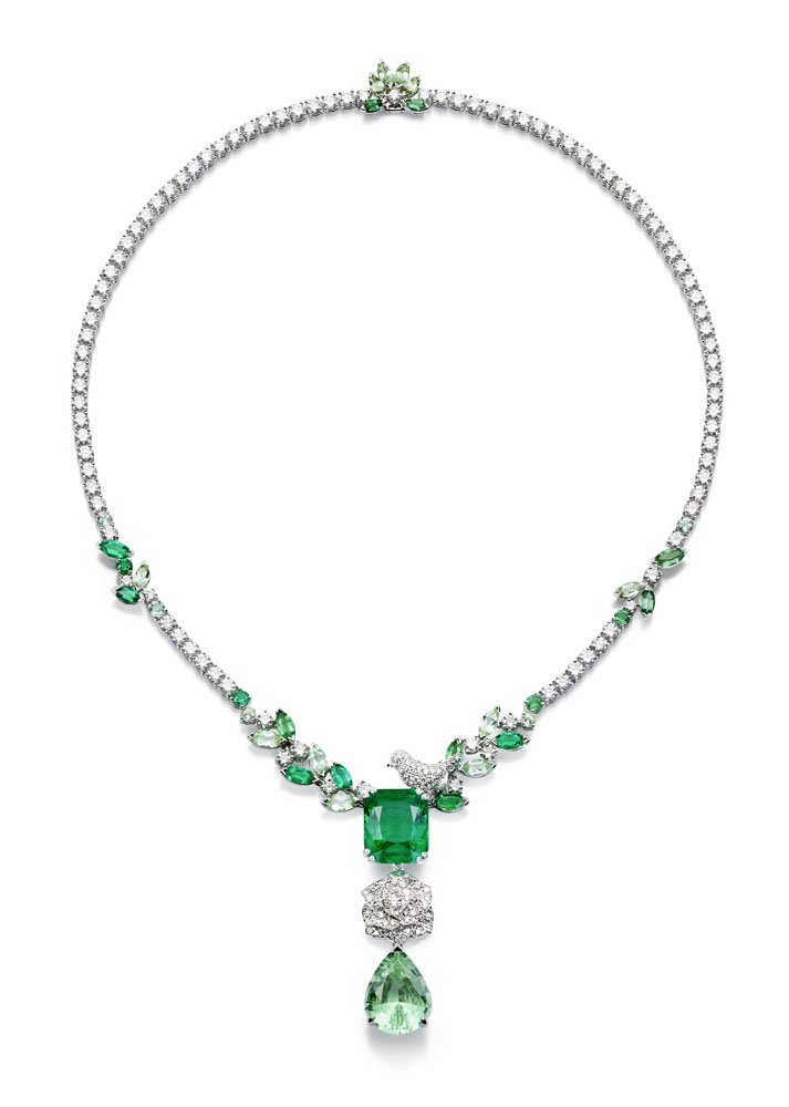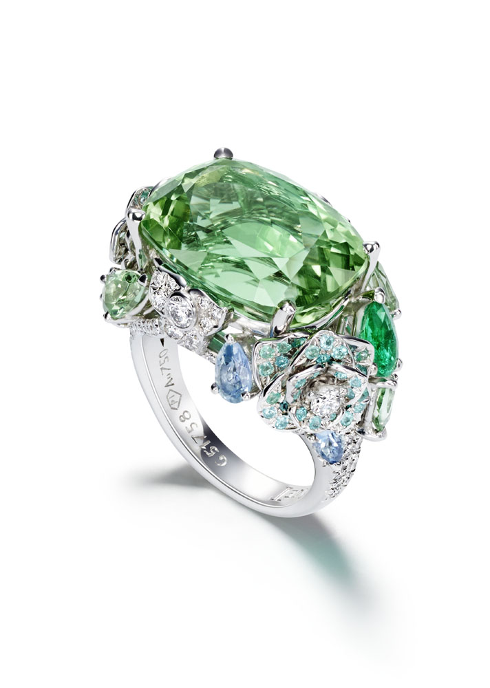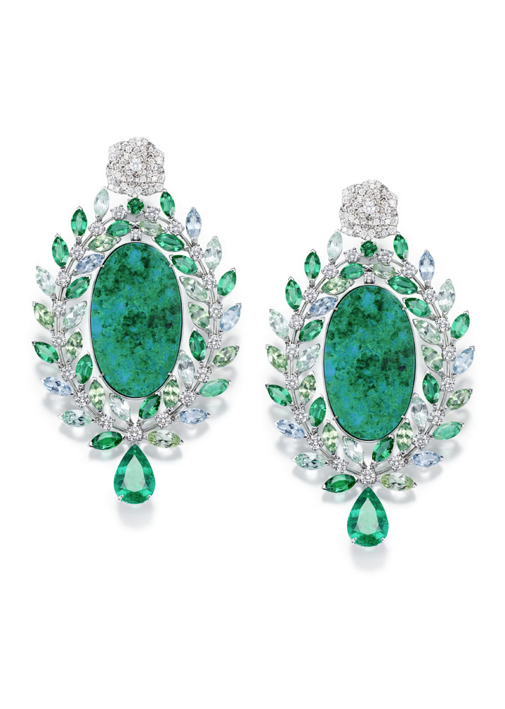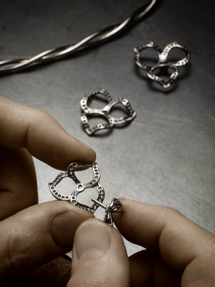 Les emmaillements précis et les chatons aux fines griffes sont fabriqués un à un à la main par les artisans joailliers de la Maison, et mettent en valeur les formes délicates et la beauté des pierres précieuses, qui épousent souplement décolletés et poignets.