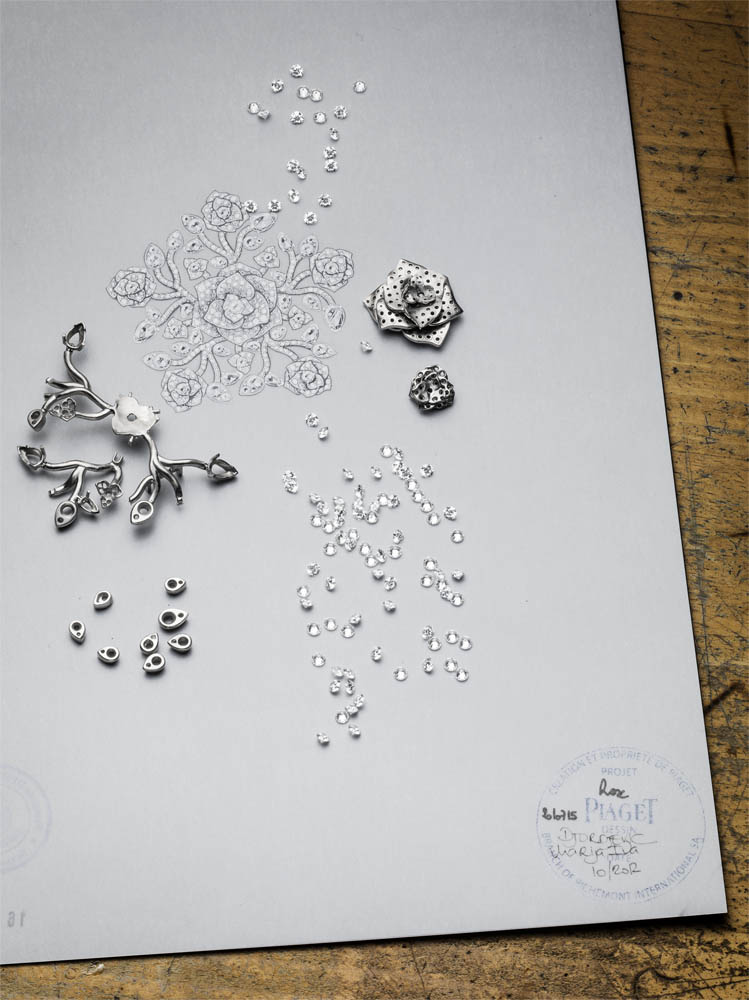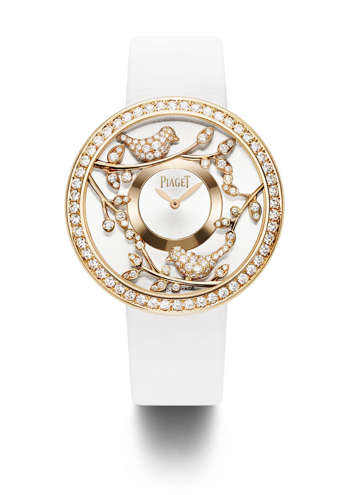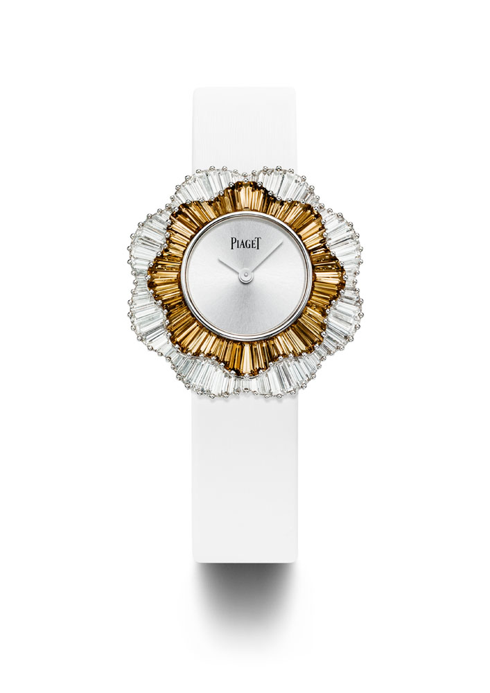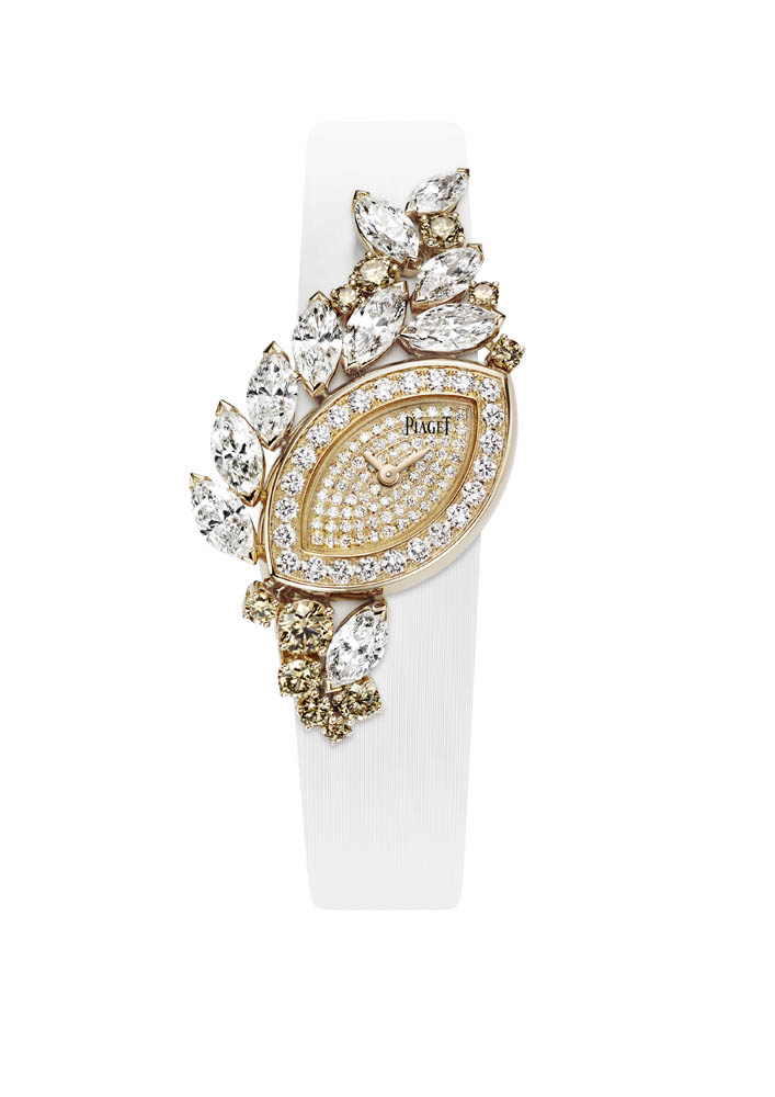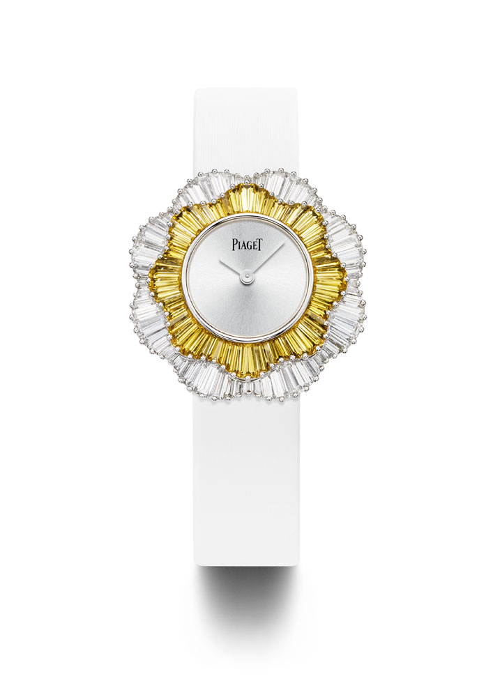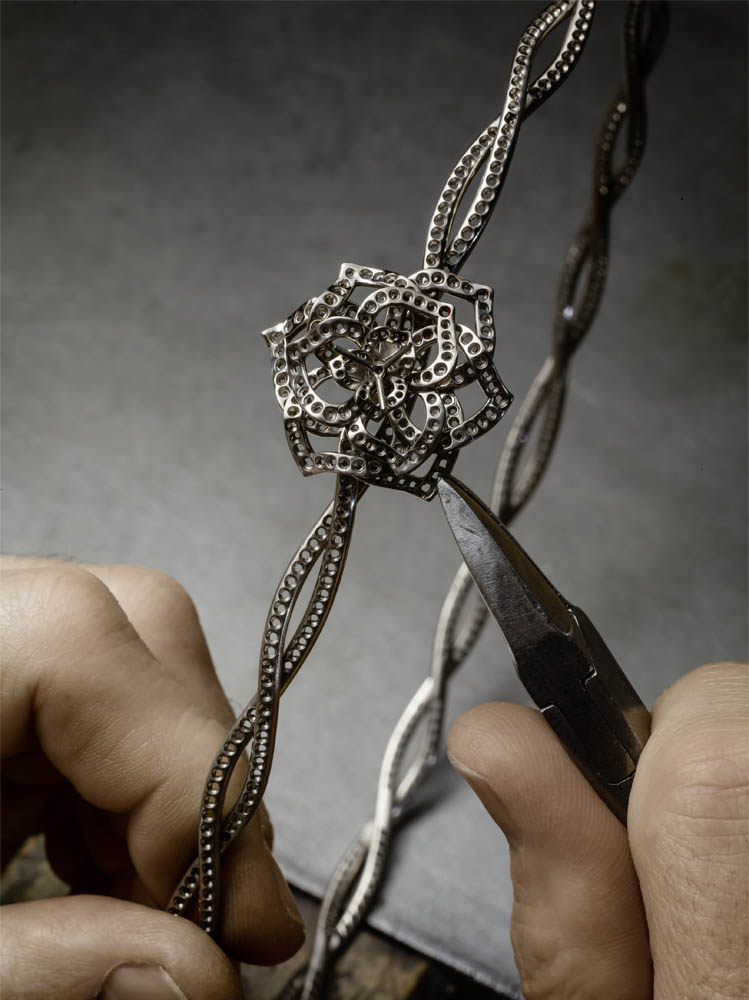 Entièrement fabriquée dans les ateliers de joallierie de Piaget, la collection affectionne les bijoux aux portés multiples, les peignes, les tiares ou encore les montres manchettes et à secrets, chères à la marque. Elle redécouvre pour l’occasion les techniques exclusives de la haute joaillerie dont la sensibilité se marie avec bonheur à la précision joaillère.