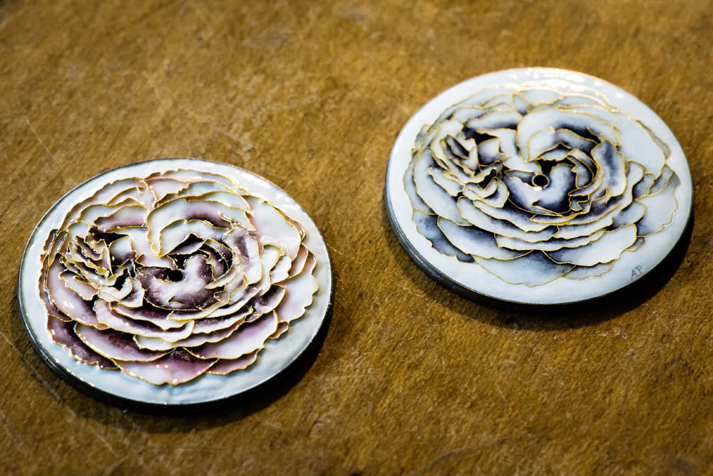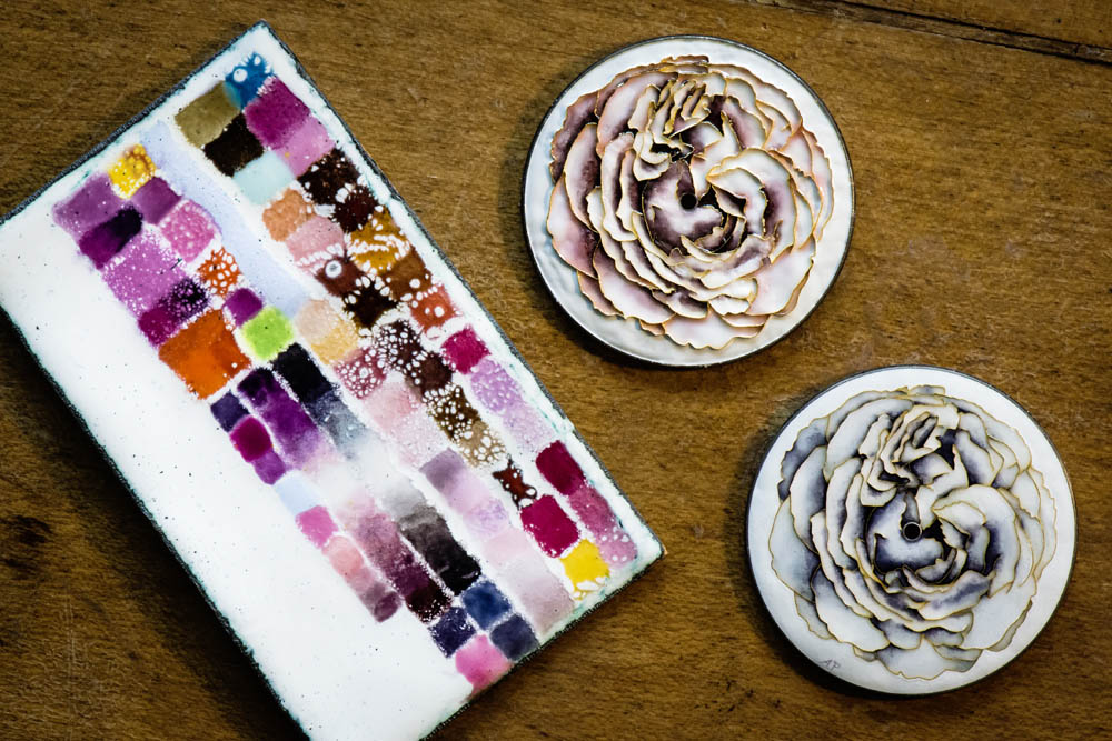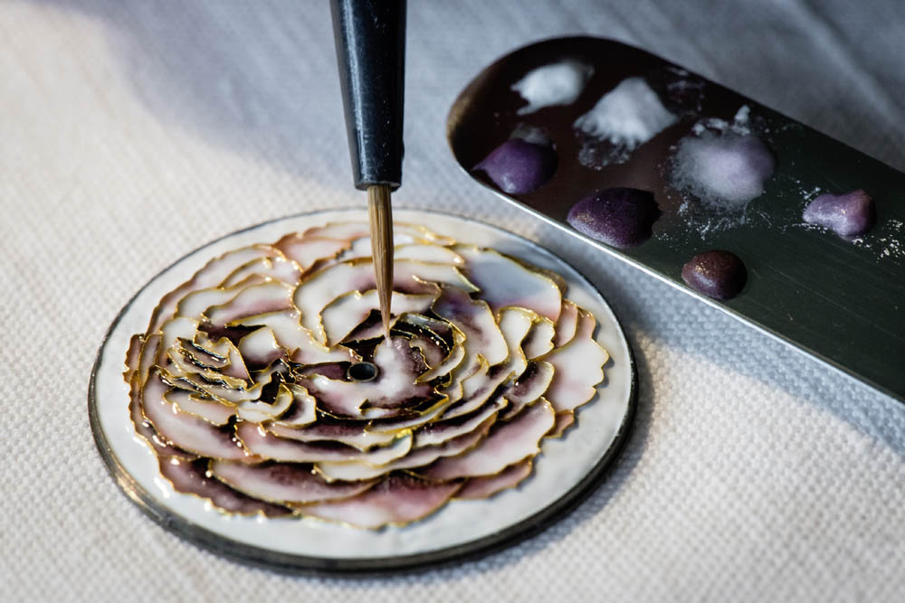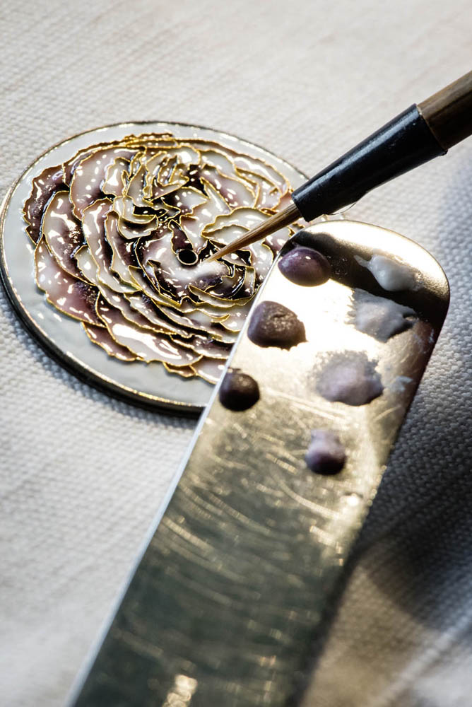 Le fil délimite ainsi un certain nombre de cavités qui correspondent aux différents zones de couleur. L’émail est déposé dans chacune des cavités et la pièce est passée au four. Cette opération peut se répéter plusieurs fois afin d’augmenter l’intensité de la couleur. Après un dernier passage au four, la surface de la pièce est lissée et recouverte d’une dernière couche de finition en émail transparent.