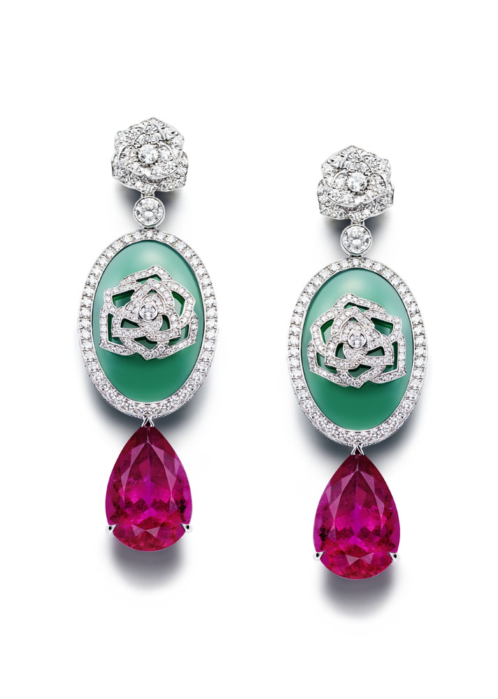 La collection Piaget Rose Passion s’articule autour d’un choix lumineux de pierres de couleurs, de pierres précieuses (diamants jaunes, émeraudes, saphirs roses) et de pierres dures (chrysocolle, Chrysoprase, Calcédoine) avec une prédominance de rose rappelant la couleur de la fleur et de vert pour la fraicheur.