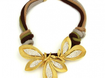 La corde, déclinée dans des couleurs automnales et neutres est mélangée avec des métaux mixtes brillants, tandis que la silhouette de la feuille, très simple est transformée en juxtaposition avec l’or et les cristaux. La richesse de la collection est représentative des couleurs riches de la saison pour les bijoux éternels qui tourneront des têtes.