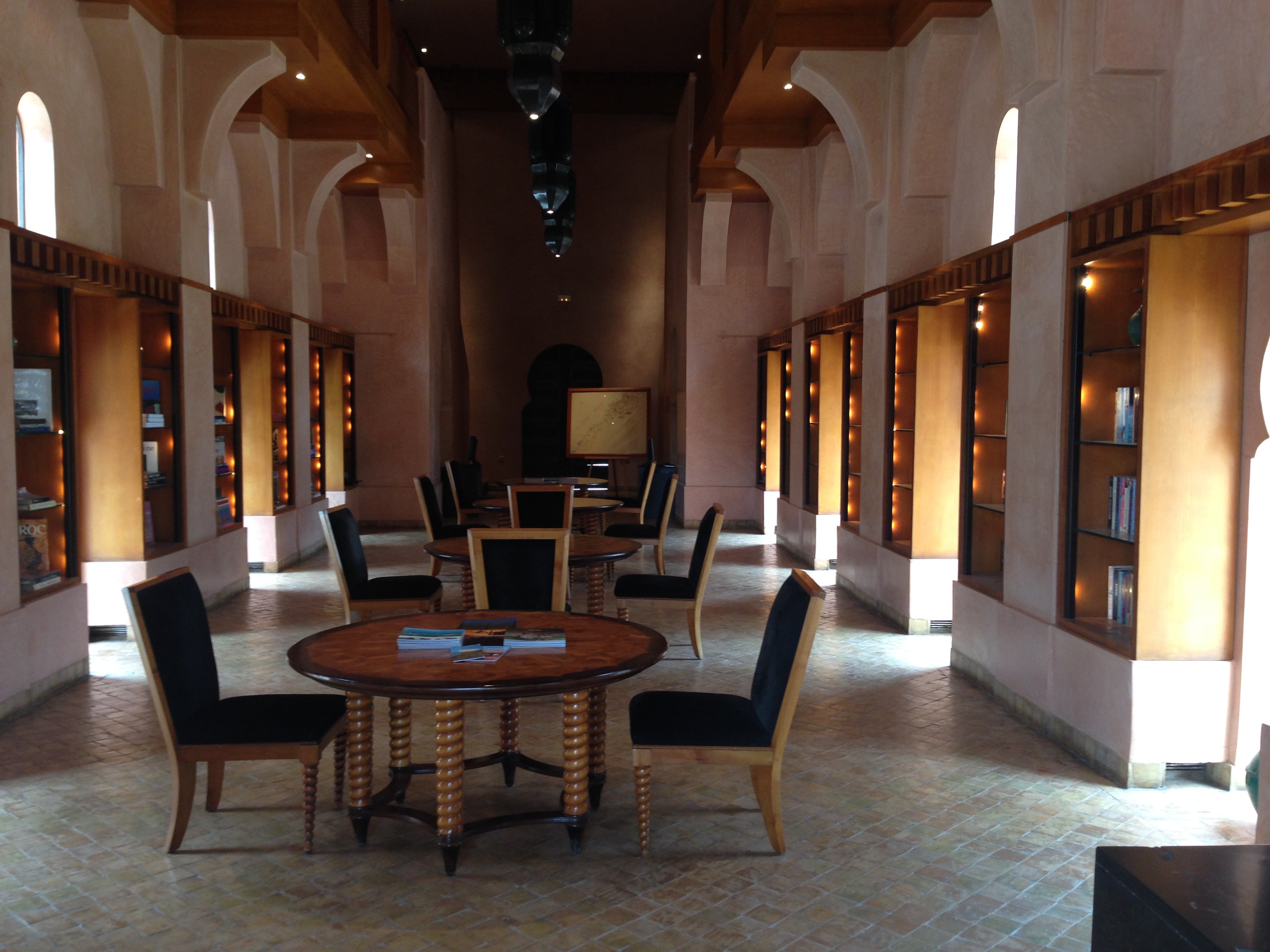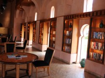 La Bibliothèque a un haut plafond de six mètres. Lanternes arabes et tapis colorent la salle, à deux étages.La lumière filtre d’une douzaine de fenêtres disposées le long des murs en tadelakt. Des étagères en verre accueillent livres, magazines, journaux, CDs, DVDs, ainsi que la typique poterie verte d Tamegroute, dans le Sahara marocain. On y trouve également une sélection de livres de voyages et de jeux de société. Les tables sont en bois de merisier incrusté et laqué en ébène. Le niveau supérieur est décoré avec une grille de panneaux en moucharabieh qui entoure presque toute la salle. La cheminée est encadrée par des masria (lits de jour marocains).