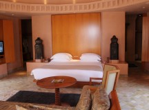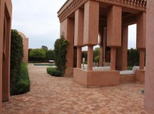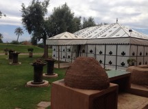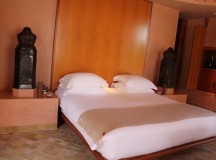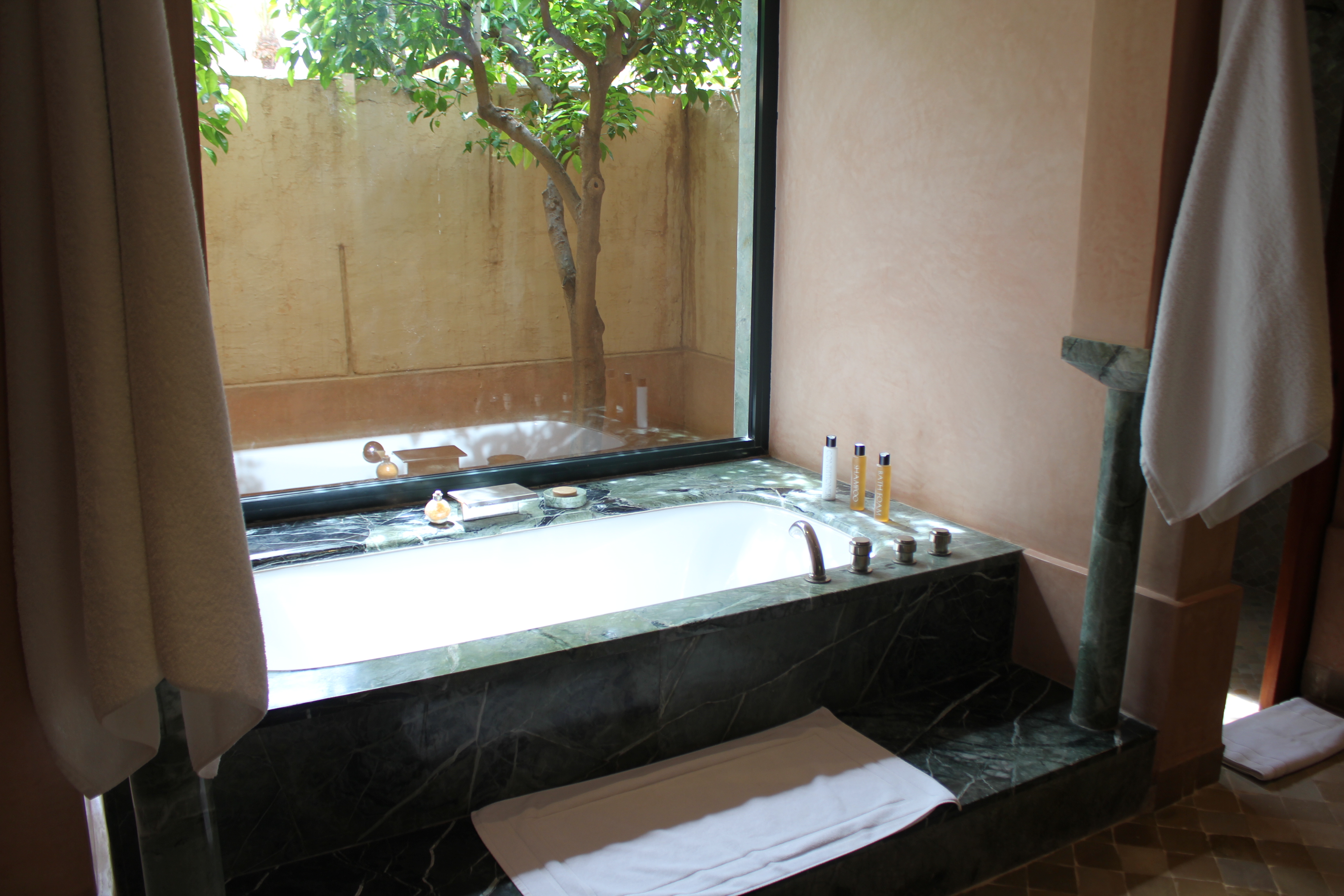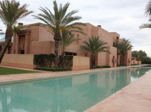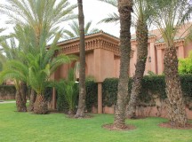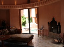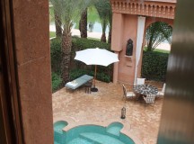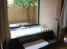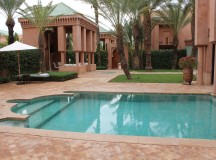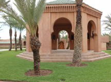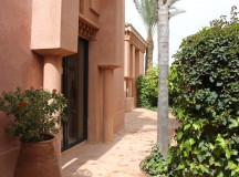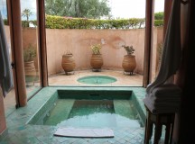 Dans les salles de bain, la baignoire de marbre vert de Ouarzazate, invitent à la détente. Une douche séparée, un double dressing et un espace toilette complètent les lieux. Les portes de cèdre s’ouvrent sur le jardin privé, avec vue sur le golf et une oliveraie. Chaque pavillon dispose d’un minzah à colonnes.