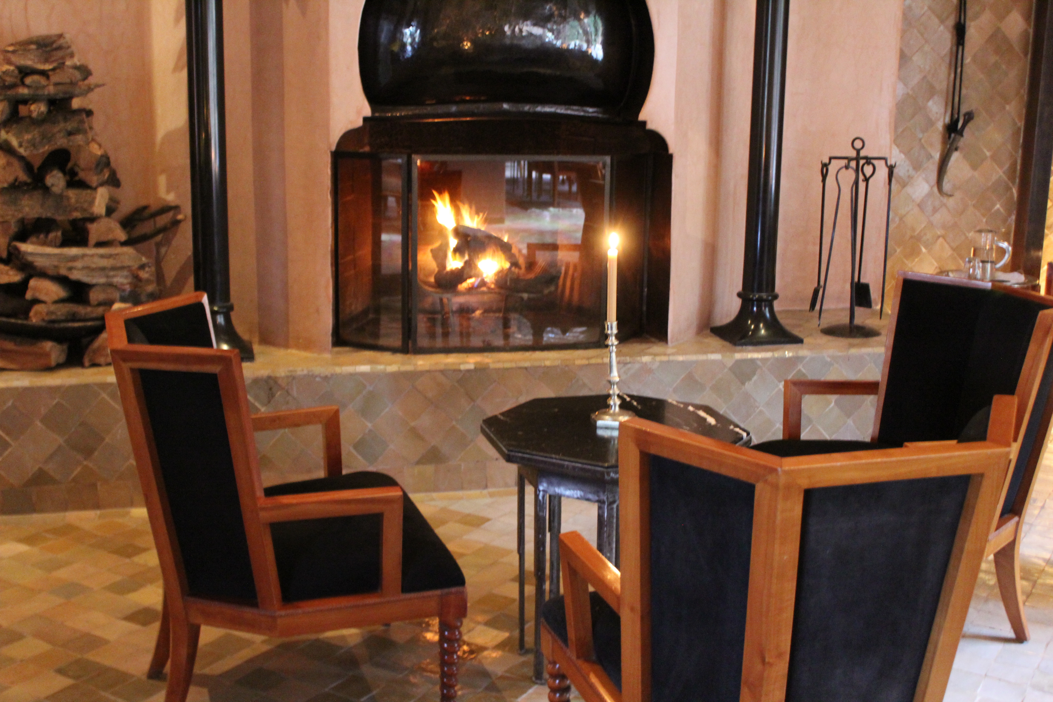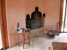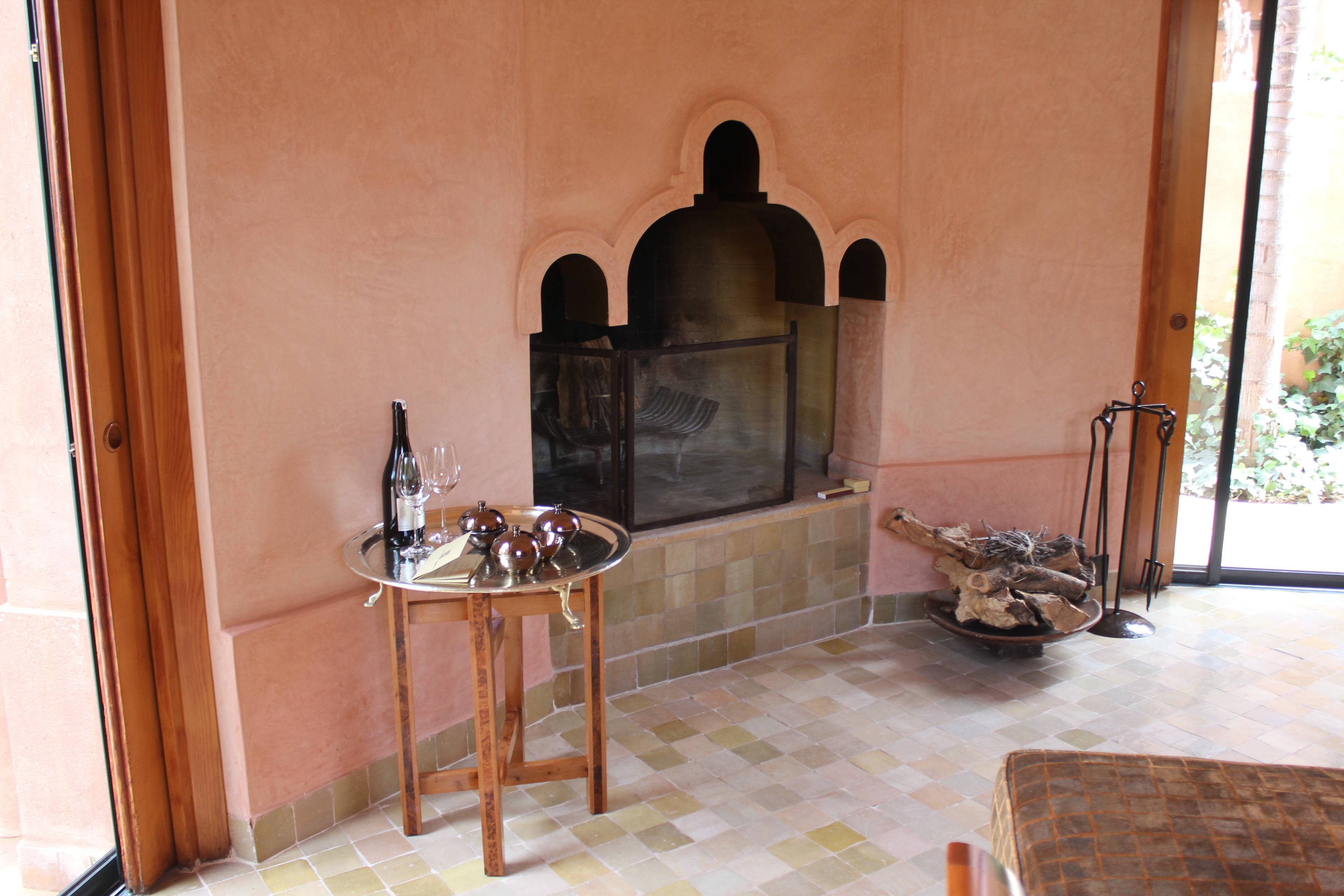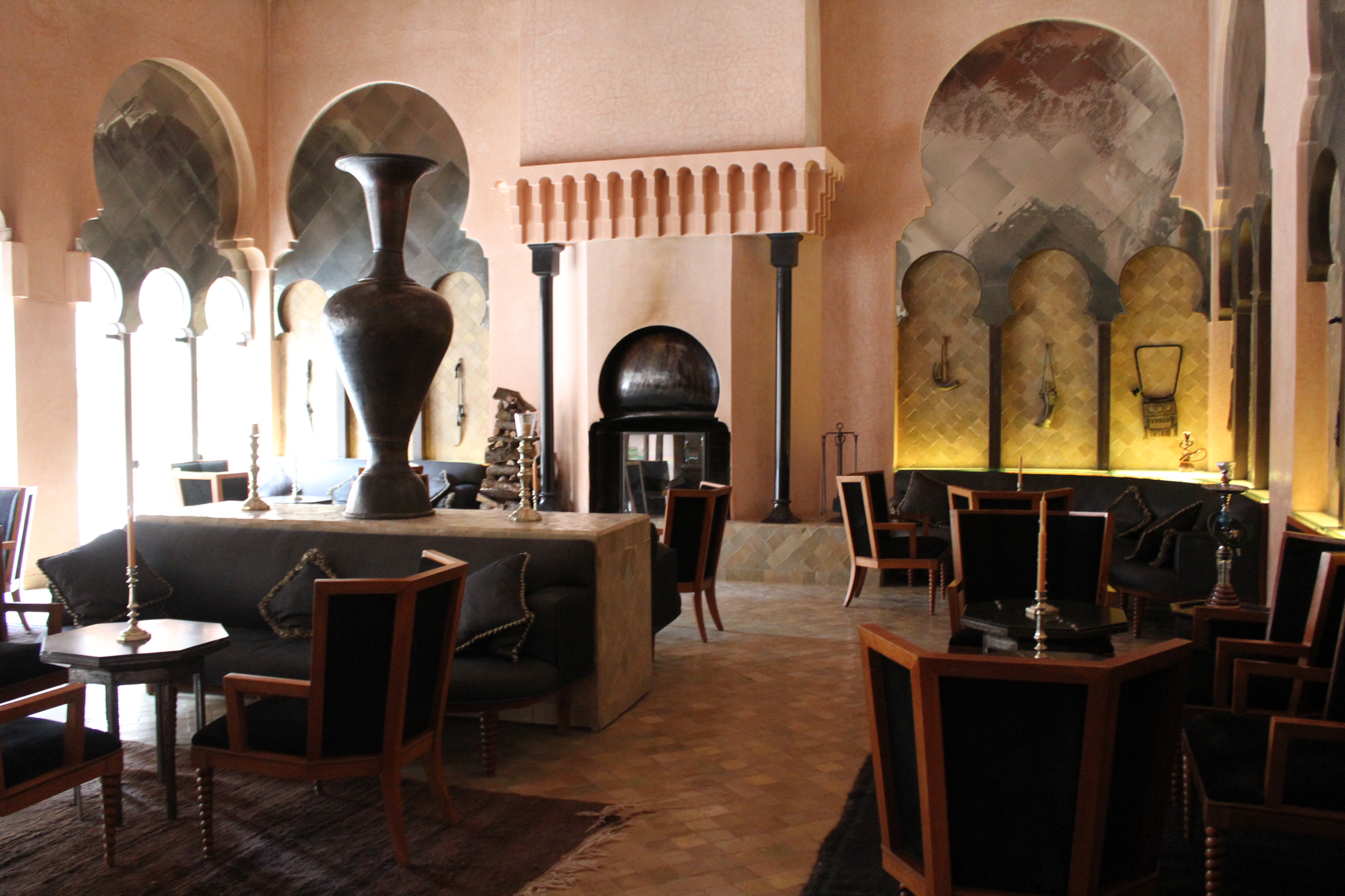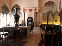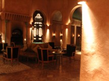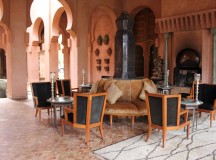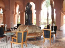 Le Bar/Fumoir est placé à l’entrée de l’Amanjena. Verres fumés, antiques poignards berbères, sabres arabes, os de chameaux et rameaux d’oliviers décorent les murs.