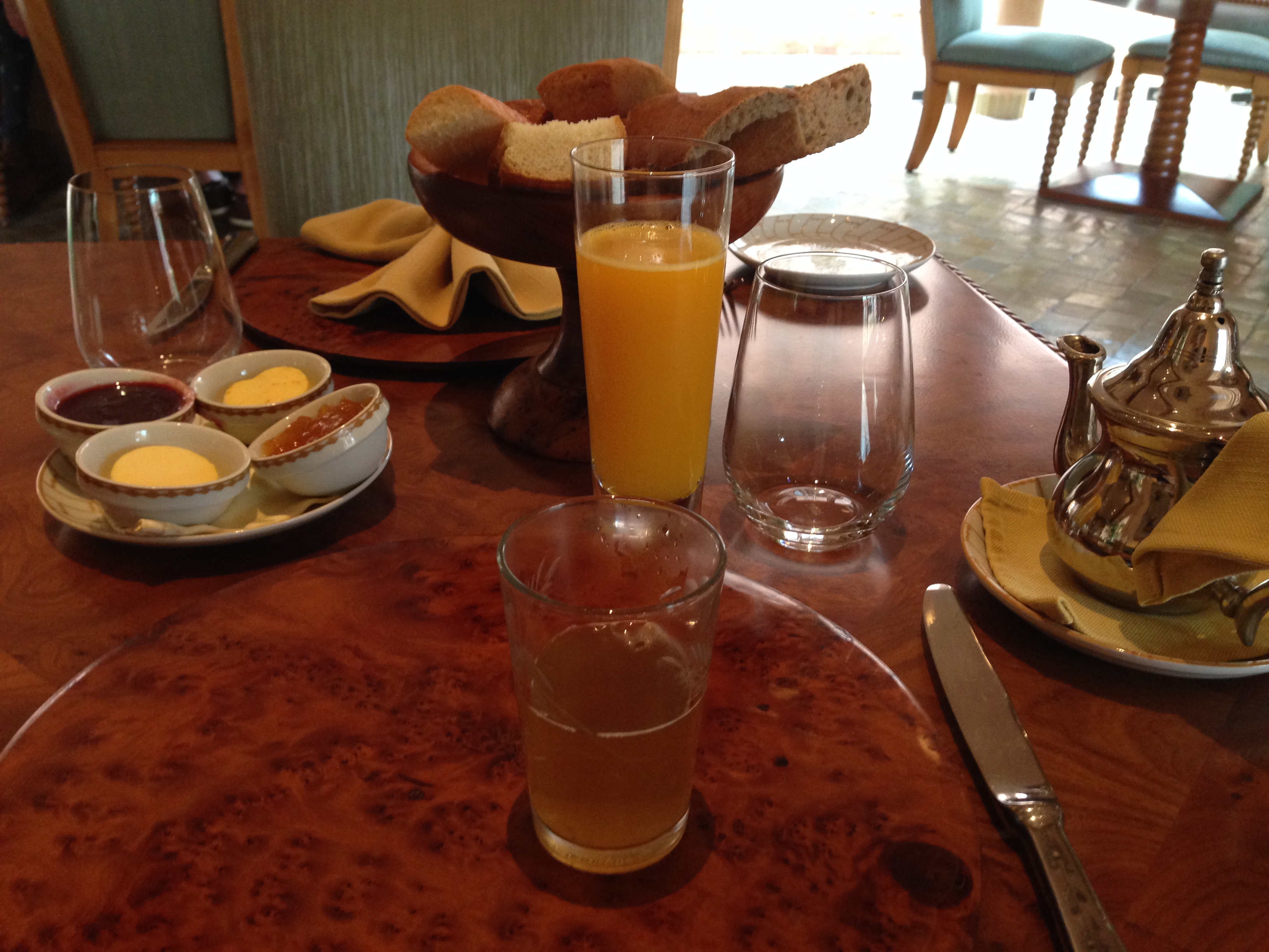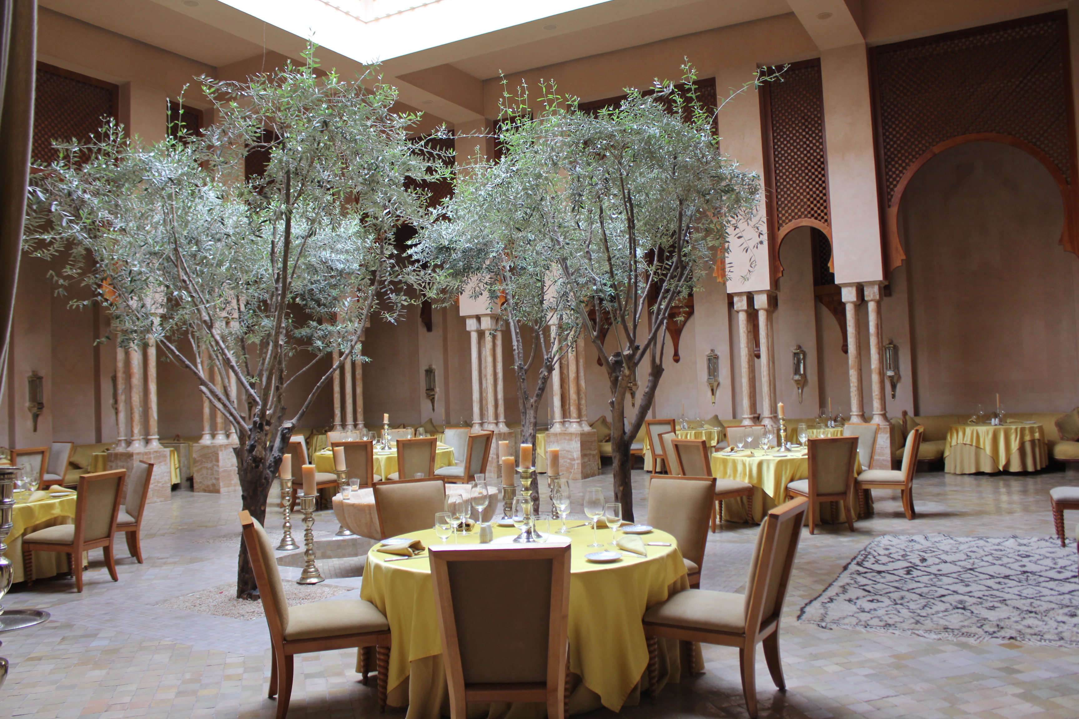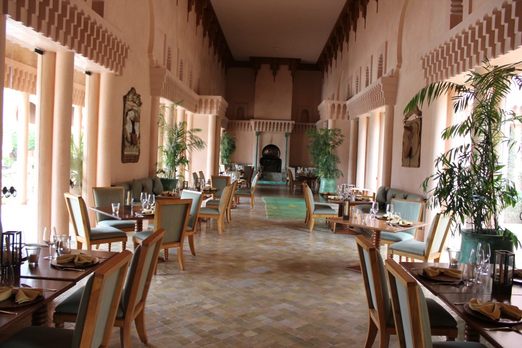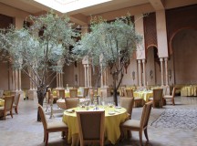 A l’heure du dîner, le Restaurant réinterprète la cuisine marocaine et méditerranéenne. Lumineuse et accueillante, la salle accueille une fontaine centrale en onyx, entourée d’oliviers. Les moucharabiehs créent un magnifique jeu de lumières. Décorés d’antiques motifs berbères, les murs sont teintés dans une douce nuance coquille d’oeuf miellée. Les marocains parlent de ce restaurant comme étant le meilleur restaurant de Marrakech. La cuisine y est délicieux.