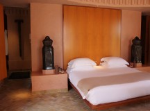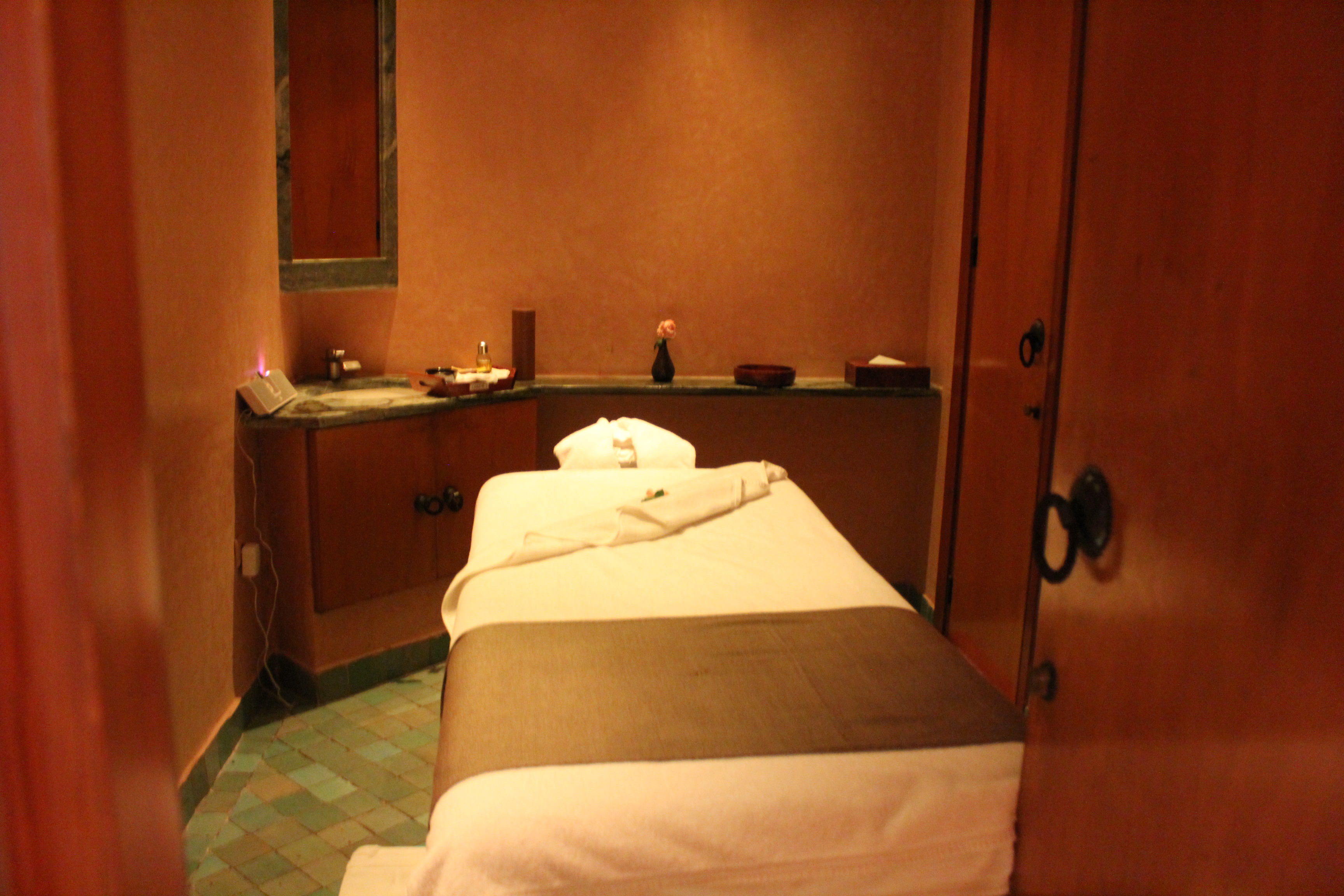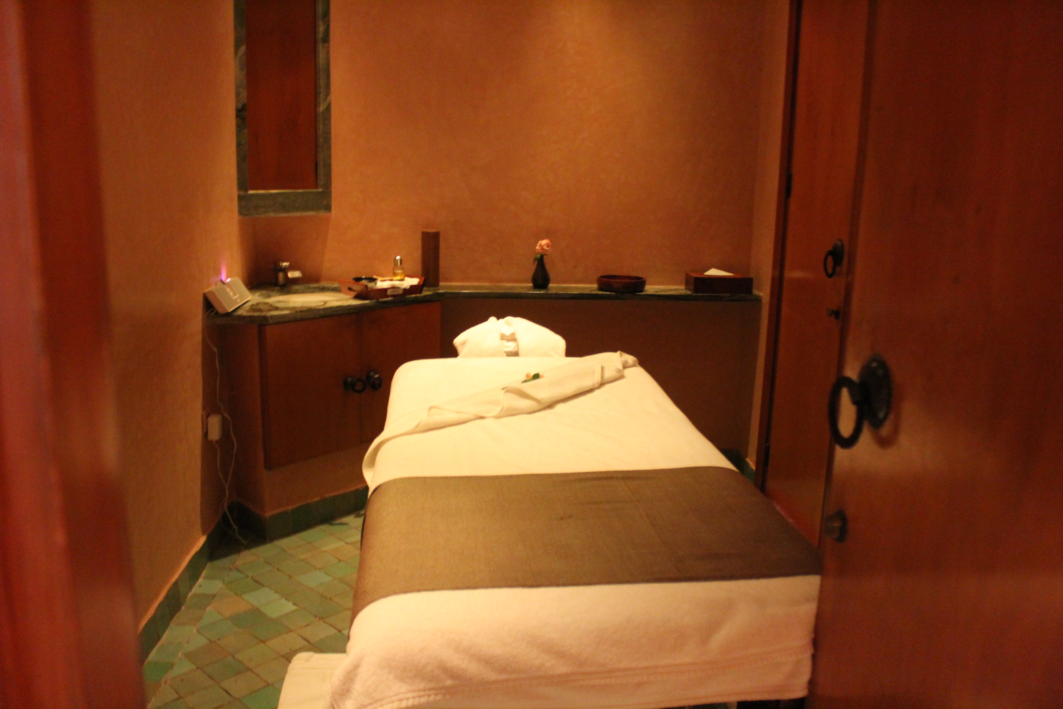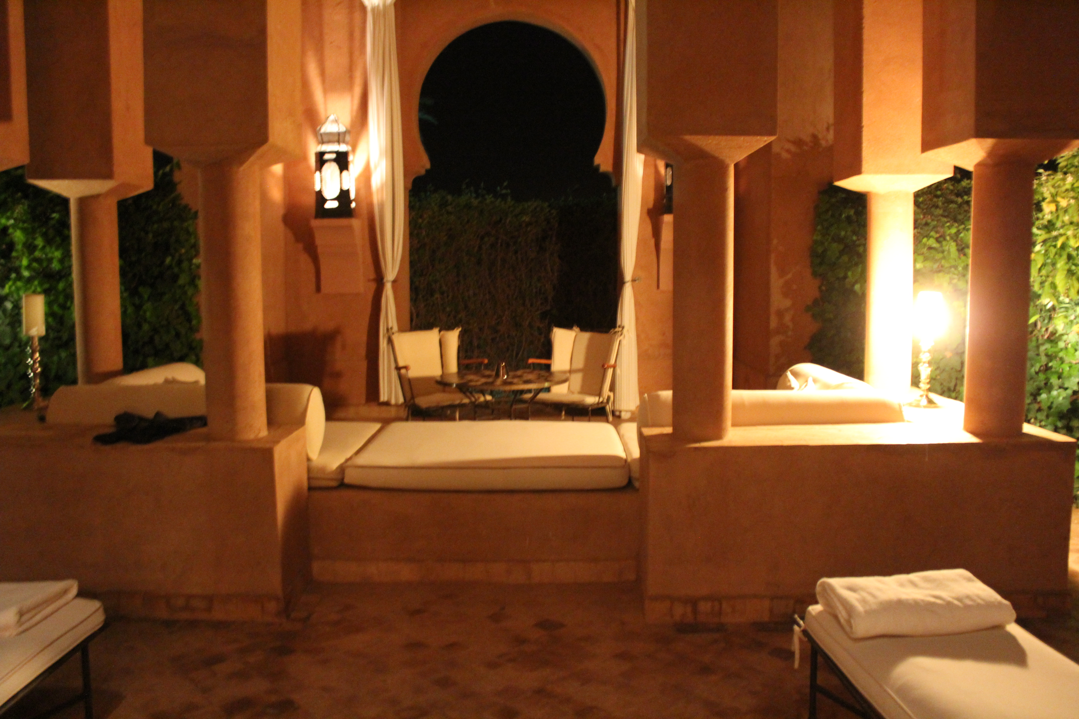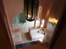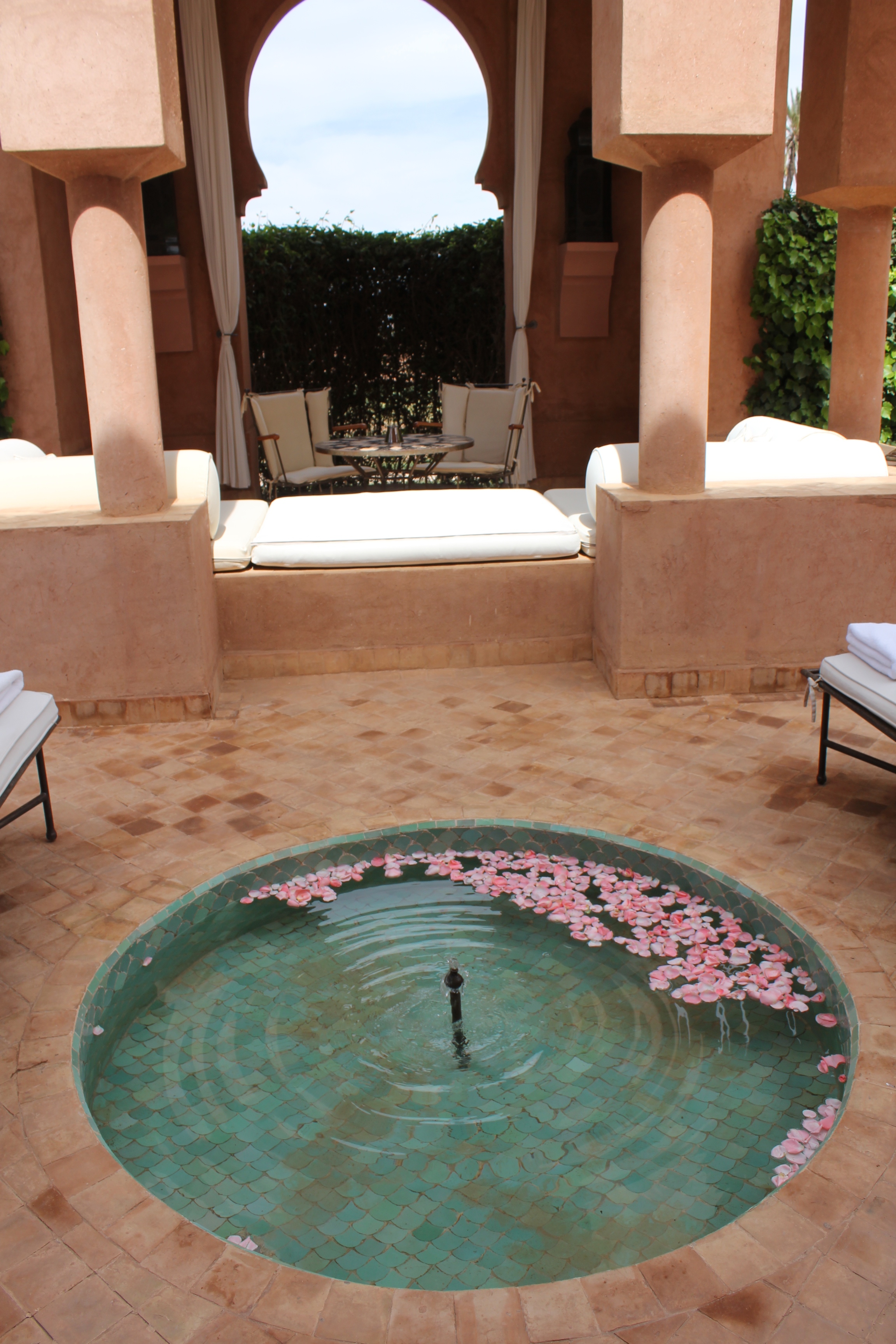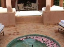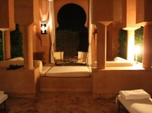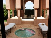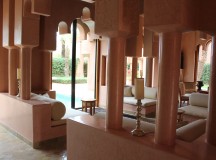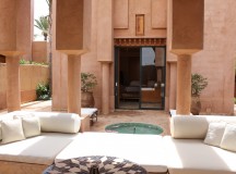 A l’Amanjena, les deux hammams (un pour les hommes, un pour les femmes) – composé de douches, toilettes, vestiaire et jacuzzi vitré – s’ouvrent sur un jardin avec fontaine, bordé par un mur en pisé haut de deux mètres. Dotées d’arches mauresques et de plafond voûtés, les salles de hammam invitent à l’indolence.
