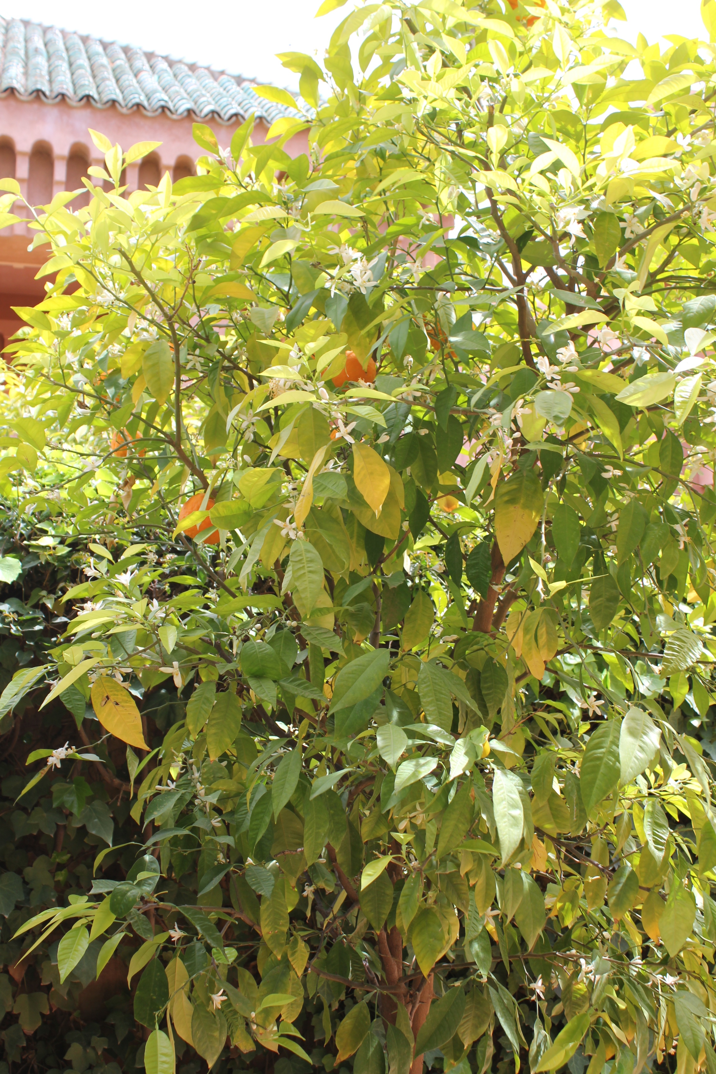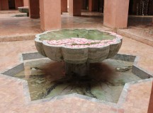 Depuis la place principale de l’Amanjena, l’eau coule le long de deux canaux, irriguant les jardins de la propriété, plantés d’oliviers, de citronniers, de dattiers grimpants, de bougainvilliers orangés, d’hibiscus et de grenadiers.