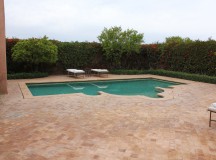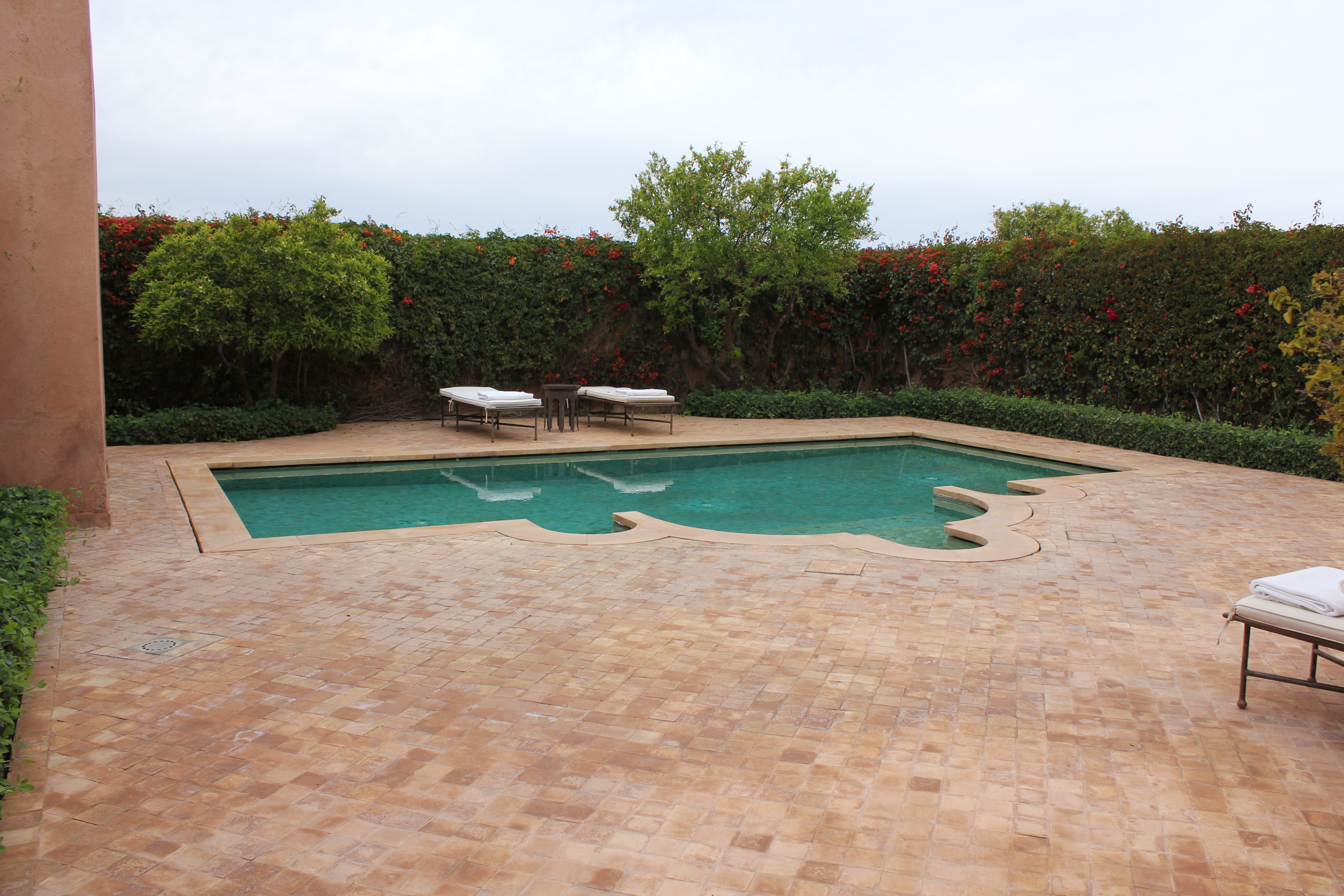 Chauffée, la piscine extérieure est tapissée de carreaux verts brillants, de style zellij « écaille de poisson ». Entouré d’hibiscus, l’espace piscine comprend des chaises longues et un bassin indépendant, peu profond.
