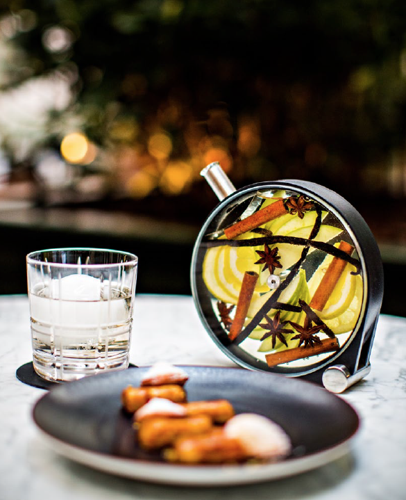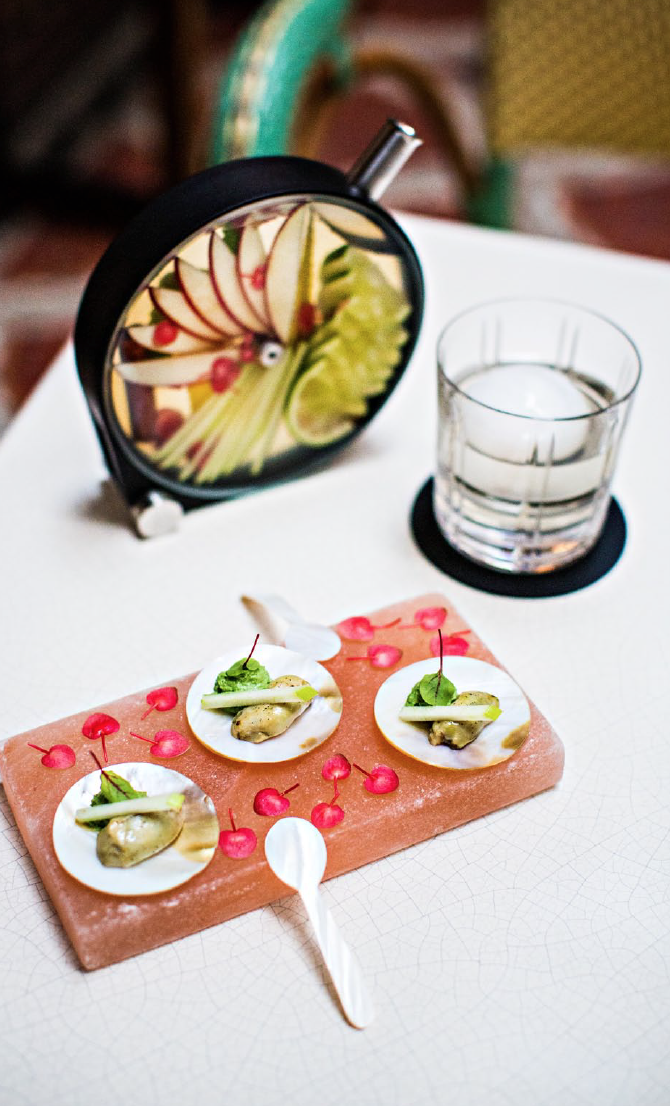 Une impression sublimée par le choix inédit de carafes à infusion, un objet de service unique dessiné par Martin Kastner pour la firme américaine Crucial Detail et utilisé pour la première fois en Europe : « J’aime trouver de nouveaux objets de service. Ces carafes sont magnifiques. Elles sont transparentes et permettent de voir les fruits et les fleurs qui infusent, comme un bouquet, un tableau. Chaque cocktail servi