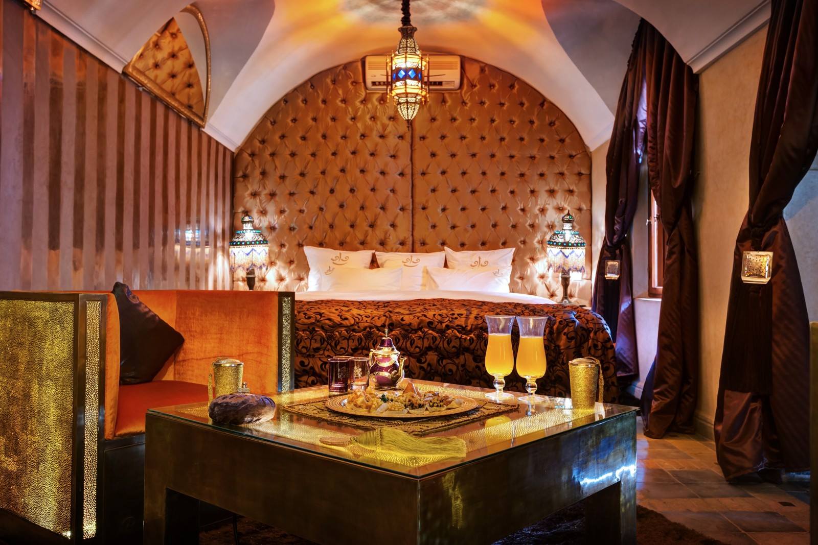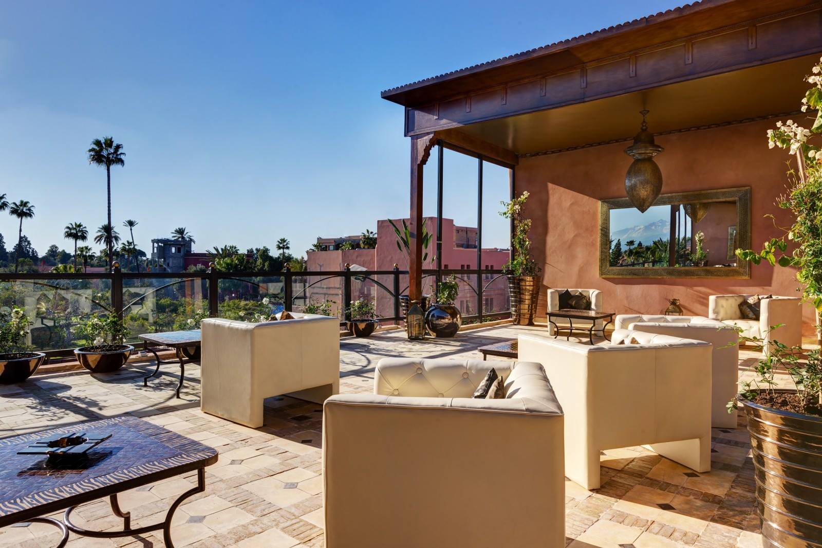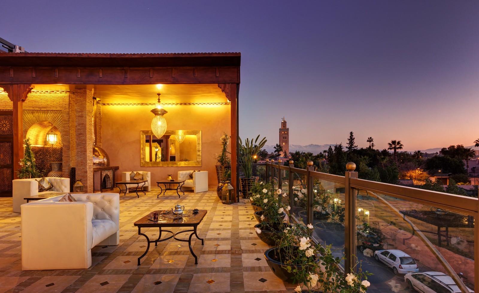 Mais l’attraction principale du Riad demeure le sky lounge (la terrasse). Situé sur le toit de du riad, un chaleureux salon-bar d’offre à vous avecincroyable vue panoramique de la ville. Avec un style luxueux, créé par l’artiste italien Maurizio, le Sky Lounge Wow dispose de canapés en cuir et d’un toit coulissant. C’est le lieu le plus exclusif offrant une vue sans pareil des sommets enneigés du Haut Atlas, du Koutoubia et du Royal Mansour Hotel.
