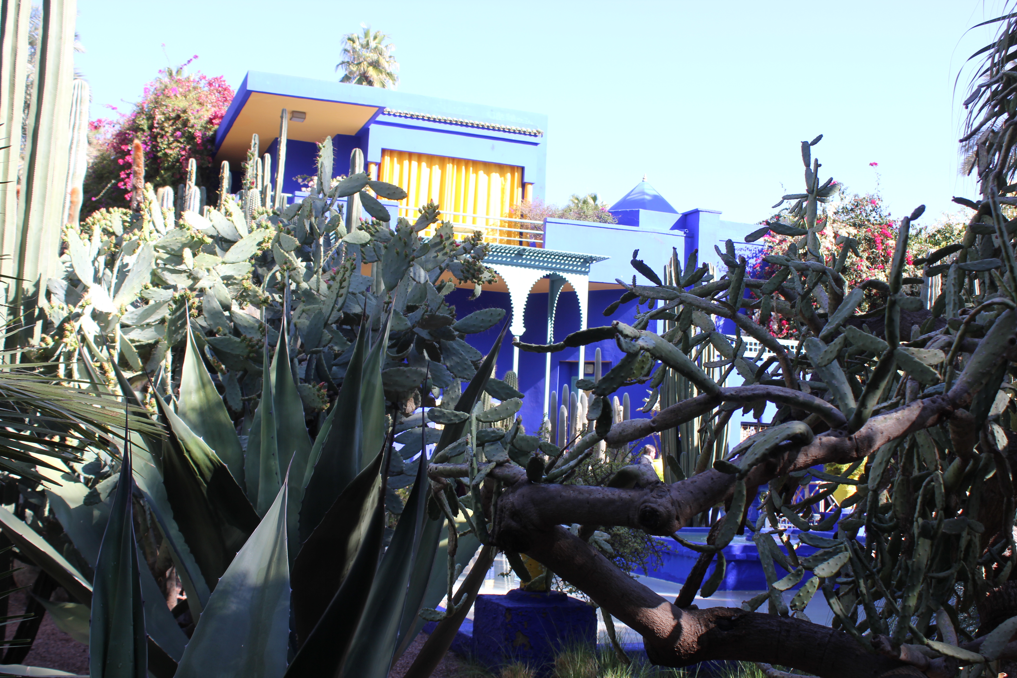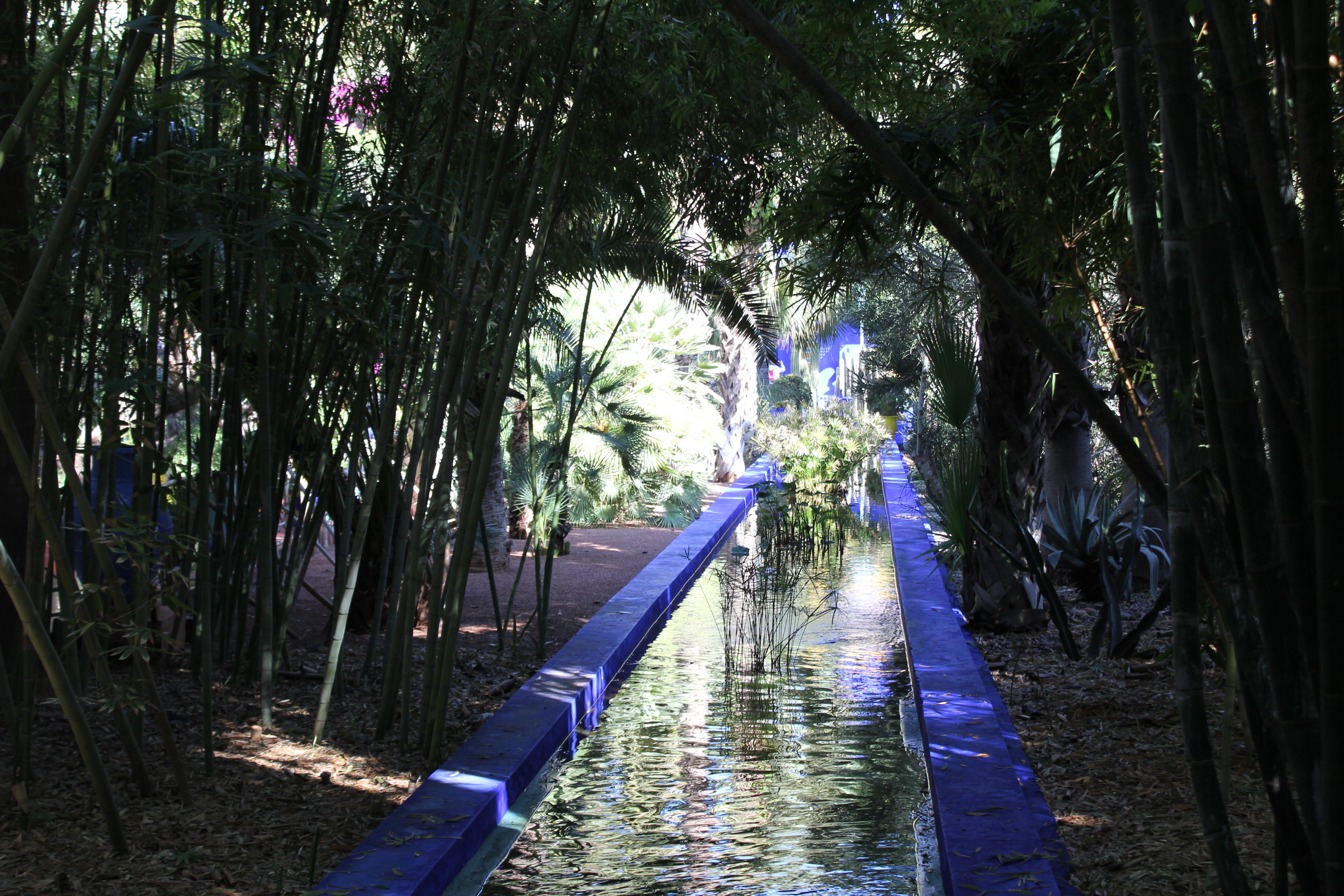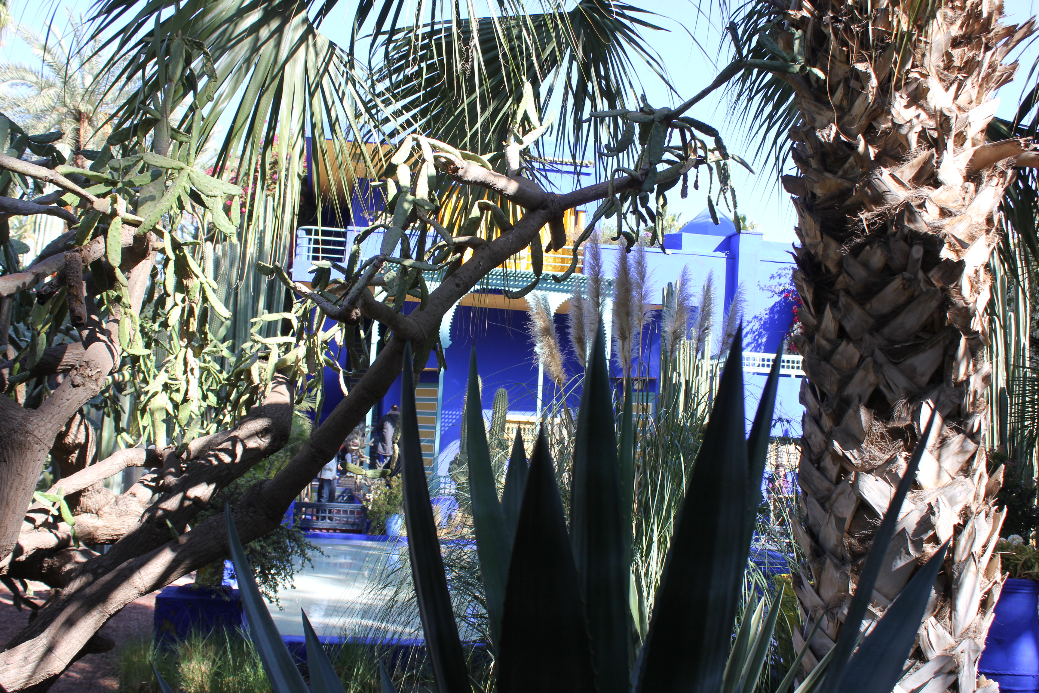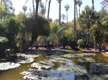 Ce jardin botanique a été créé par l’artiste français Jacques Majorelle dans les années 1930. Inspiré par les couleurs du carrelage des maisons marocaines, il créa une nuance de bleu intense et lumineuse et peignit sa villa, les murs de son jardin, les fontaines, les pots de fleurs avec ce nouveau bleu Majorelle. Après sa mort, la maison fût abandonnée et restaurée en 1980 par Yves Saint Laurent. Le jardin dispose à présent de plantes luxuriantes et exotiques.