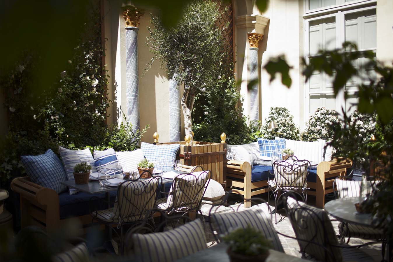 Passé la porte cochère,et découvrez la salle de restaurant des beaux jours, cour pavée et mobilier chic et décontracté ce lieu s’orne d’une nature changeante au fil des saisons. Tissus, du teck patiné, fer forgé et larges banquettes recouvertes de coussins douillets bleus et blancs, contribuent au charme authentique de la cour. Tout est mis en oeuvre pour que cet écrin lumineux et calme puisse accueillir 70 convives en leur offrant toute l’intimité nécessaire.